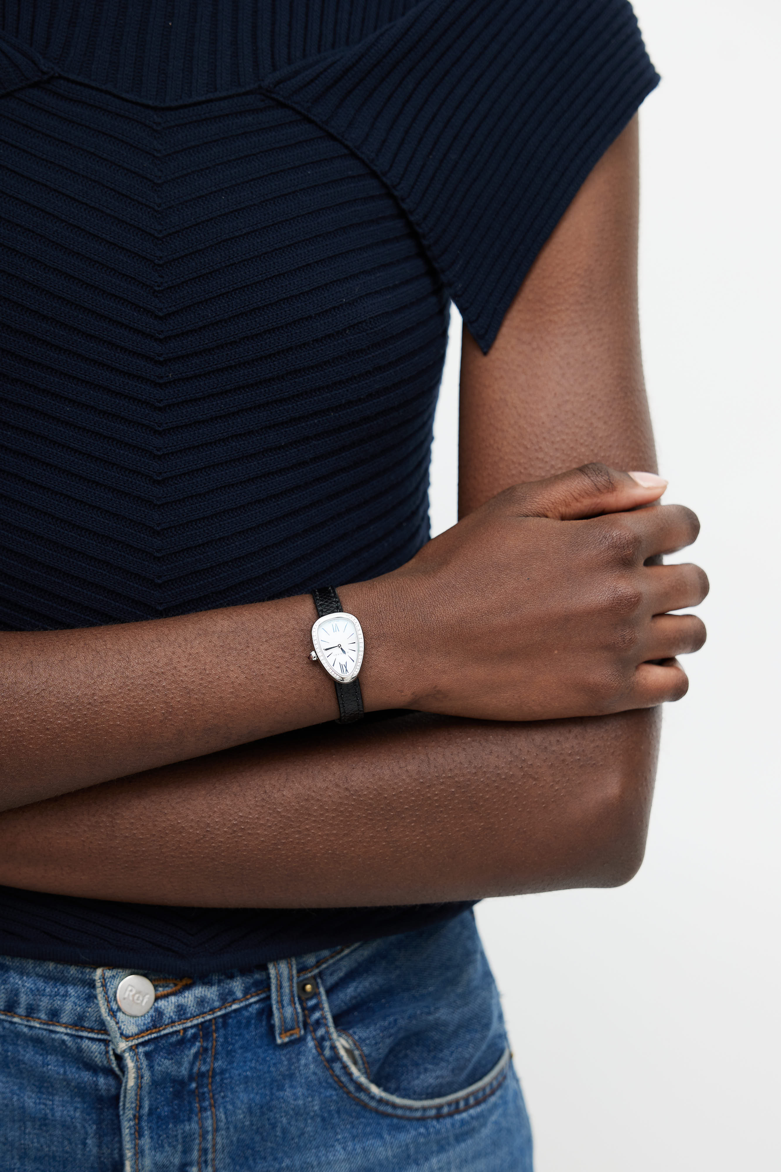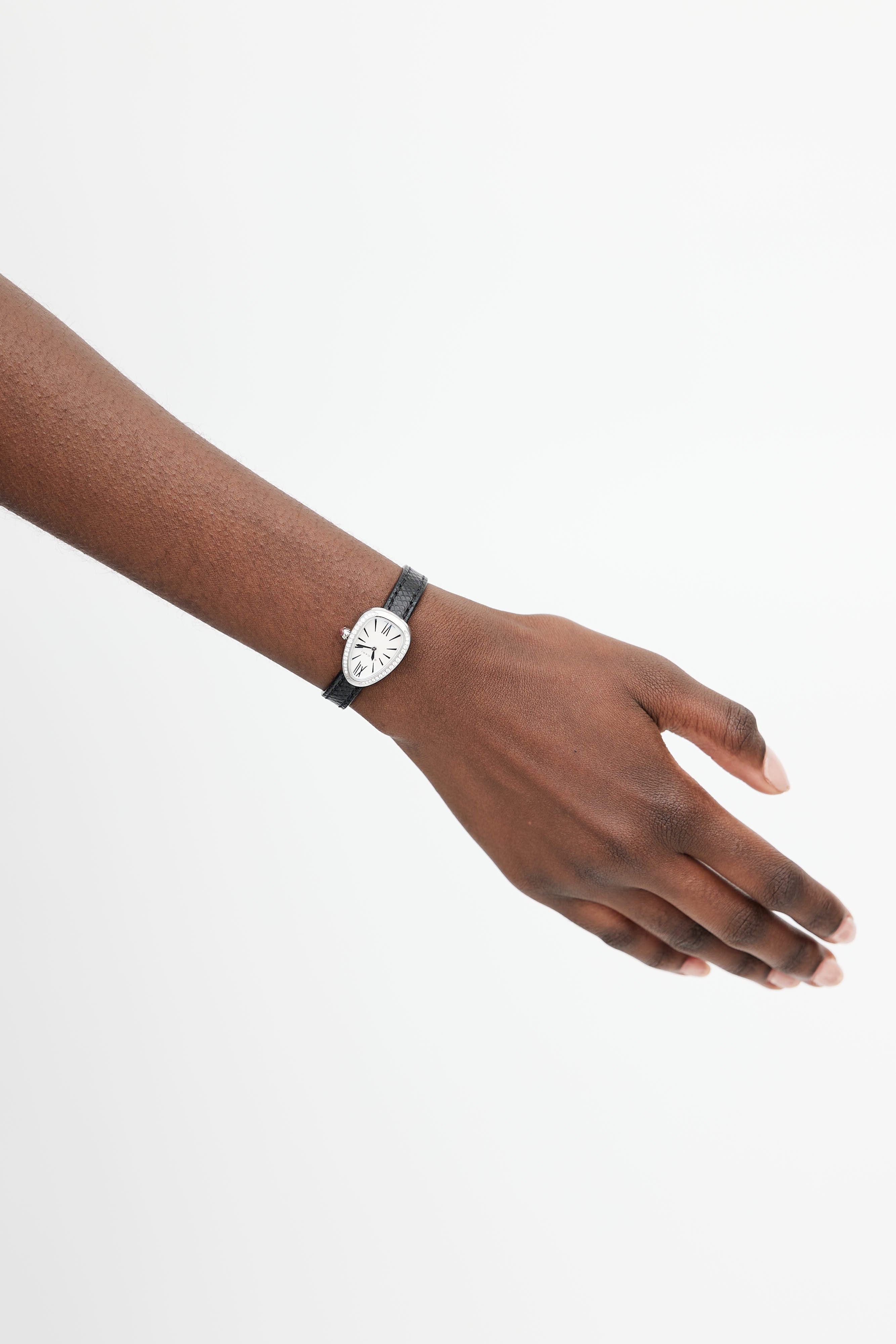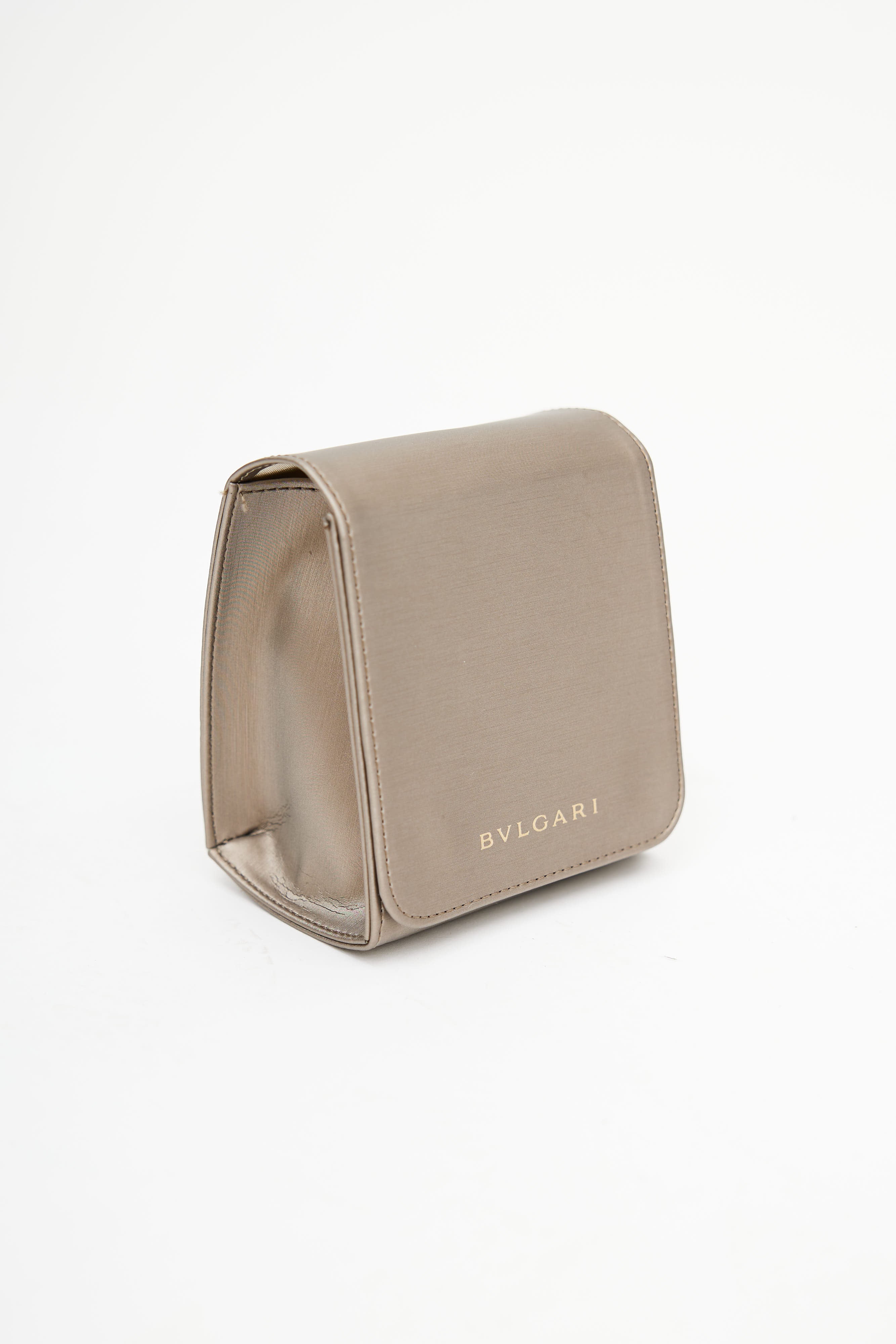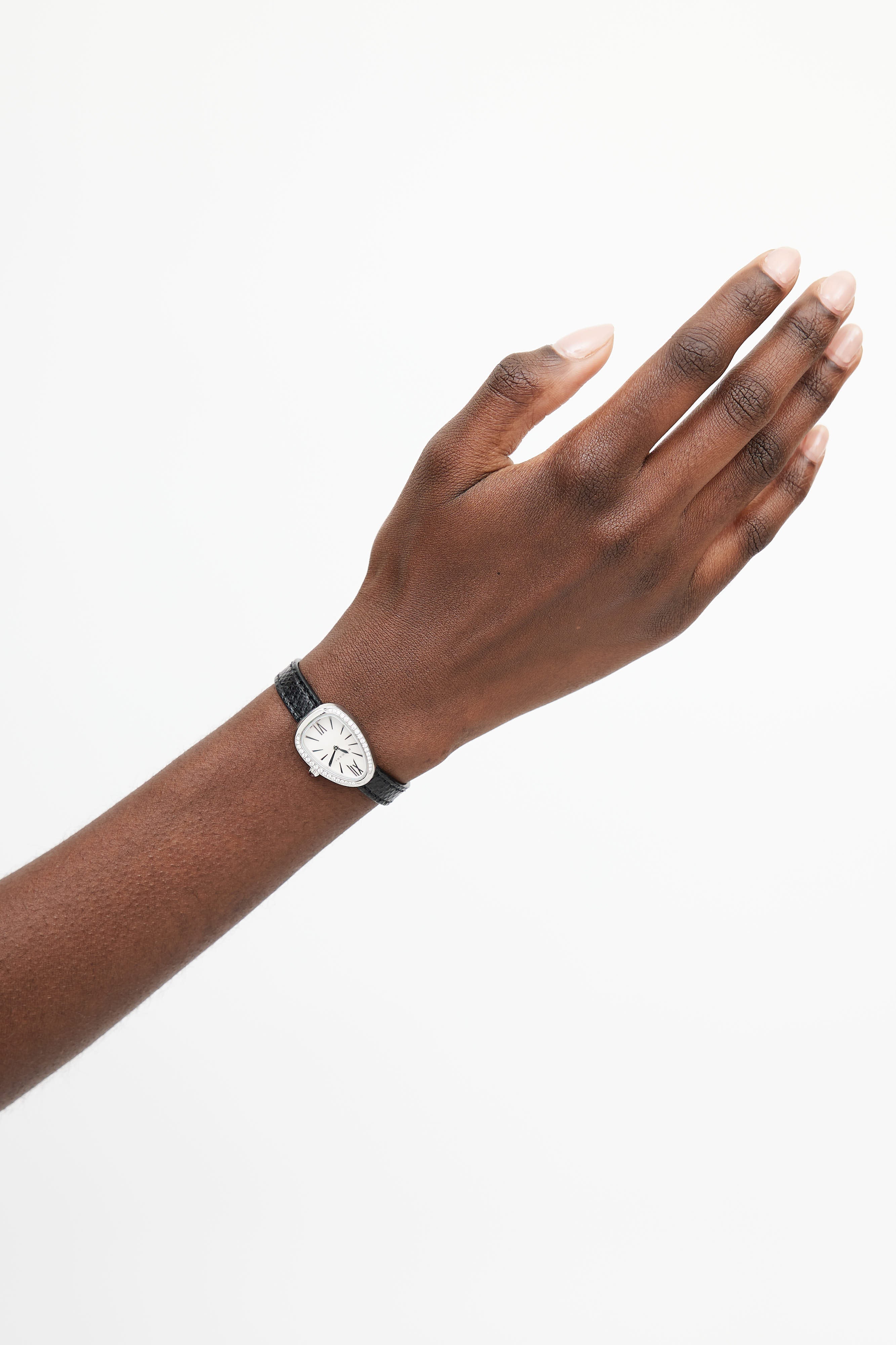 Pre-owned BVLGARI silver Serpenti Seduttori watch featuring a diamond bezel mounted on a 33mm stainless steel drop casebody, stainless steel crown set with a cabochon-cut pink rubellite, white silver opaline dial, silver roman numerals and bar indicators, quartz movement, and a white embossed leather strap. Comes with original box, alternate case and strap, and original paperwork.