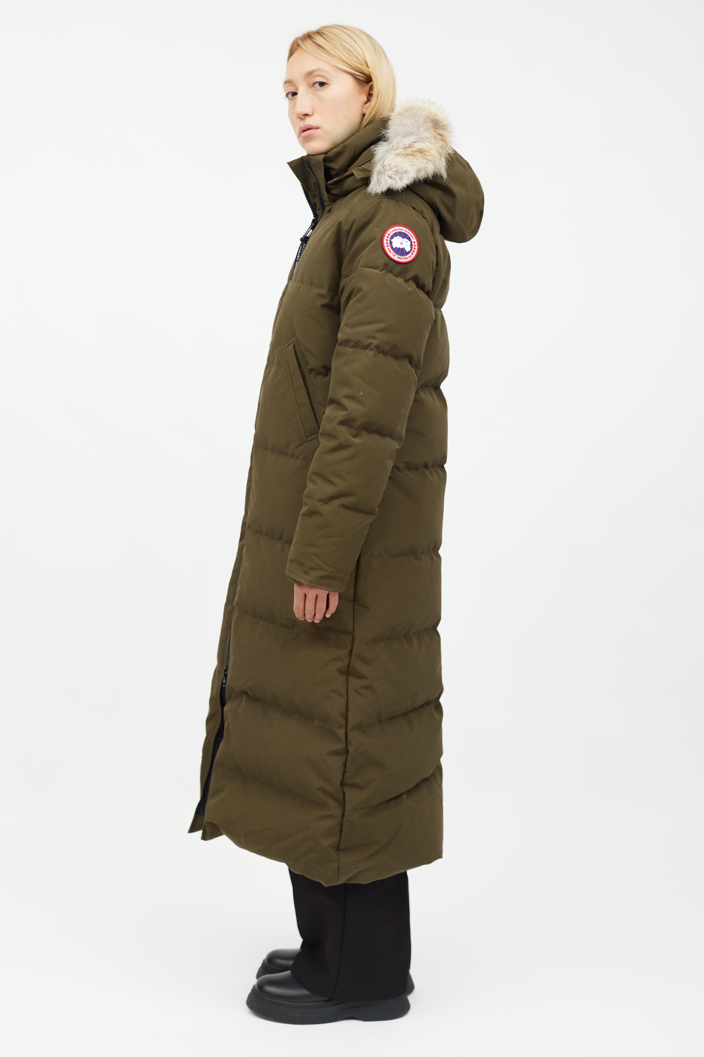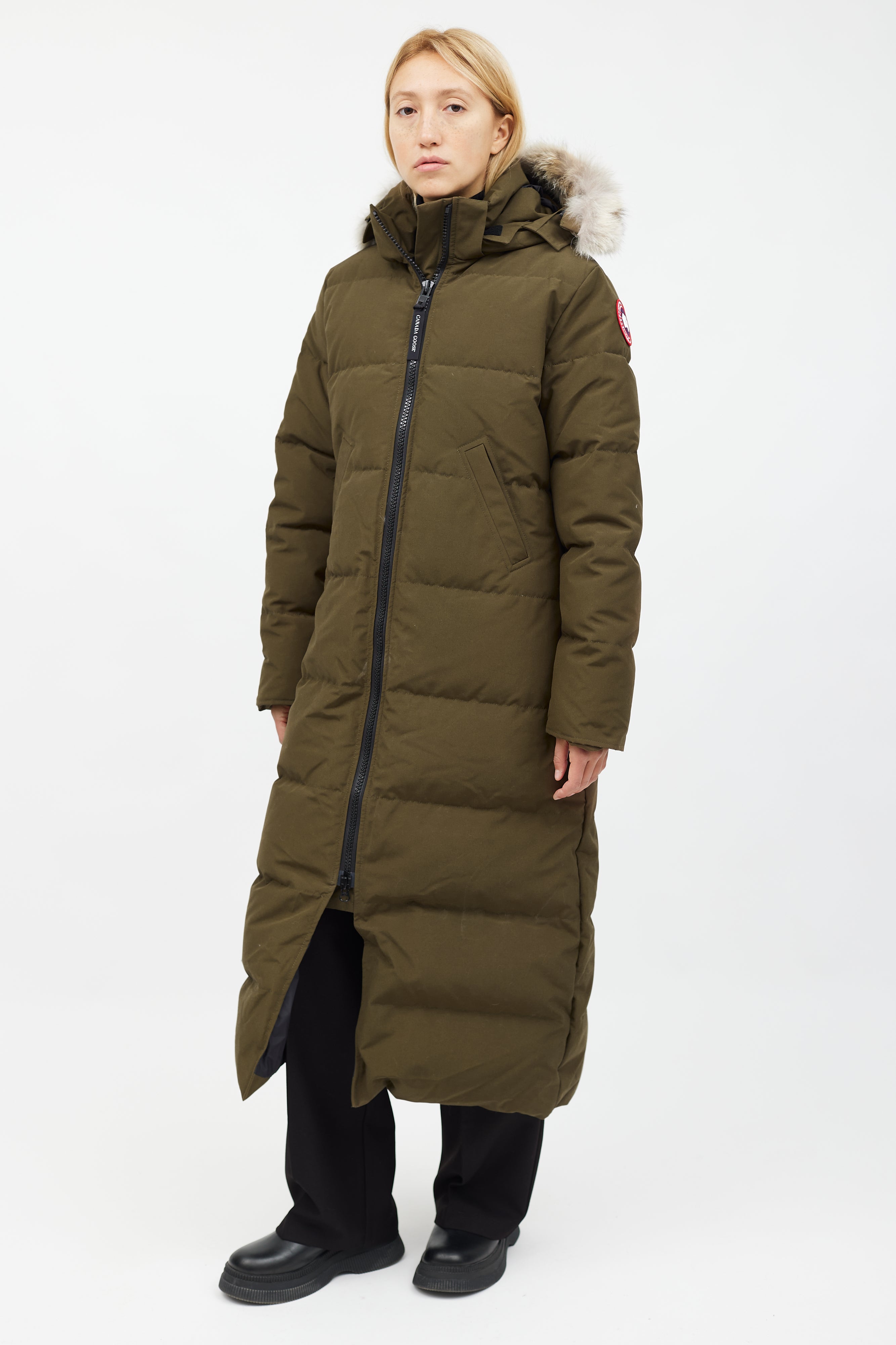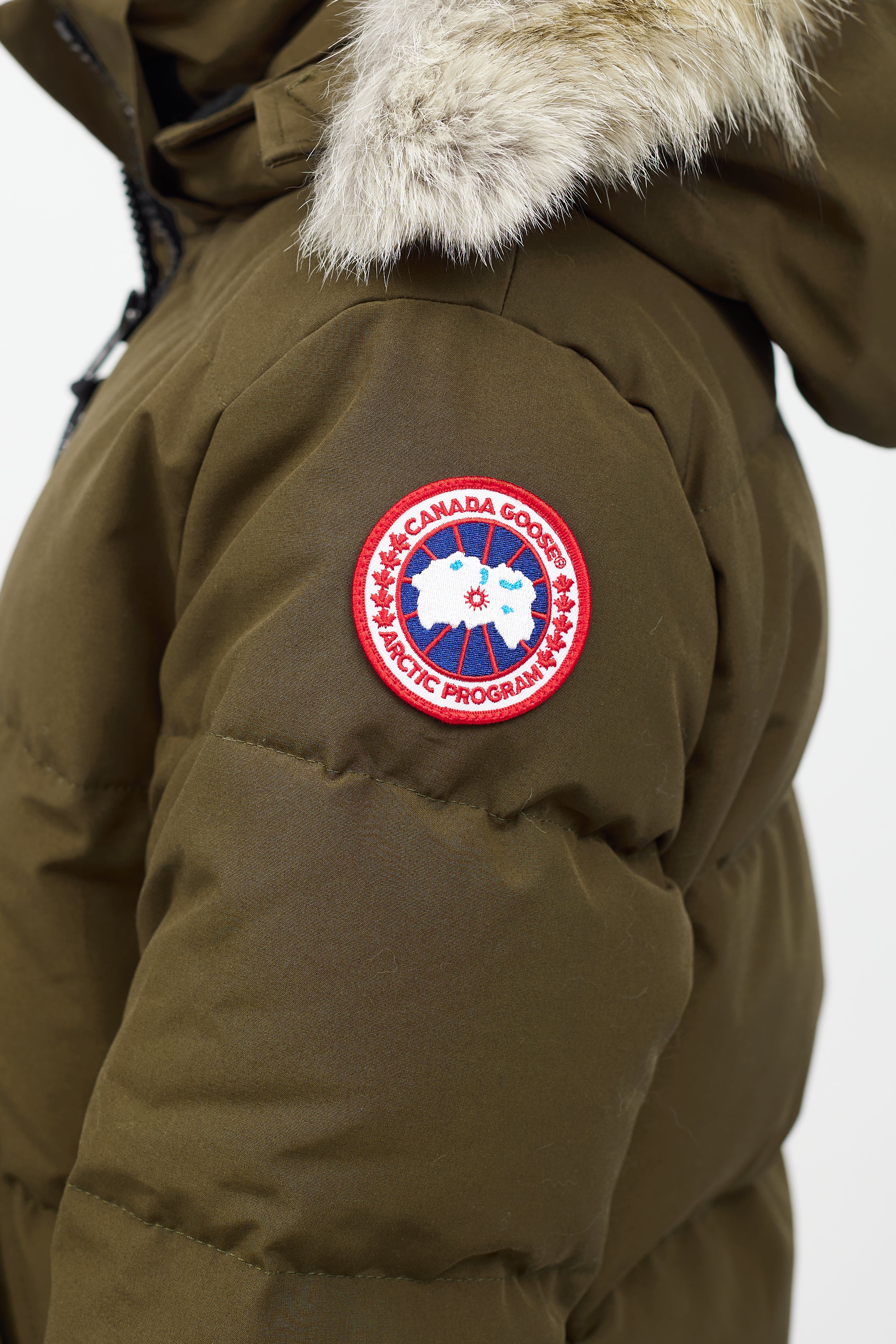 Pre-owned Canada Goose green Mystique parka featuring removable fur trim on hood, backpack straps, quilted design throughout, two slip pockets at waist, storm cuffs, zip front, and embroidered logo patch at arm.