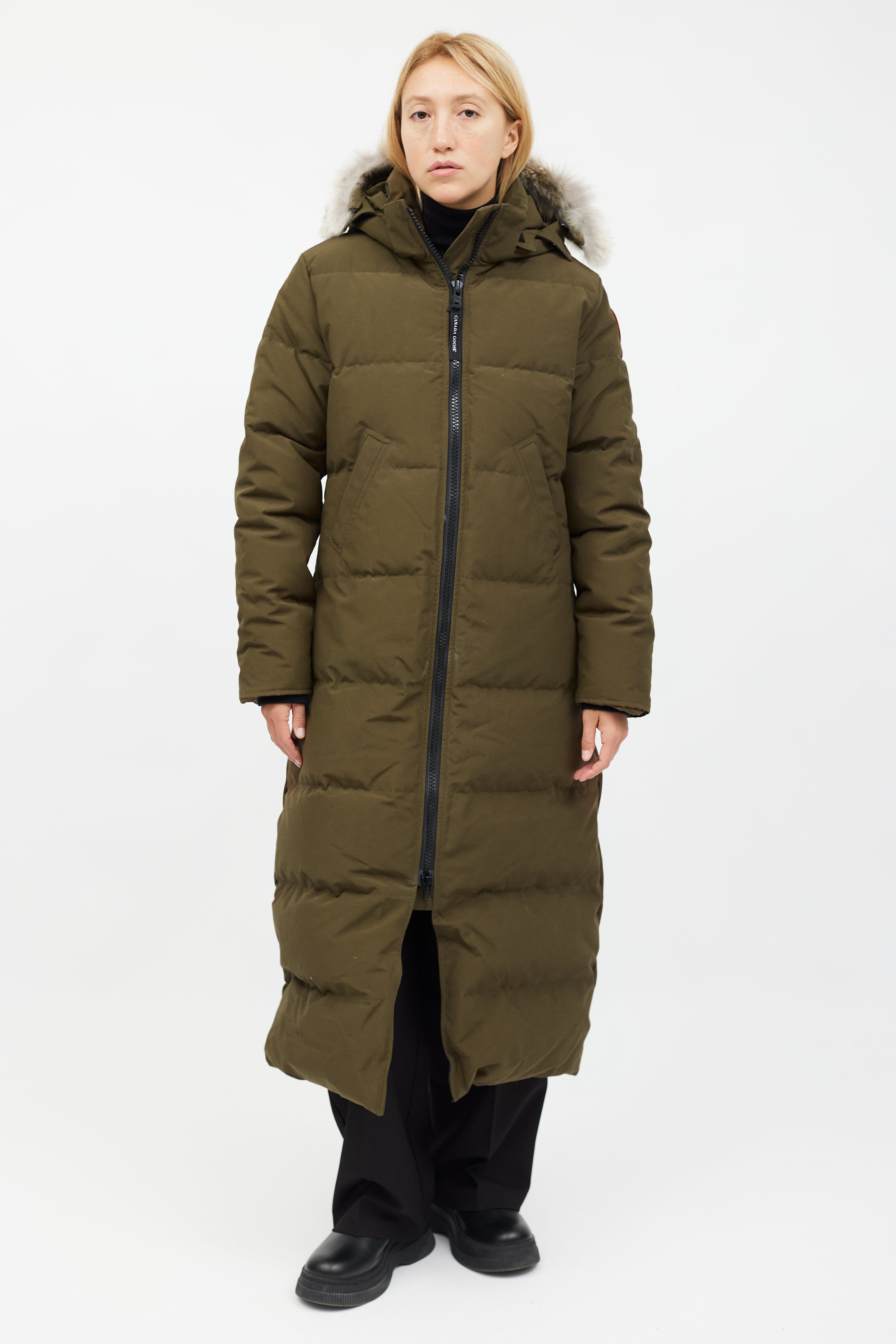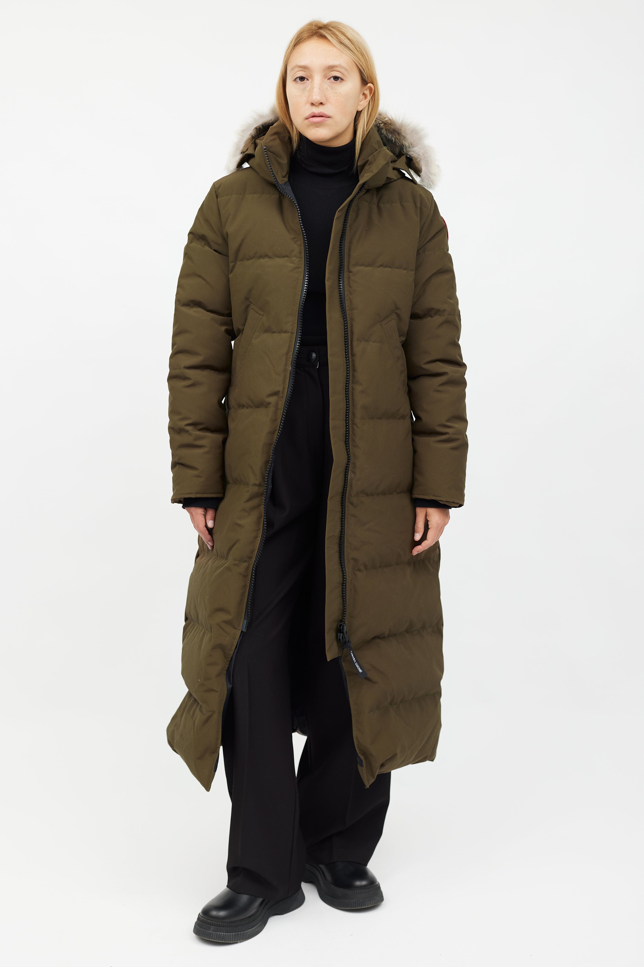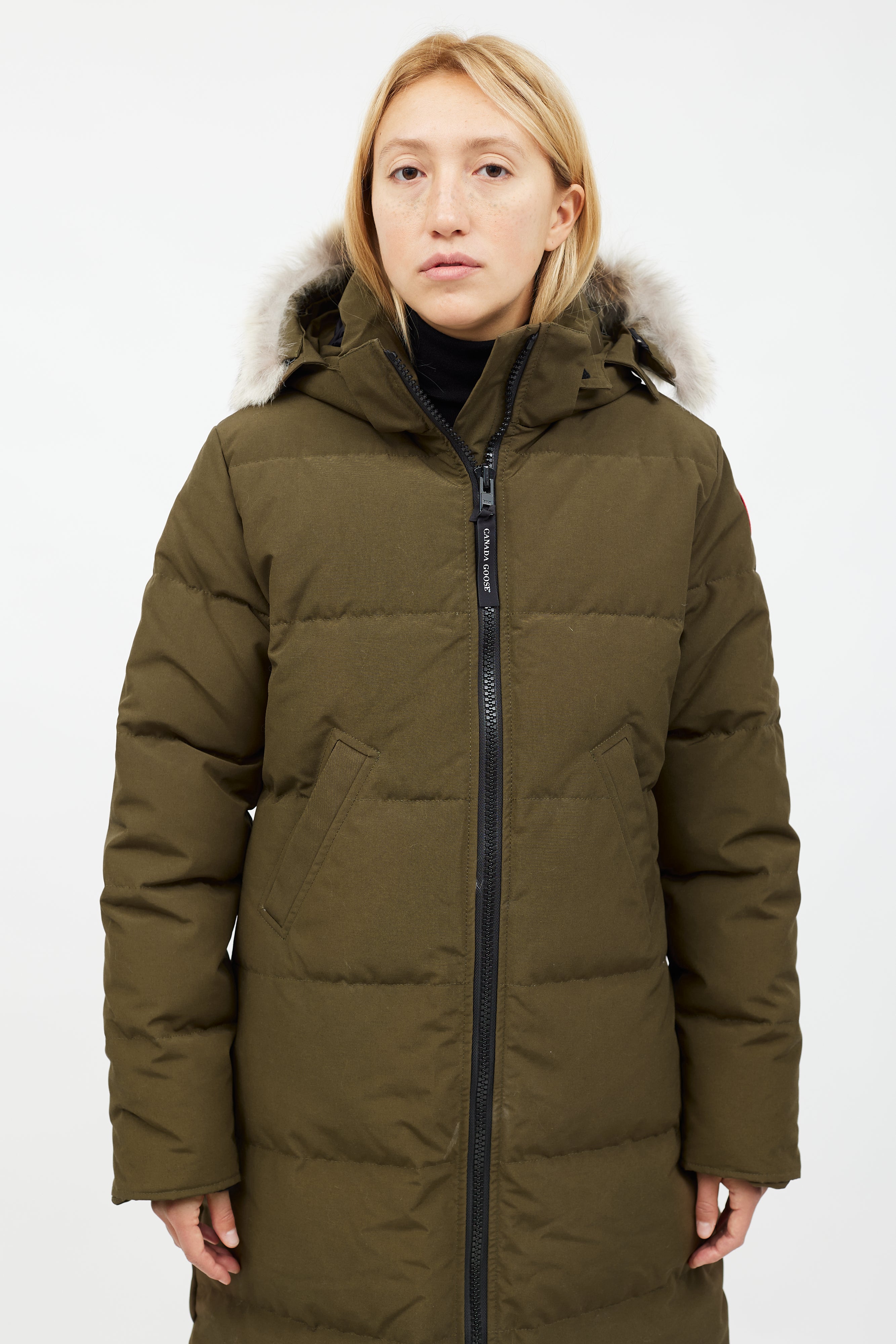 Pre-owned Canada Goose green Mystique parka featuring removable fur trim on hood, backpack straps, quilted design throughout, two slip pockets at waist, storm cuffs, zip front, and embroidered logo patch at arm.