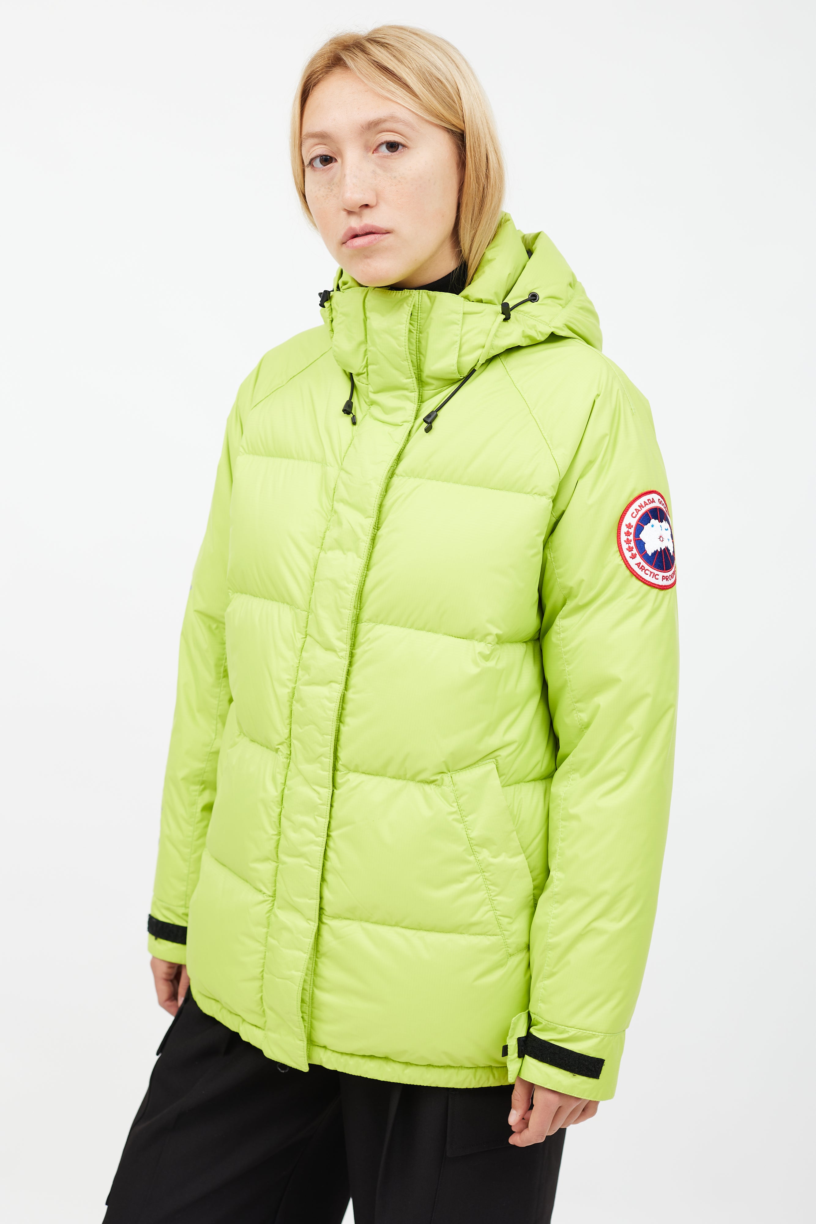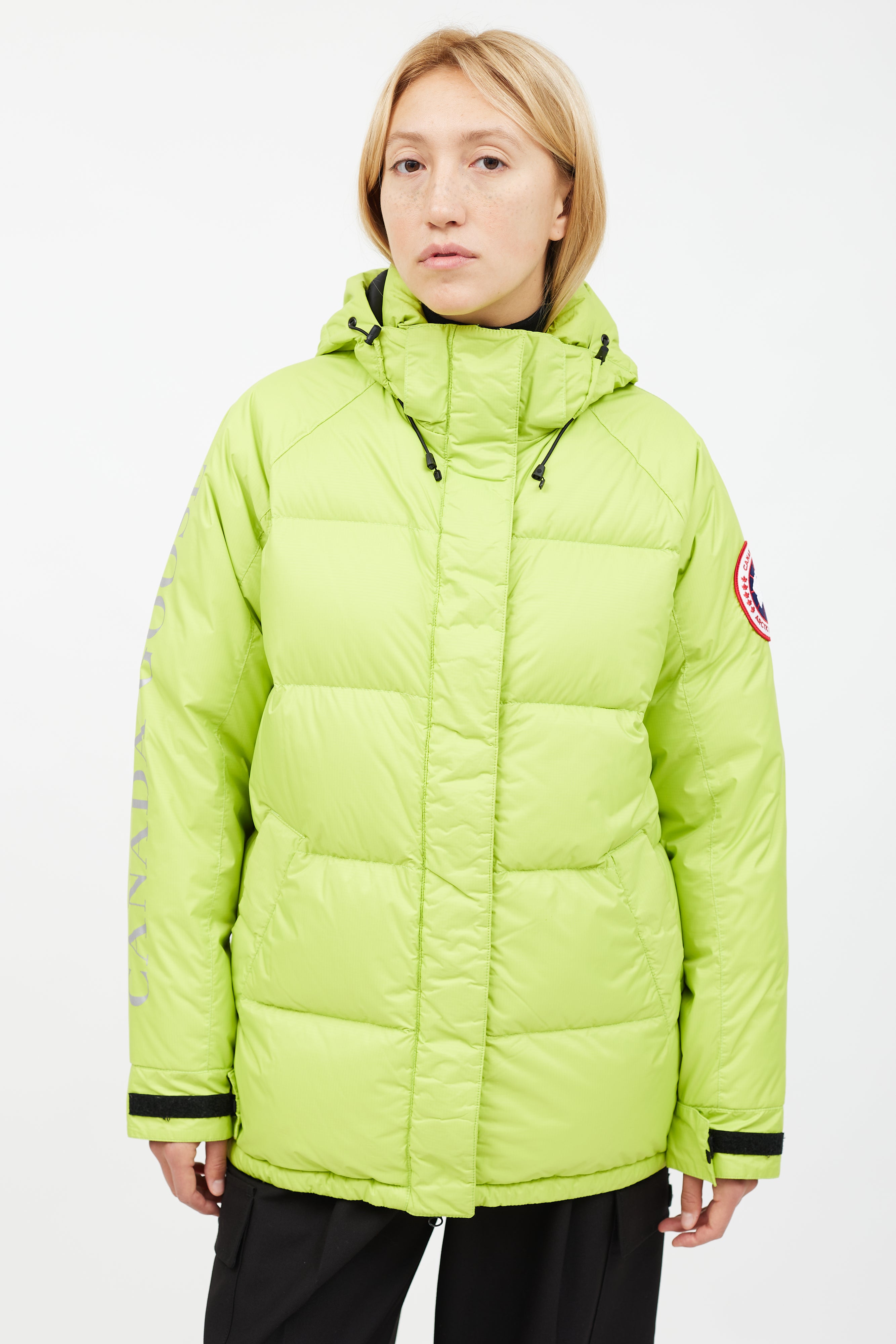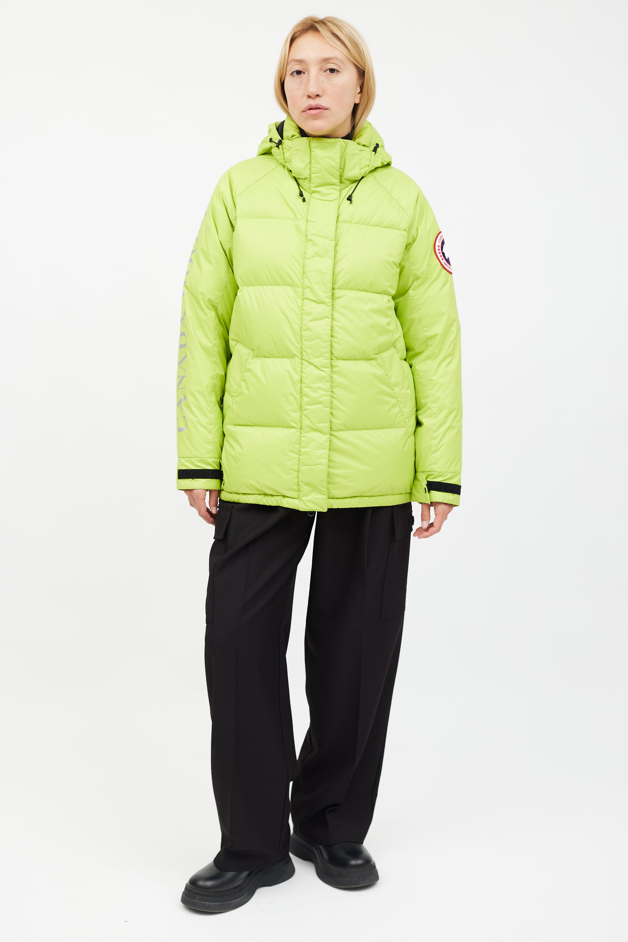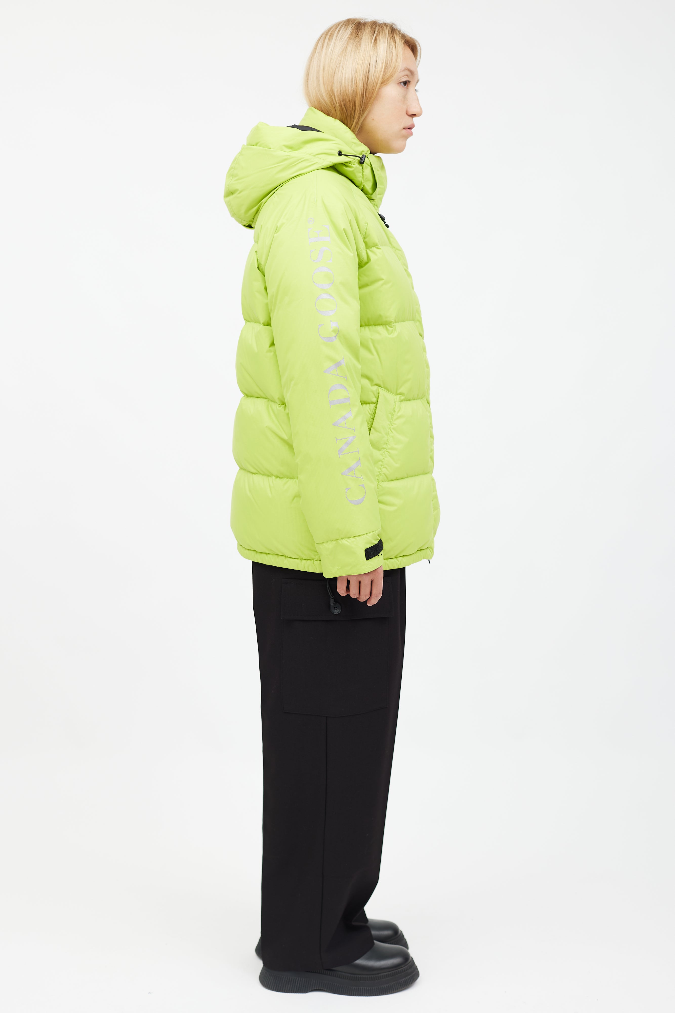 Pre-owned Canada Goose neon green Approach waterproof puffer jacket featuring removable hood with adjustable drawstring, two slip pockets at hip with button closure, reflective logo at right arm, embroidered logo patch at left arm, zip front with snap closure, and adjustable velcro cuffs. Lined. Style has been discontinued.
