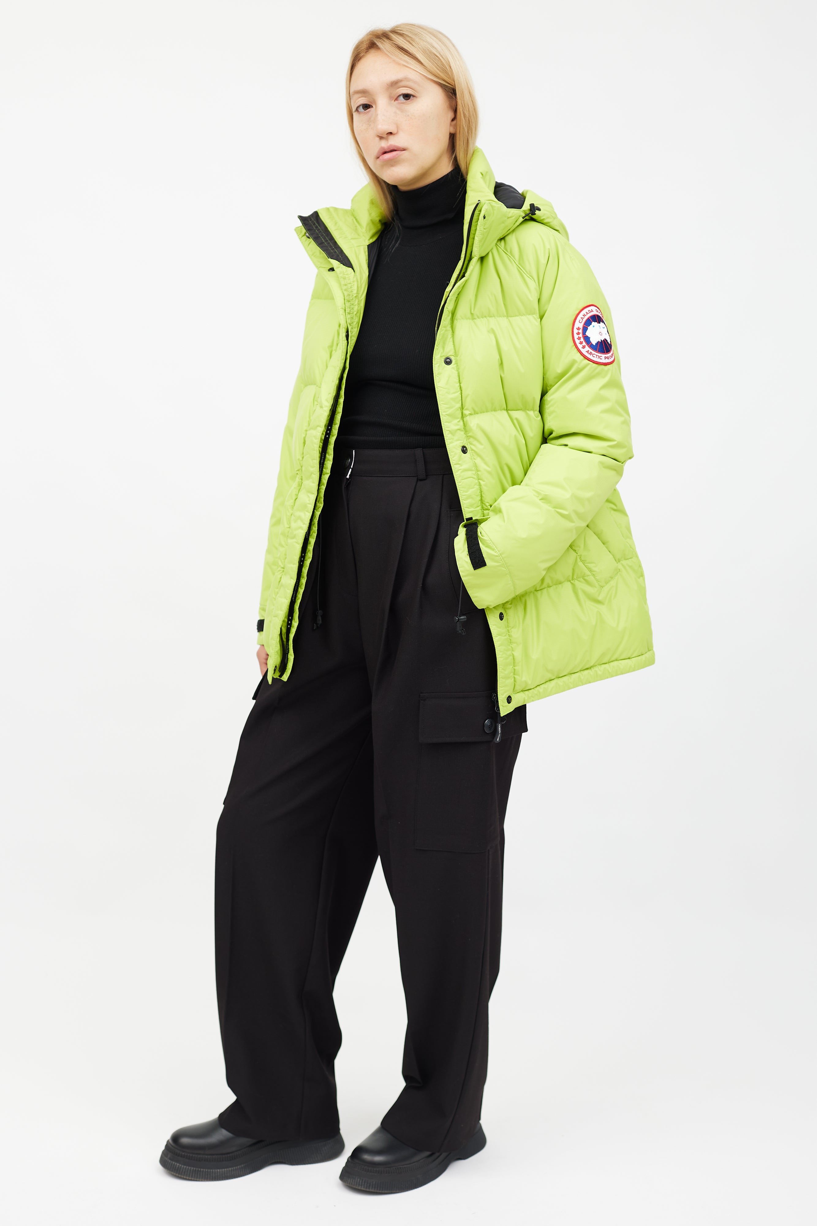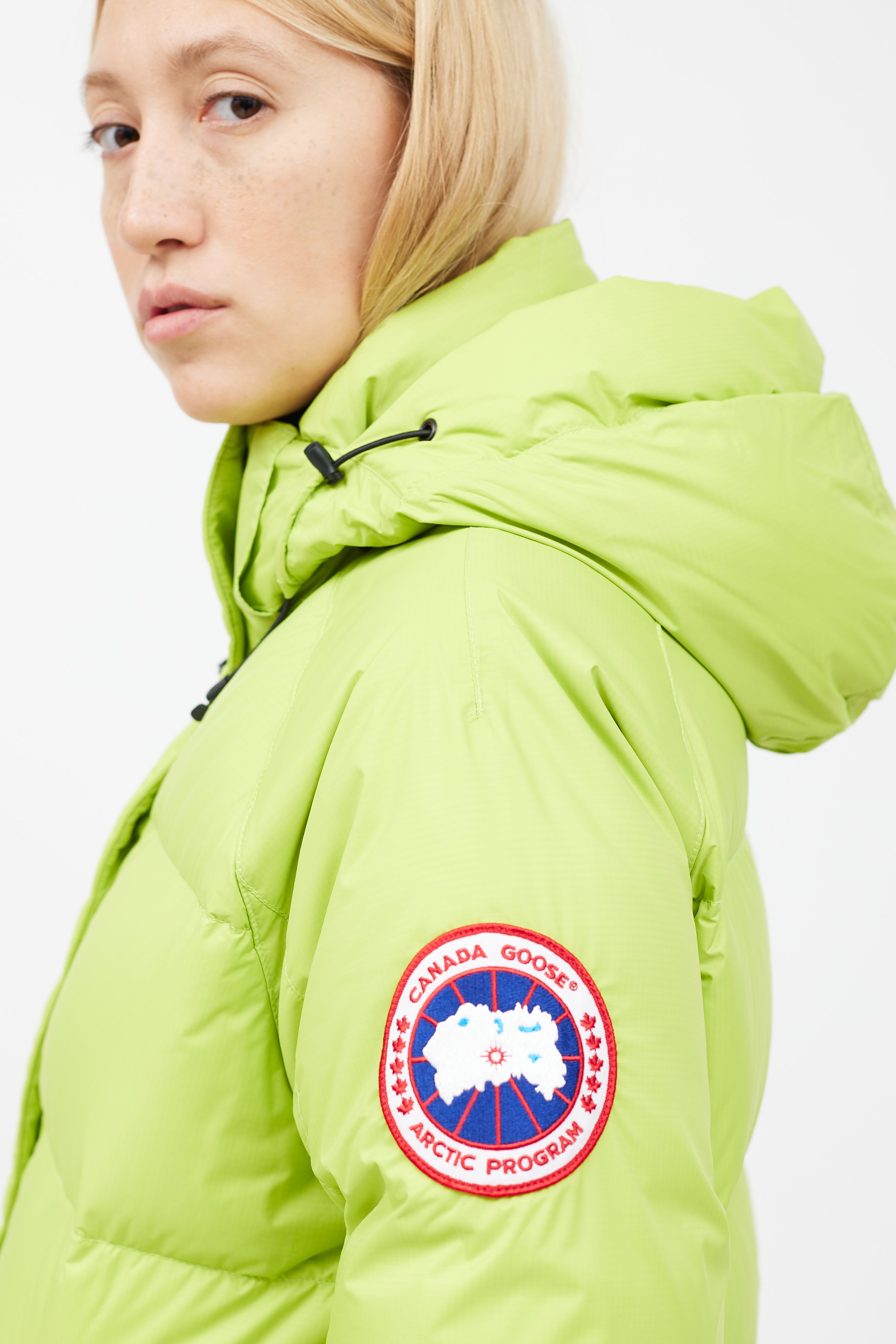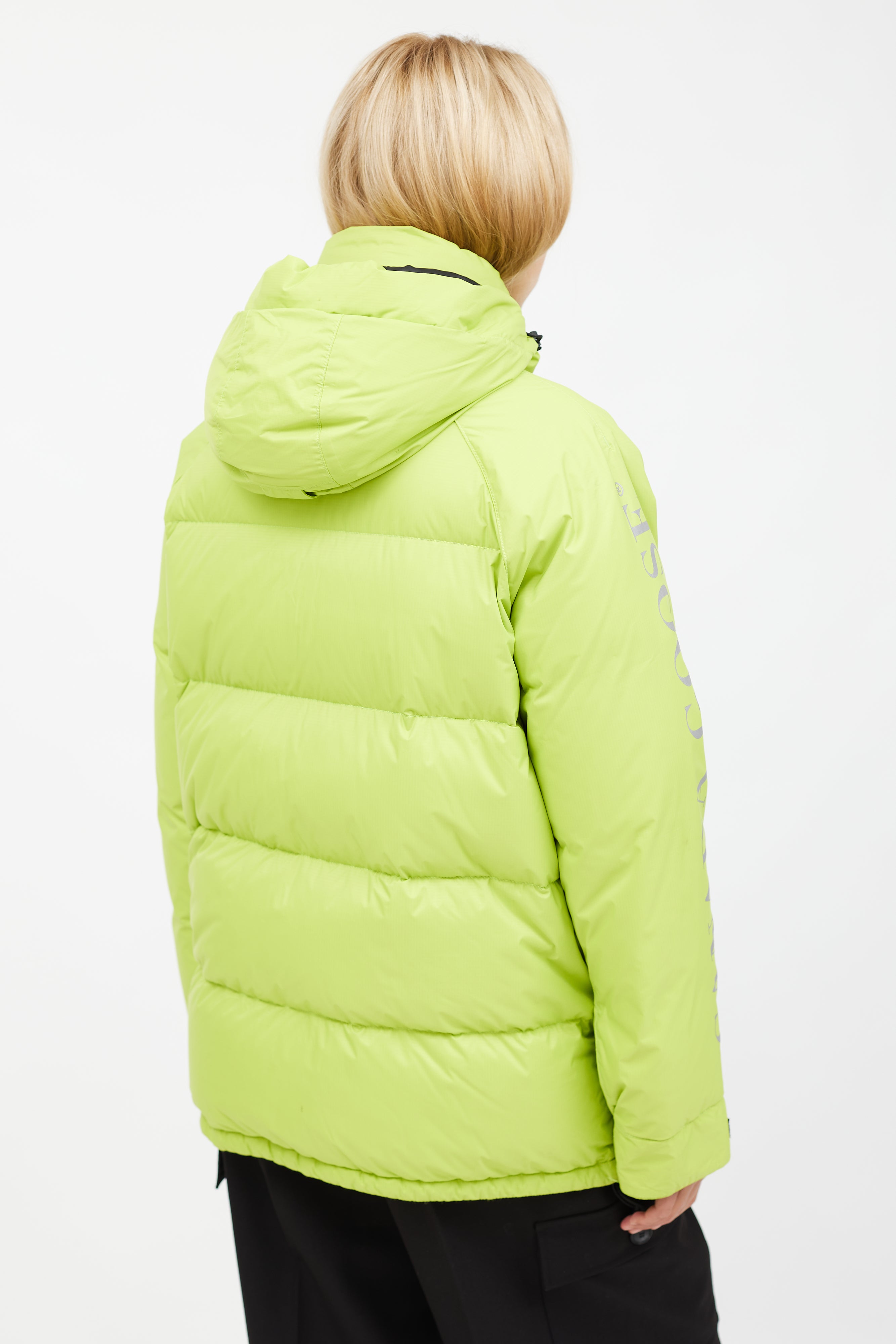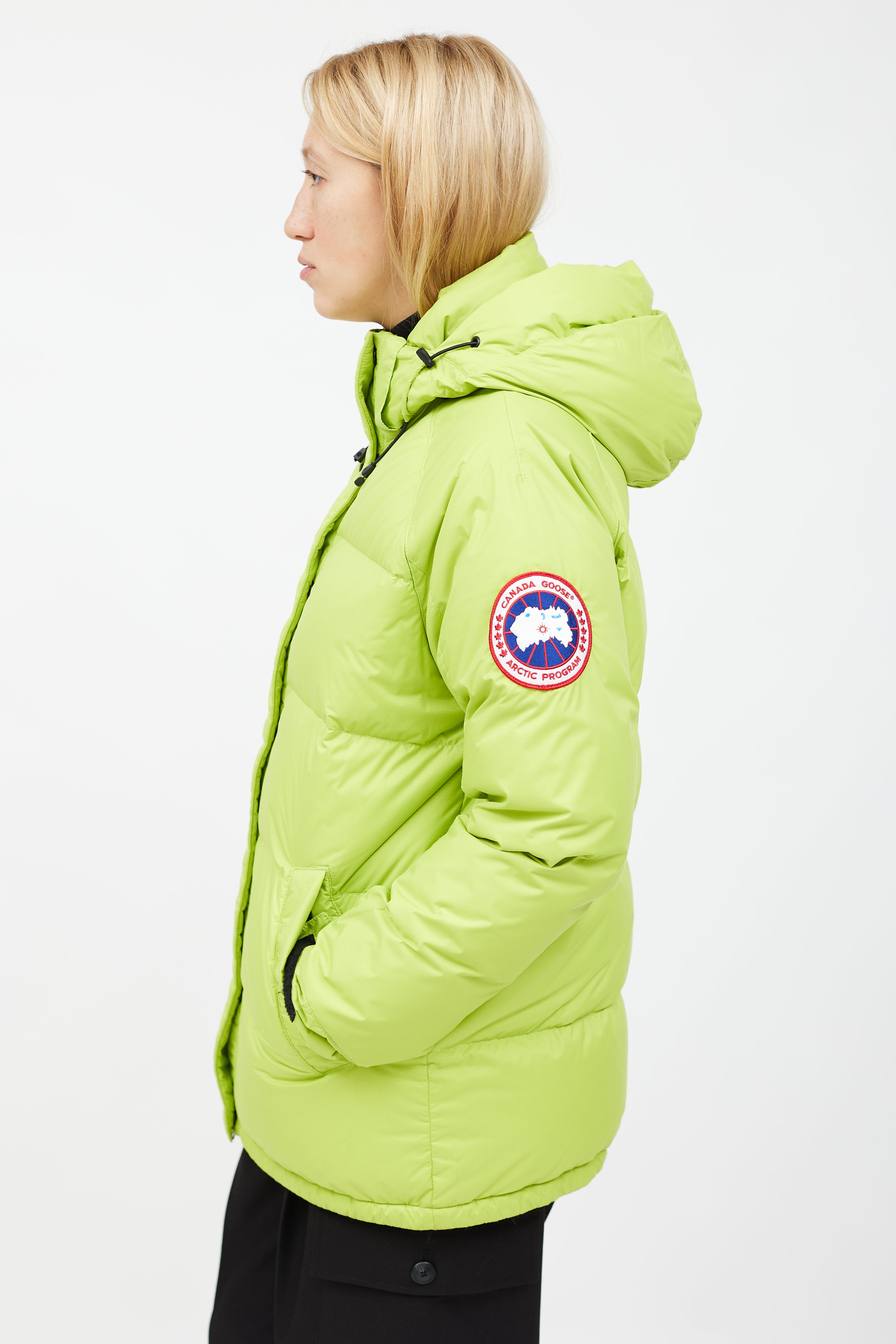 Pre-owned Canada Goose neon green Approach waterproof puffer jacket featuring removable hood with adjustable drawstring, two slip pockets at hip with button closure, reflective logo at right arm, embroidered logo patch at left arm, zip front with snap closure, and adjustable velcro cuffs. Lined. Style has been discontinued.