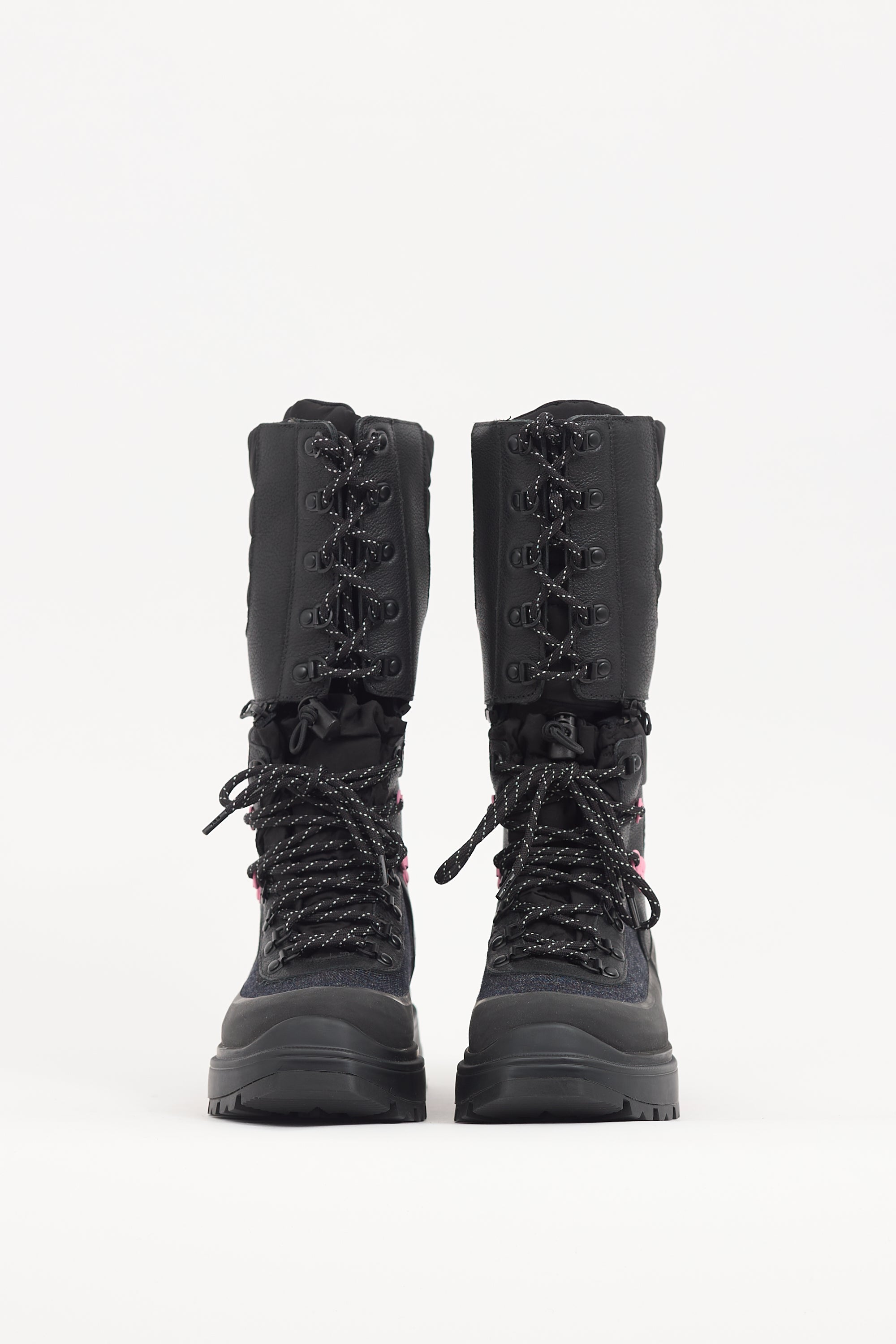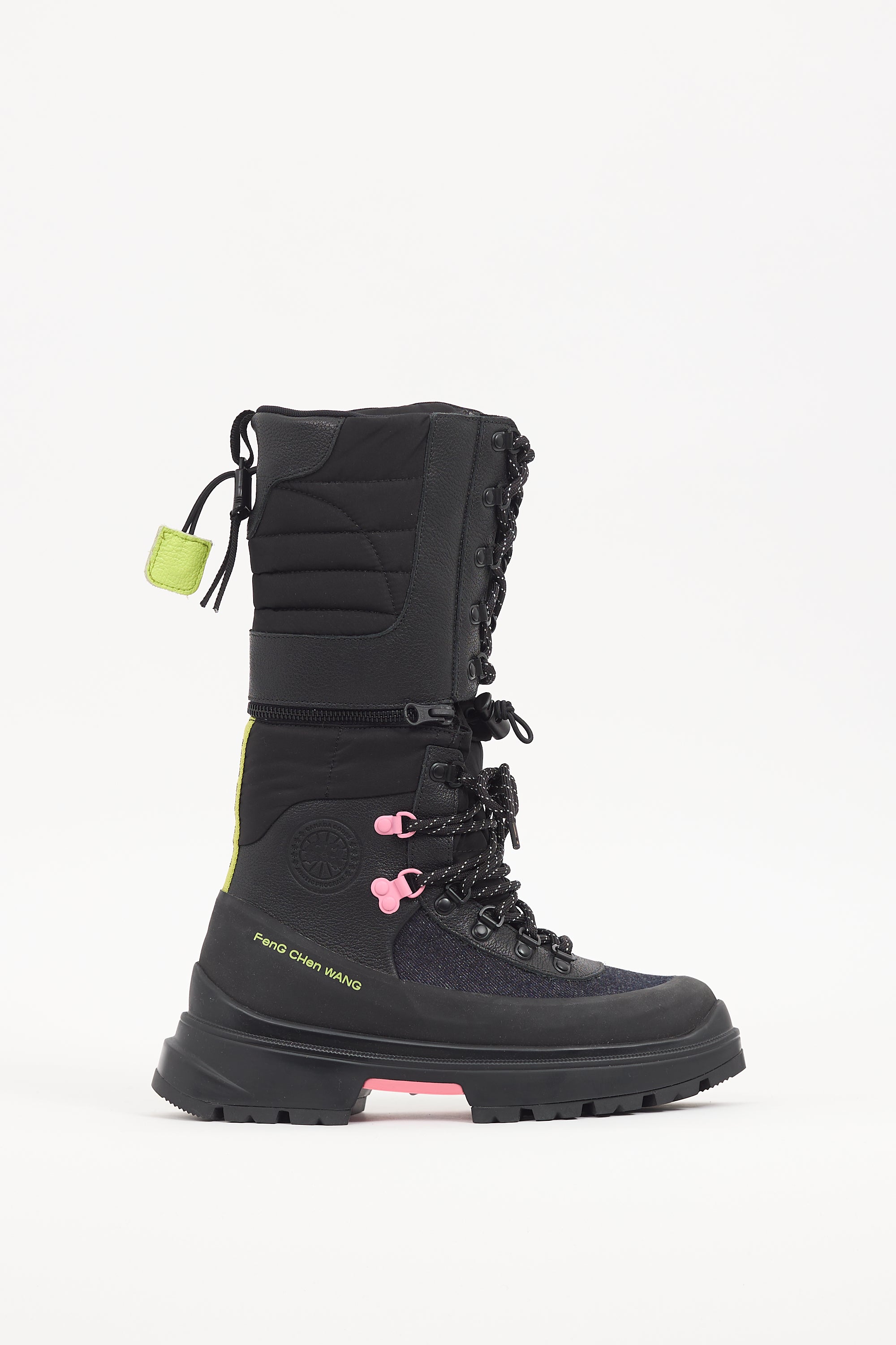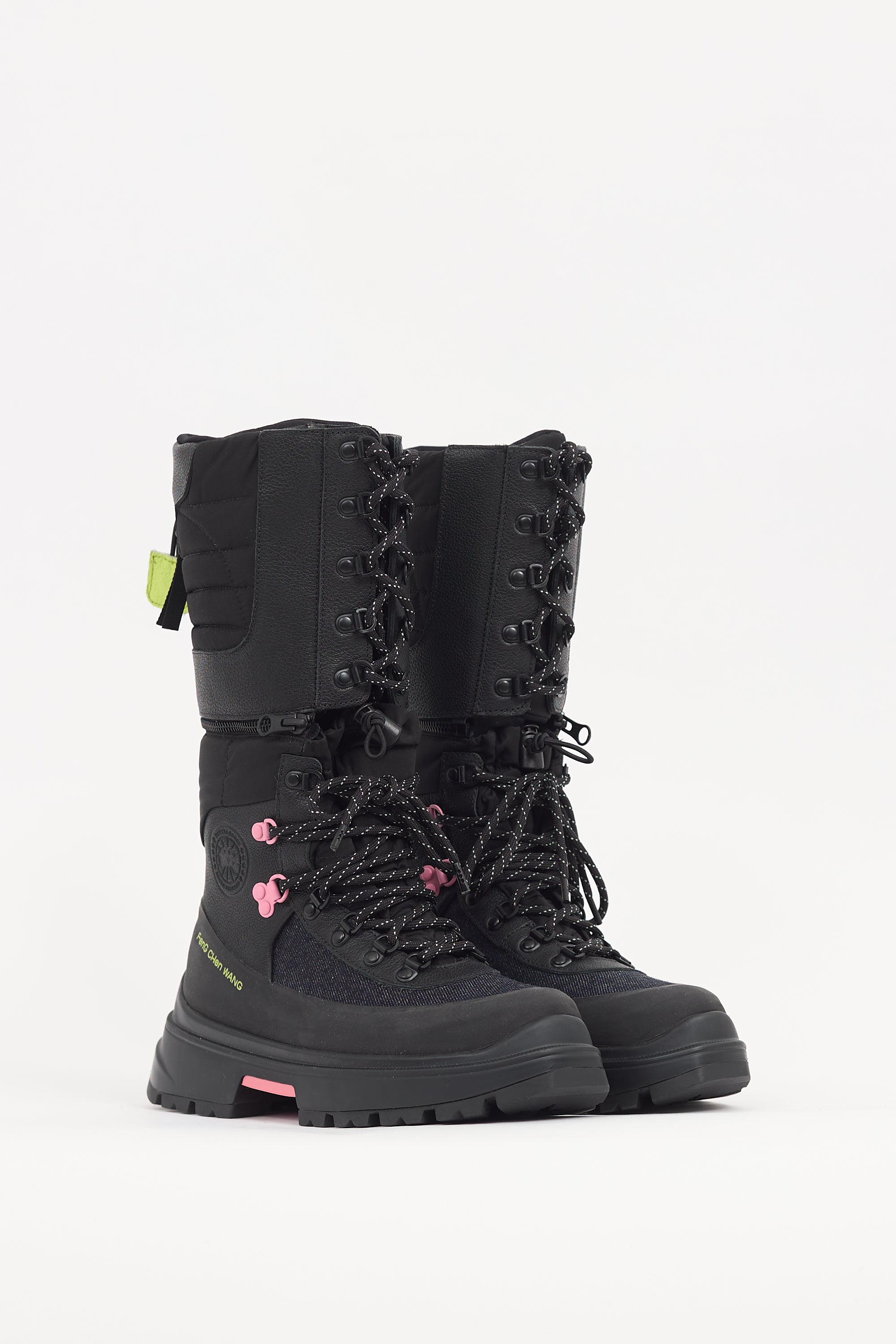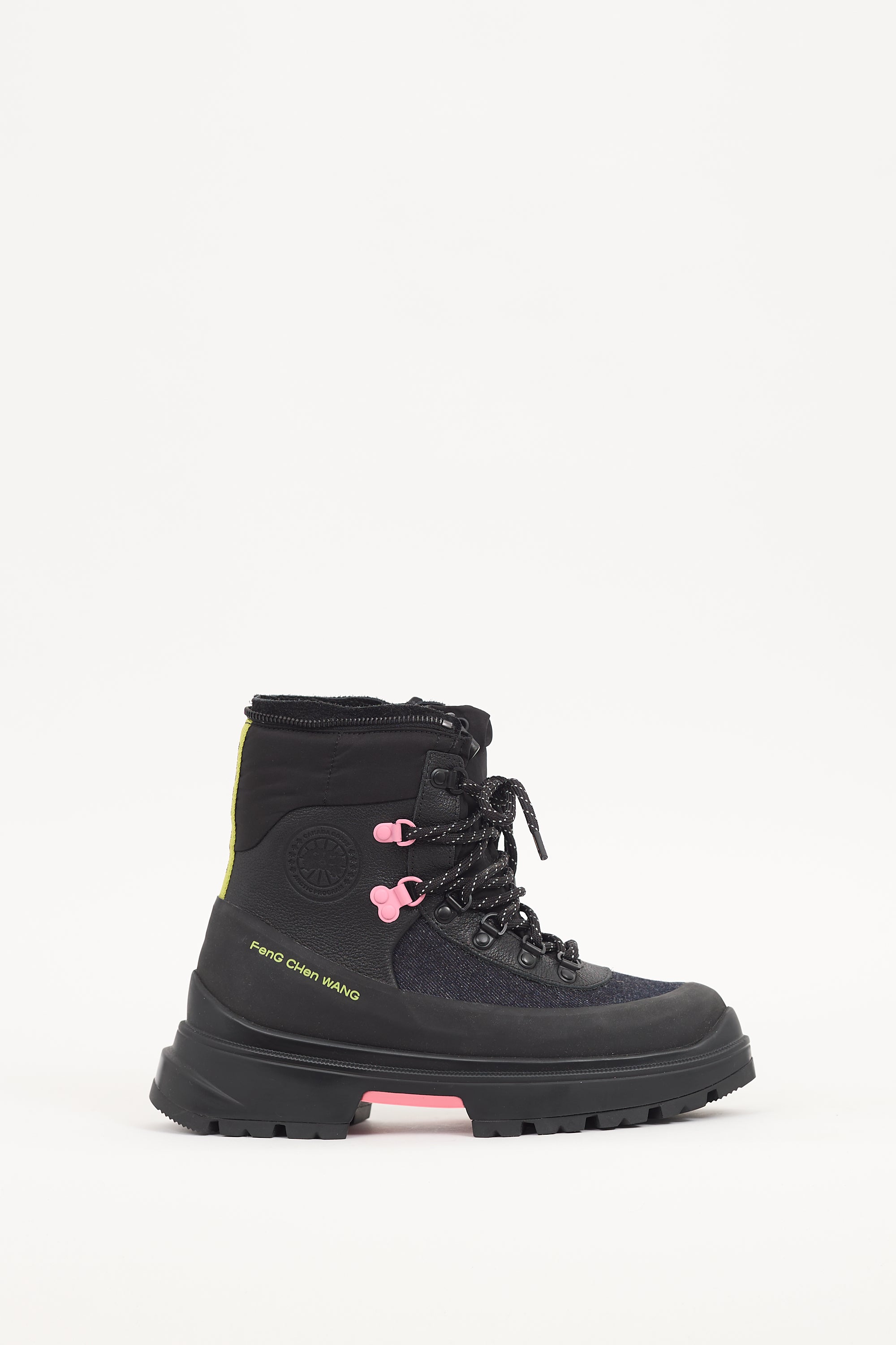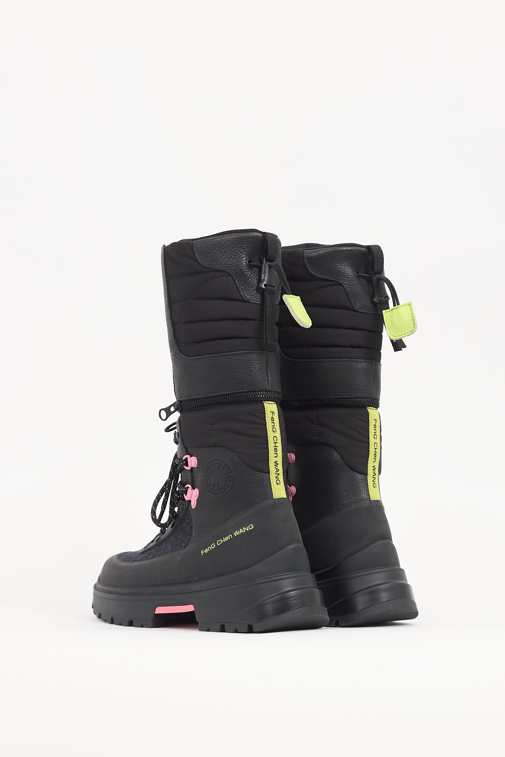 Pre-owned Canada Goose X Feng Chen Wang black and navy Journey boots featuring rounded toe, stamped logo at midsole, lace up front, mixed denim and leather upper, and detachable puffer shaft with zip fastening. Comes with original dust bag.