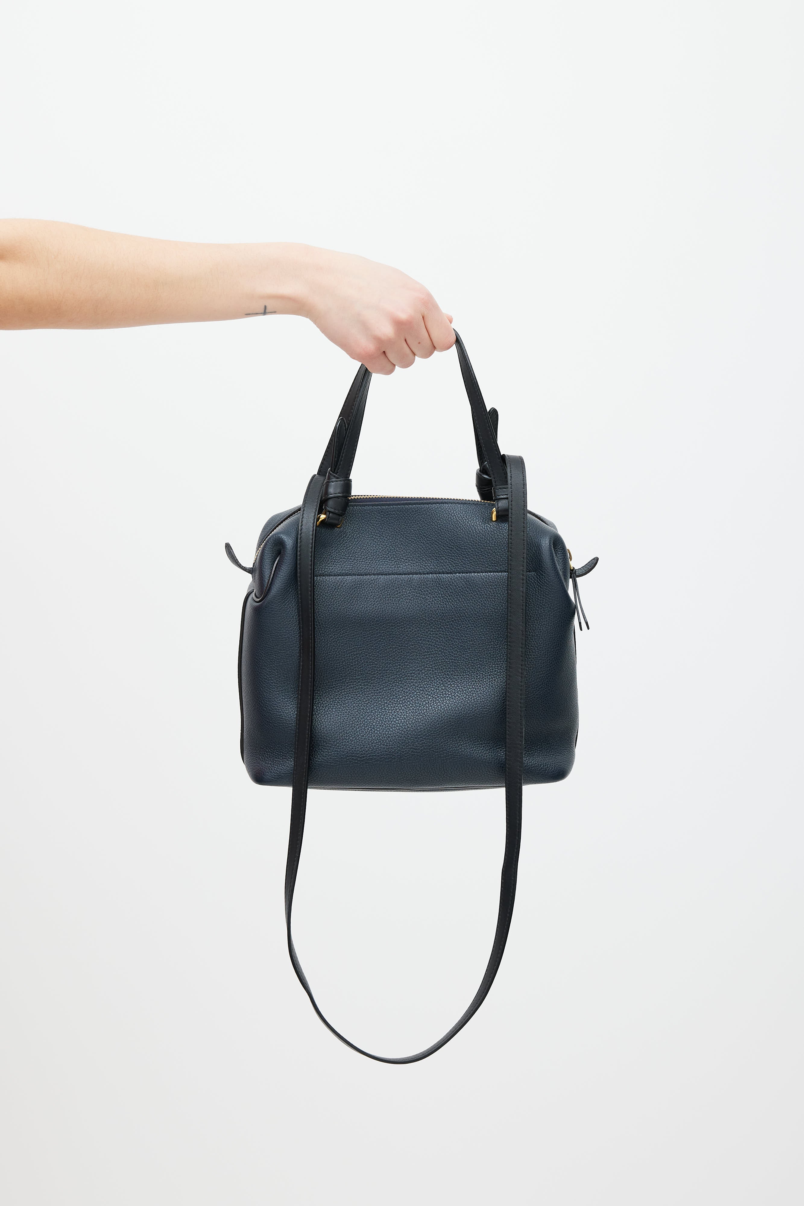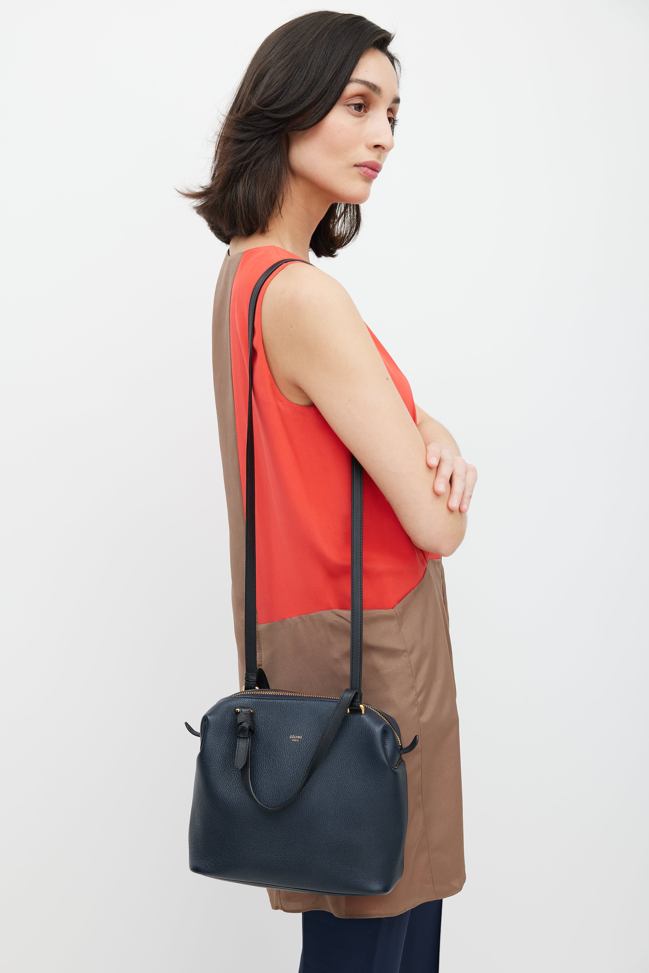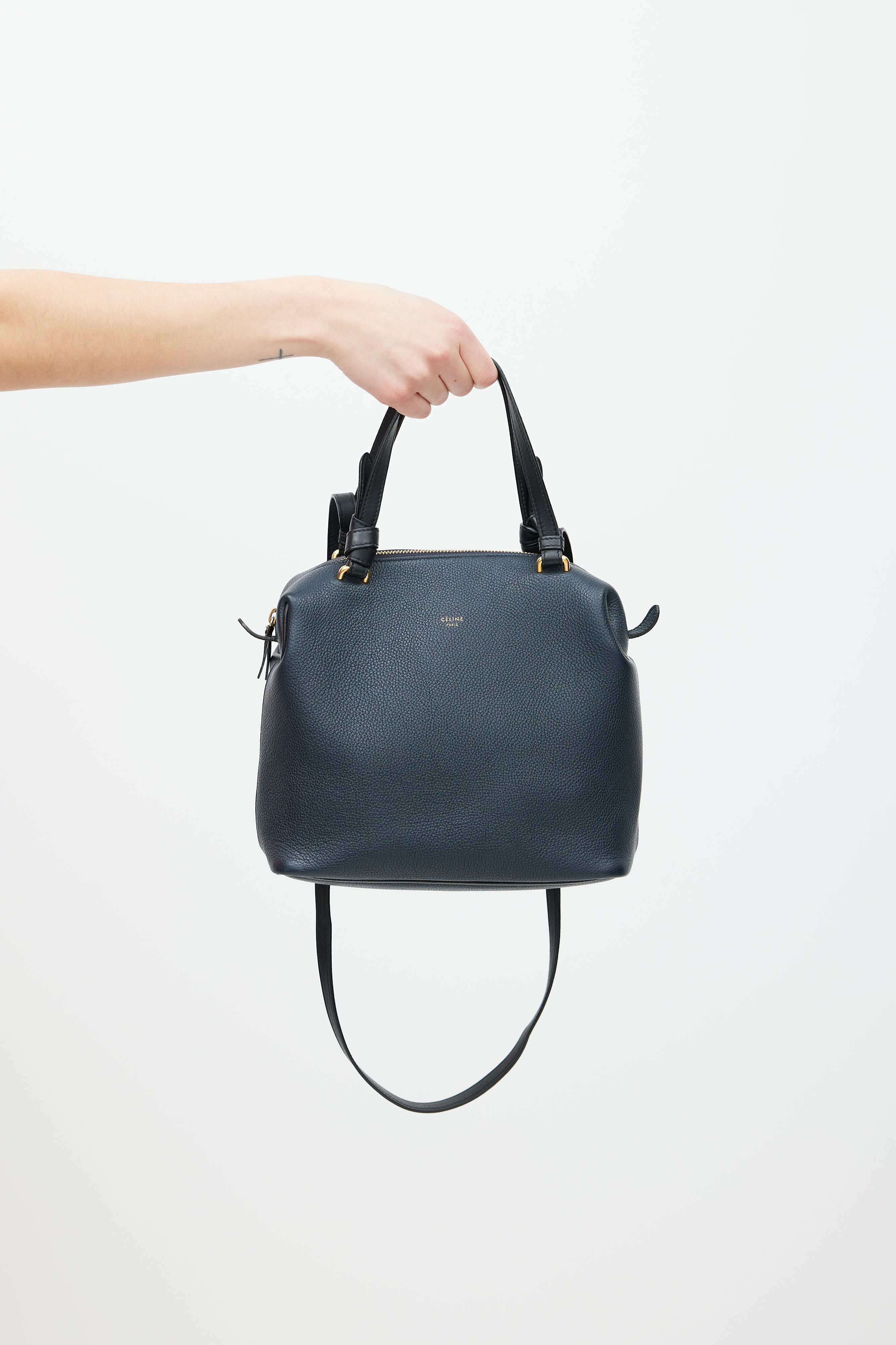 Pre-owned 2017 Celine navy Soft Cube leather bag featuring an embossed logo at front, two knotted top handles, one main compartment with two slip pockets, shoulder strap, and top zip closure. Comes with original dust bag.
