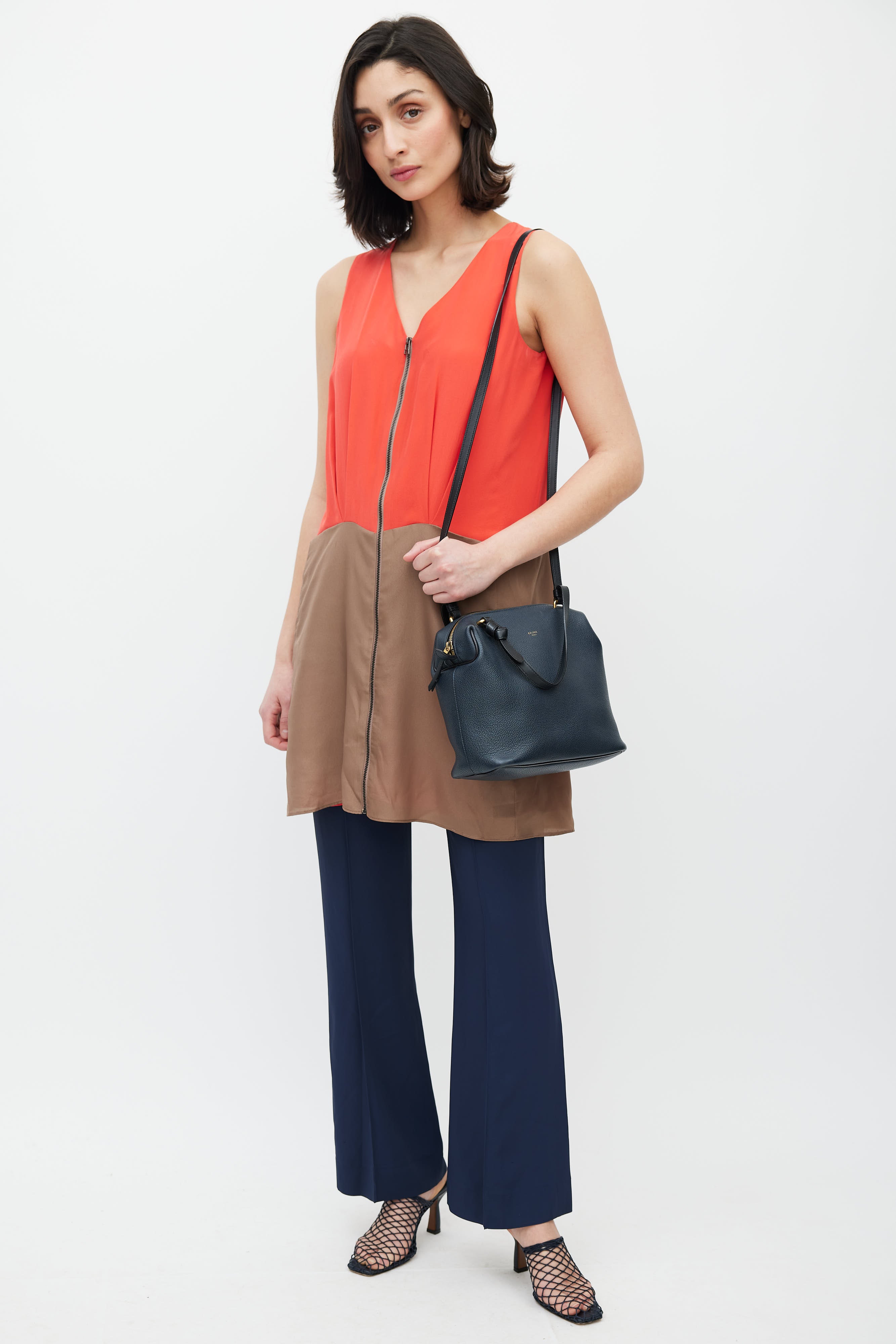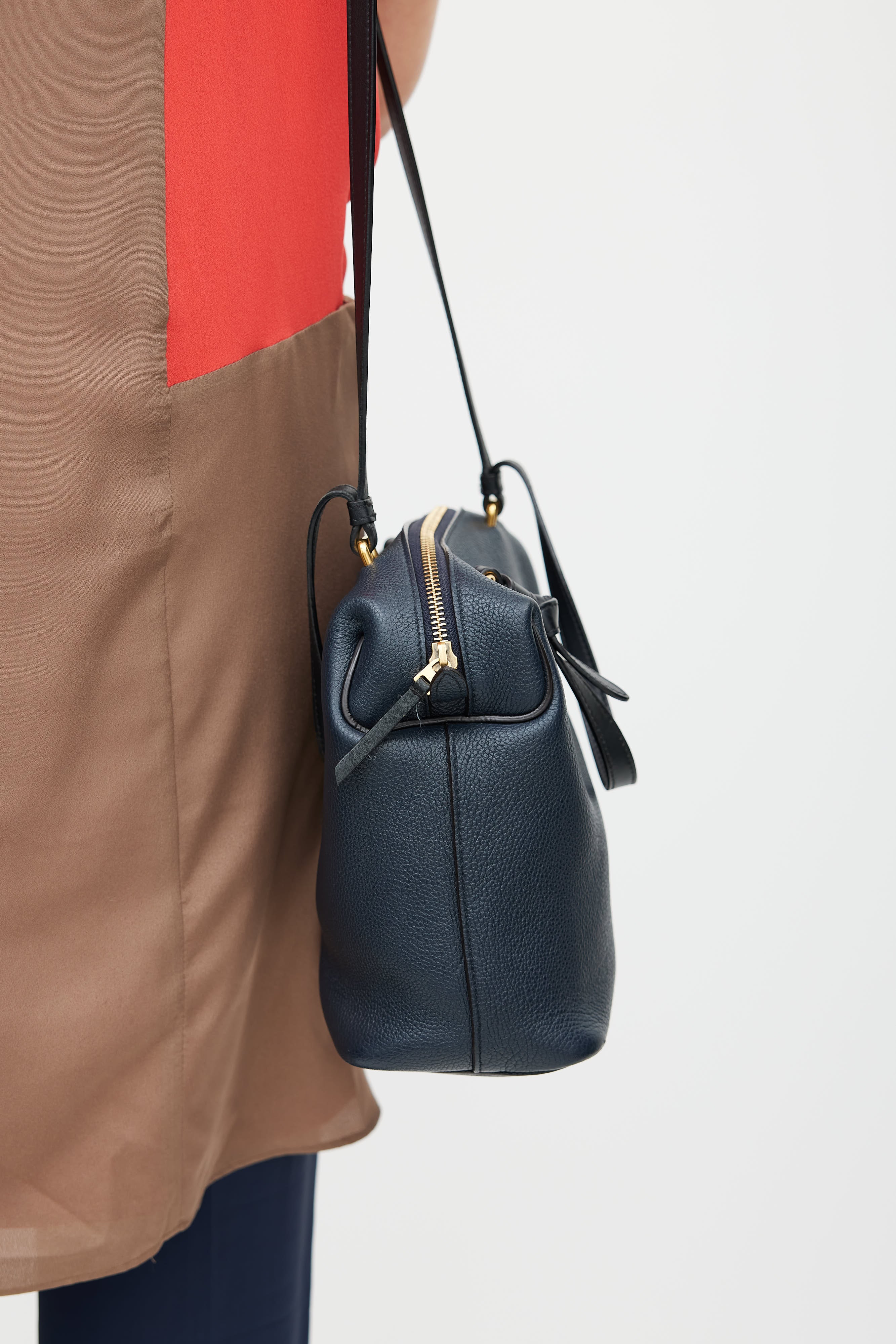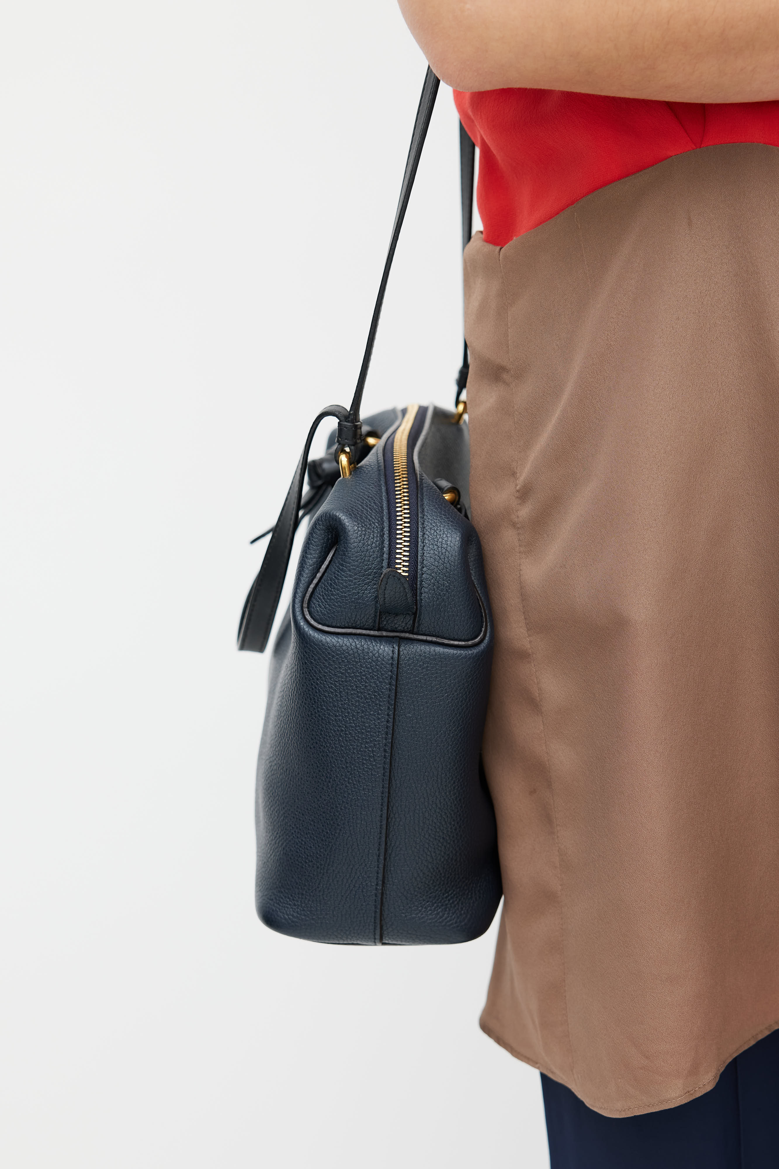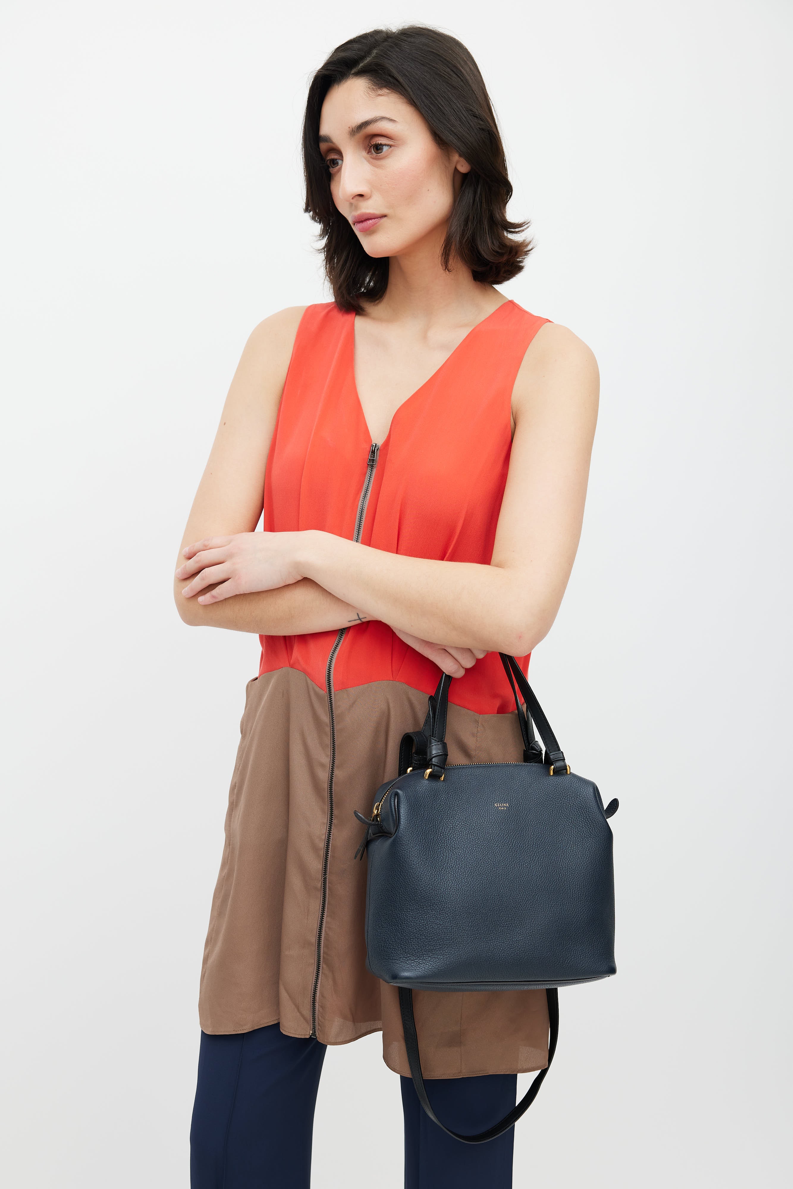 Pre-owned 2017 Celine navy Soft Cube leather bag featuring an embossed logo at front, two knotted top handles, one main compartment with two slip pockets, shoulder strap, and top zip closure. Comes with original dust bag.
