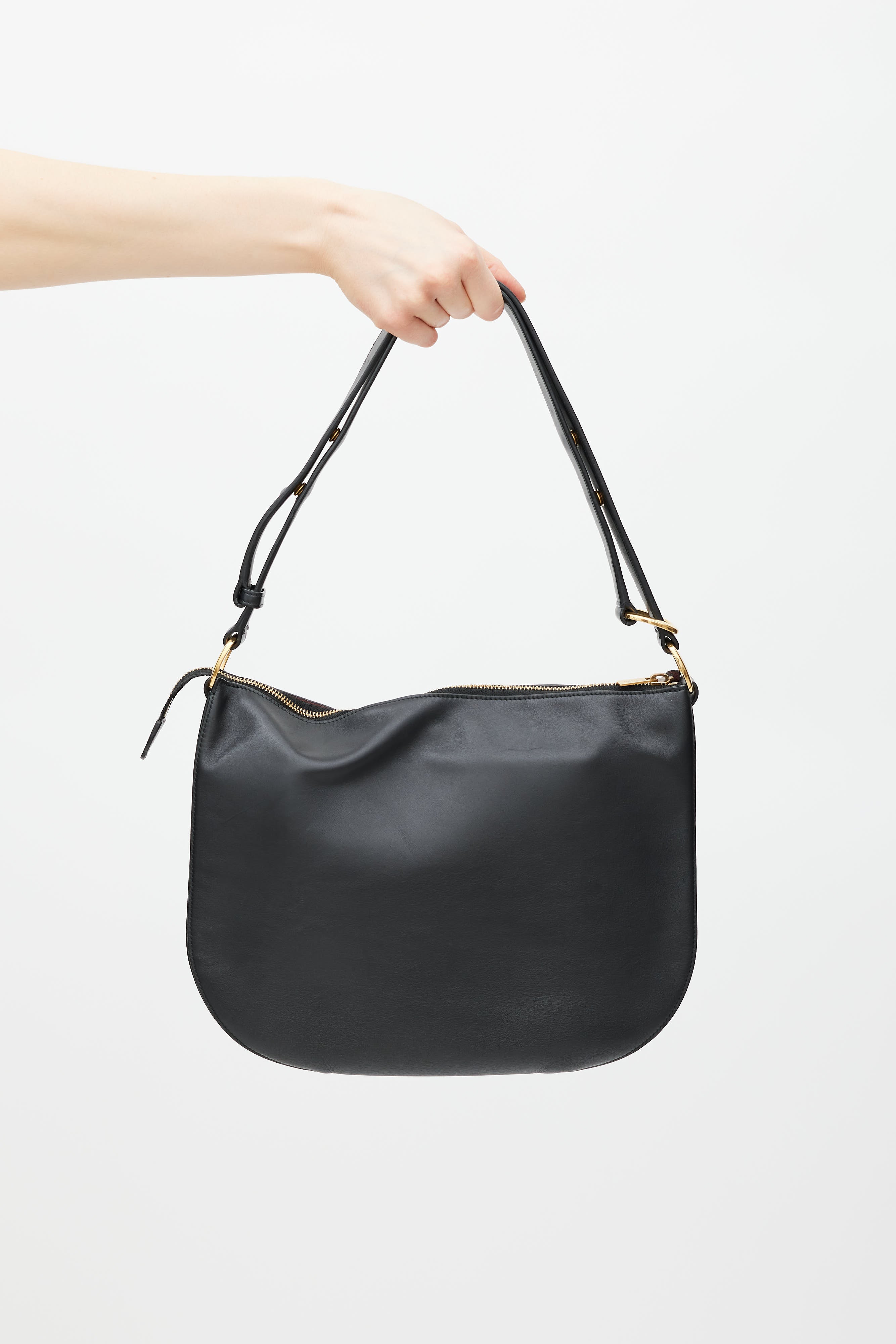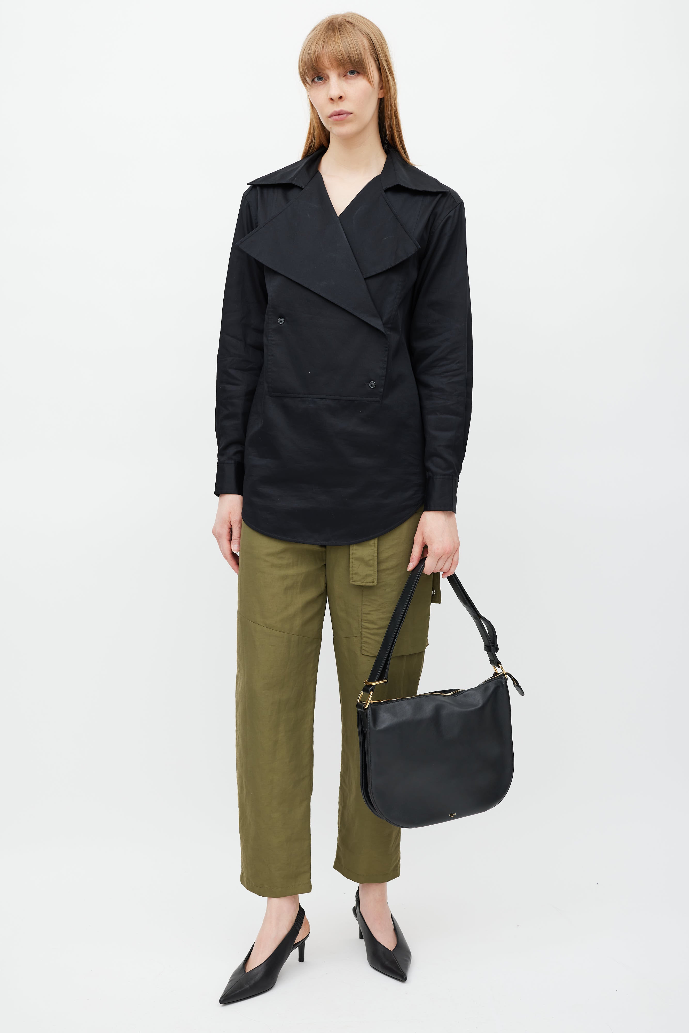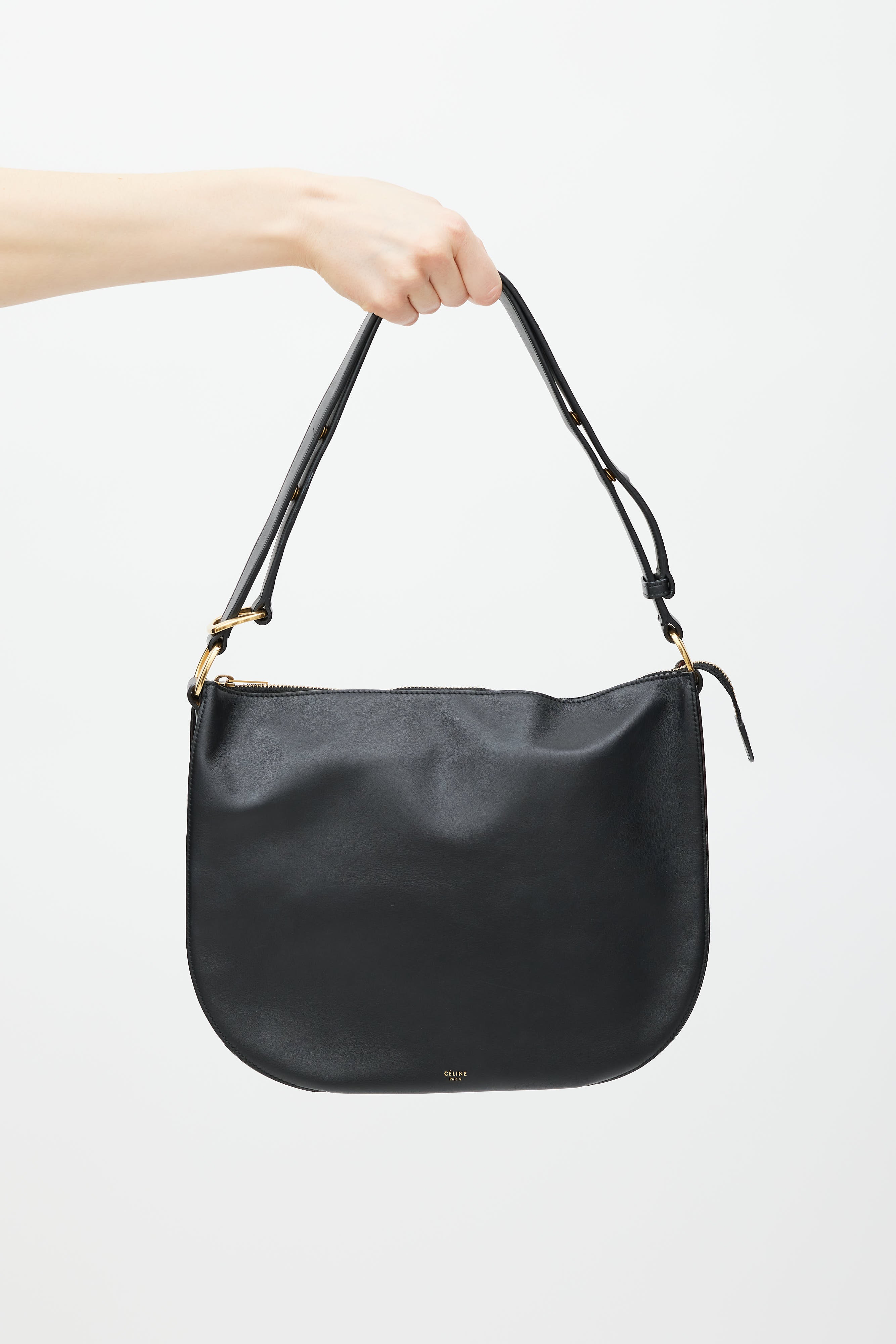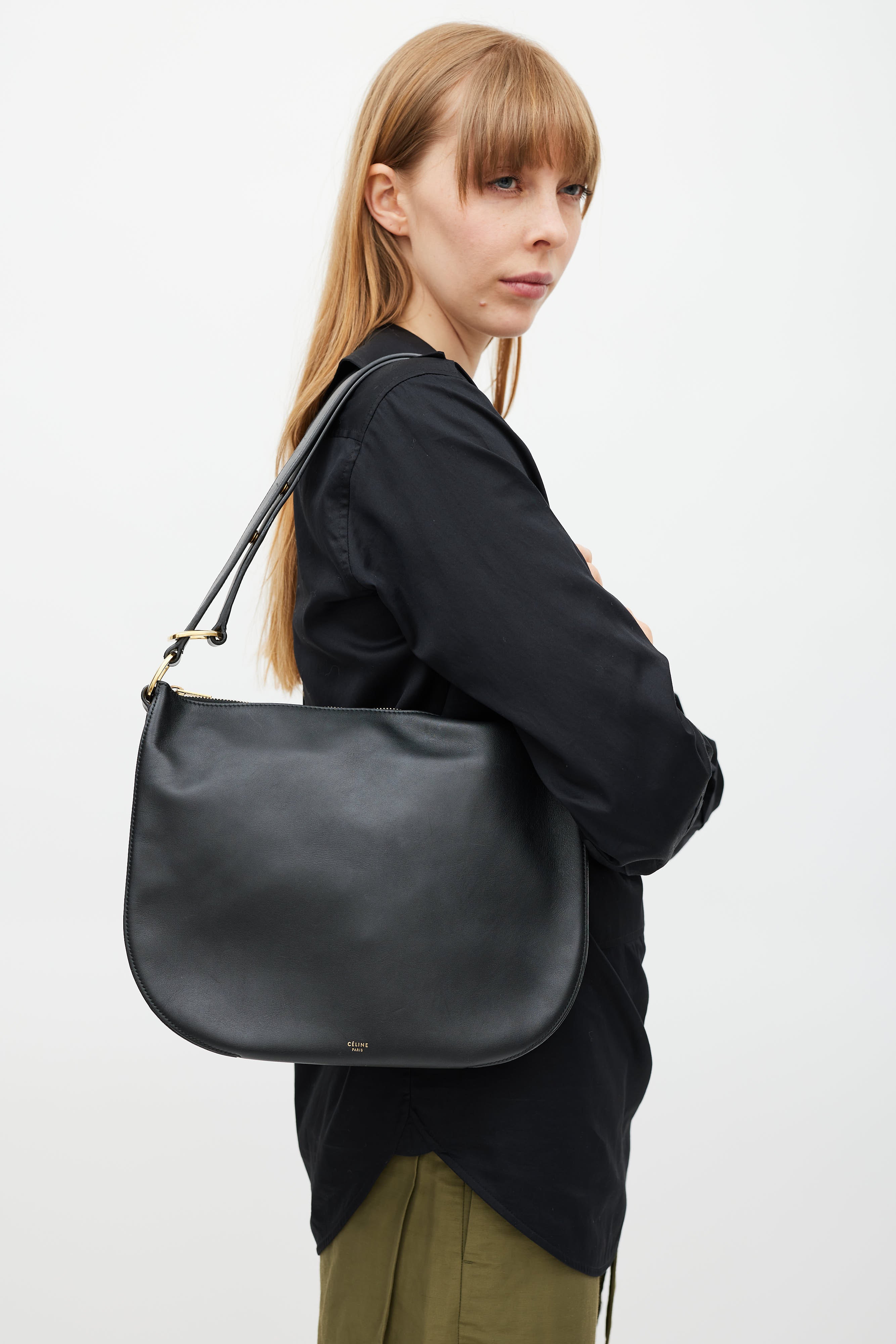 Pre-owned Celine black Accordian leather saddle bag featuring an embossed logo at front, three main compartments, two internal slip pockets, adjustable shoulder straps, and top zip closure. Comes with original dust bag.