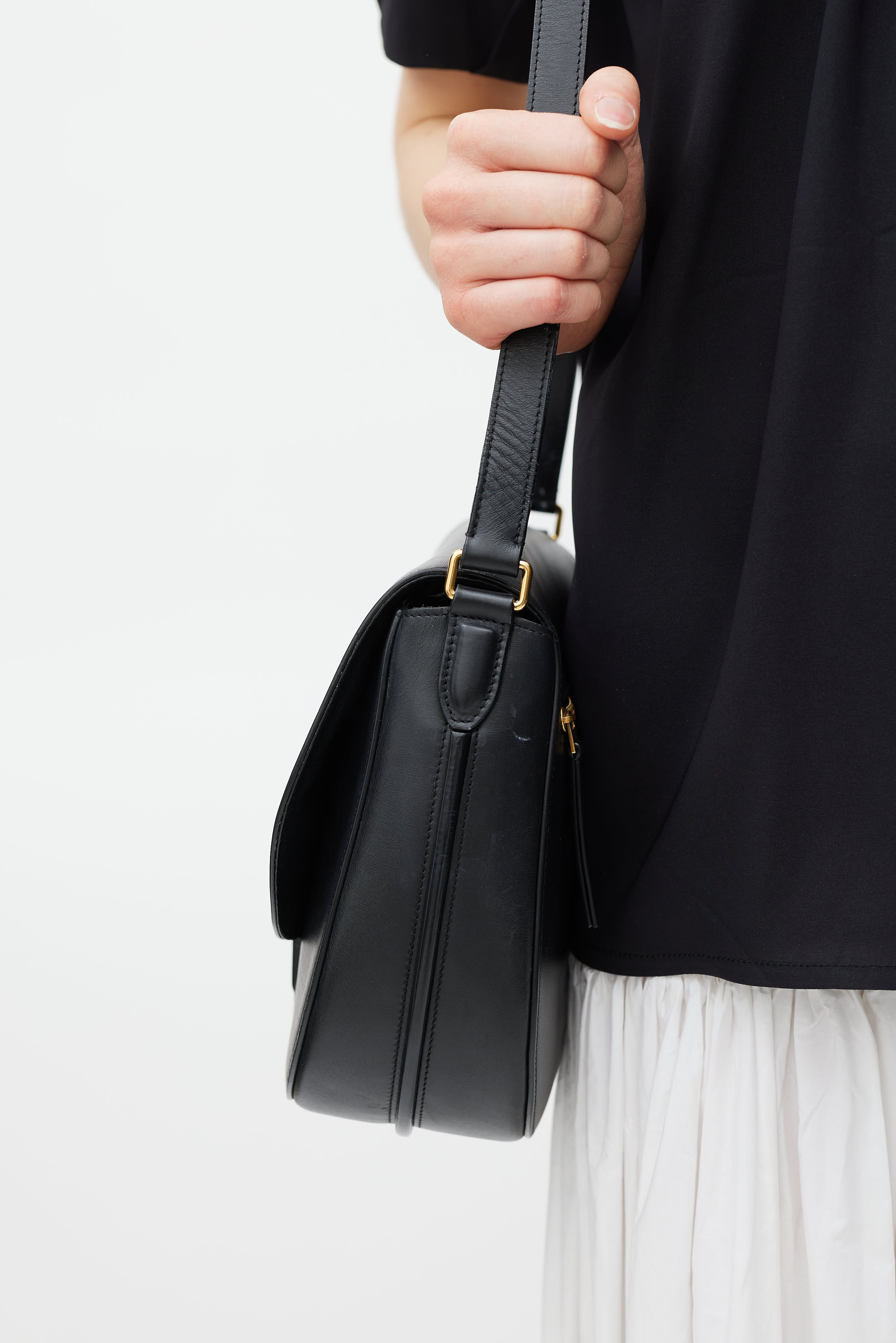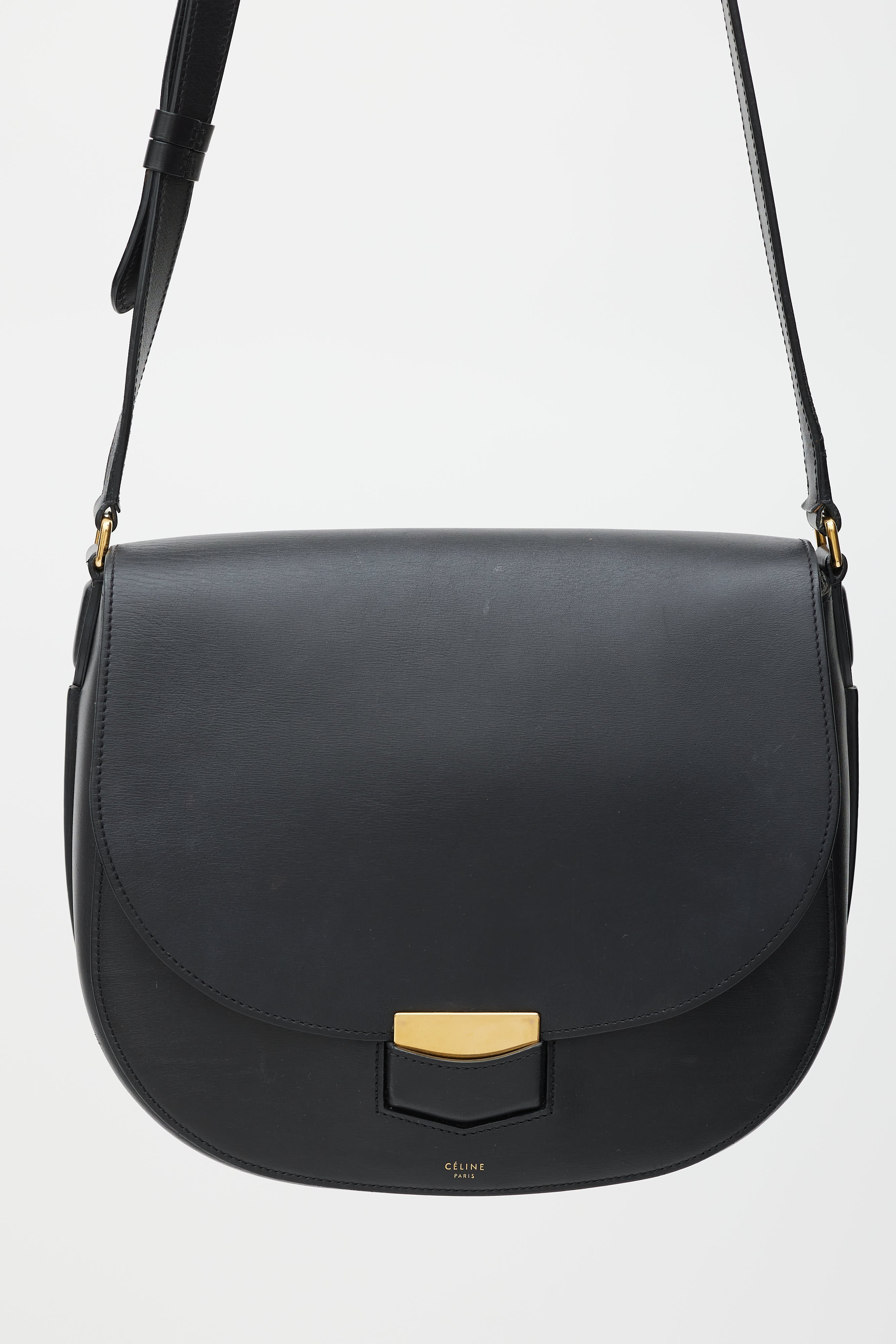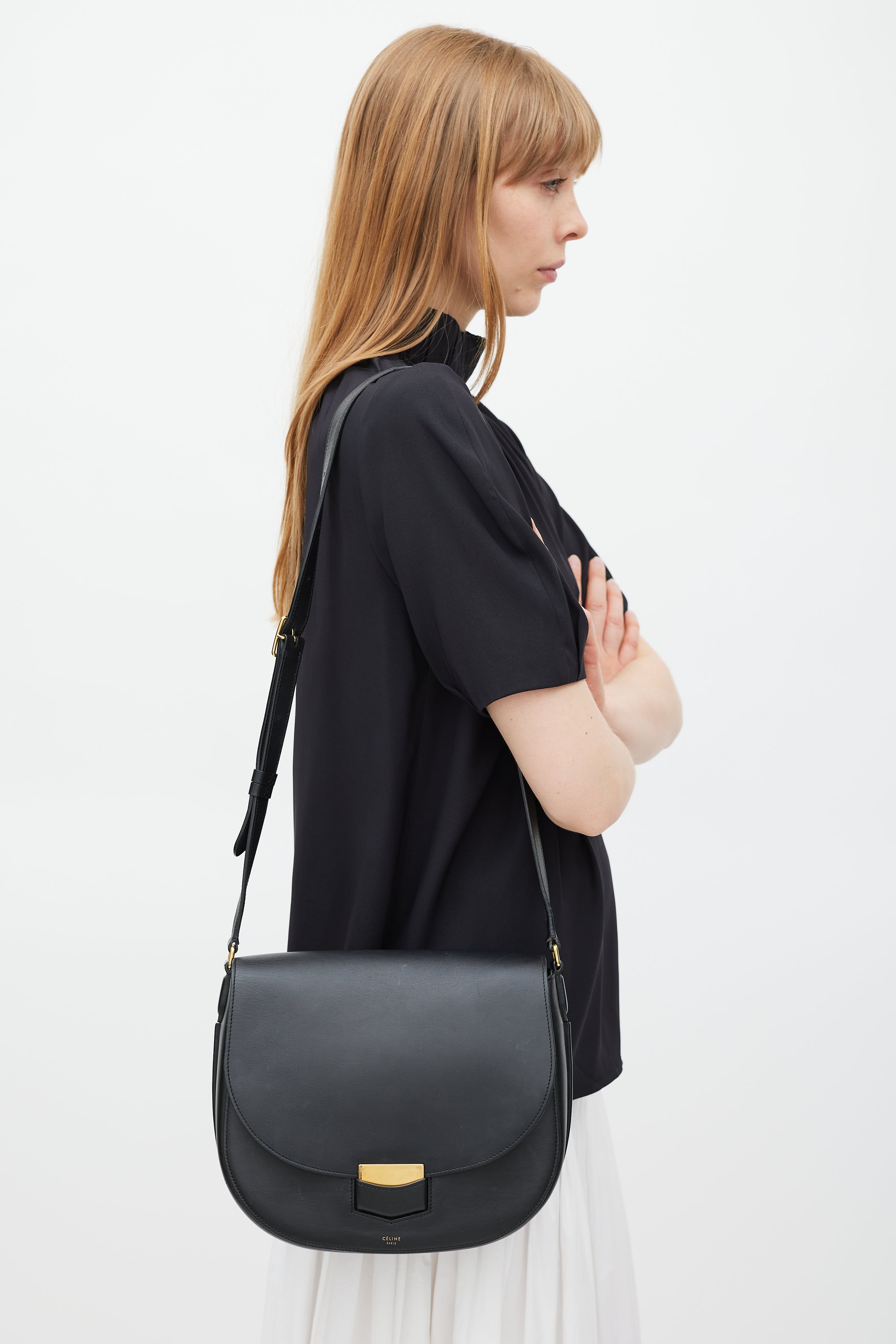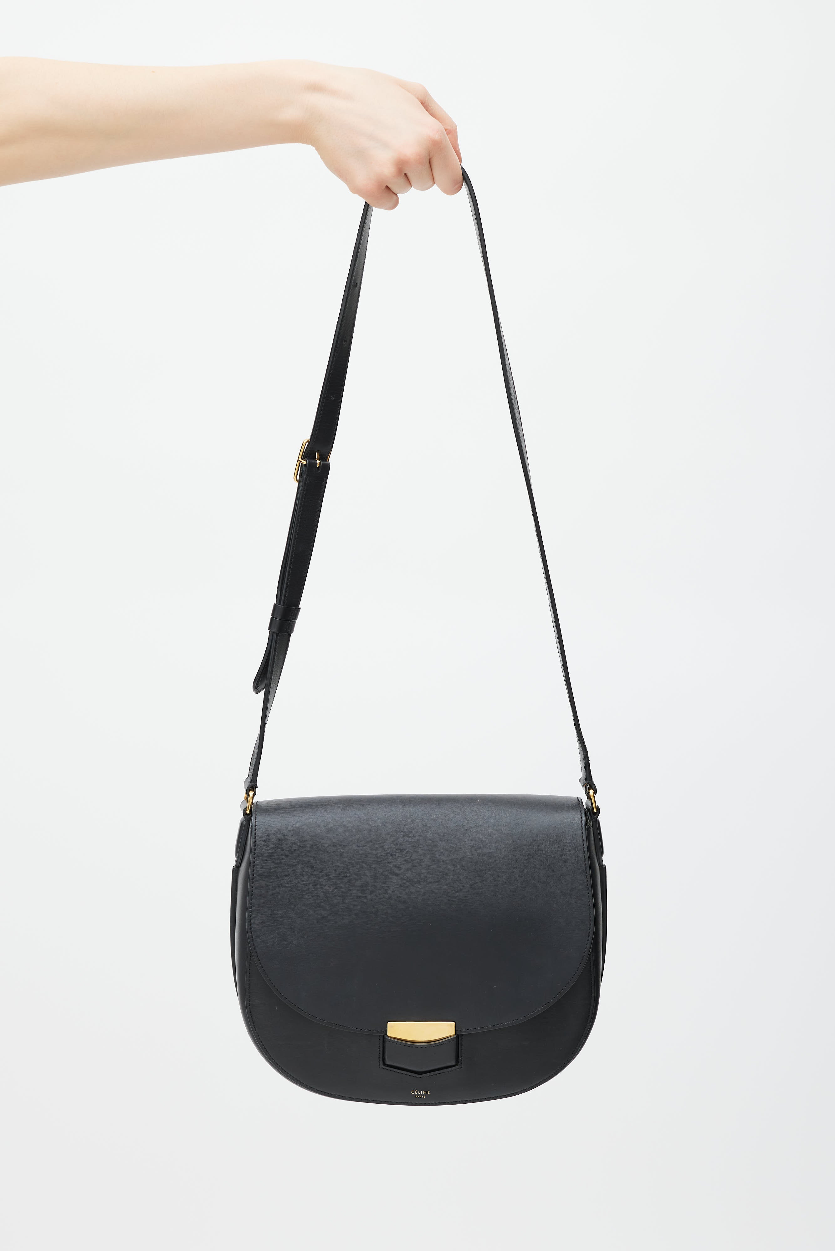 Pre-owned Celine black Trotteur leather bag featuring a top flap, embossed logo at front, two main compartments with two slip pockets, one interior slip pouch, one zip pocket at back, adjustable shoulder strap, and gold tone slip closure. Comes with original dust bag.