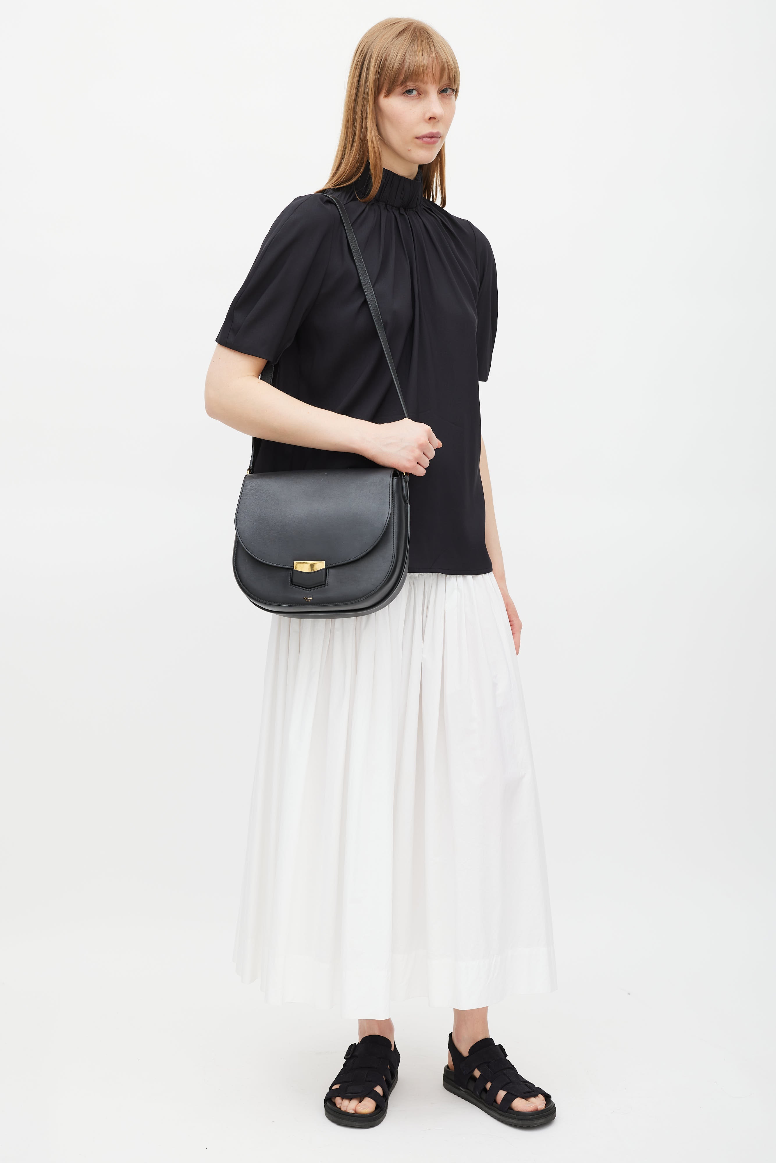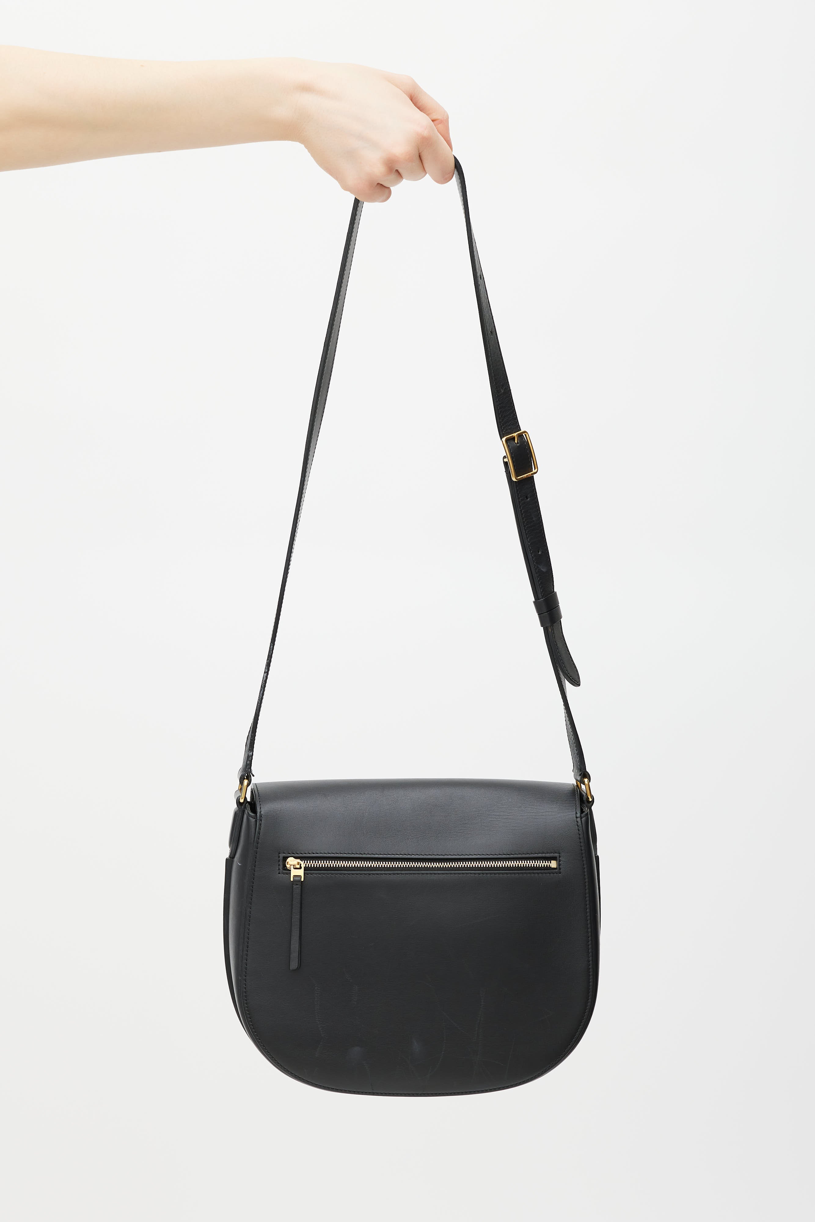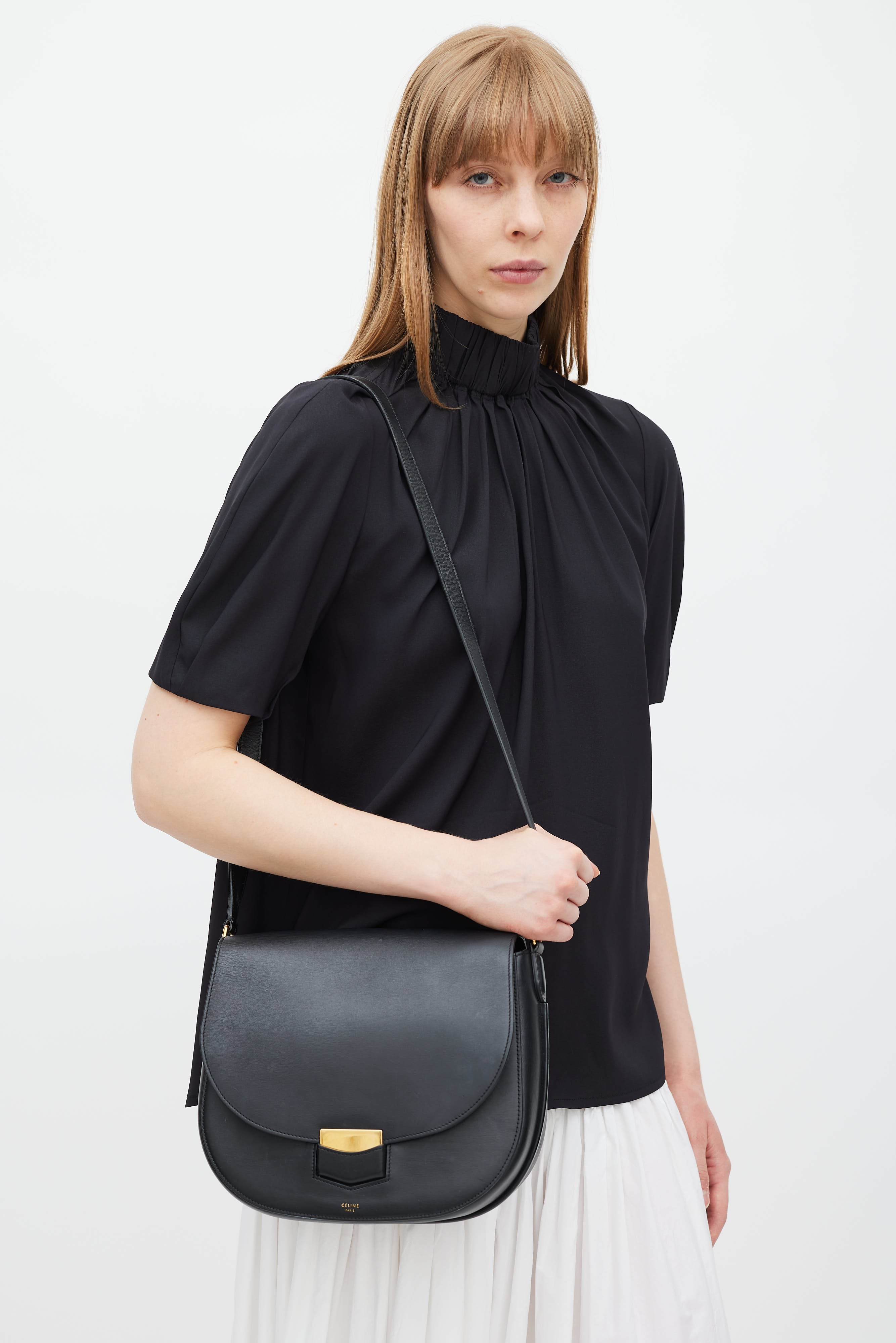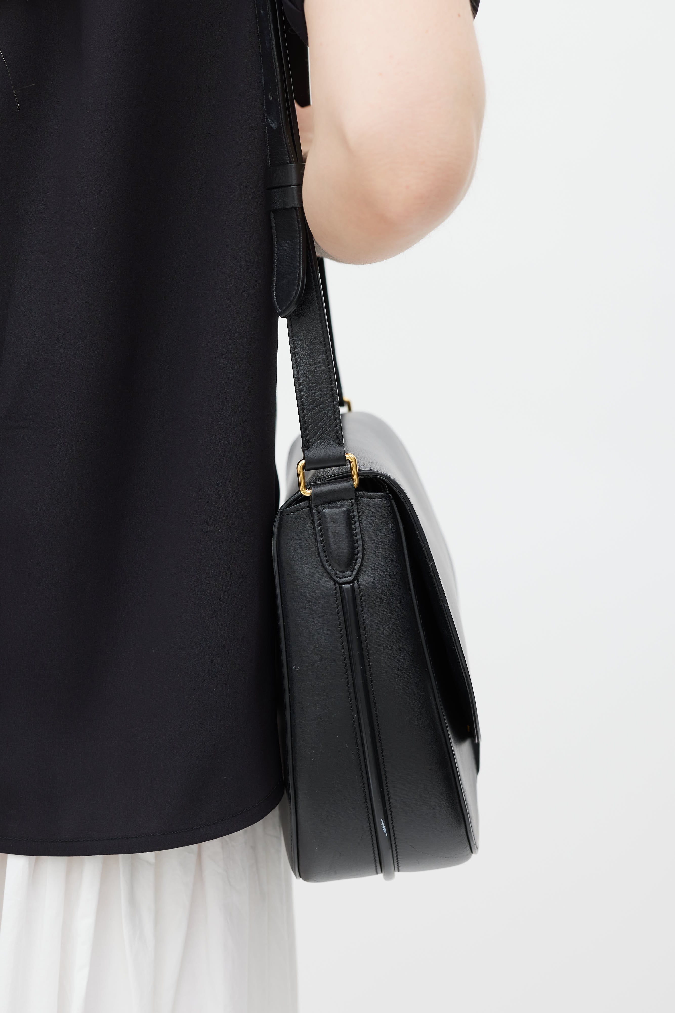 Pre-owned Celine black Trotteur leather bag featuring a top flap, embossed logo at front, two main compartments with two slip pockets, one interior slip pouch, one zip pocket at back, adjustable shoulder strap, and gold tone slip closure. Comes with original dust bag.