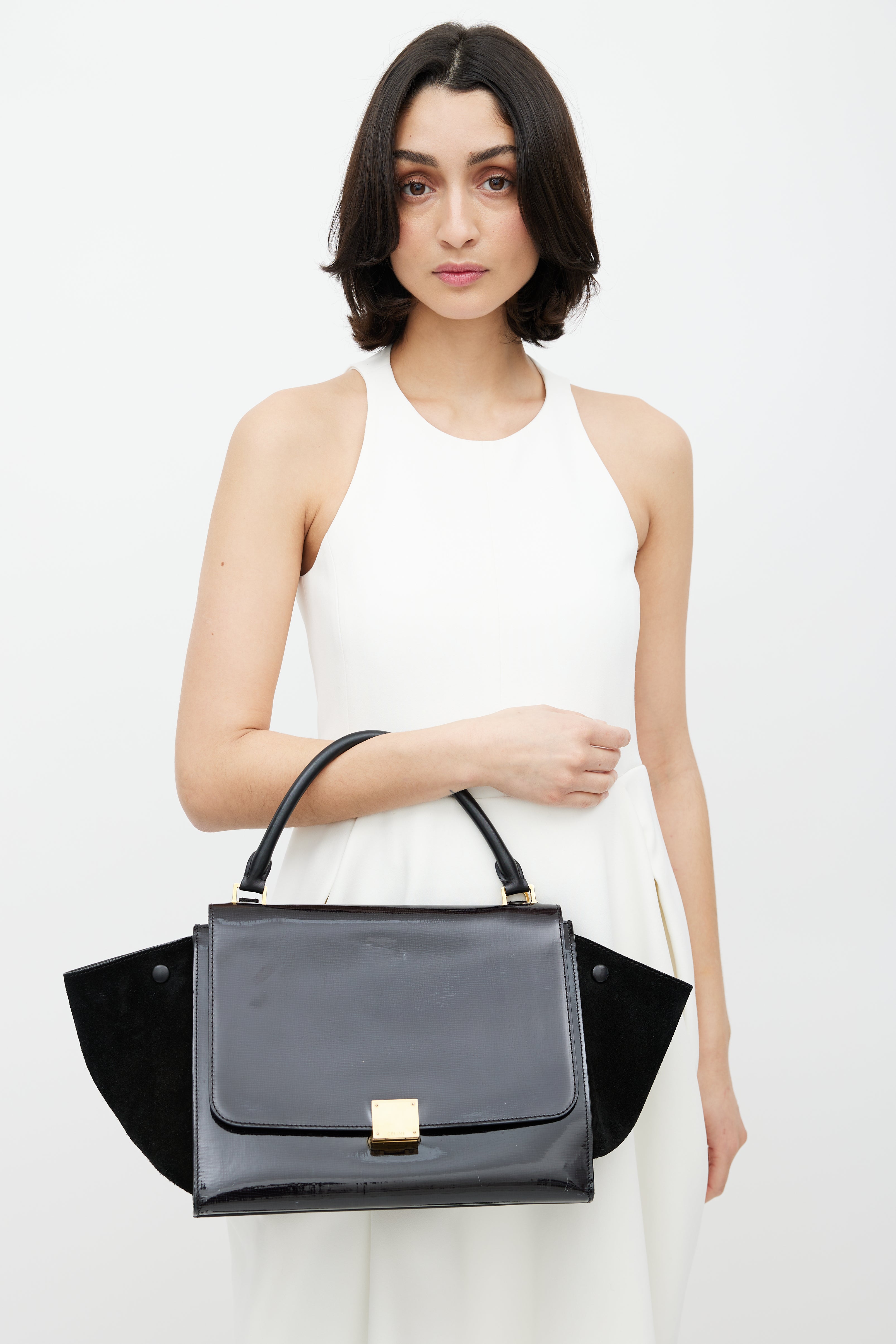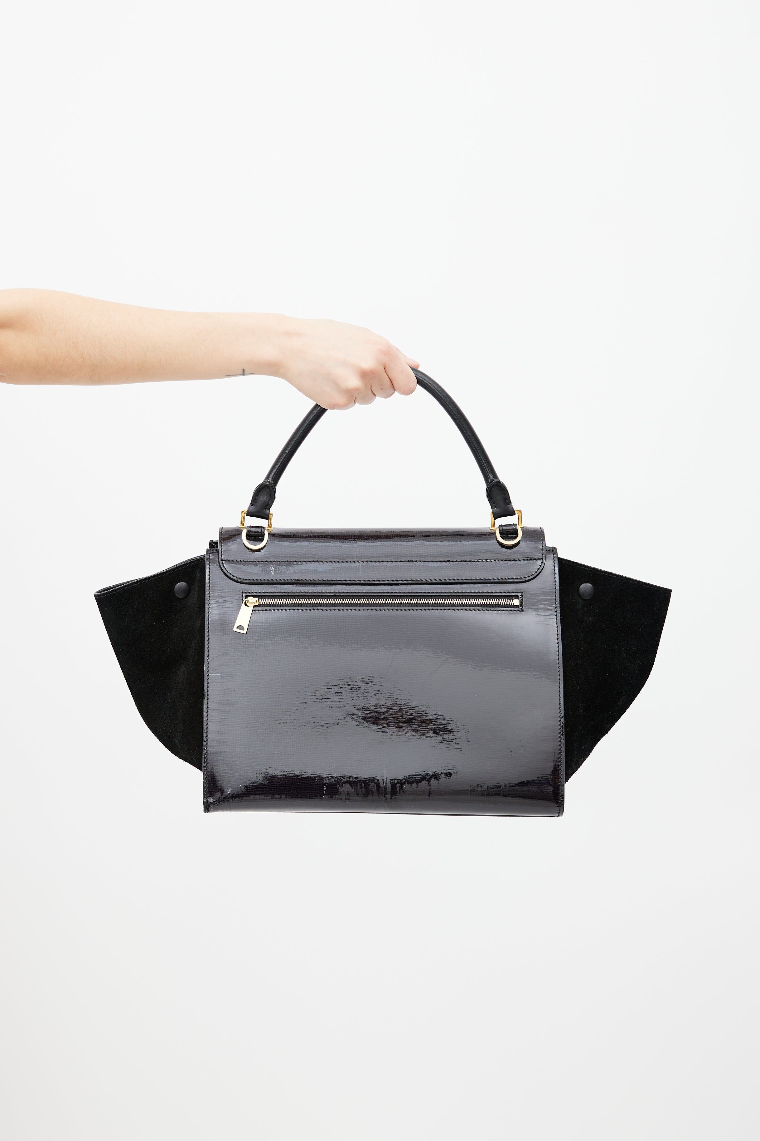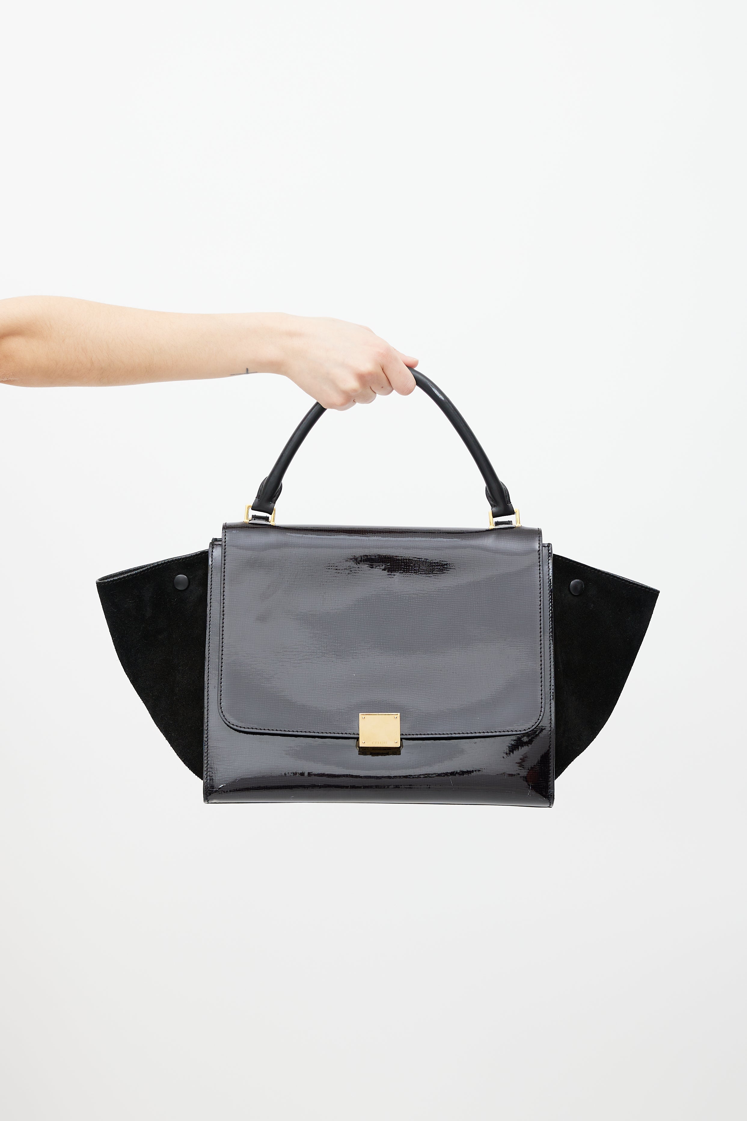 Pre-owned Celine black large Trapeze bag featuring single rolled top handle, gold tone hardware, patent leather top flap and body, hinge closure, detachable shoulder strap, exterior zip pocket, zip closure under flap, suede sides with snap buttons fastening, and two interior slip pocket. Comes with original dust bag.