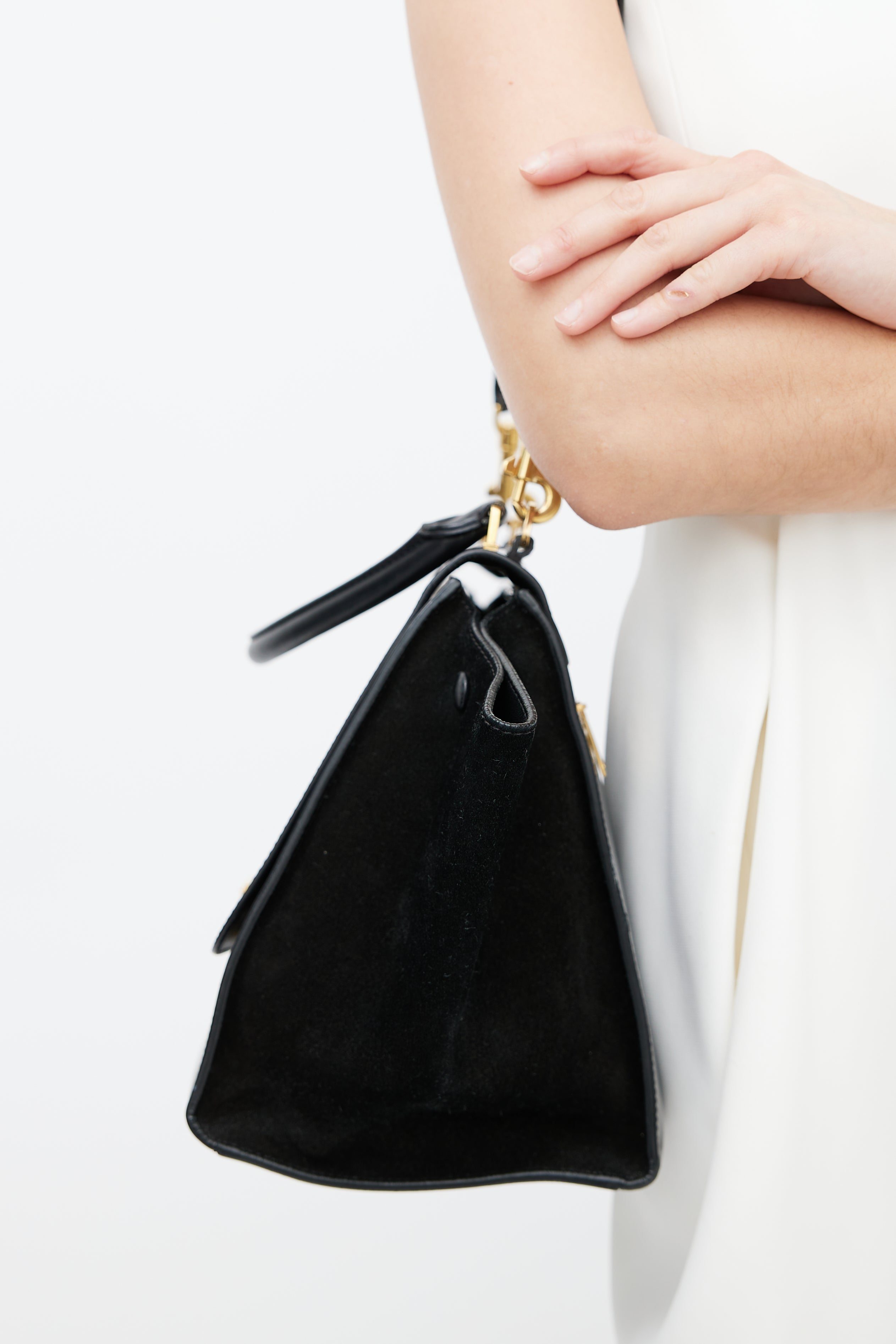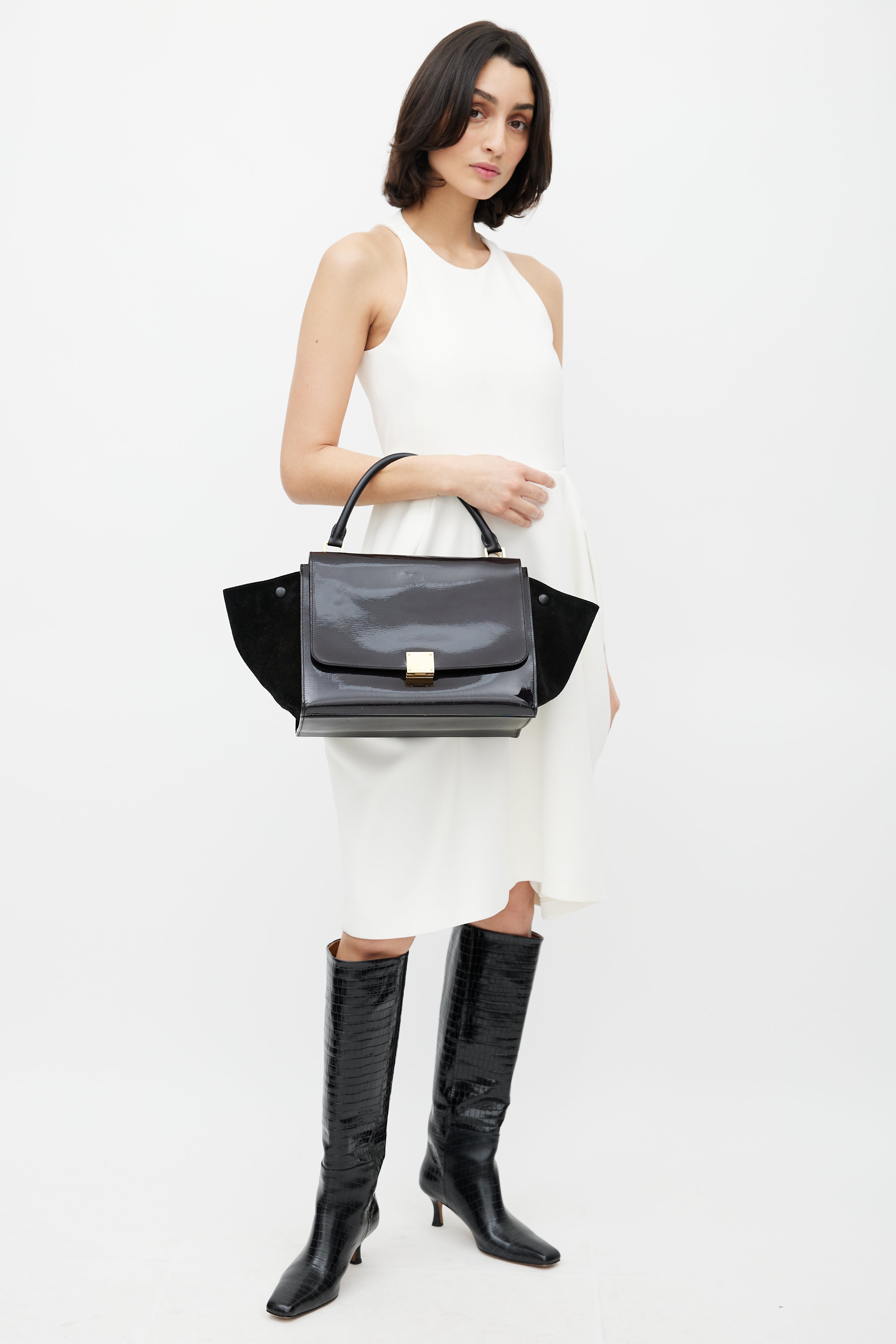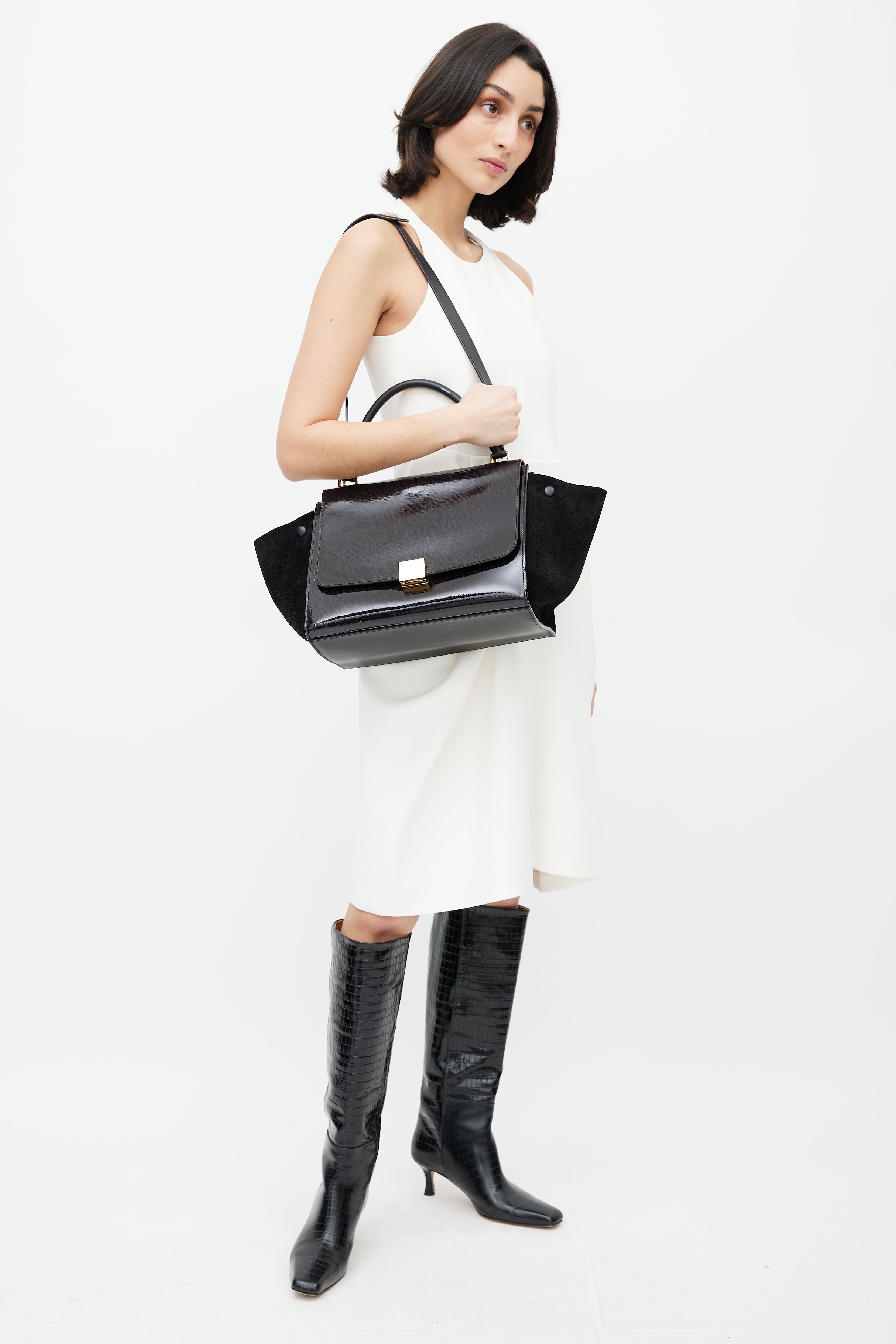 Pre-owned Celine black large Trapeze bag featuring single rolled top handle, gold tone hardware, patent leather top flap and body, hinge closure, detachable shoulder strap, exterior zip pocket, zip closure under flap, suede sides with snap buttons fastening, and two interior slip pocket. Comes with original dust bag.