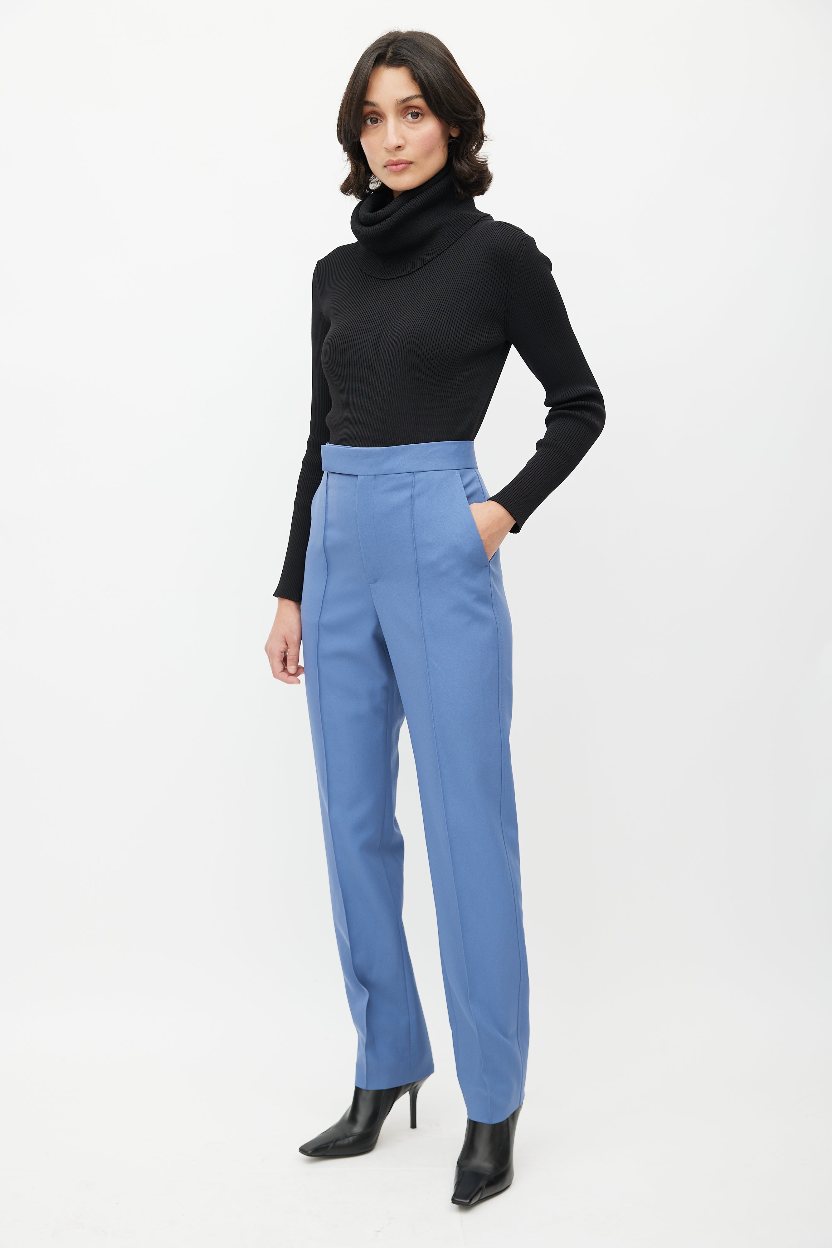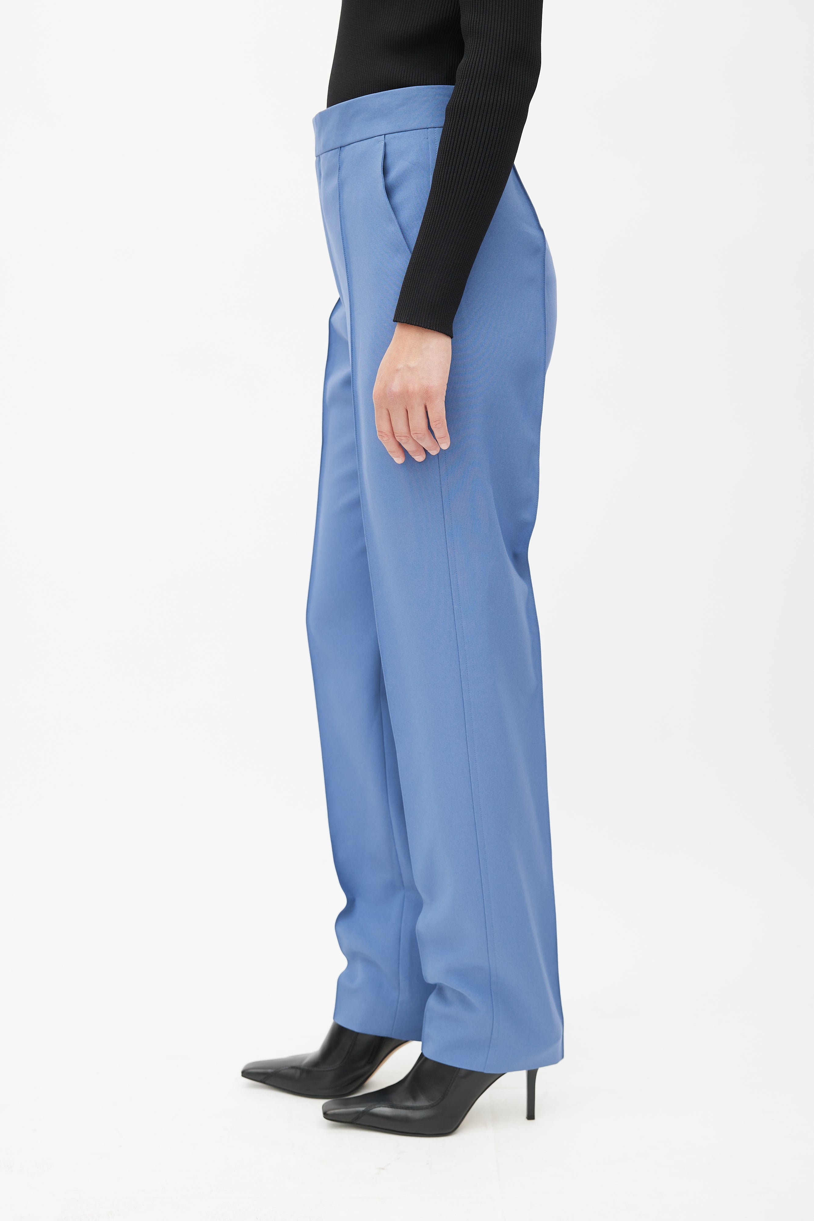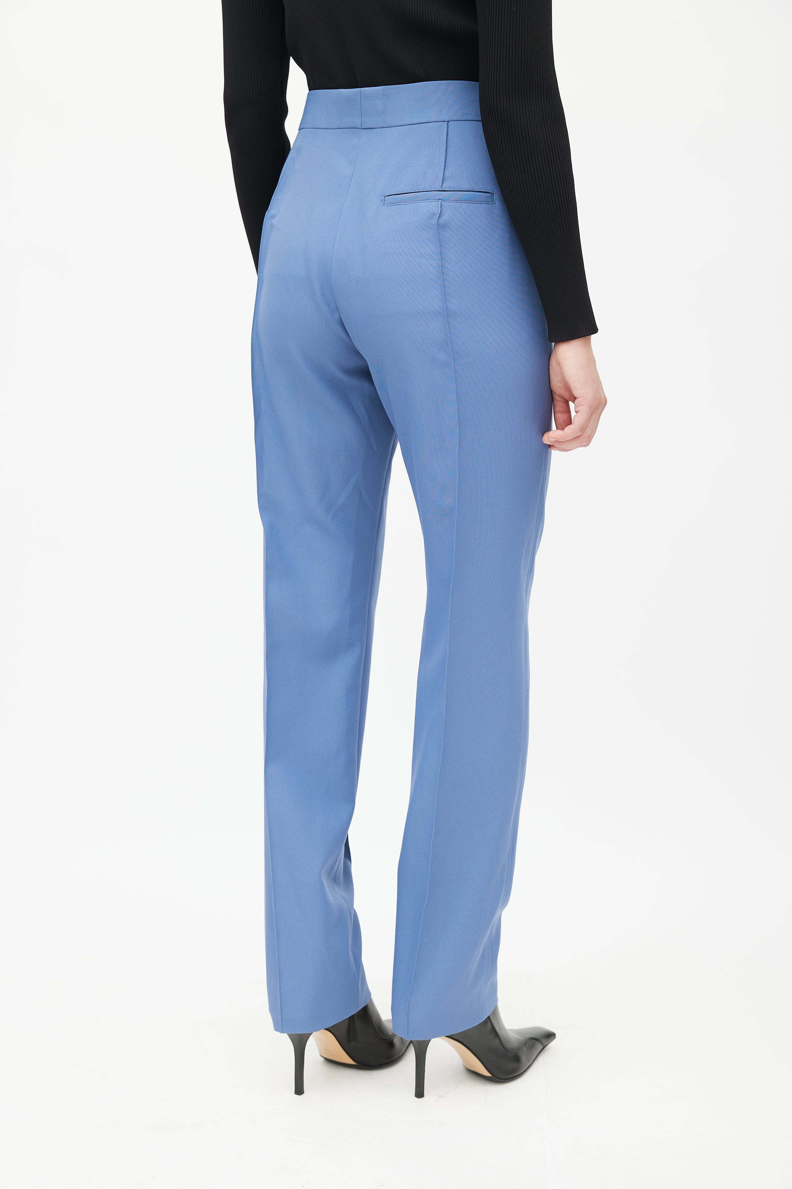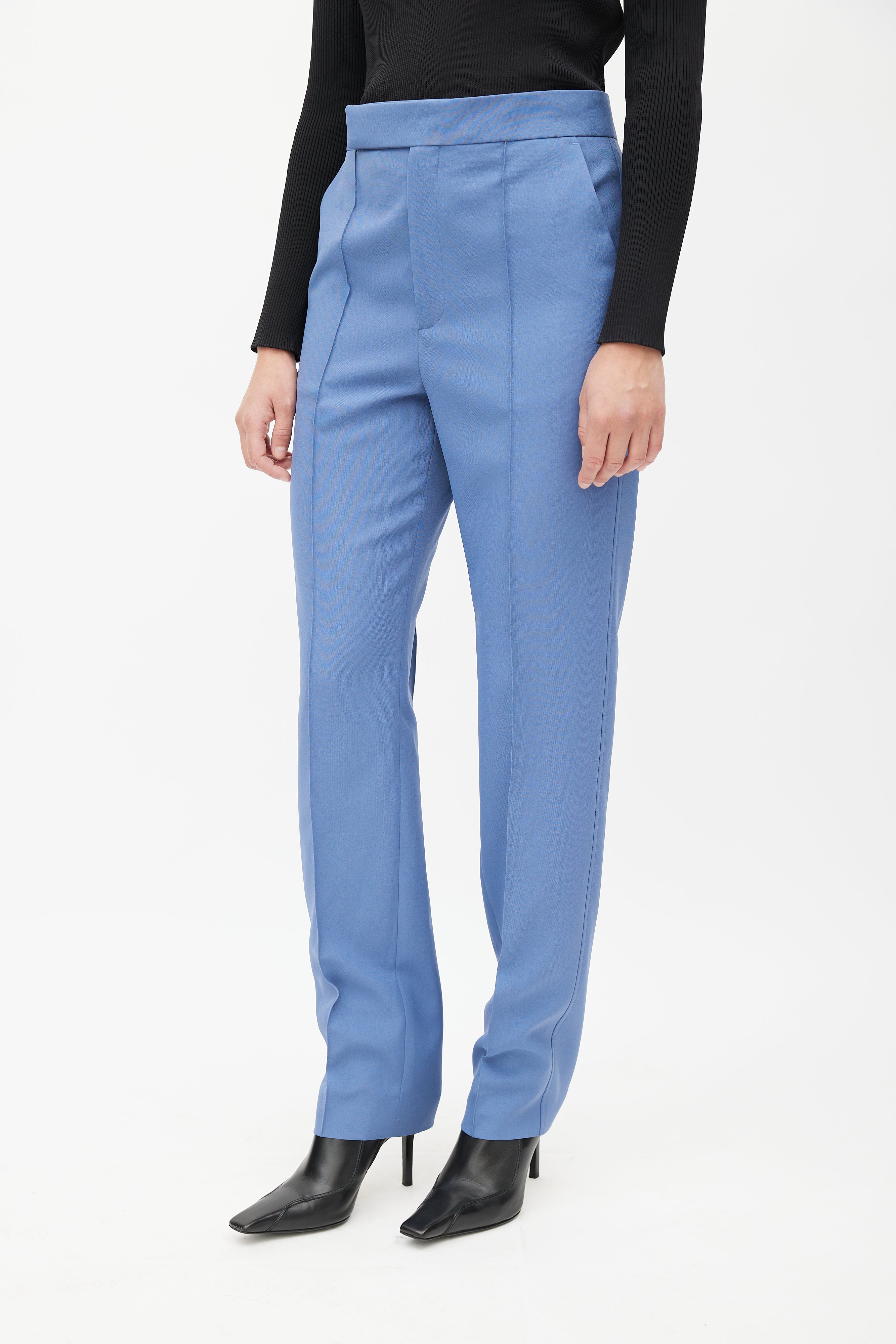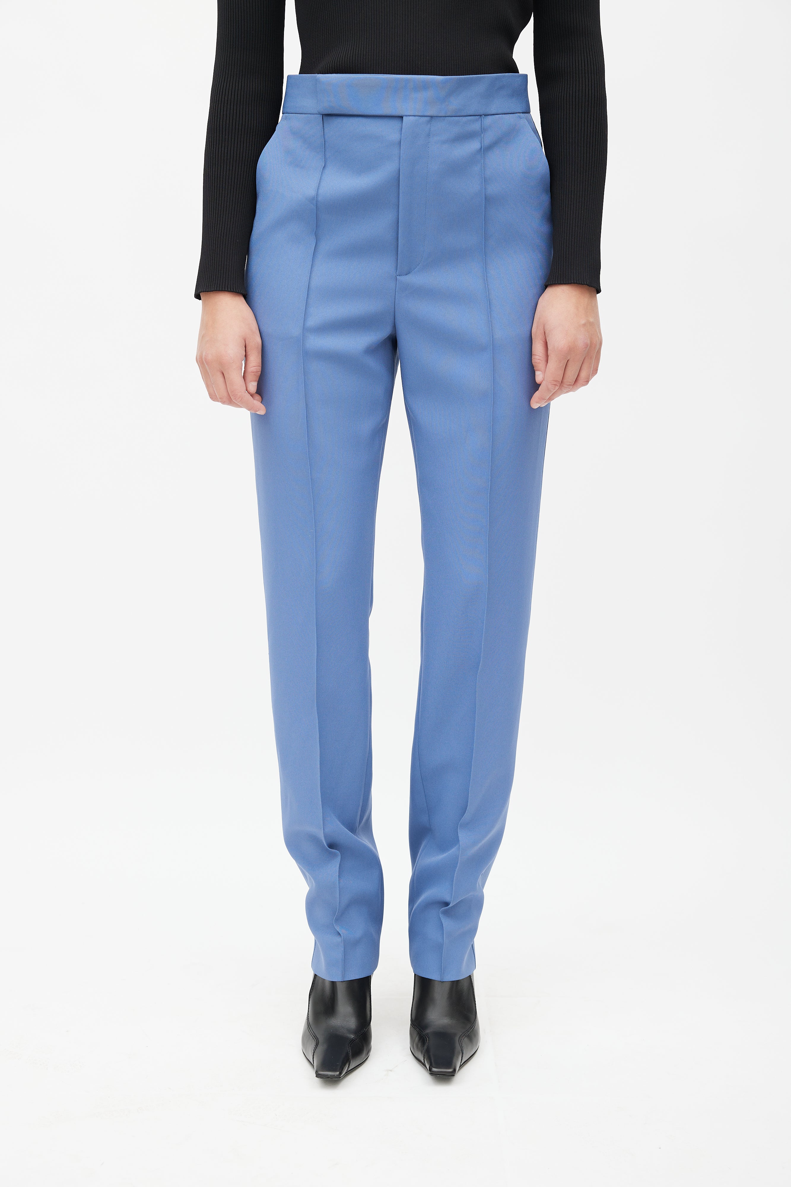 Pre-owned Celine blue trousers featuring zip fly, pressed centre seams, two slash pockets at hips, and one welt pocket at back. Phoebe Philo era design. Clipped to fit model.