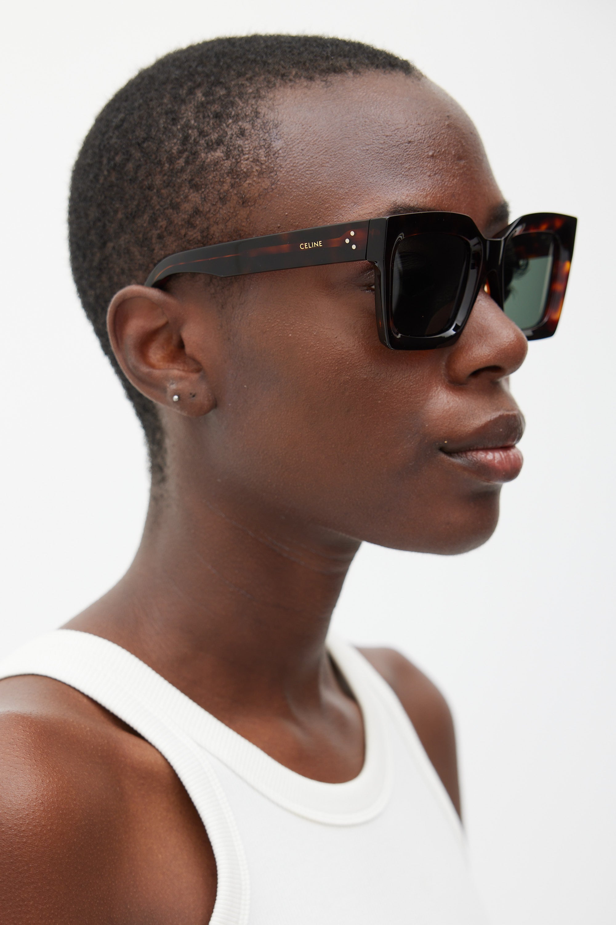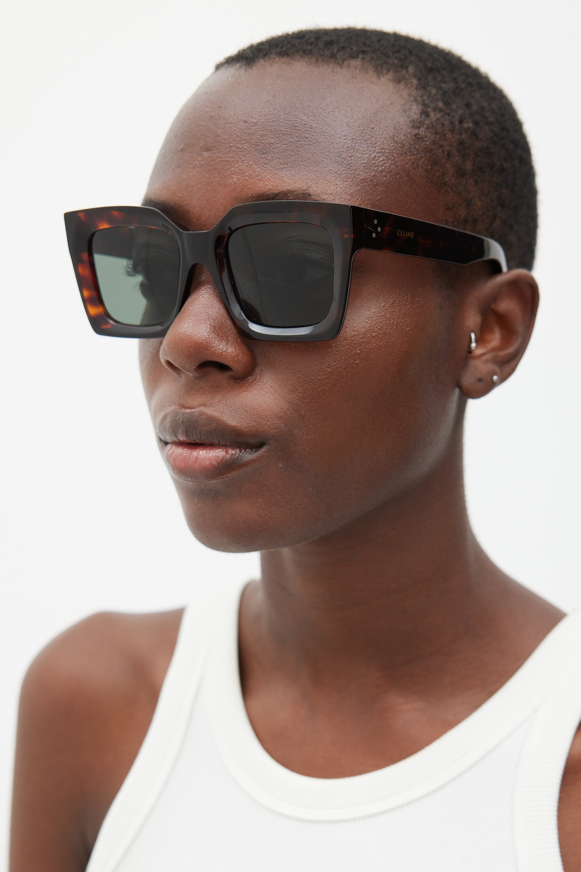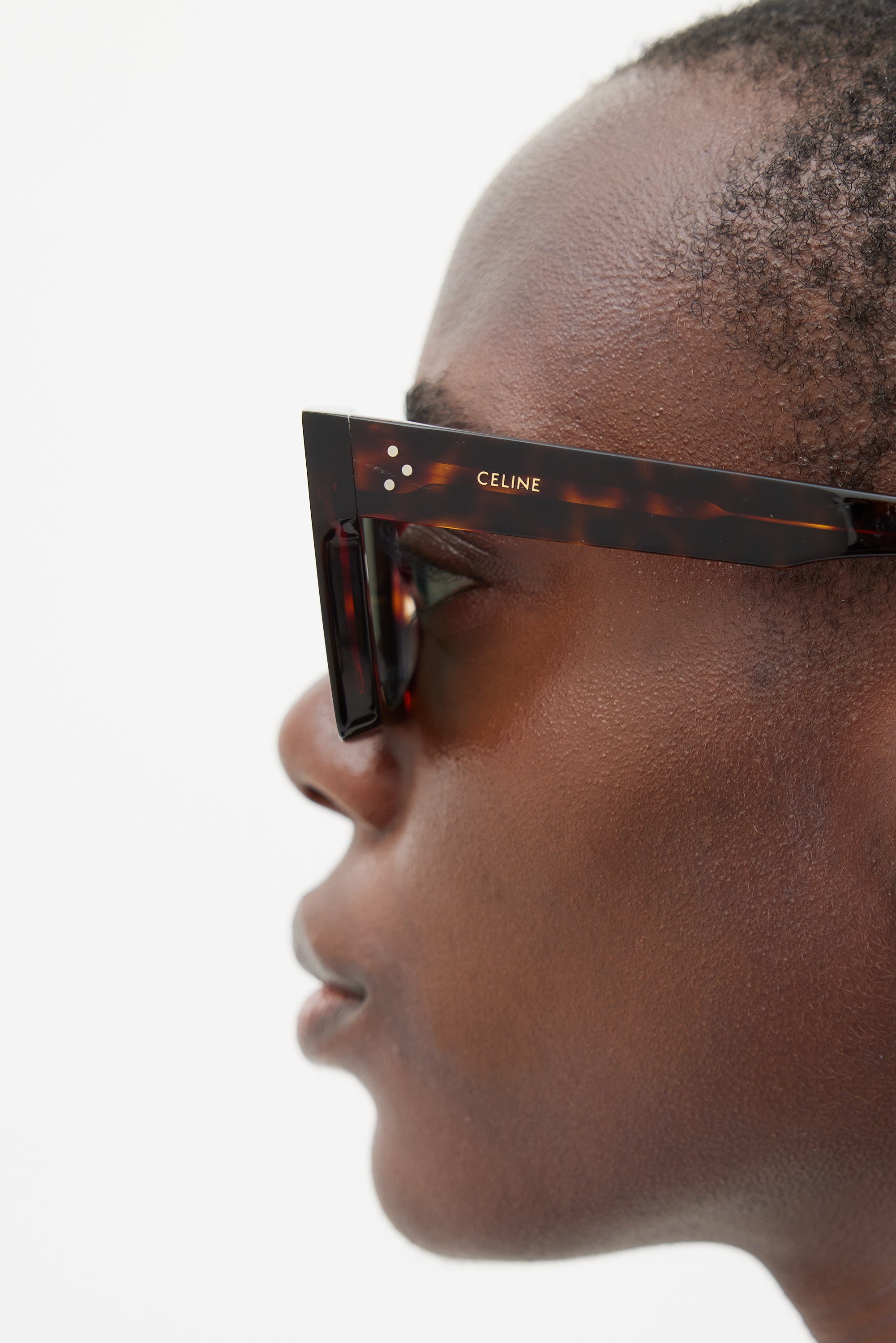 Pre-owned Celine brown CL40130I sunglasses featuring a rectangular tortoise shell frame, tinted lenses, nose pads, and logo hardware at temples. Comes with original case.