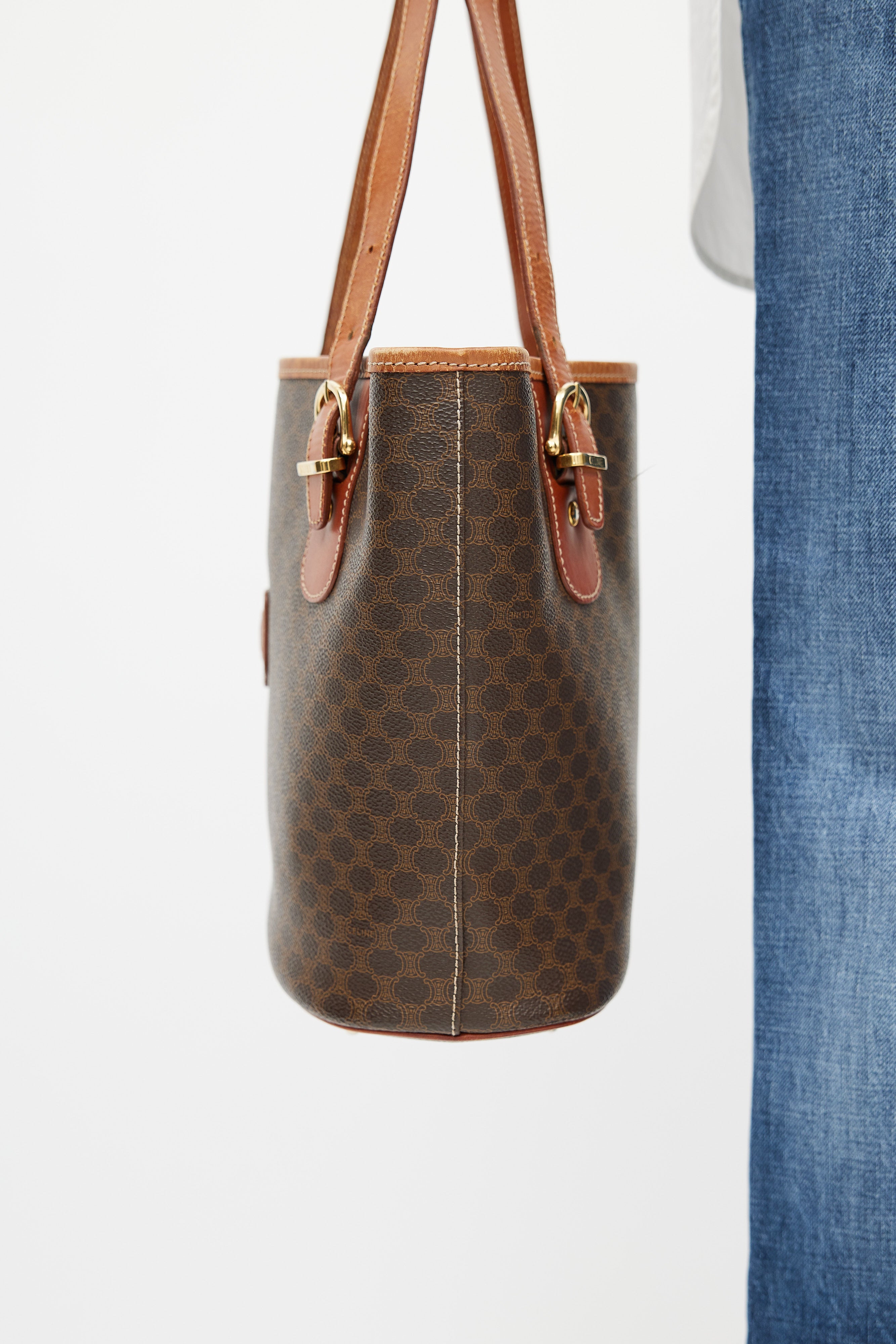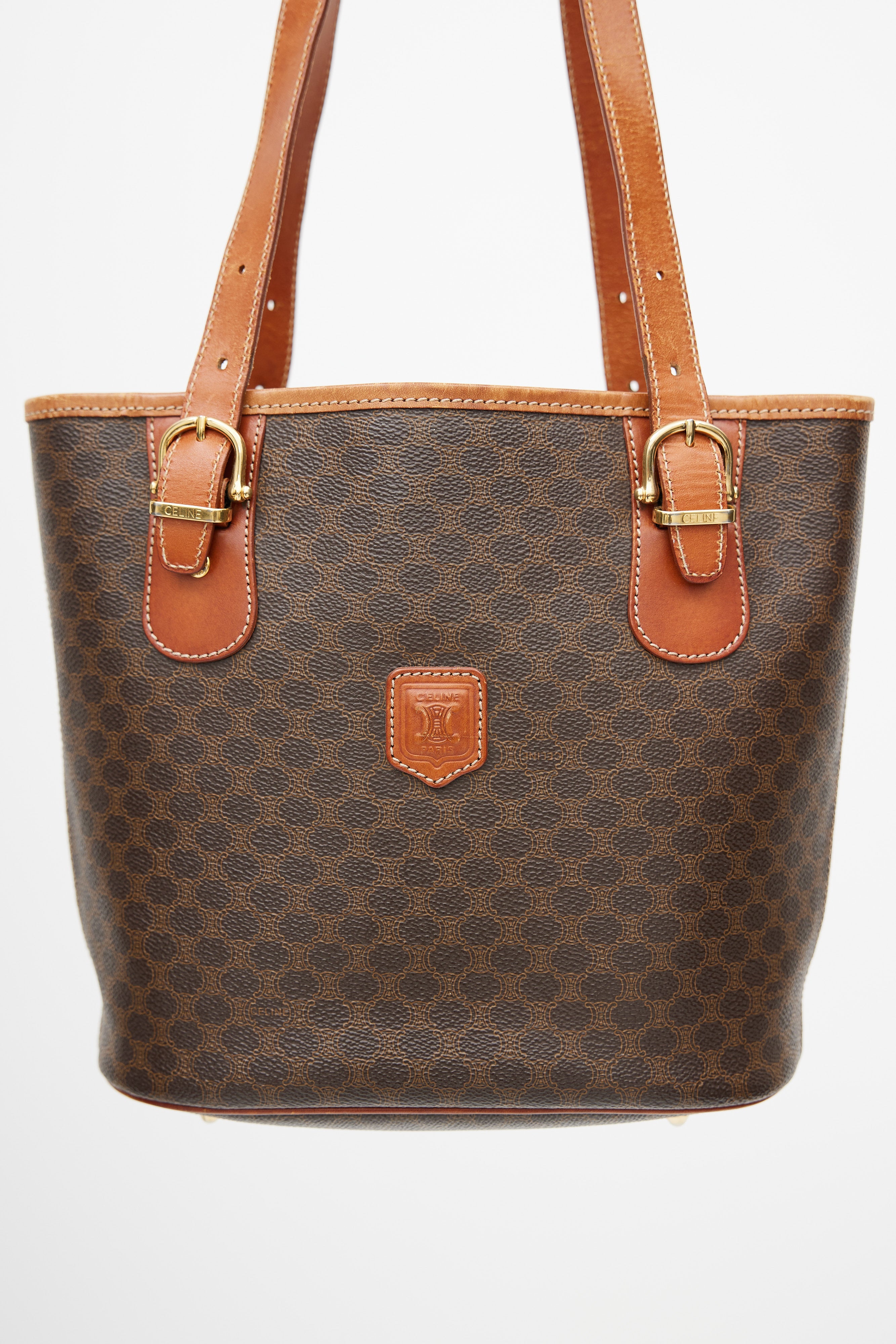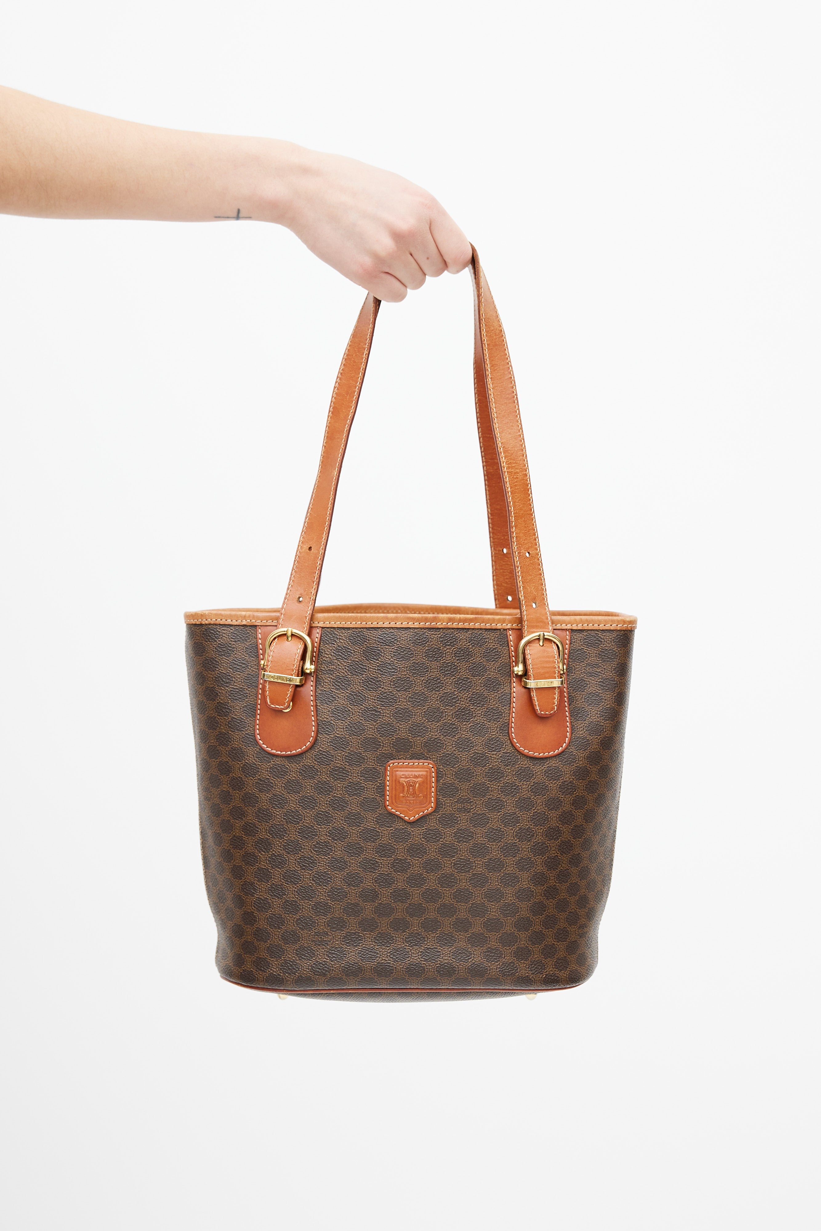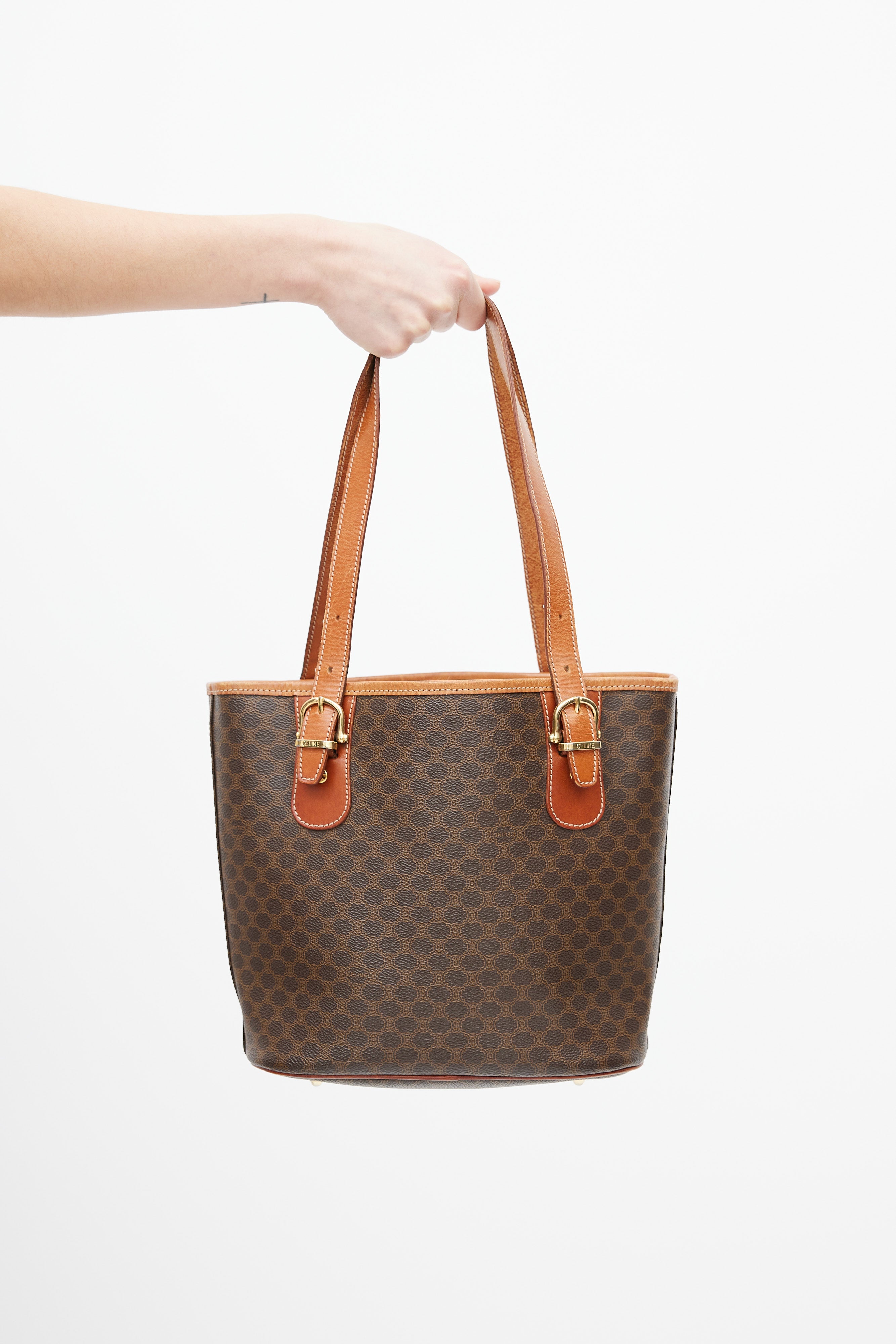 Pre-owned Celine brown leather monogram Macadam tote bag featuring monogram print, gold tone hardware, brown engraved logo patch at front, open interior compartment with zip pocket, adjustable shoulder straps, contrast stitching, and protective feet at base. Comes with original dust bag.