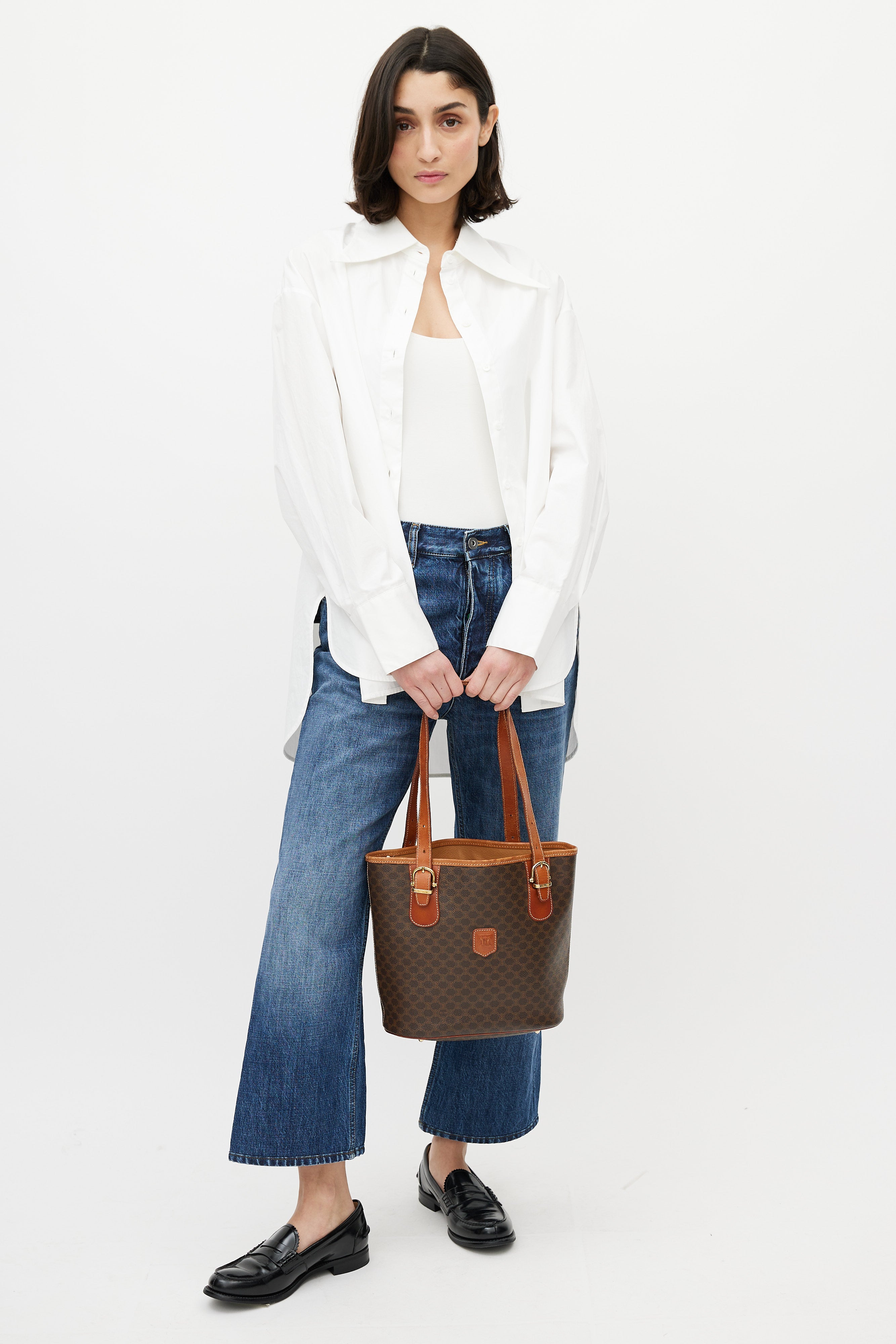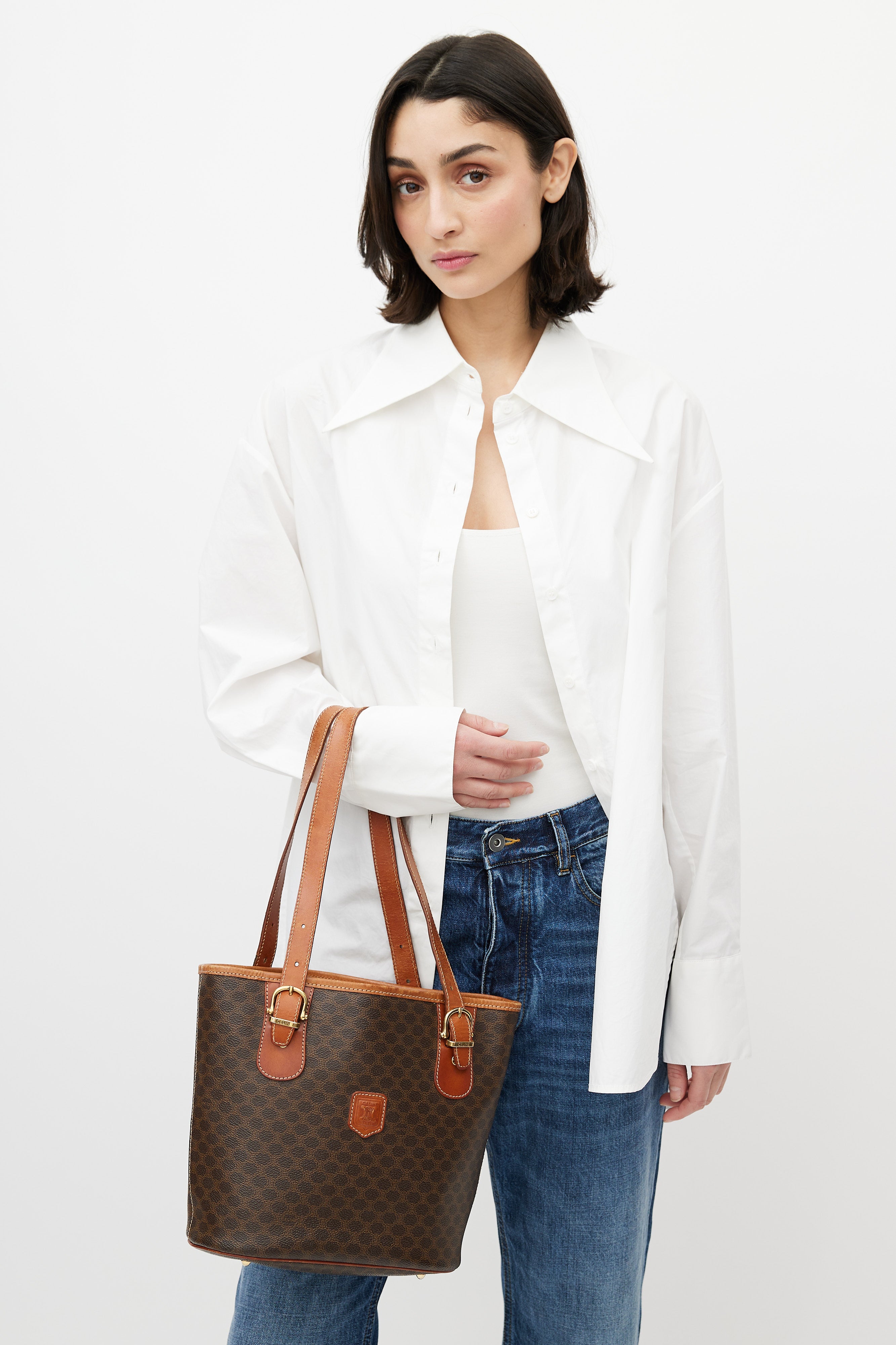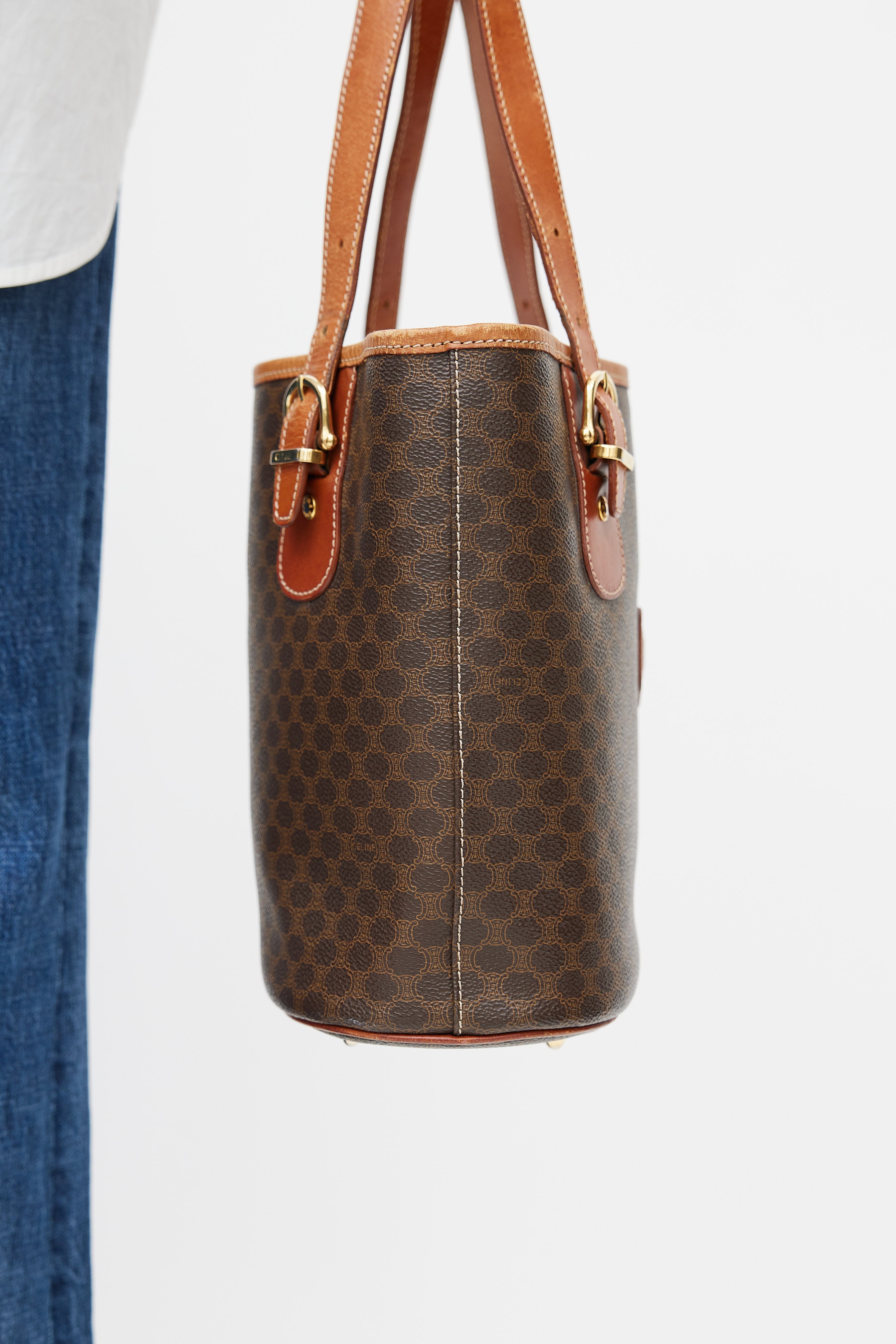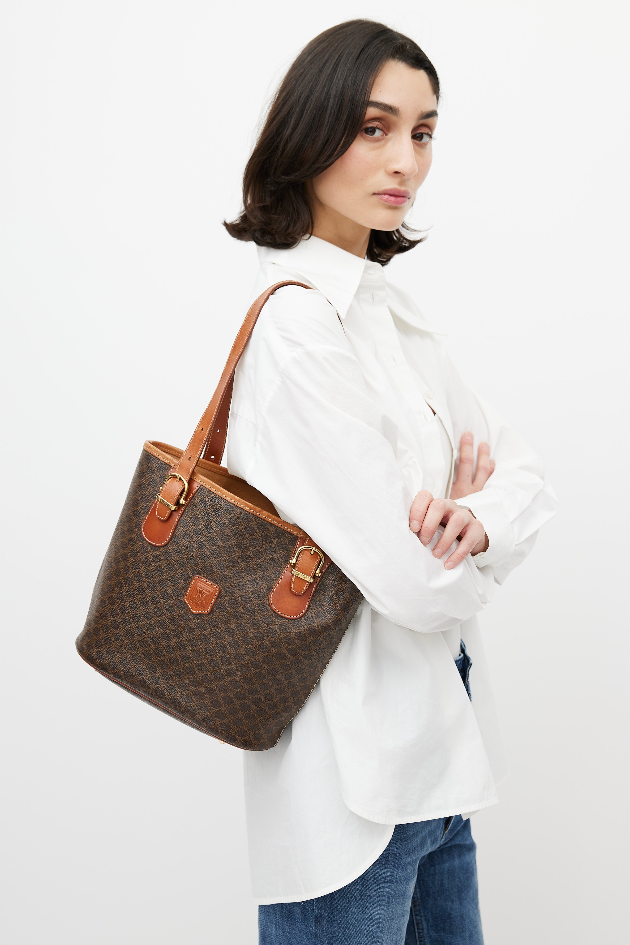 Pre-owned Celine brown leather monogram Macadam tote bag featuring monogram print, gold tone hardware, brown engraved logo patch at front, open interior compartment with zip pocket, adjustable shoulder straps, contrast stitching, and protective feet at base. Comes with original dust bag.