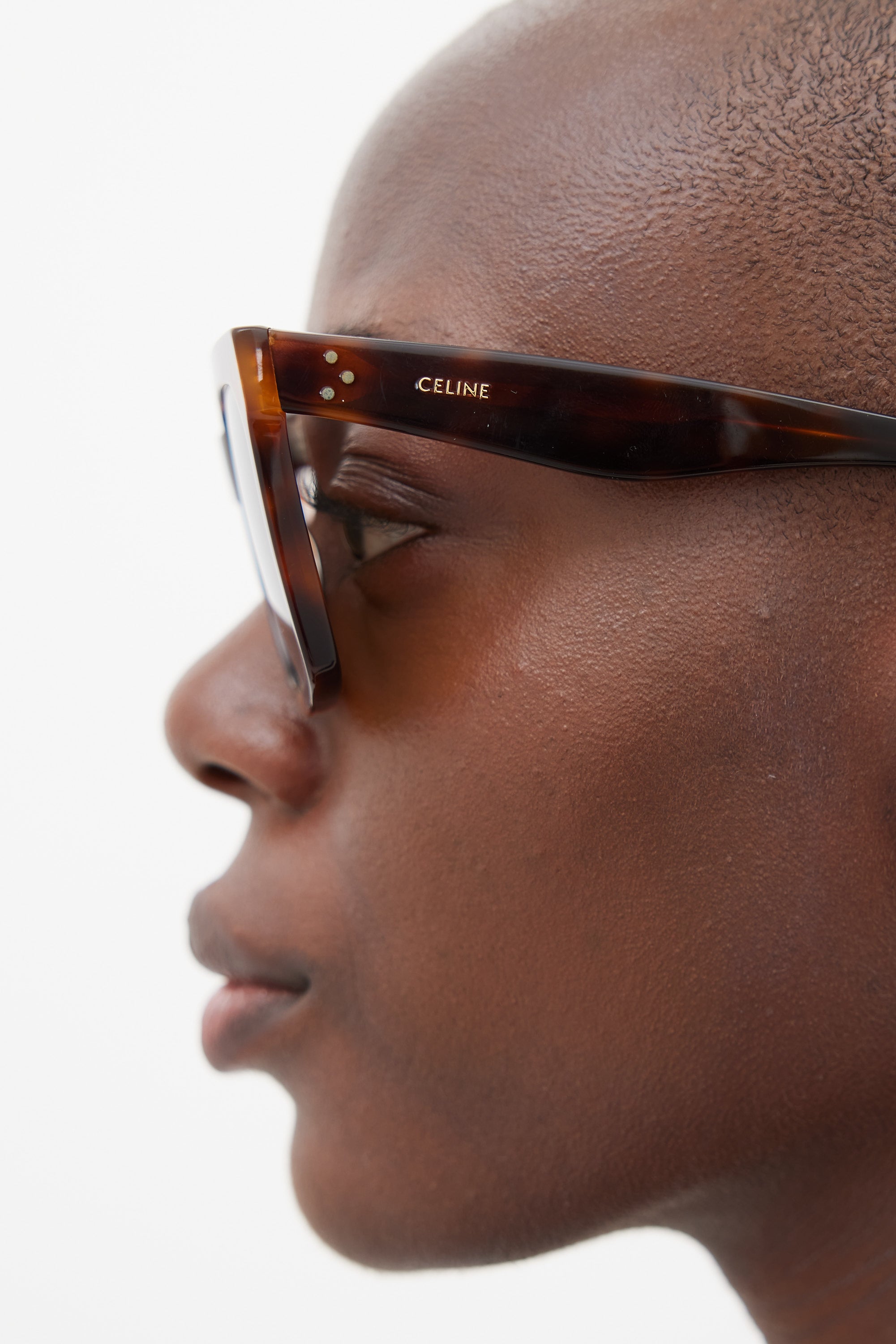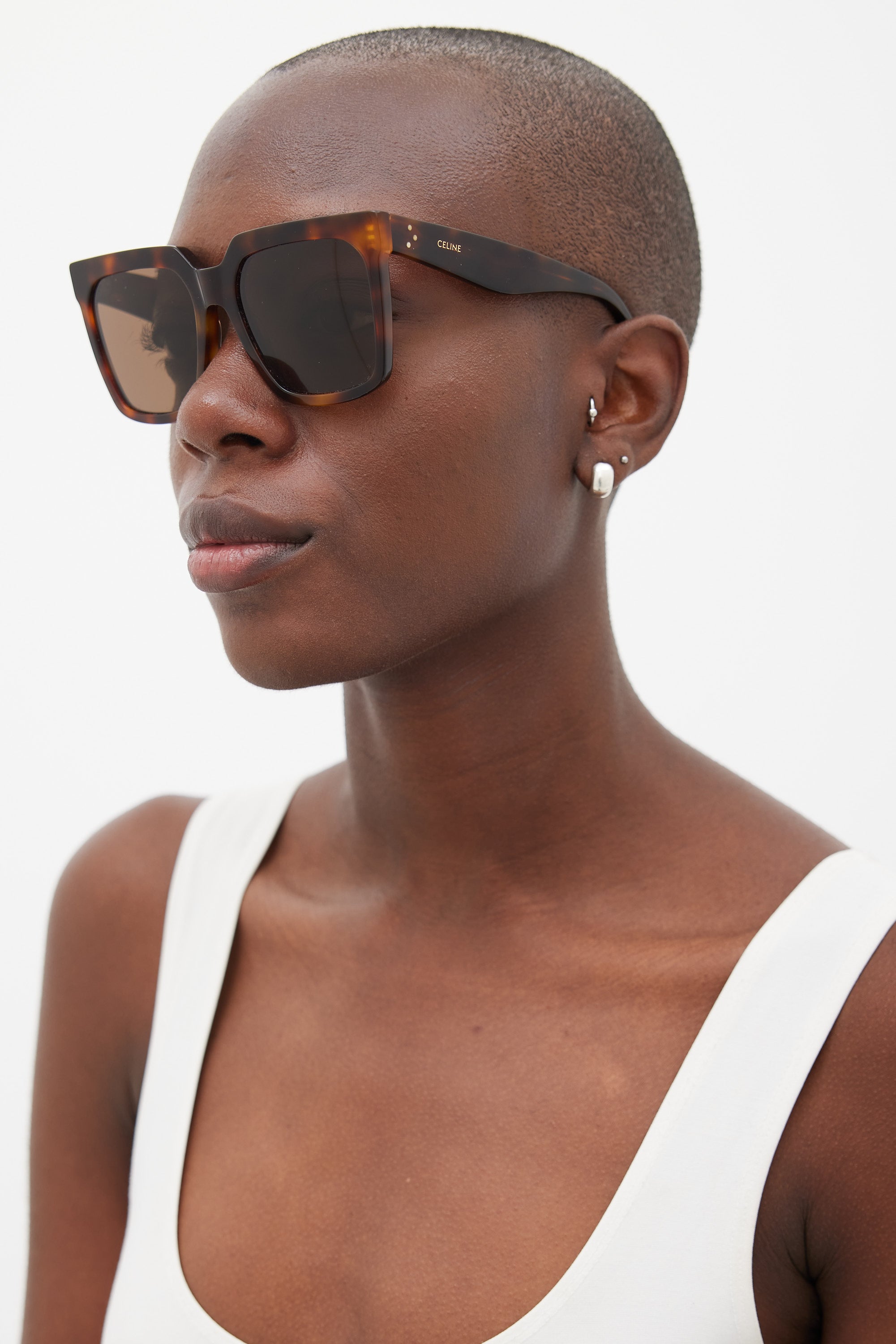 Pre-owned Celine CL4055IN sunglasses featuring a brown tortoiseshell square frame, brown lenses, and gold tone logo at temple. Comes with original box and case.