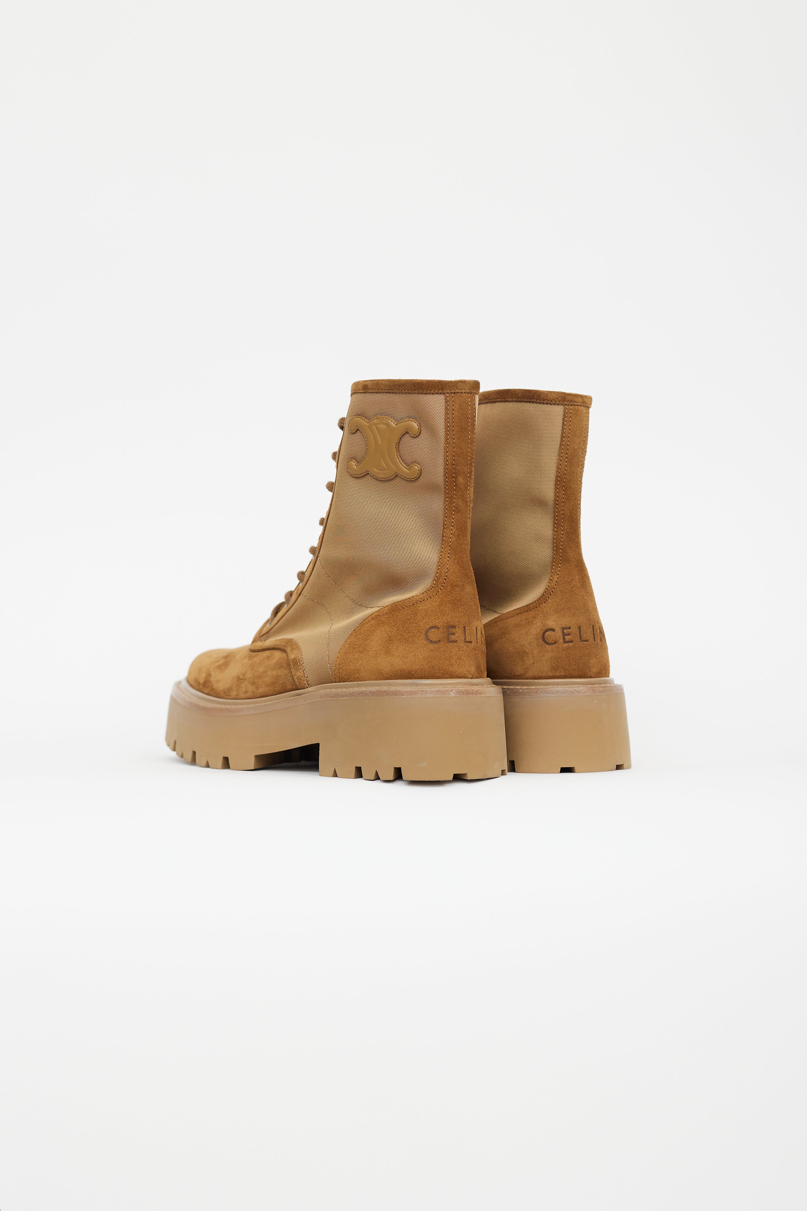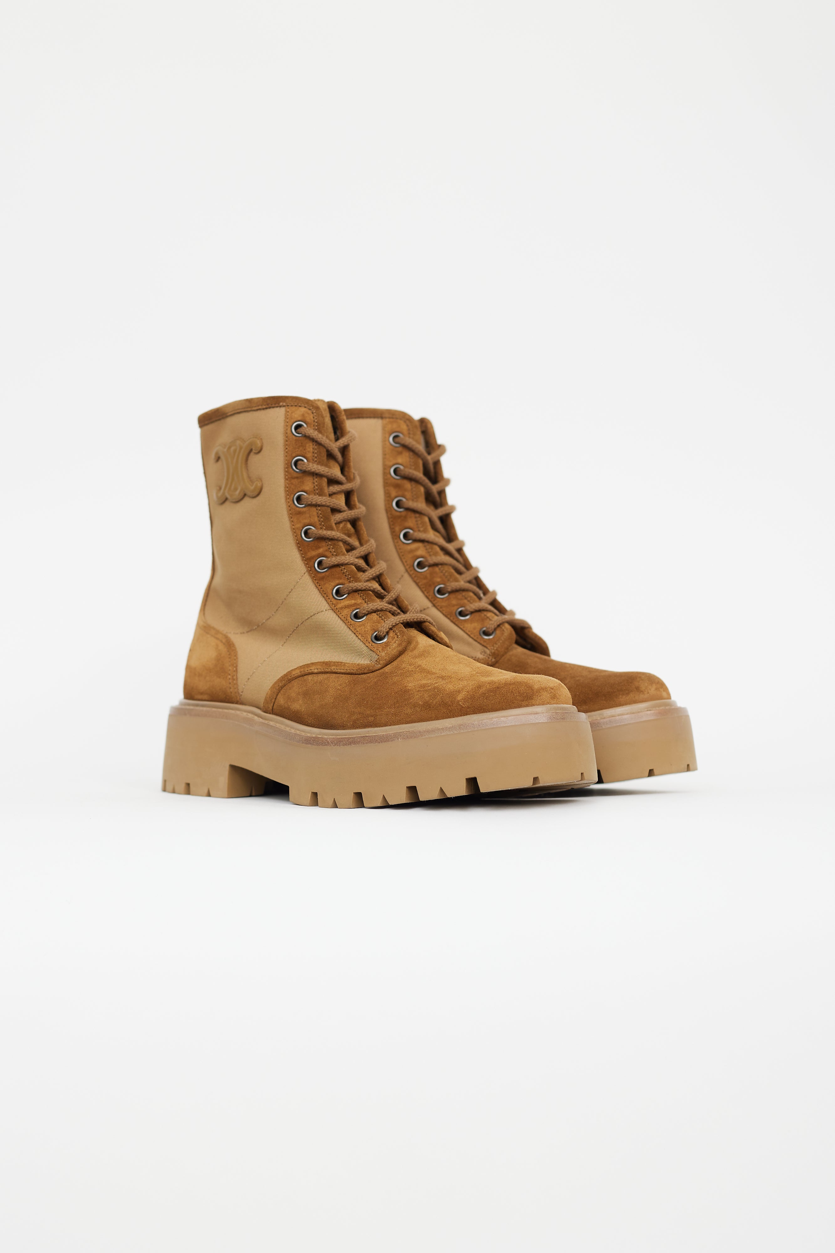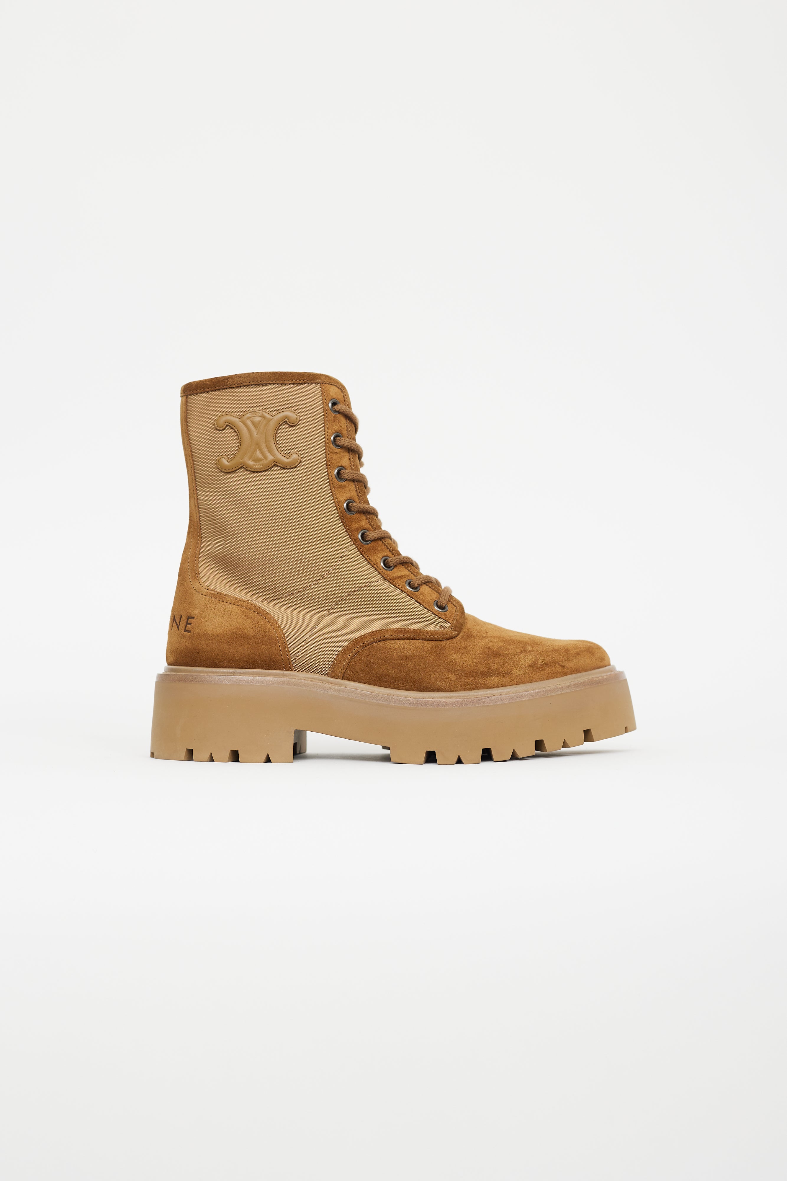 Pre-owned Celine Triomphe lace up boot featuring round toe, platform tread midsole, ankle high nylon mesh, leather logo patch at outer side, logo at counter, and leather insoles. Hedi Slimane era design.