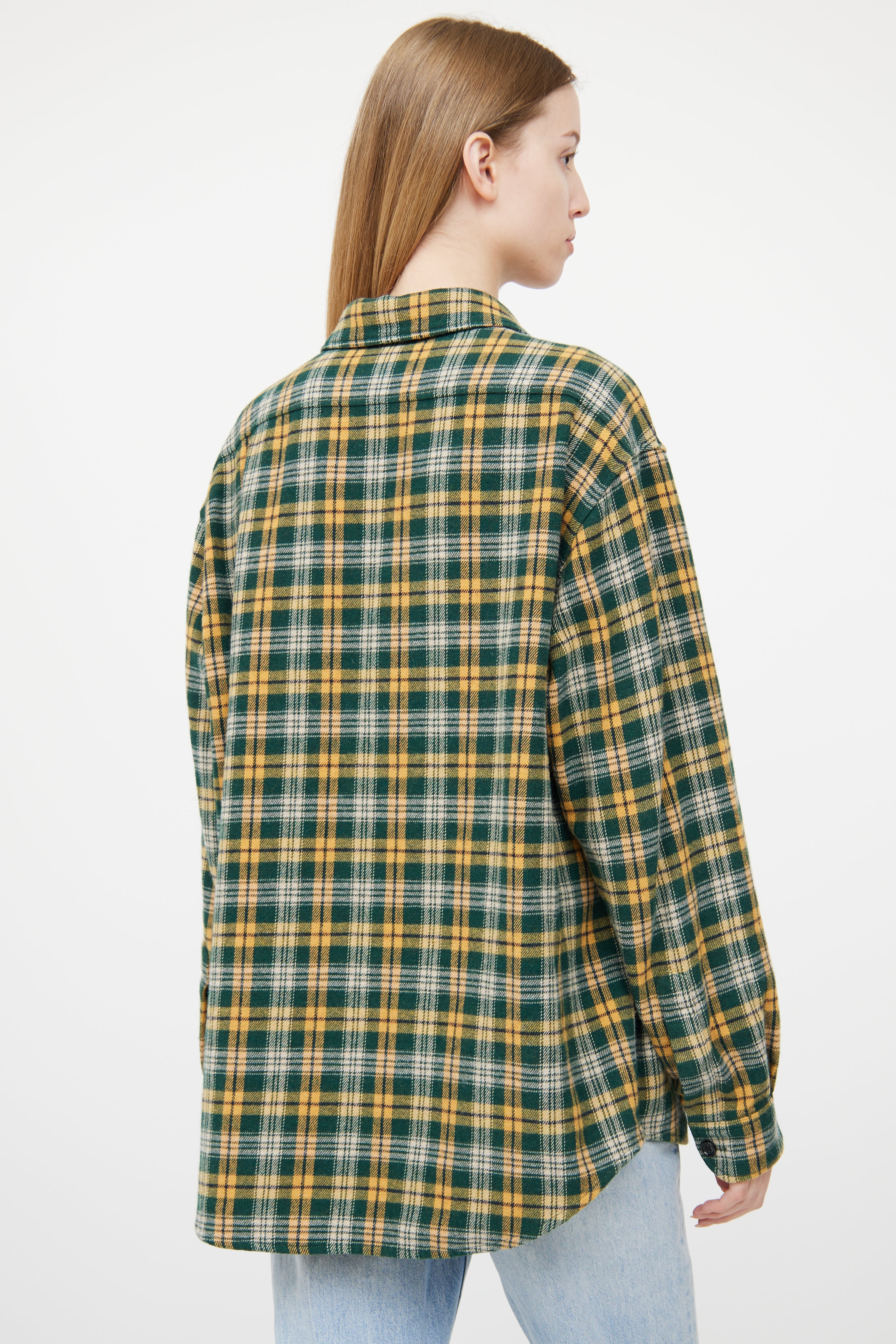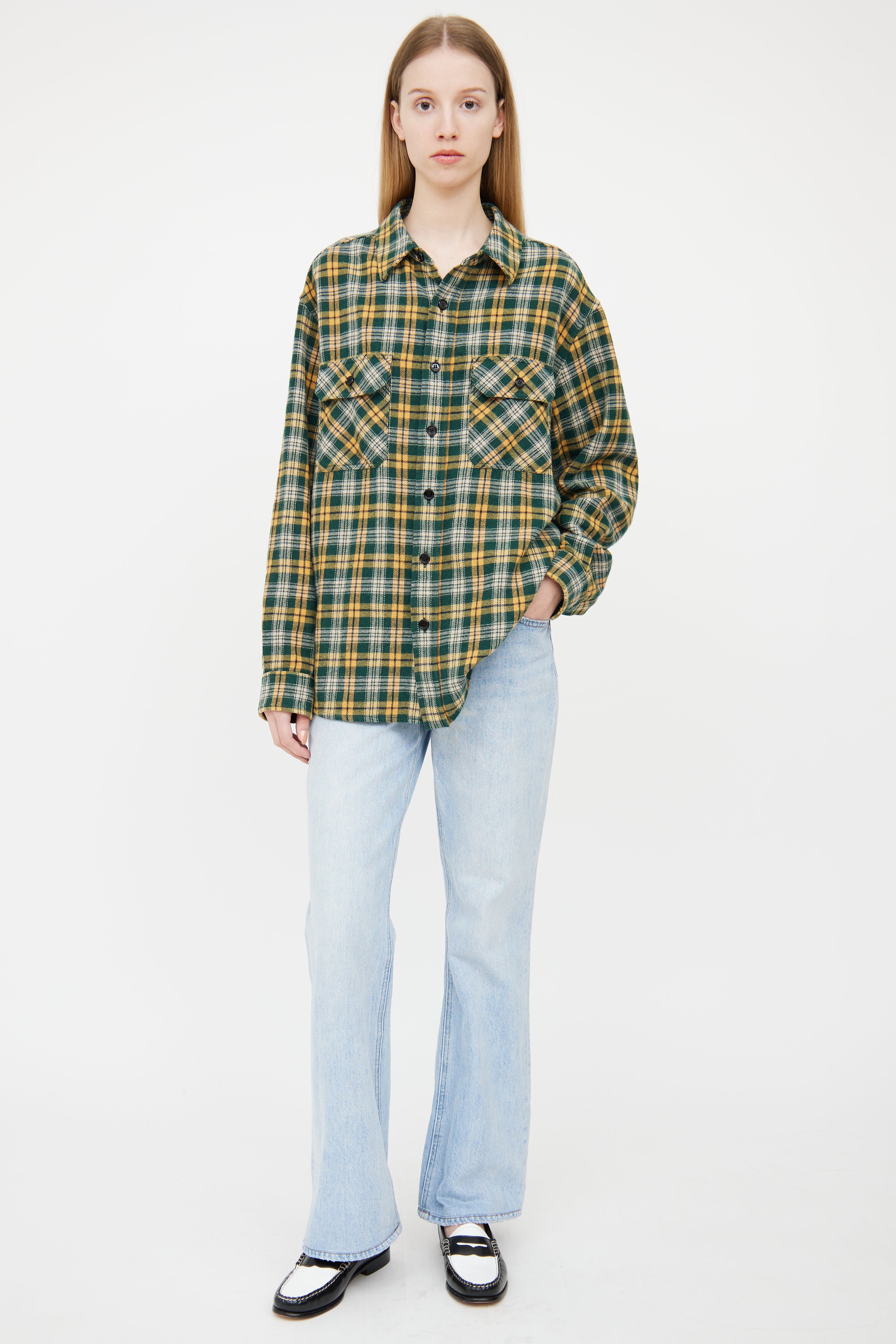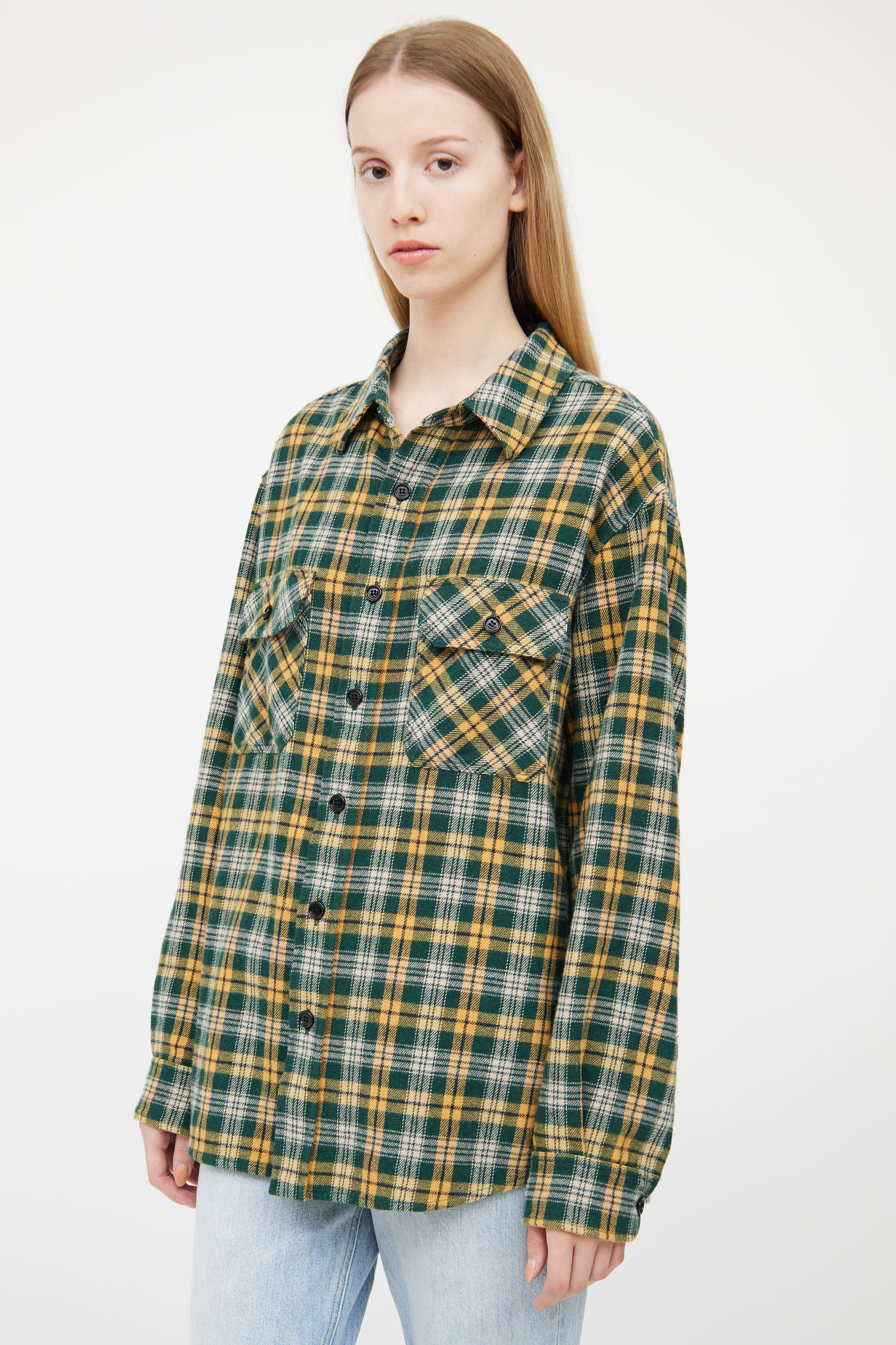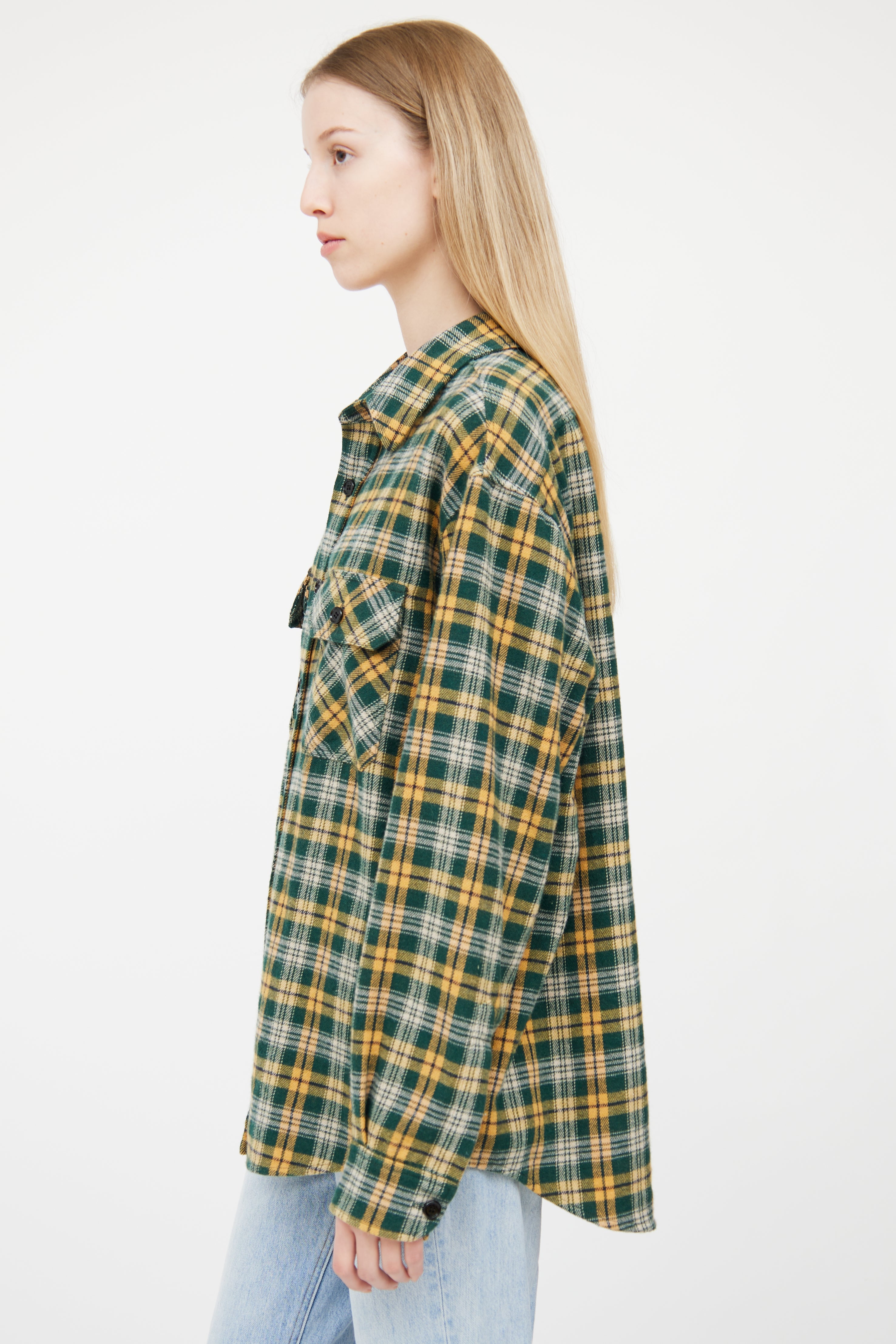 Pre-owned Celine green, yellow and cream plaid shirt featuring point collar, button front closure, long sleeves with button cuffs, dual flap pockets at chest and rounded hem.