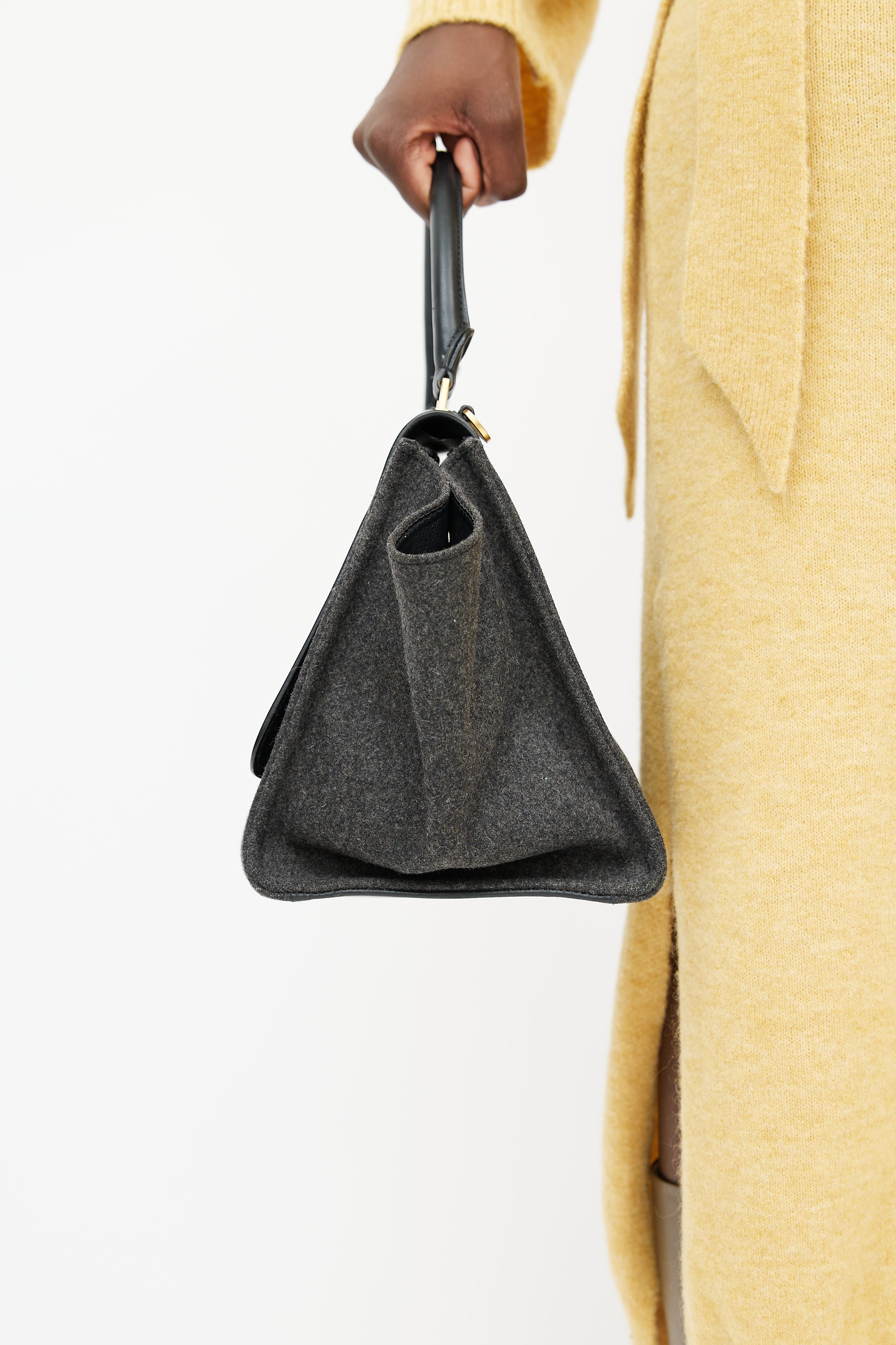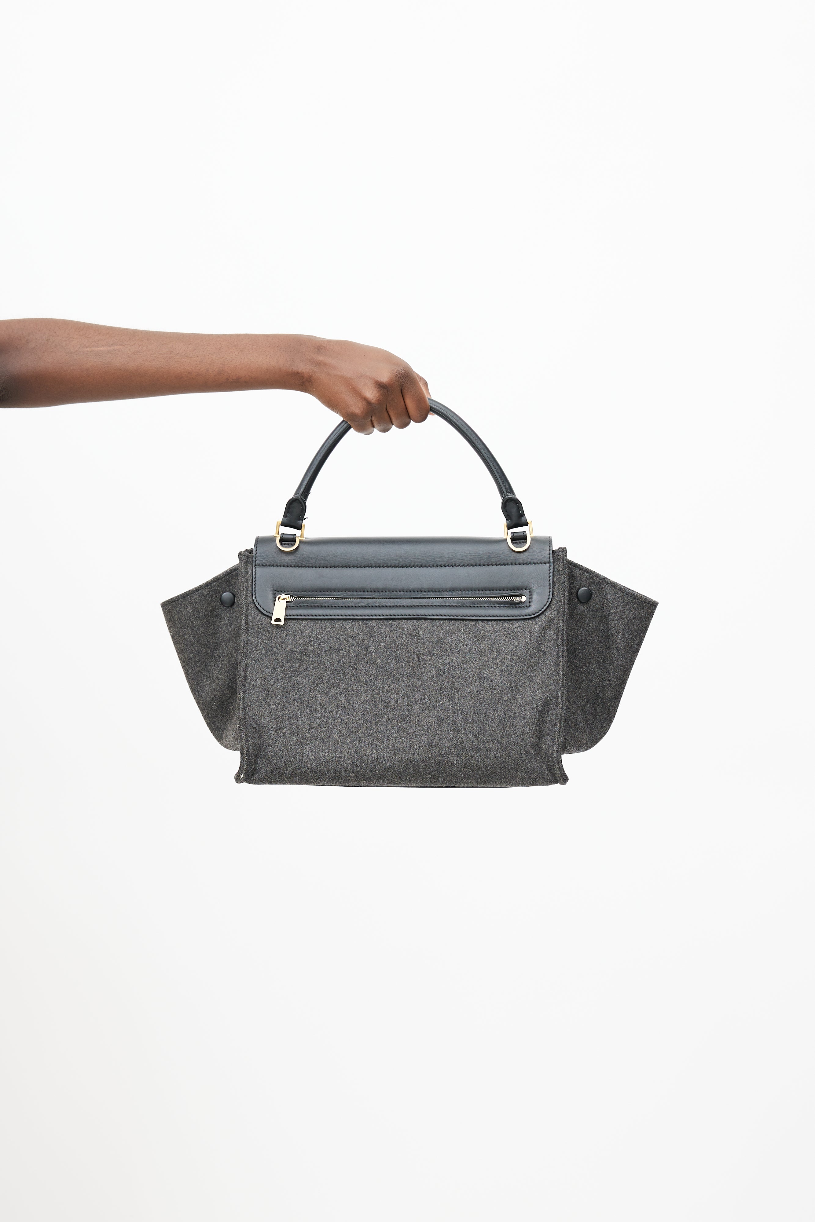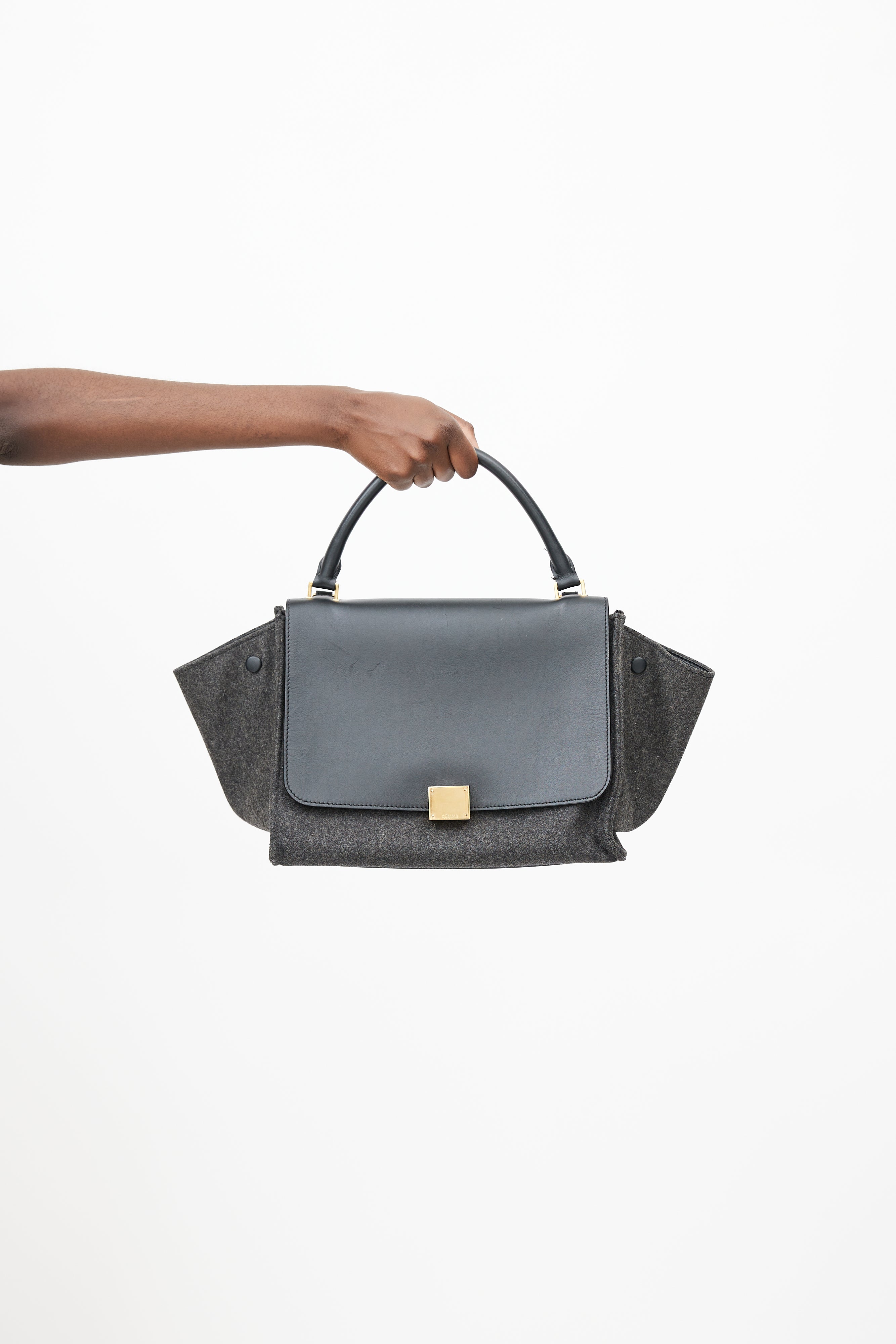 Pre-owned Celine grey Trapeze wool bag featuring a black leather top flap with push lock closure, wrapped top handle, one zip pocket at back, one main compartment with two slip pockets, removable shoulder strap, gold tone hardware, and top zip closure.