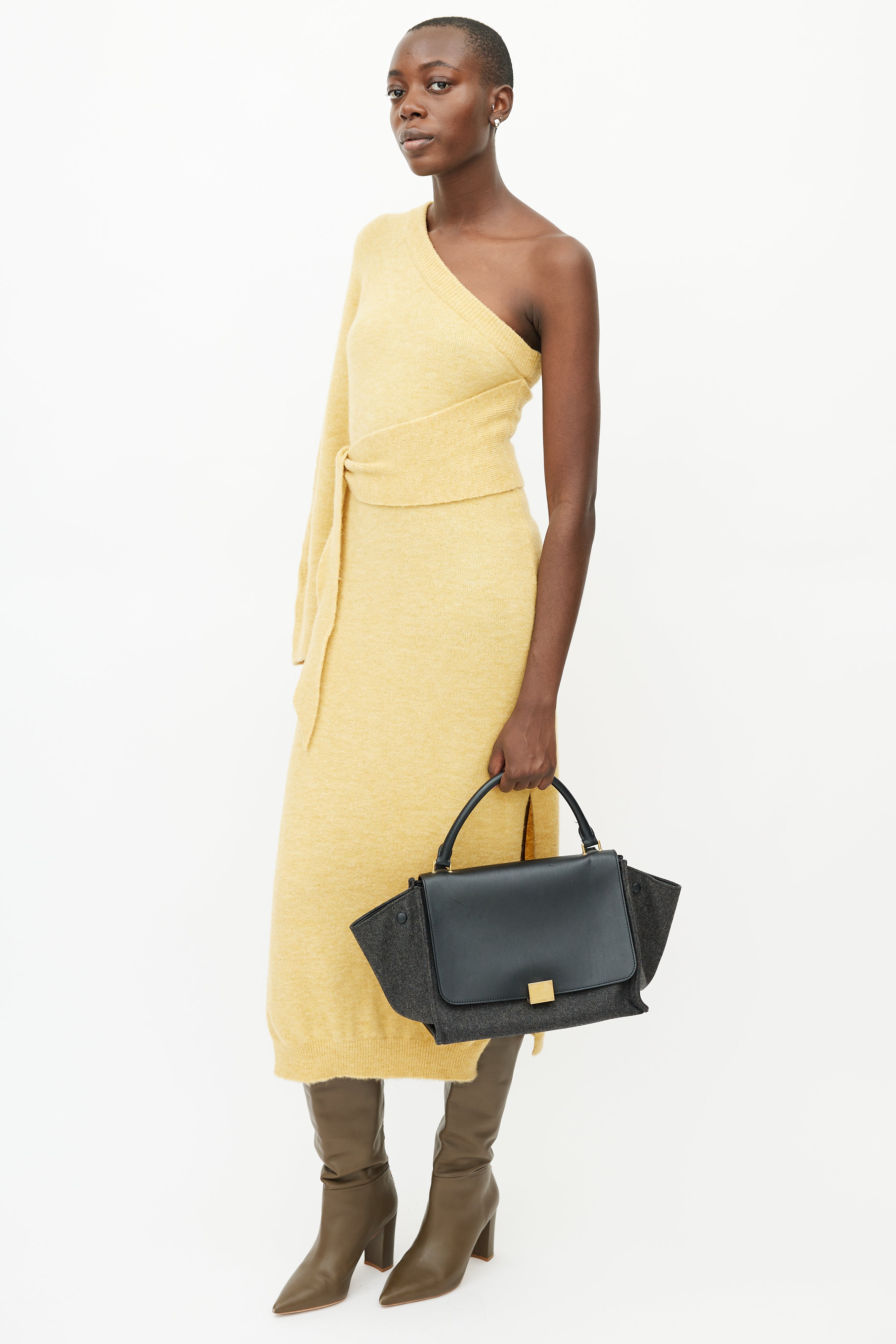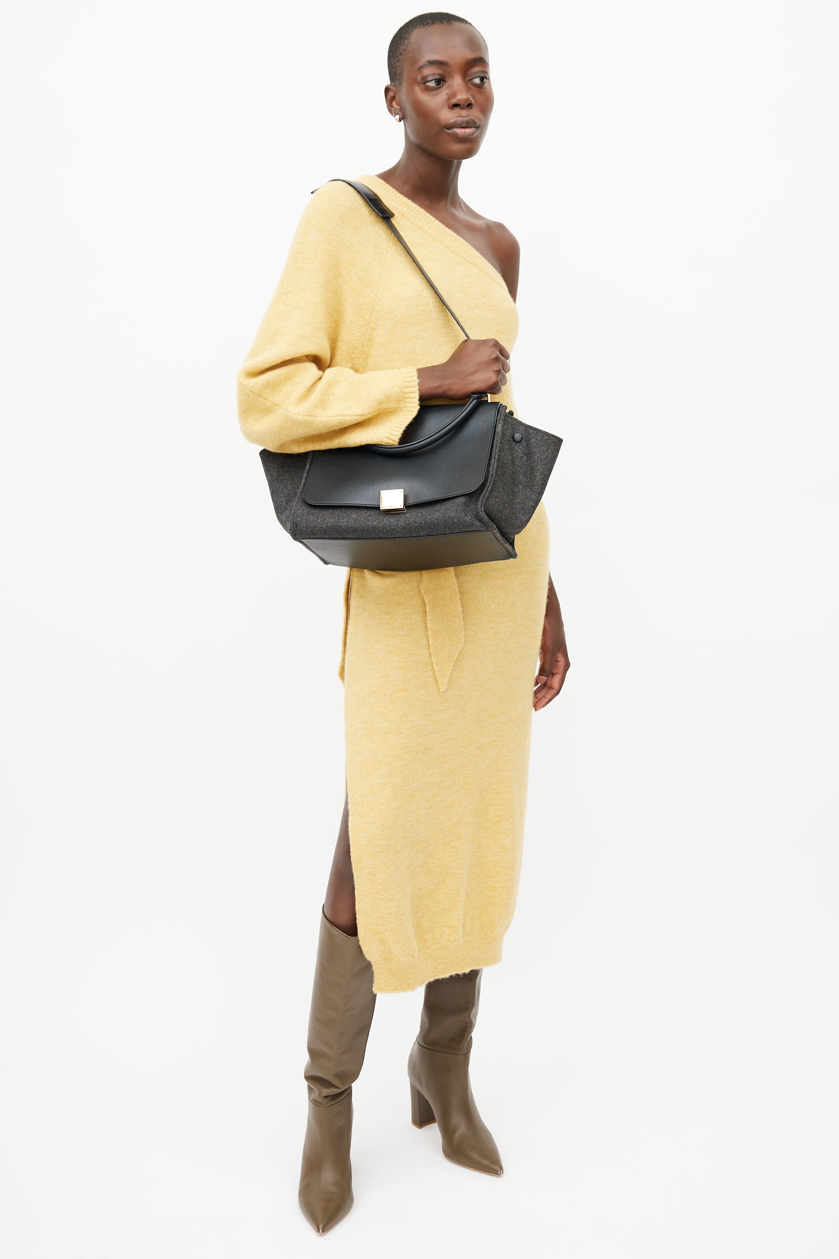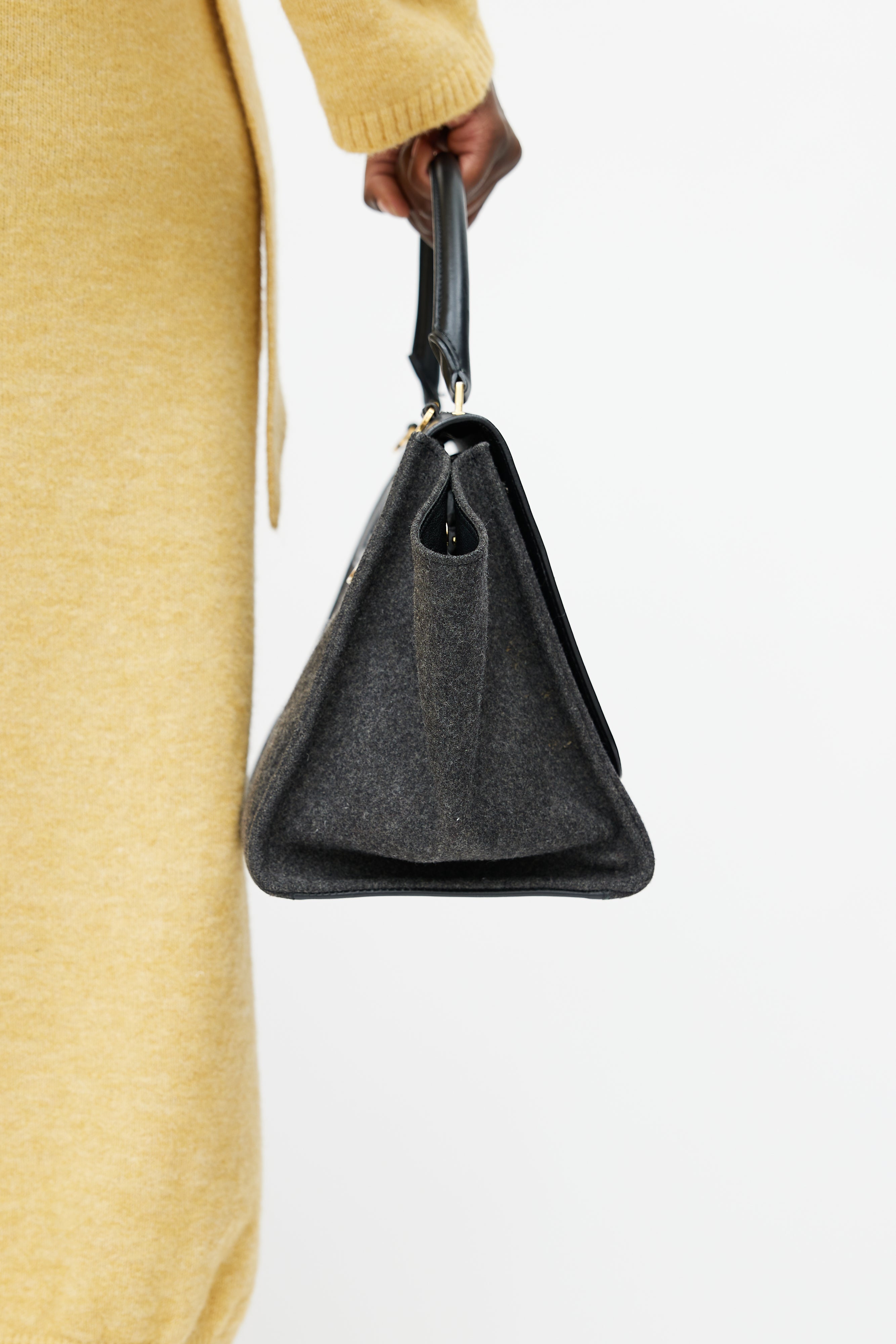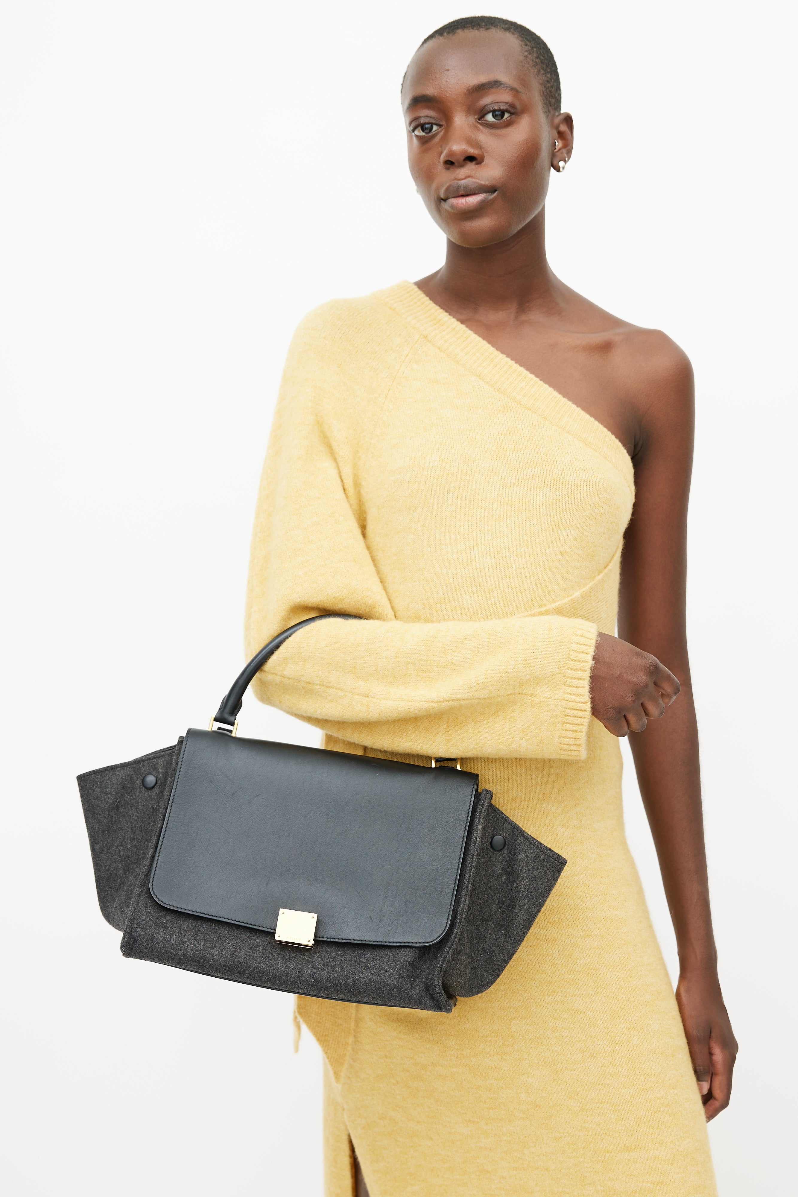 Pre-owned Celine grey Trapeze wool bag featuring a black leather top flap with push lock closure, wrapped top handle, one zip pocket at back, one main compartment with two slip pockets, removable shoulder strap, gold tone hardware, and top zip closure.