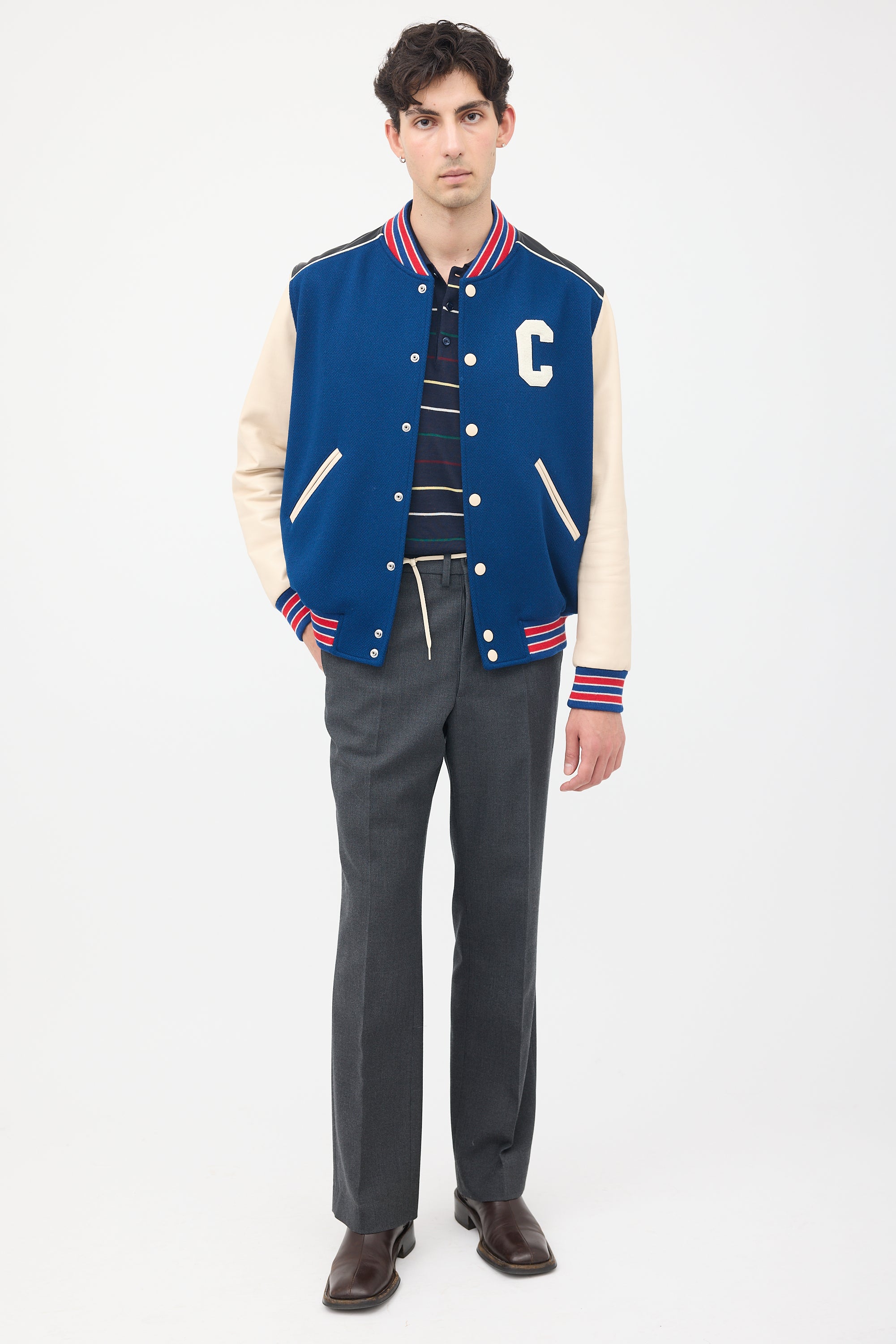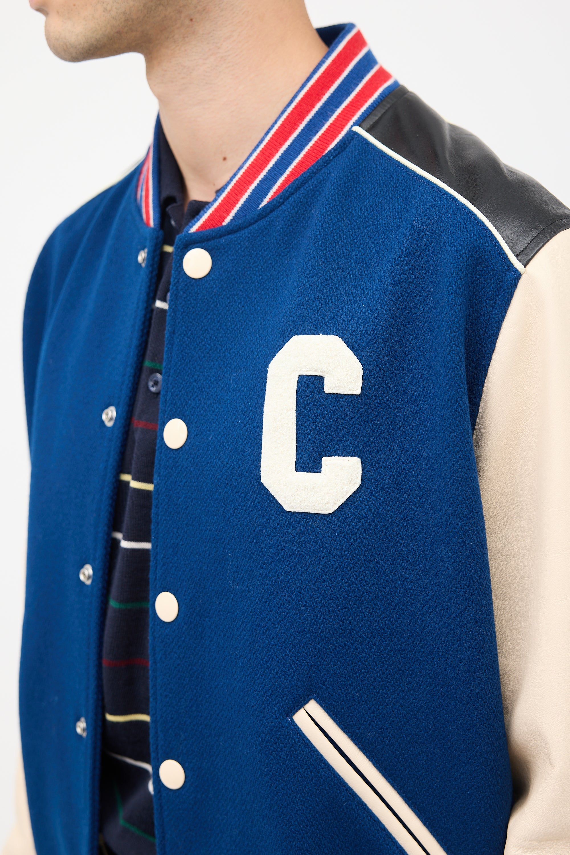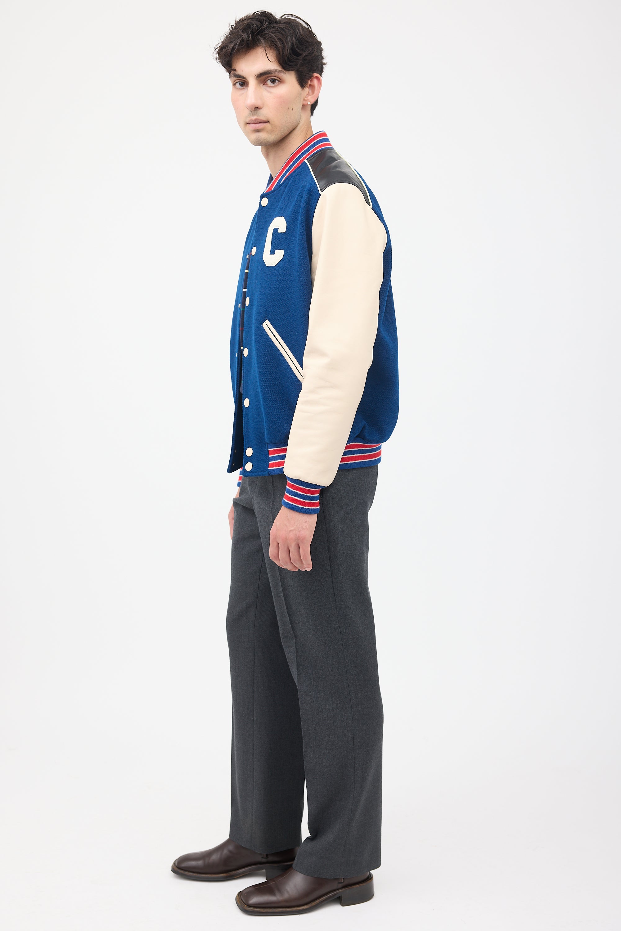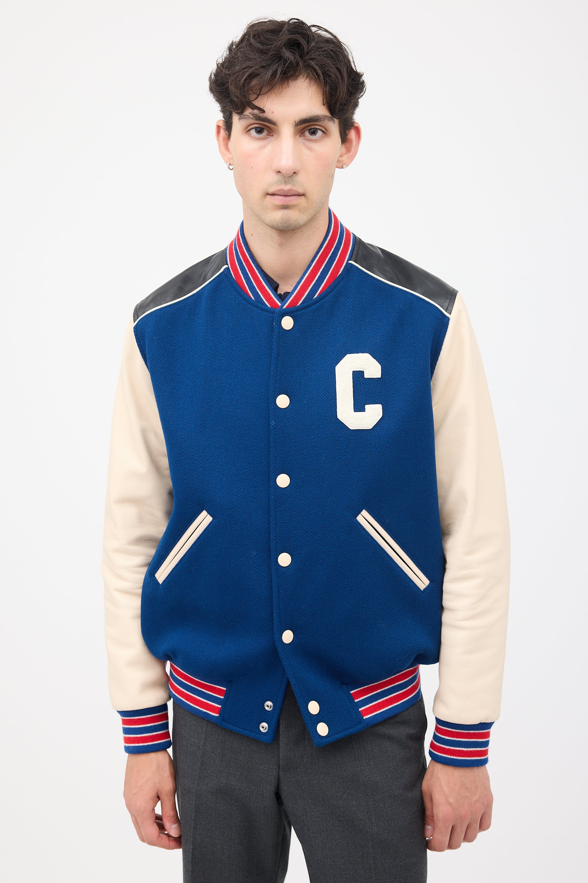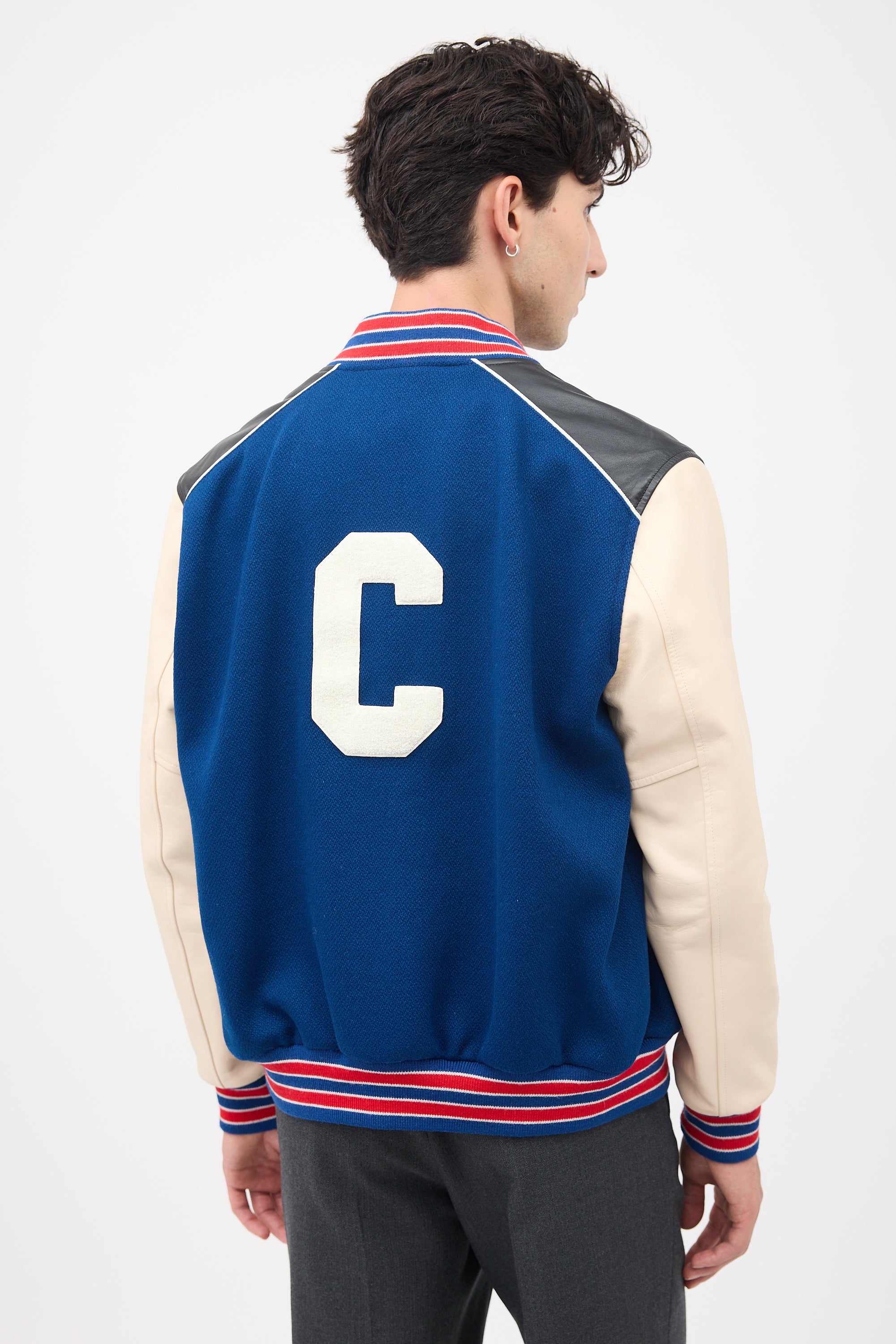 Pre-owned Celine navy wool classic Teddy varsity jacket featuring stand collar, button up front, white leather sleeves, black leather shoulder panels with white piping, two slash pockets at hips, one inner chest pocket, white terrycloth C applique at chest and back, and red and navy ribbed hem, collar, and cuffs. Lined.