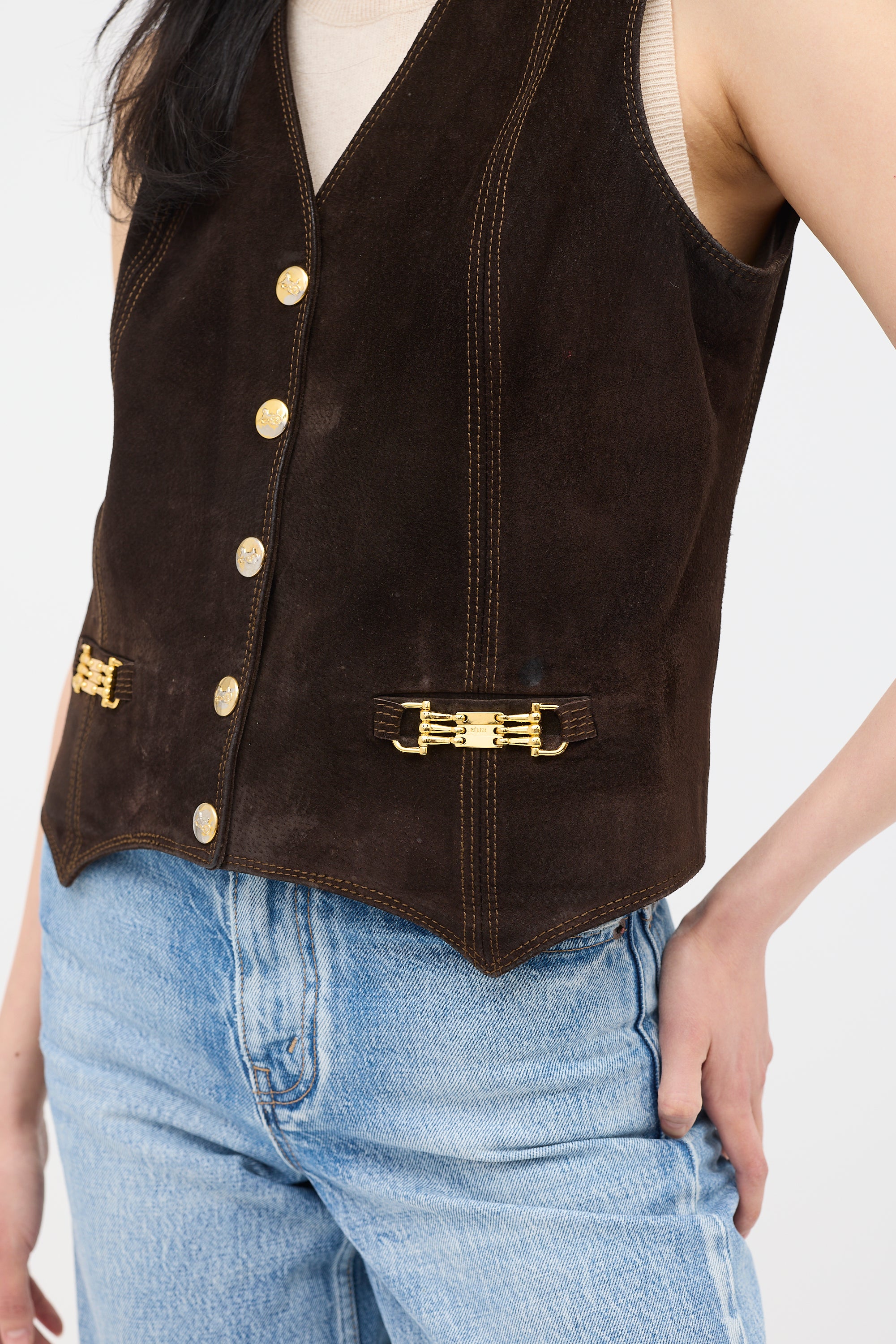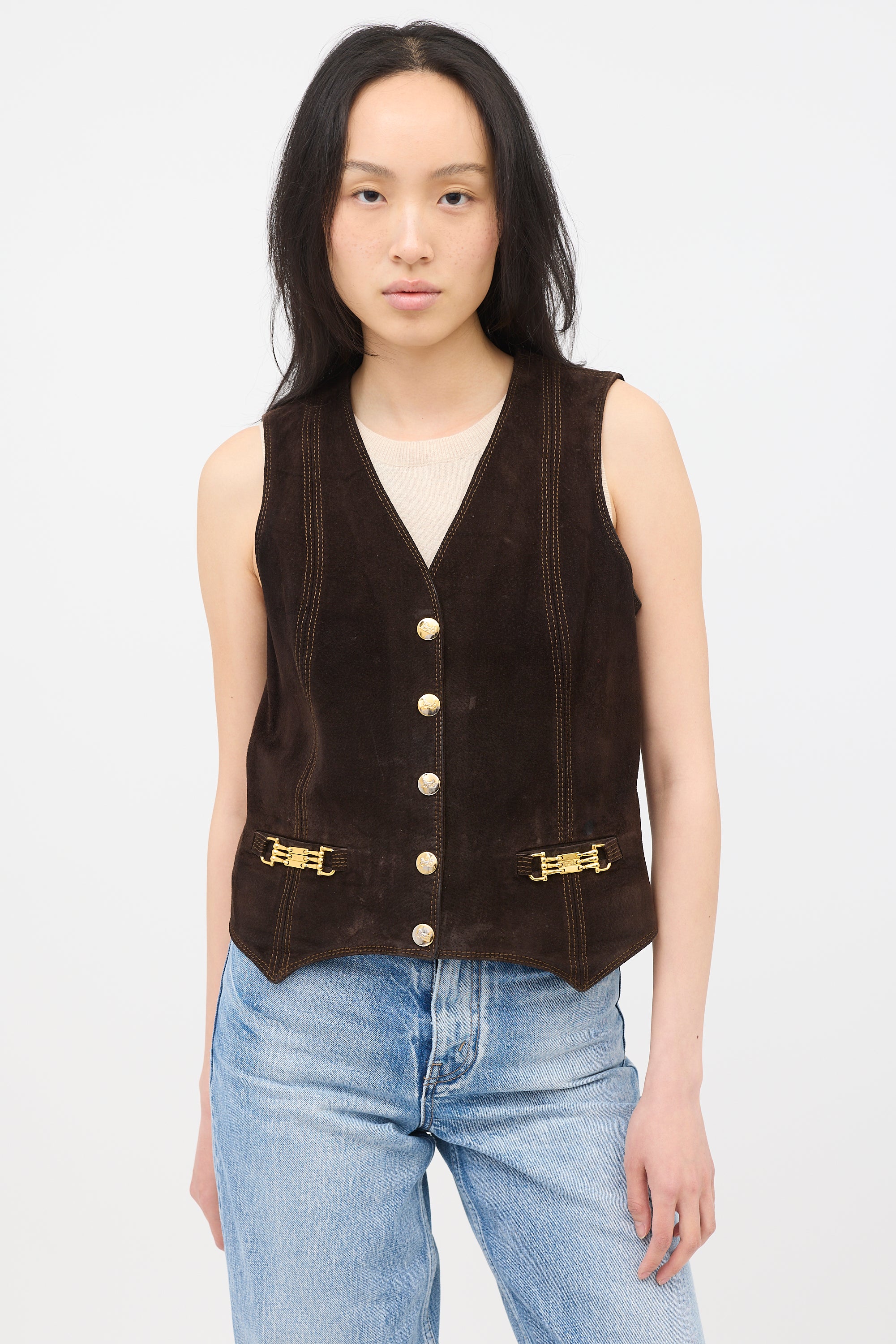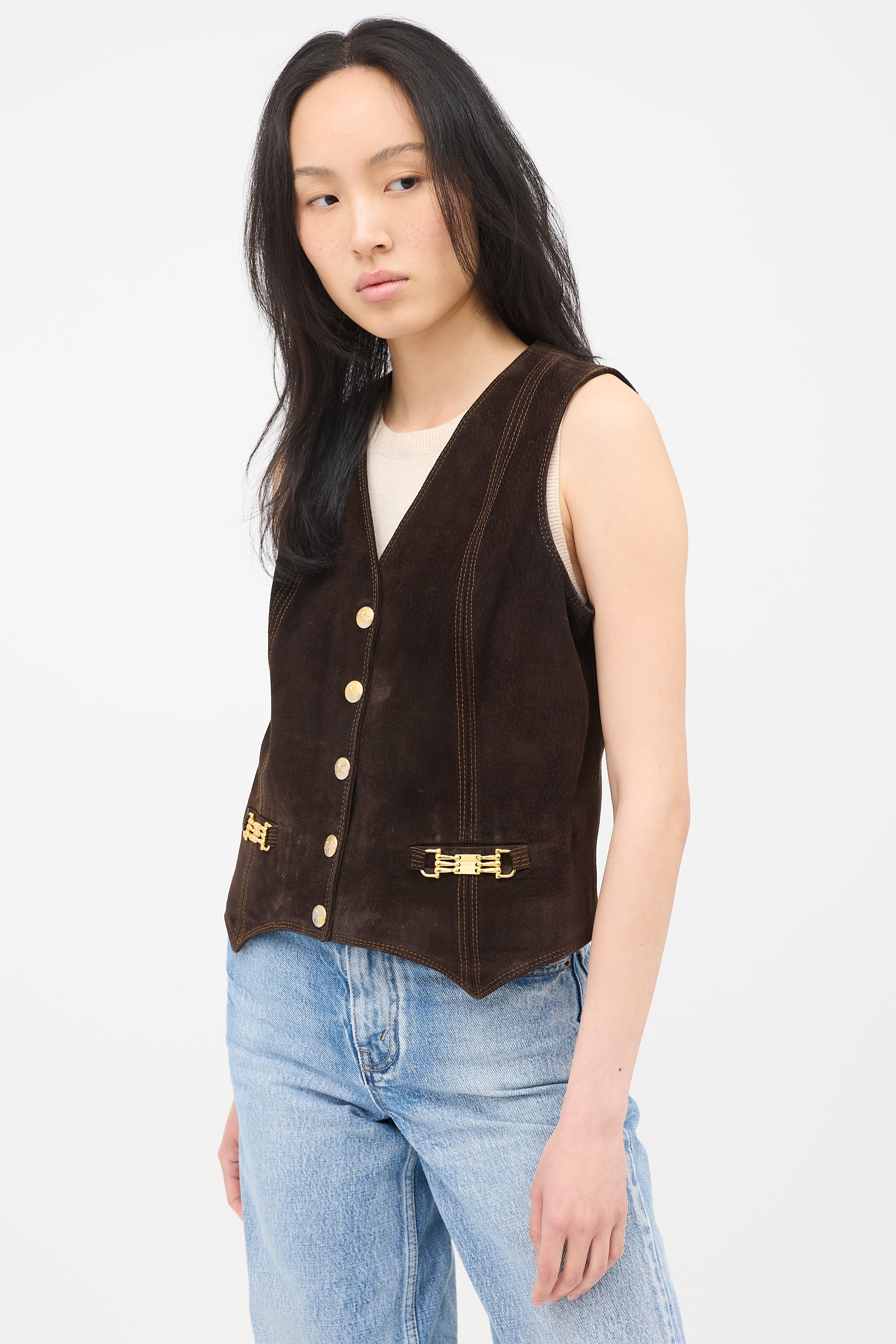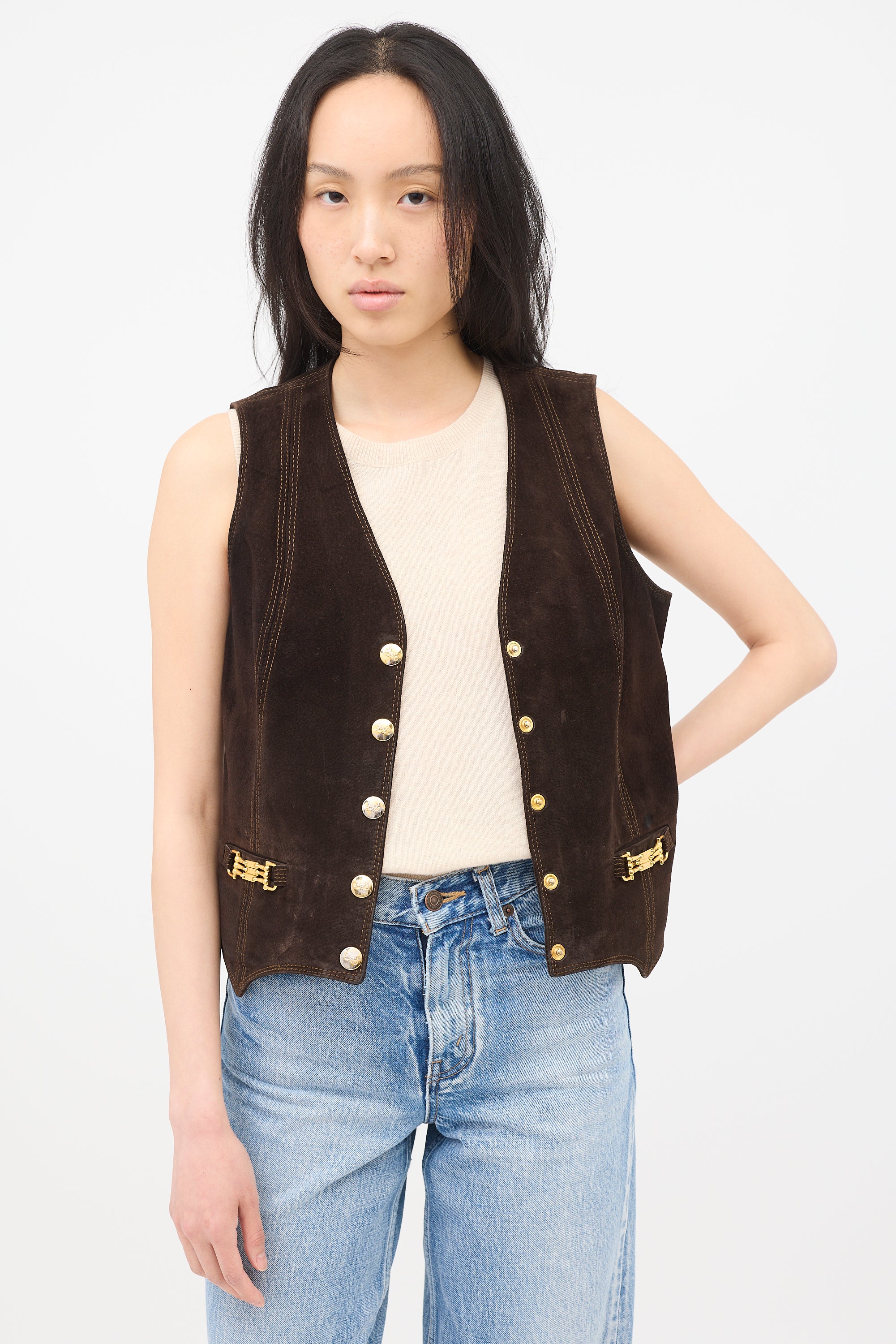 Pre-owned Celine vintage 1970's brown suede vest featuring gold tone hardware, V-neckline, embellished horse and carriage snap button front, two slip pockets with horse bit hardware, light brown threading throughout, and horse and carriage printed textile lining.