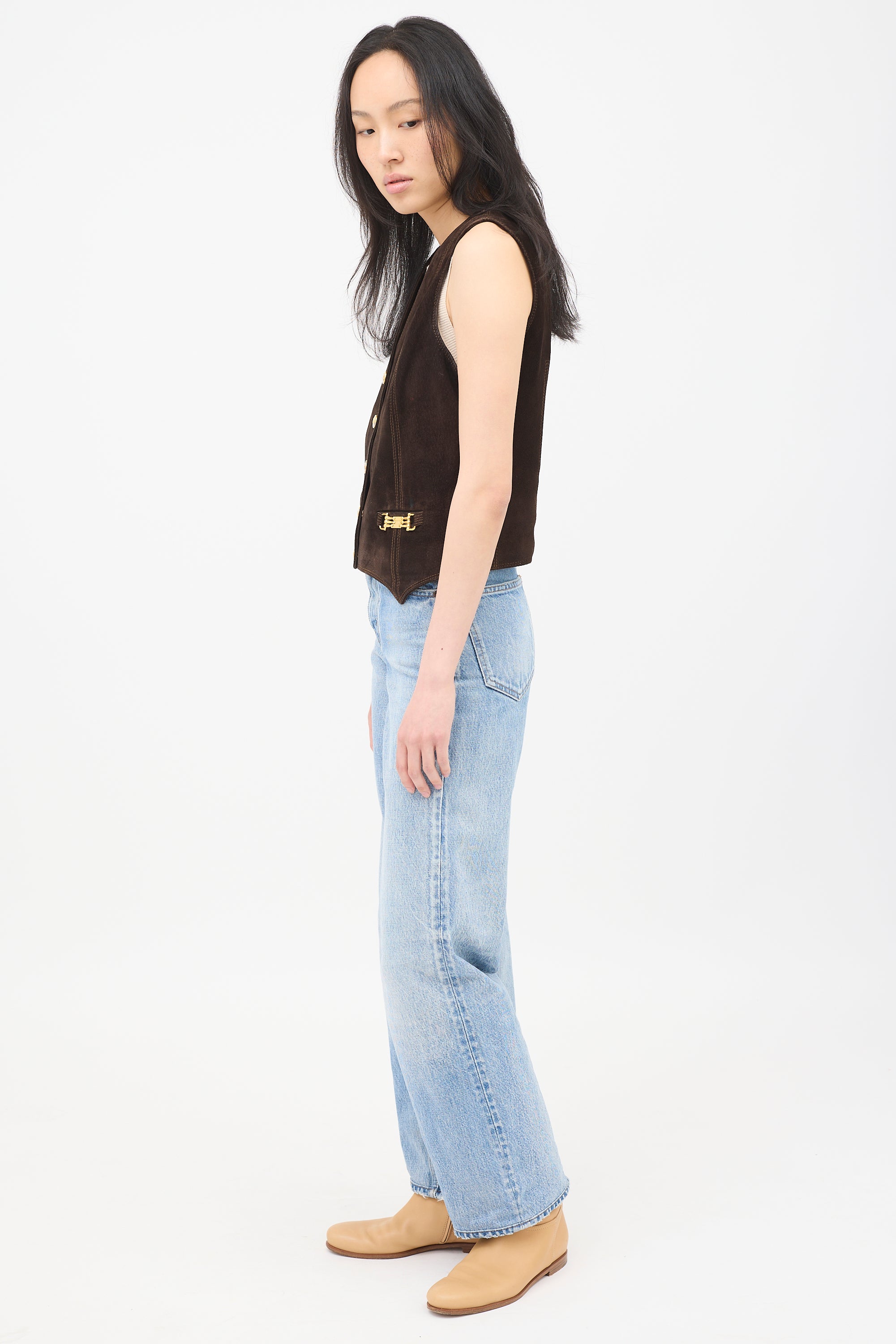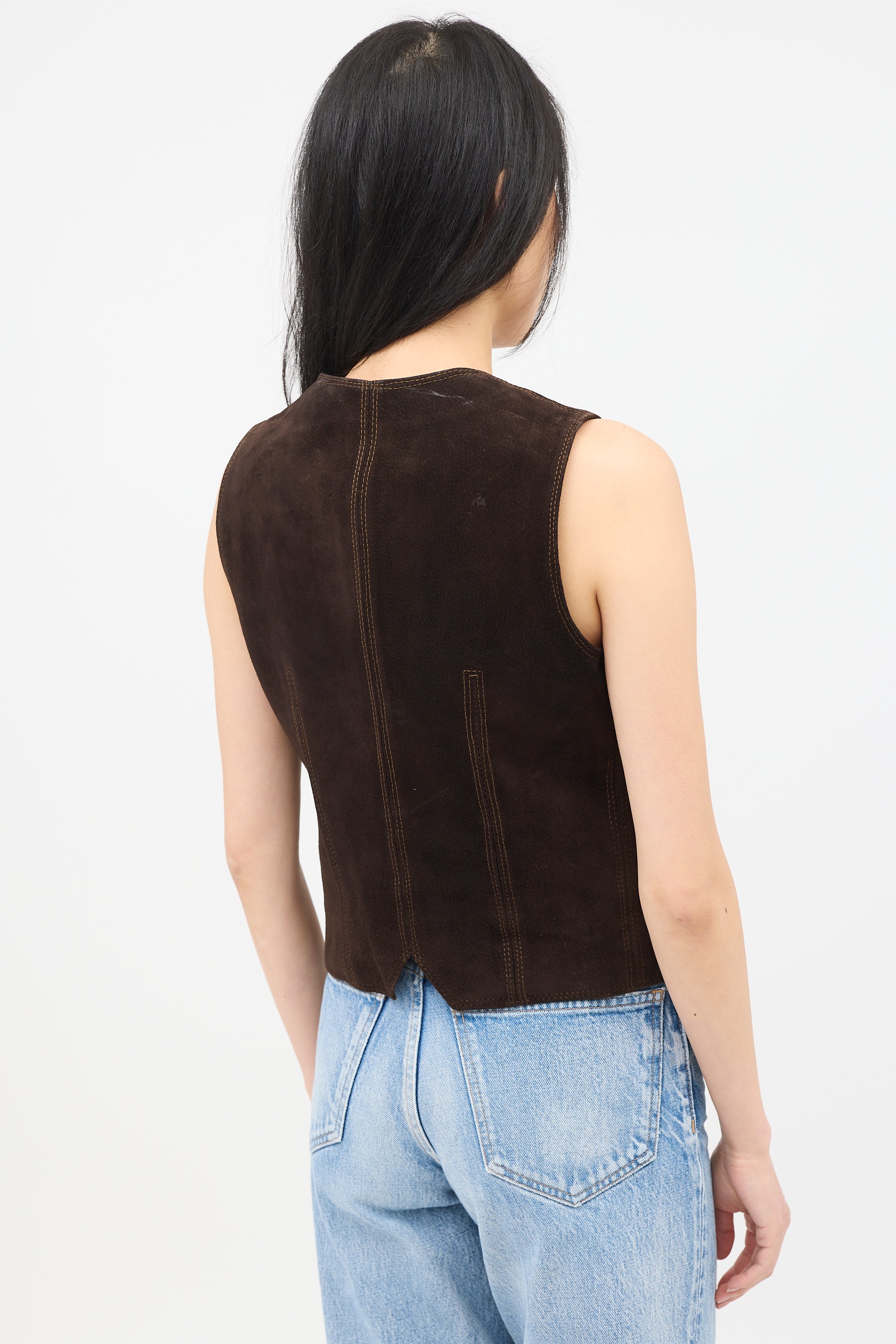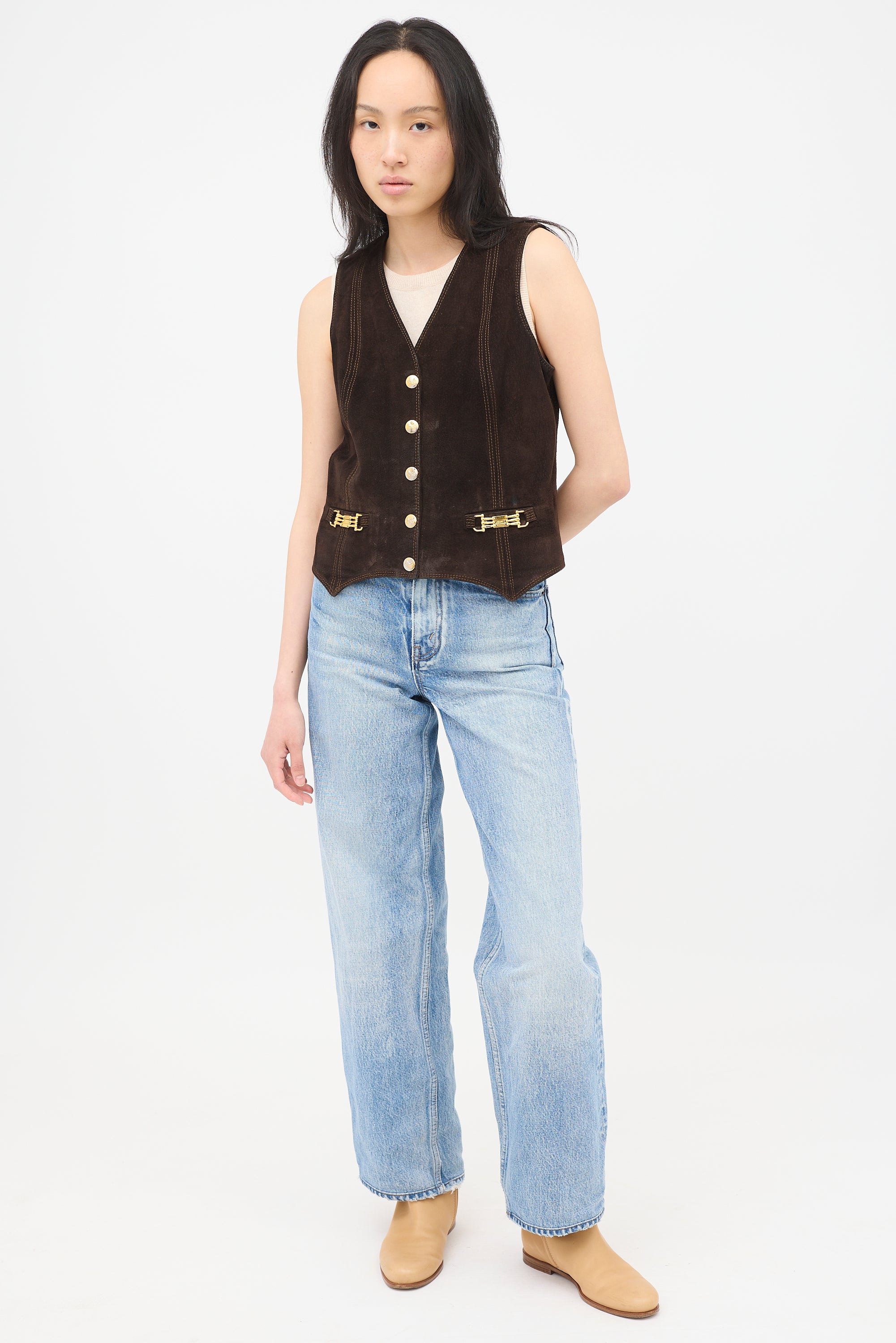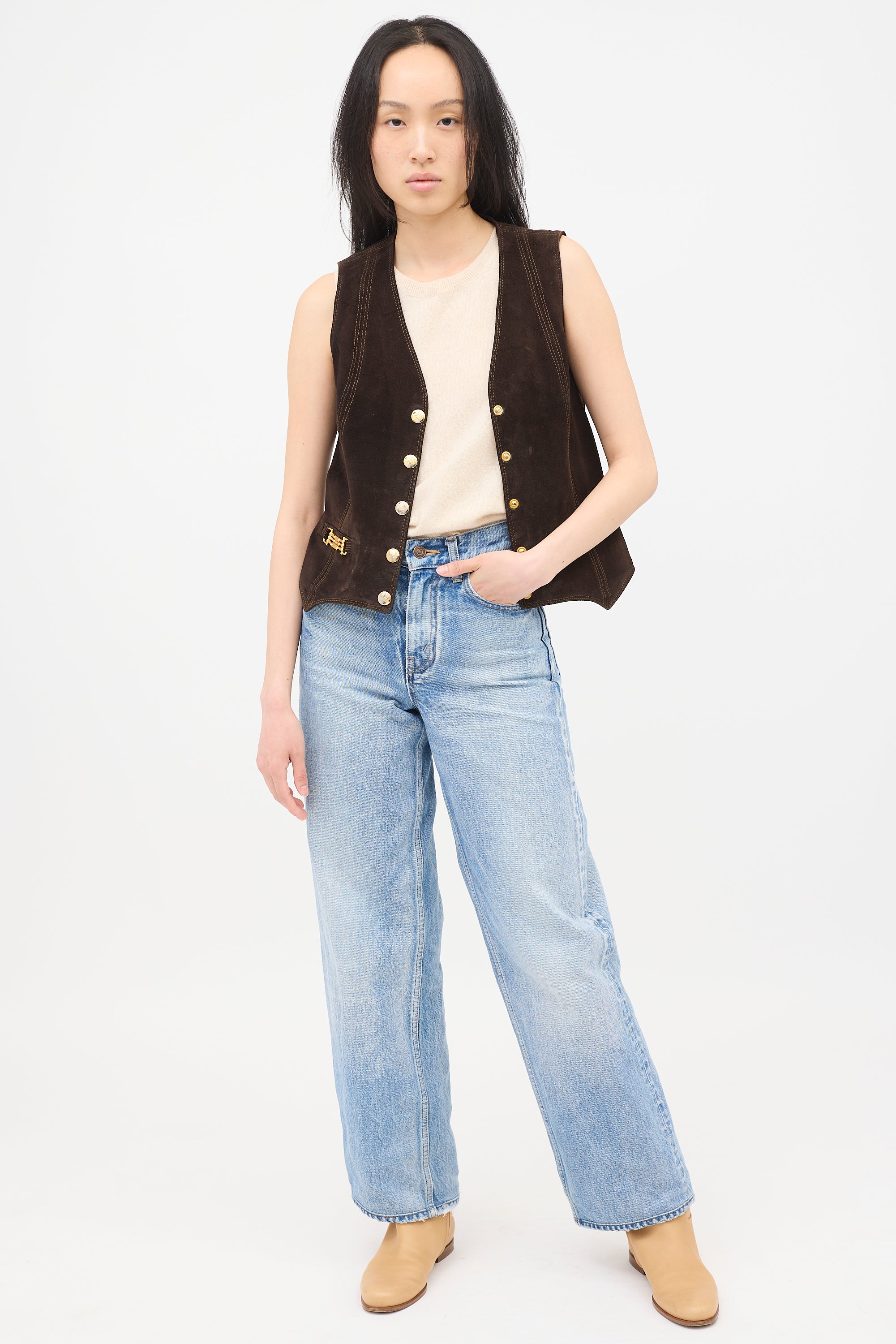 Pre-owned Celine vintage 1970's brown suede vest featuring gold tone hardware, V-neckline, embellished horse and carriage snap button front, two slip pockets with horse bit hardware, light brown threading throughout, and horse and carriage printed textile lining.