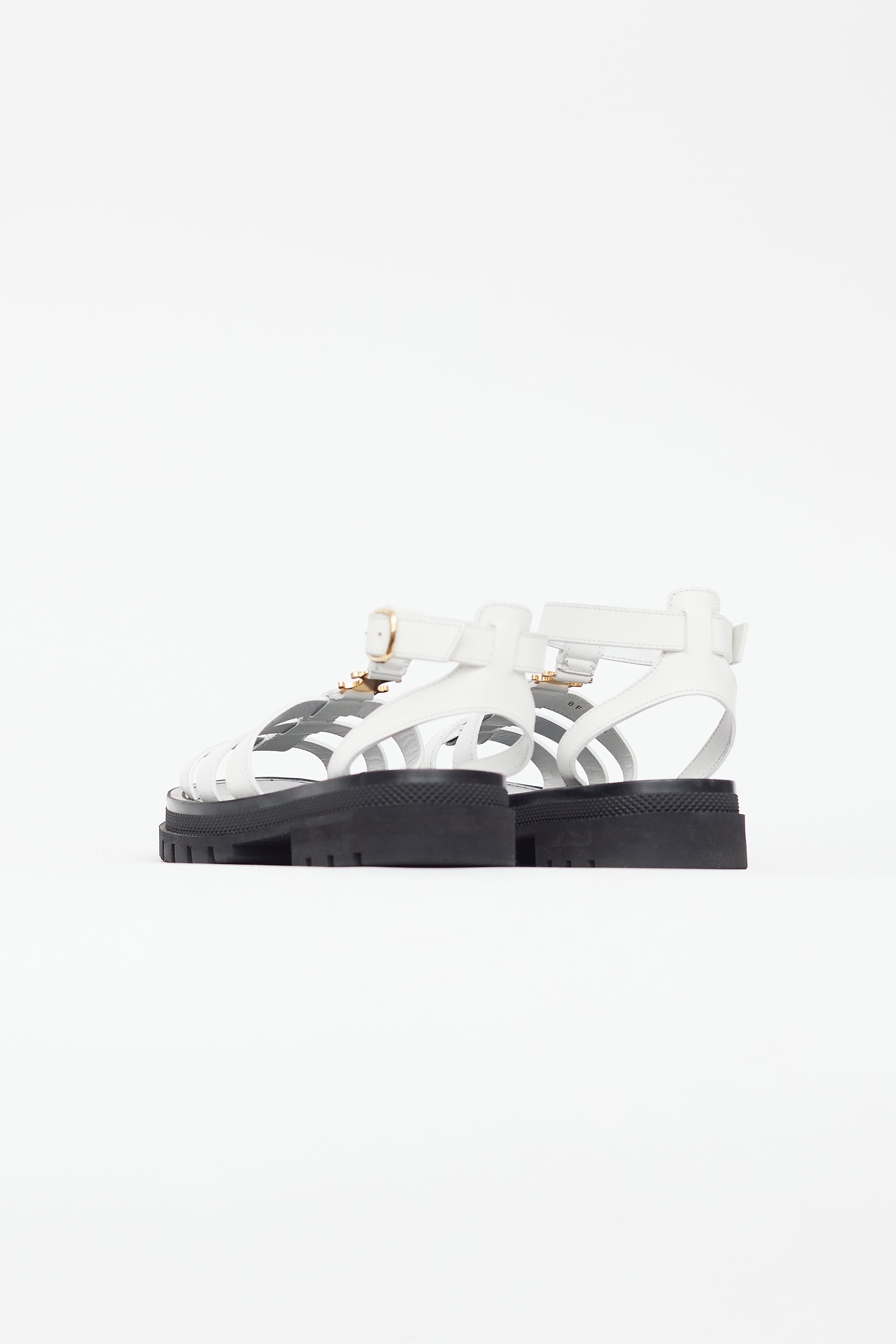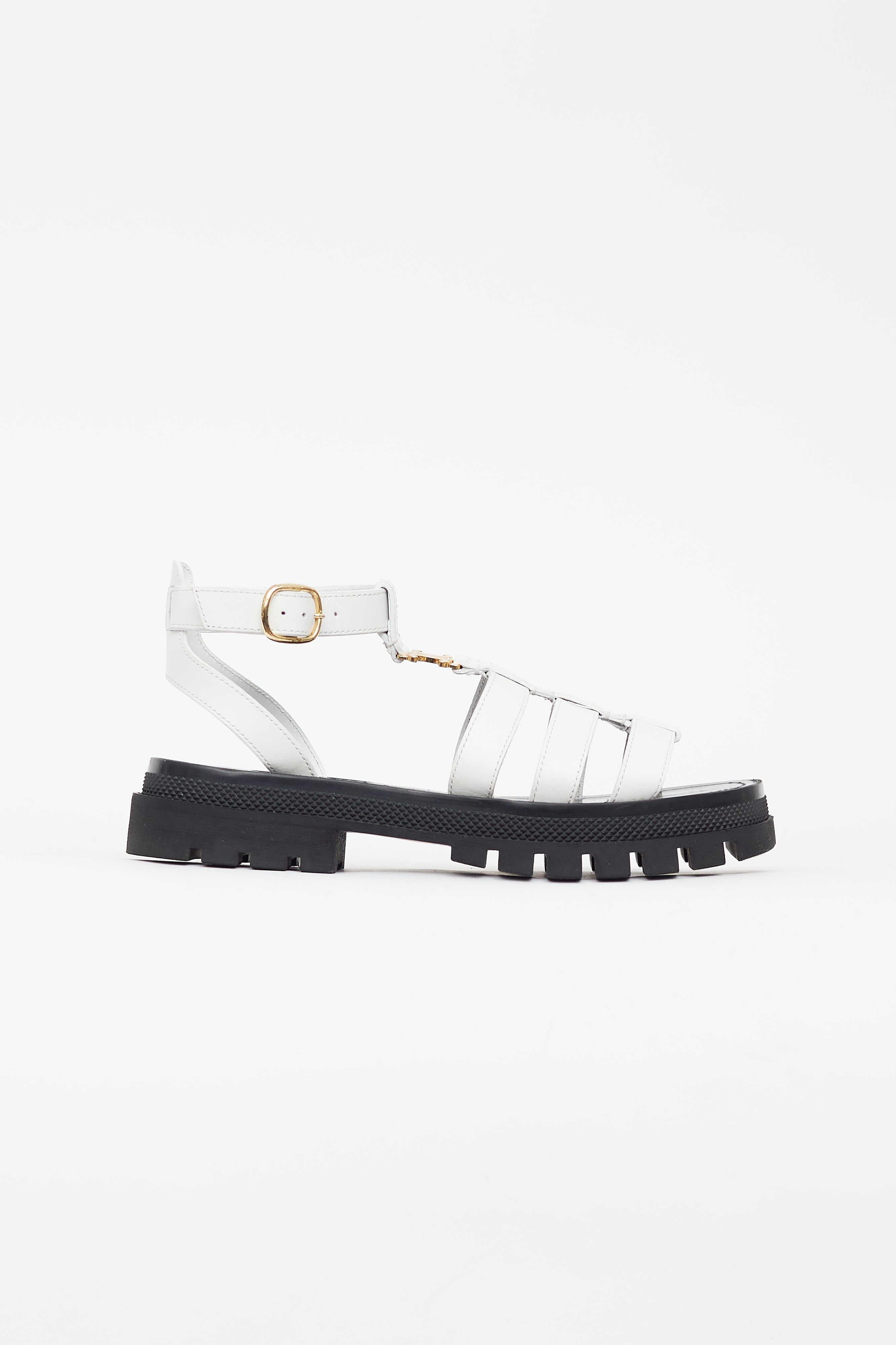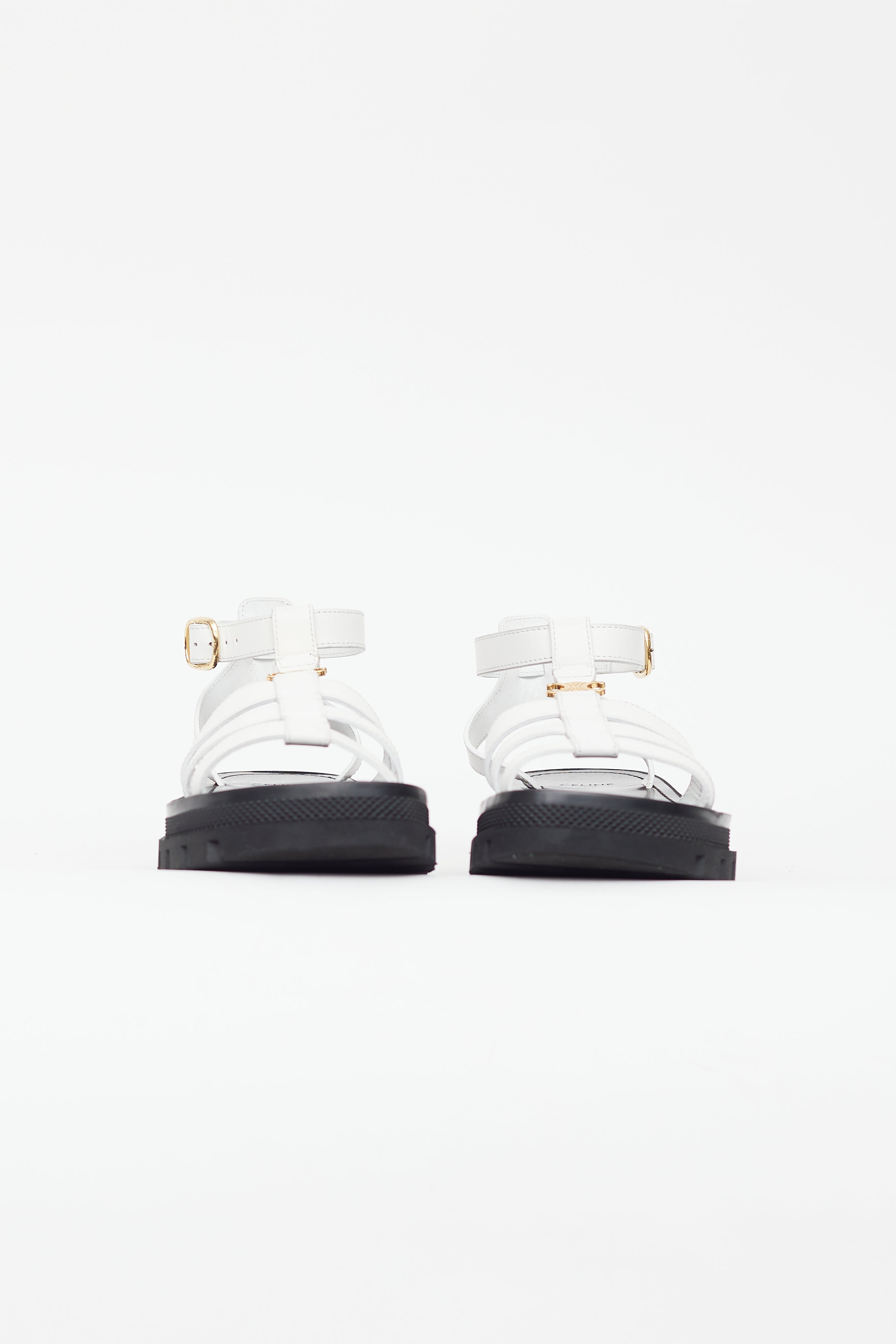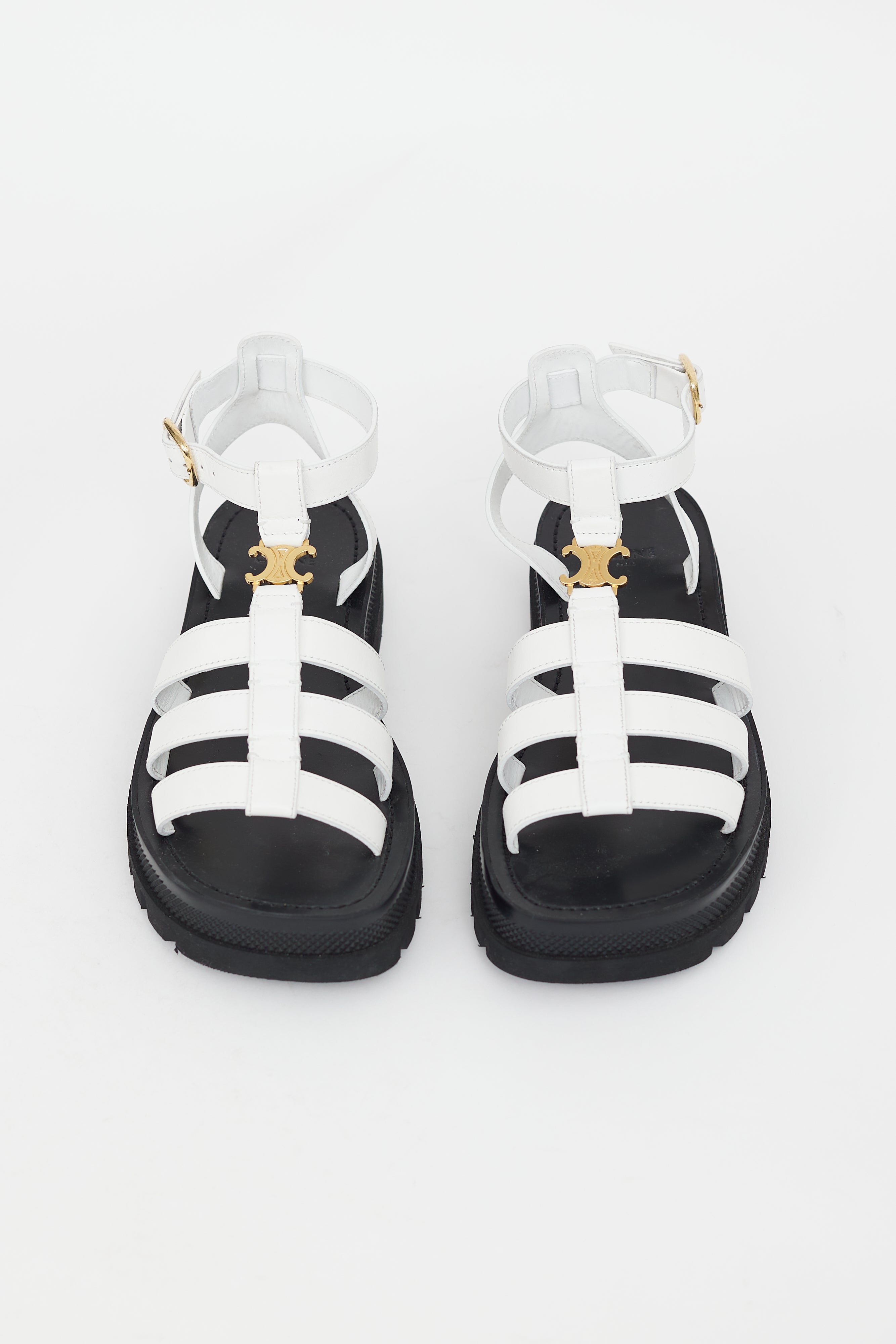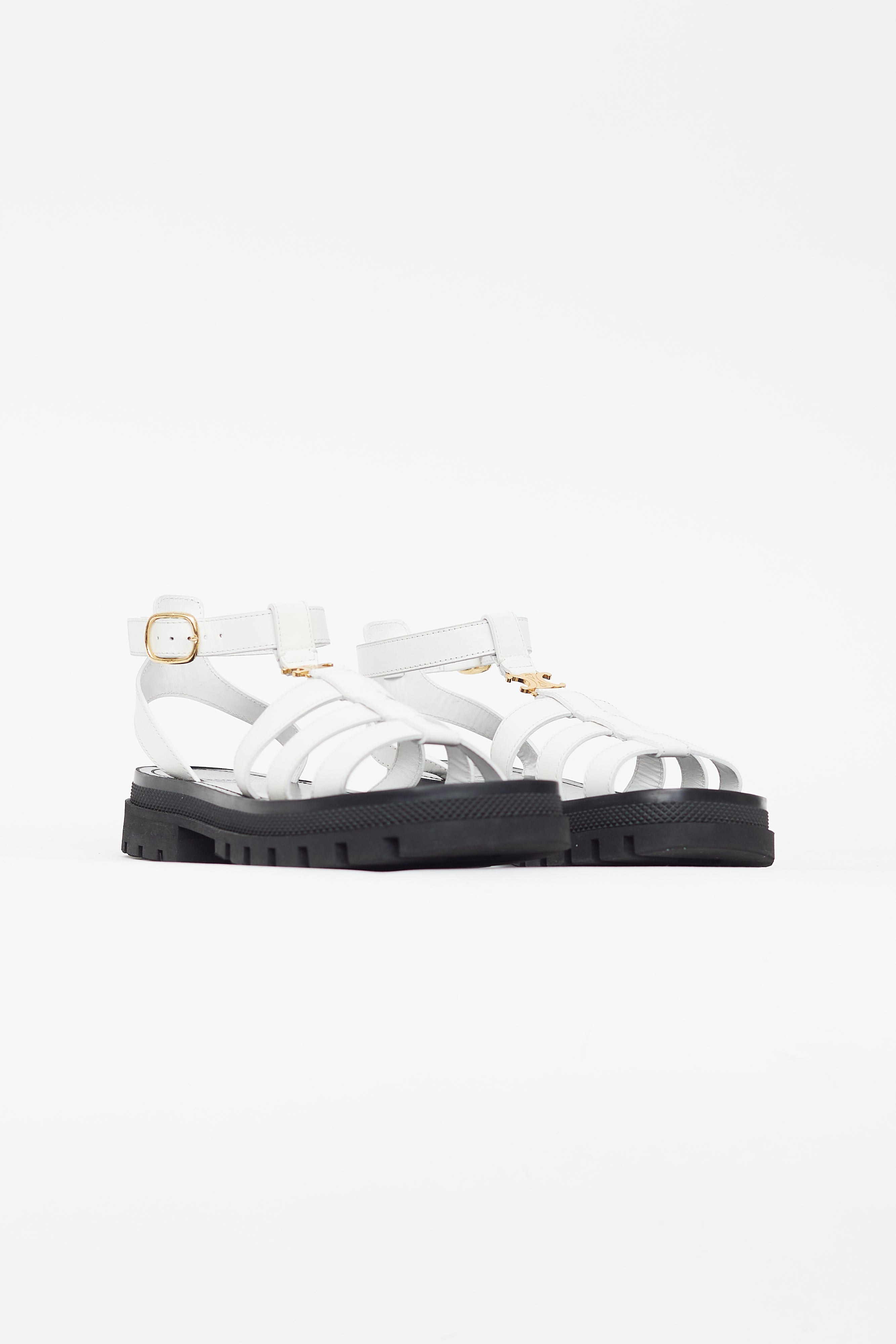 Pre-owned Celine white Clea gladiator sandals featuring open rounded toe, leather caged upper, ankle strap with buckle fastening, gold tone Triomphe logo hardware at front, and chunky outsole. Comes with original dust bag and box. Hedi Slimane era design.