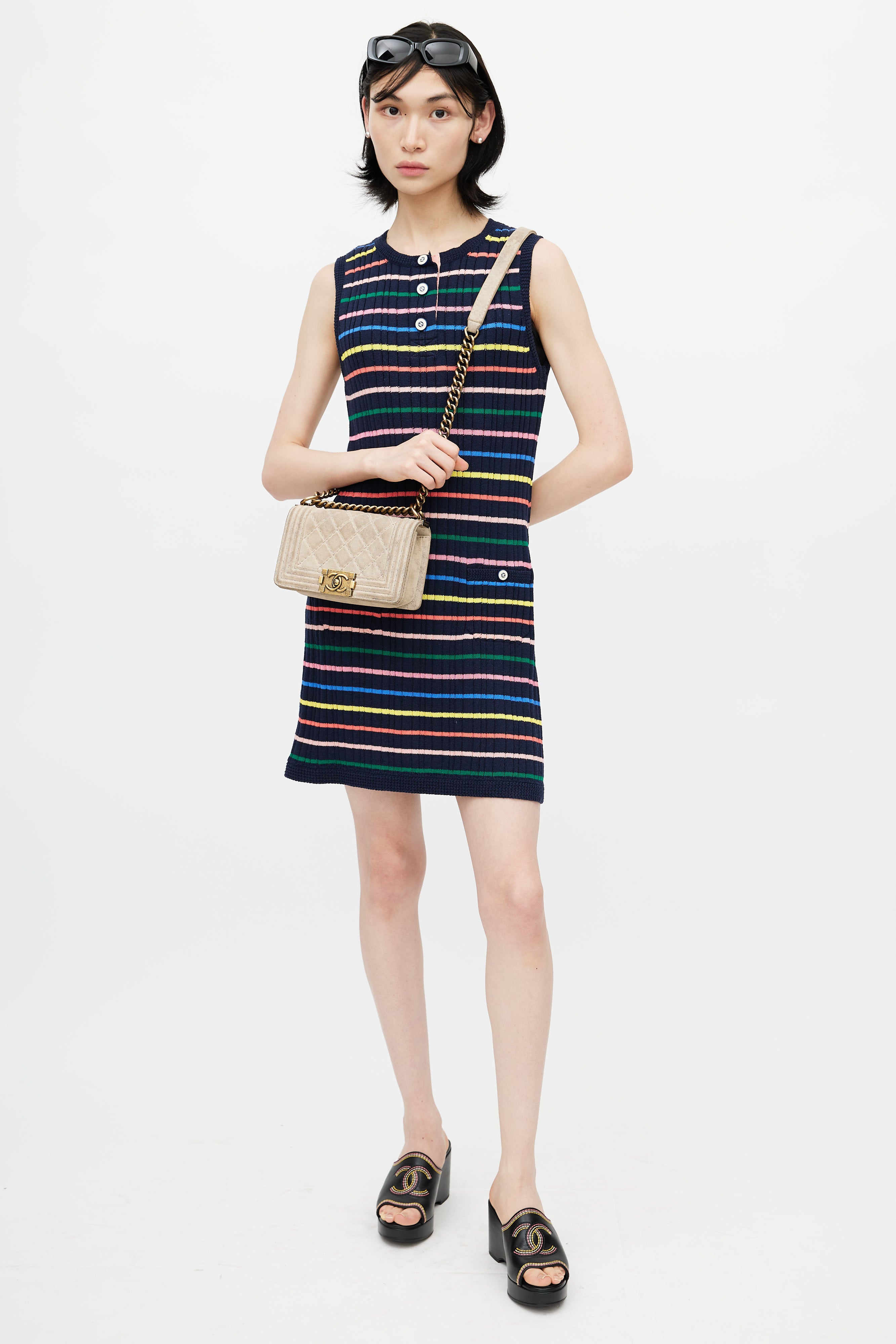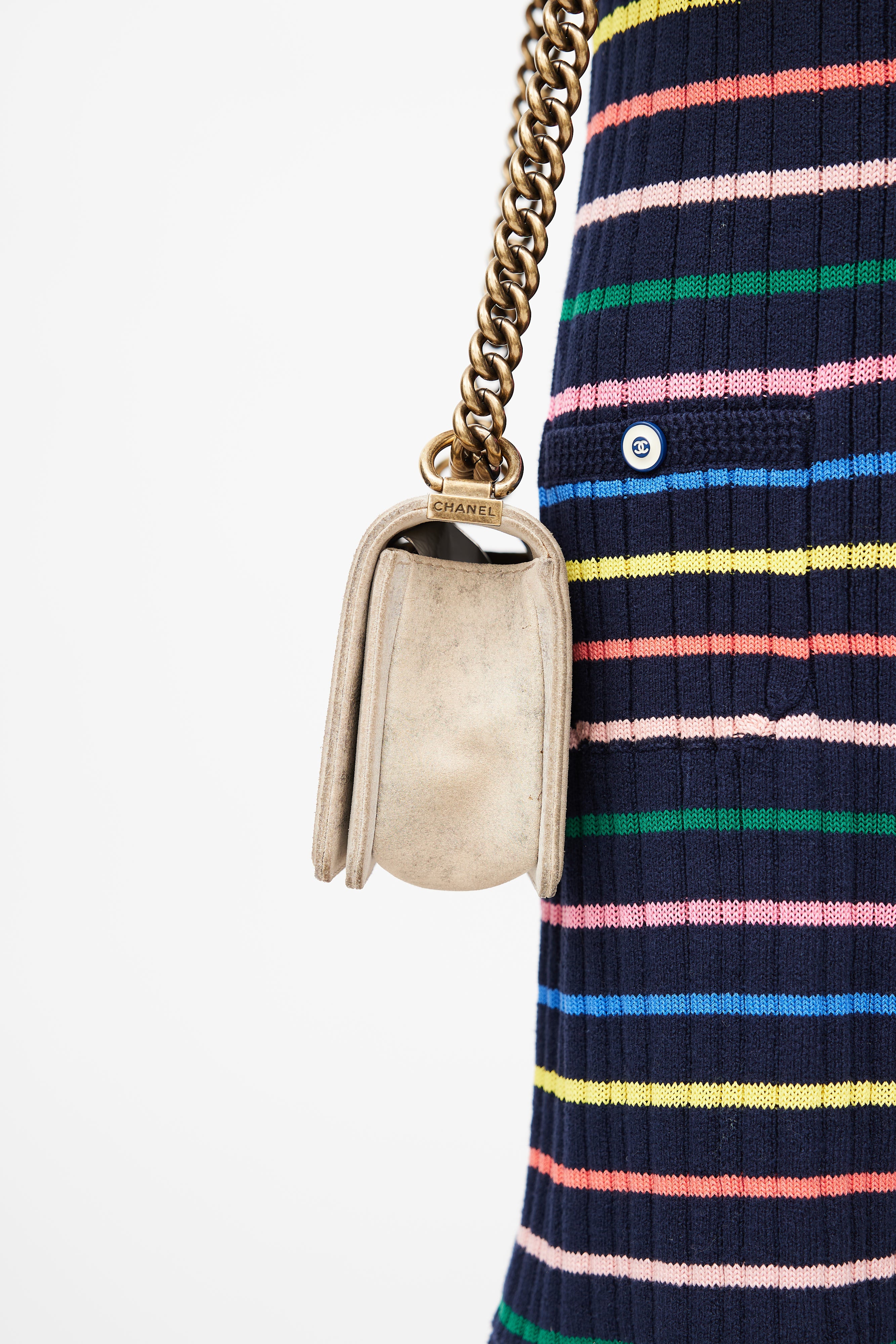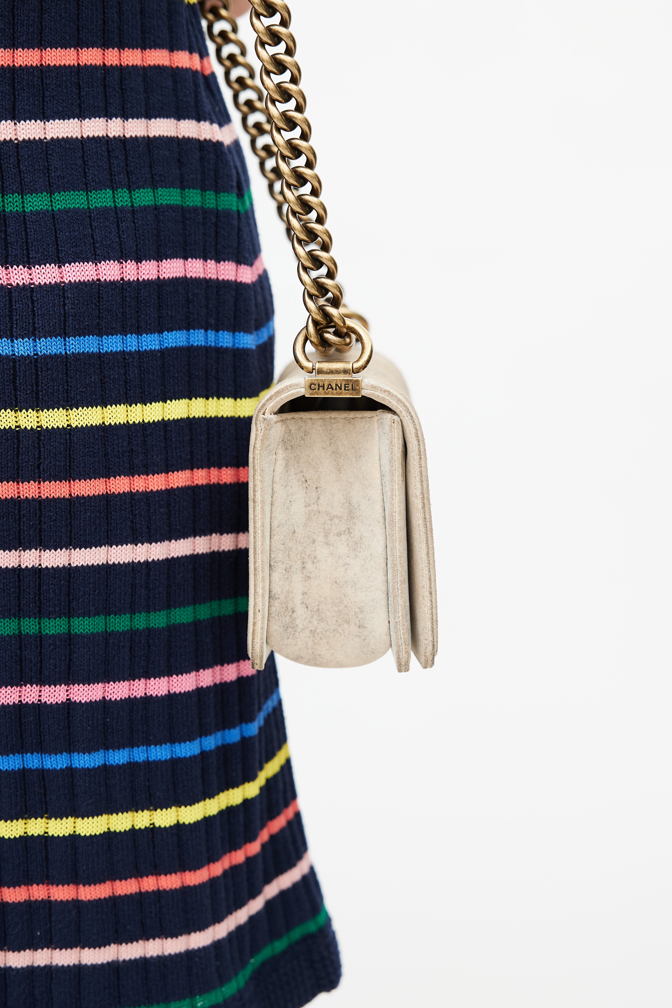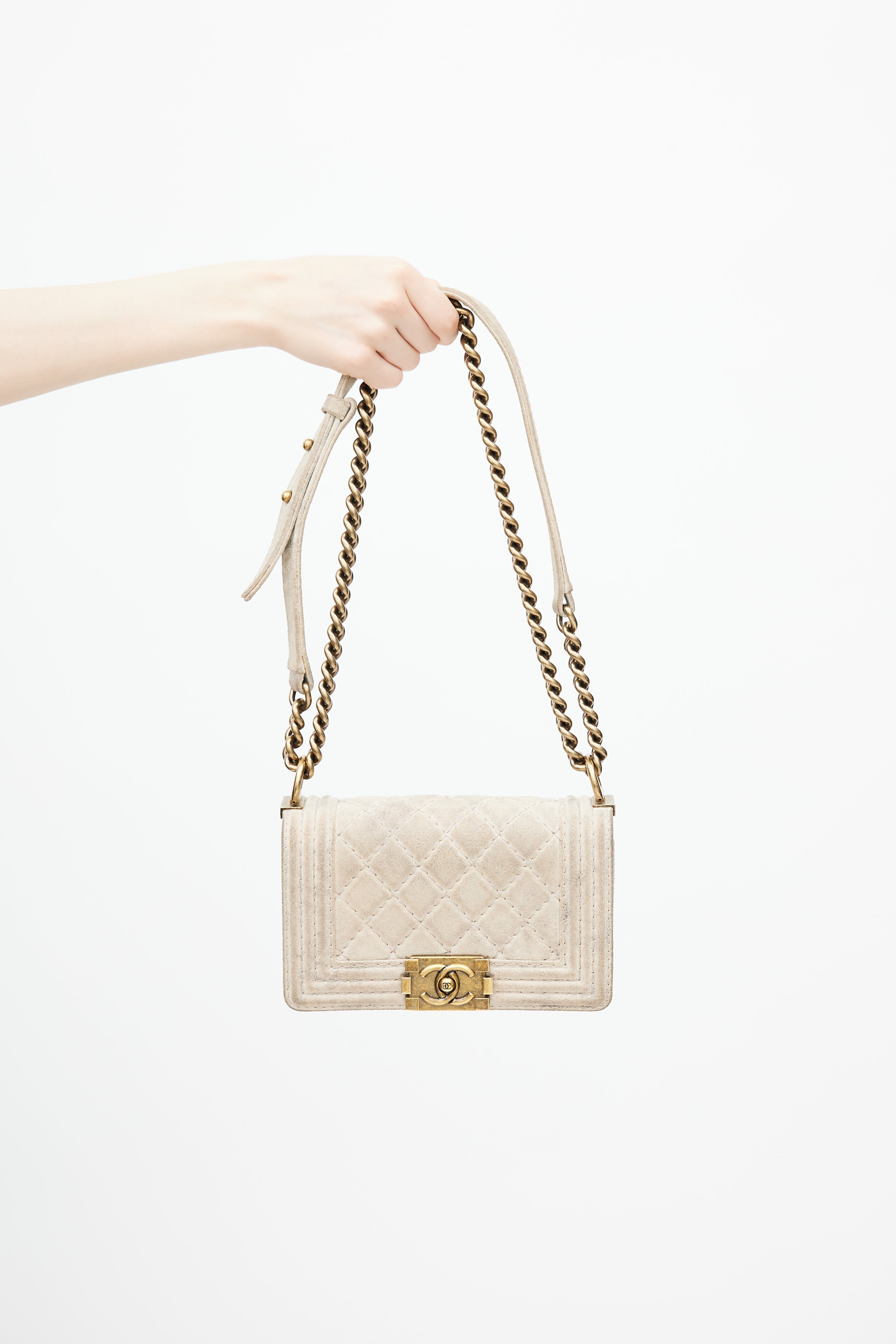 Pre-owned 2013 Metiers D’Art Chanel beige Boy Bag featuring purposeful distressing throughout, quilted detail throughout, CC logo hardware at face, push lock closure, adjustable chain and suede shoulder strap, lined main compartment, and interior slip pocket. Comes with original dust bag.
