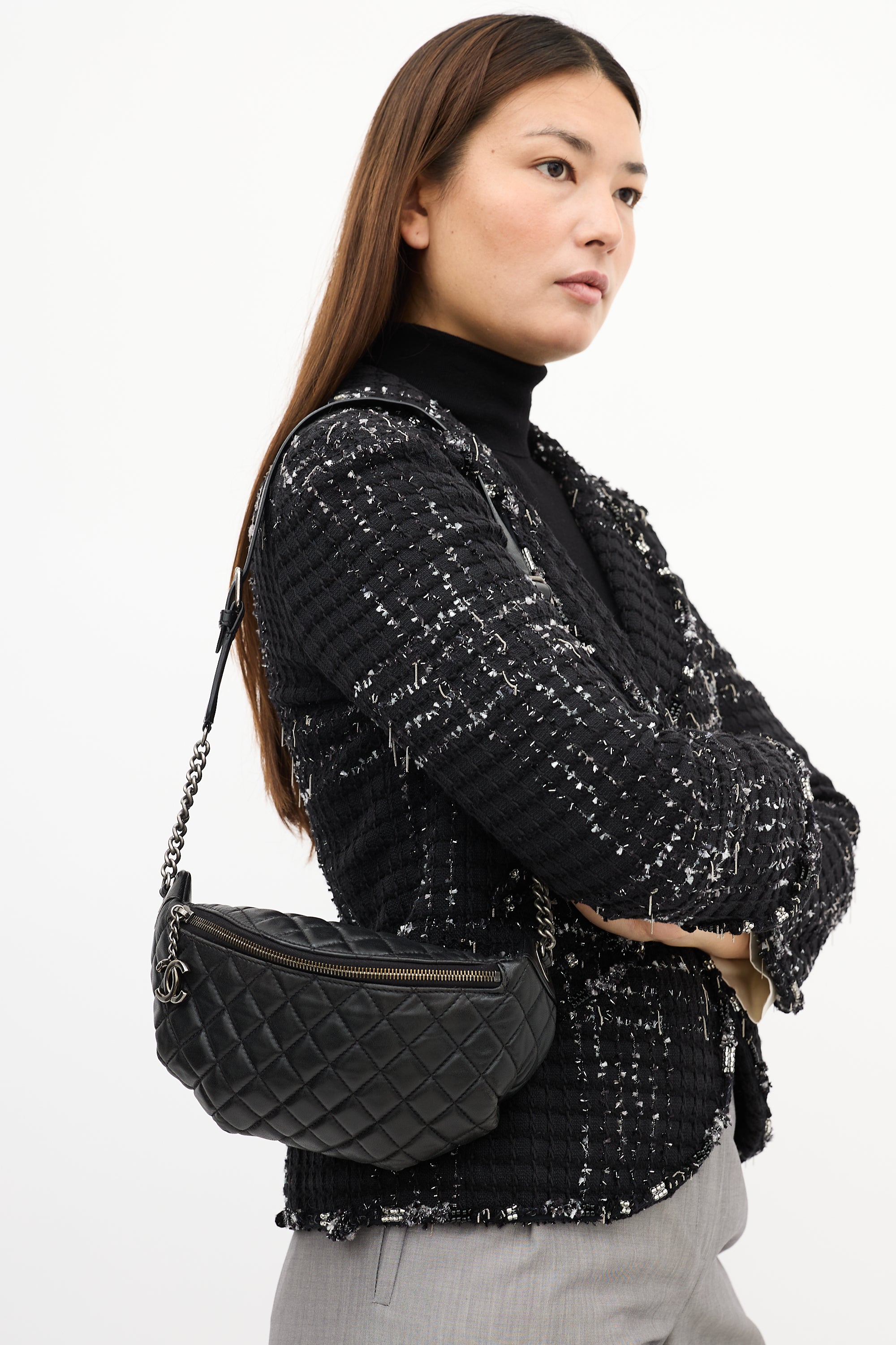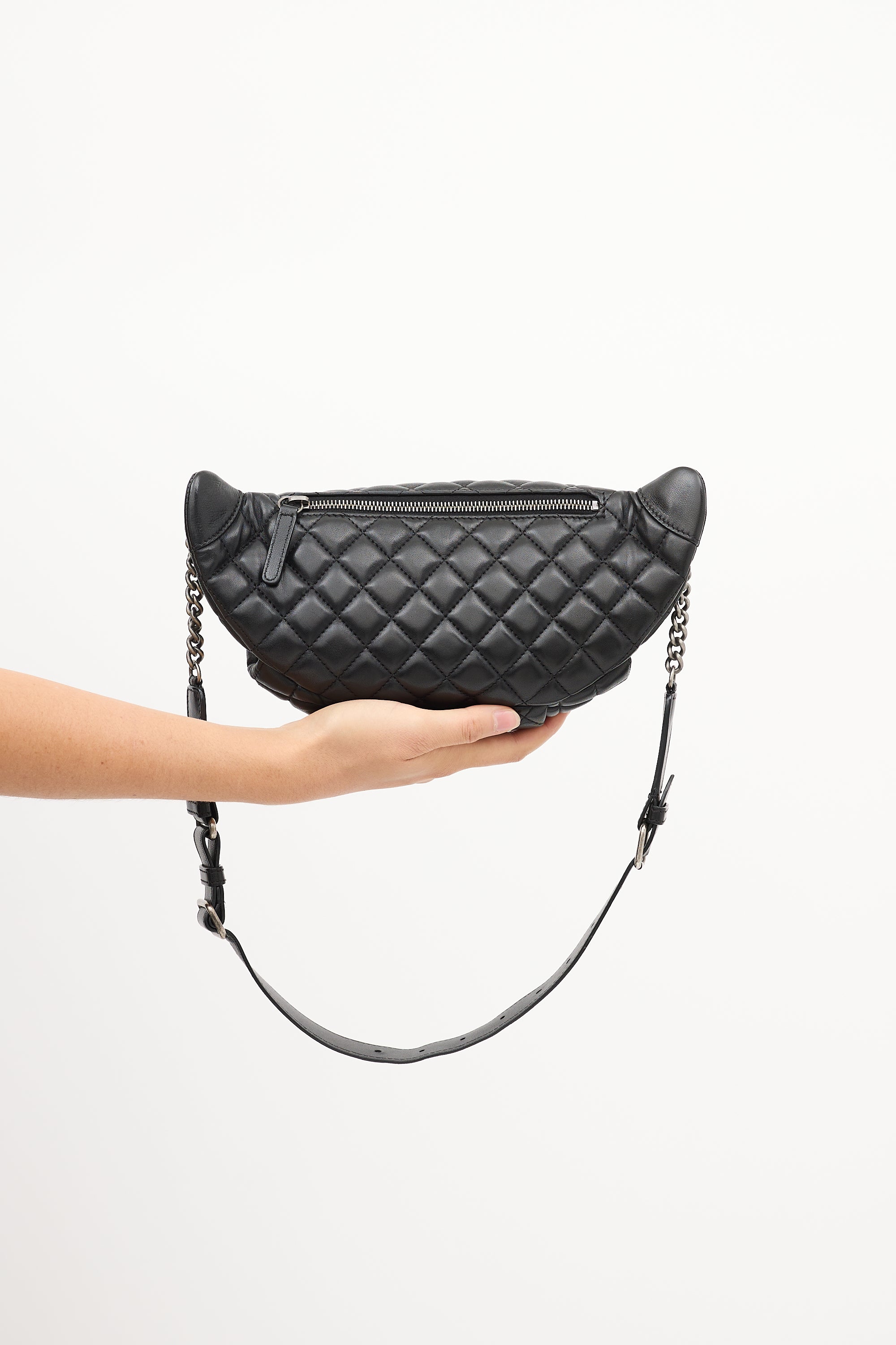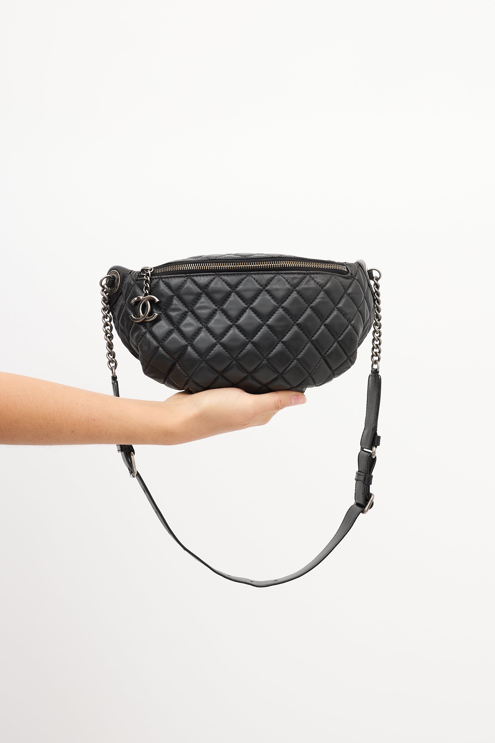 Pre-owned Chanel 2014 black lambskin leather Banane waist bag featuring signature diamond quilt stitching throughout body, Ruthenium aged silver tone hardware, adjustable chain and leather strap, back zip pocket, front zip closure with interlocking CC motif hardware charm at zipper pull, and one lined main compartment with one slip pocket.  From the 2014 Collection by Karl Lagerfeld.
