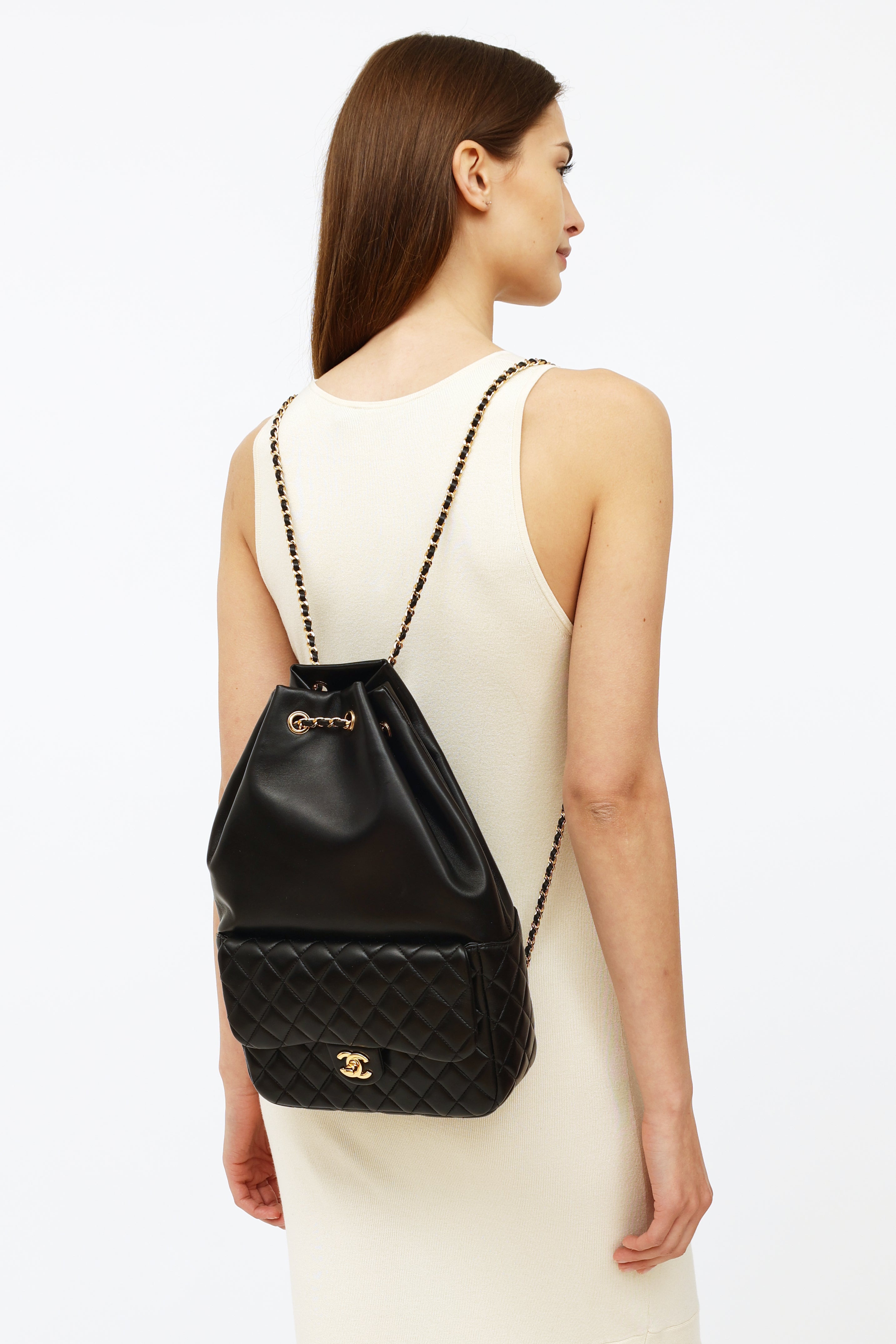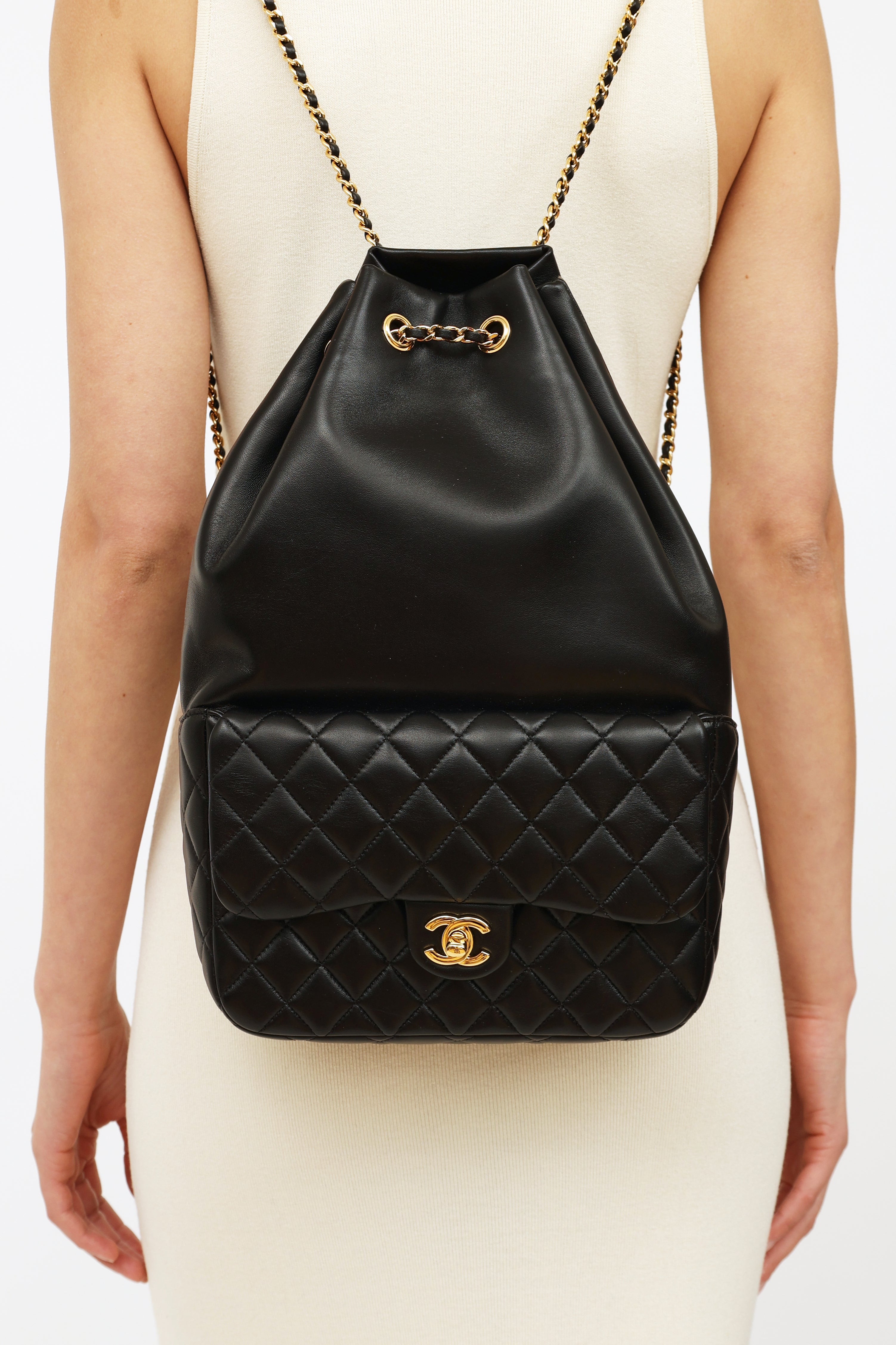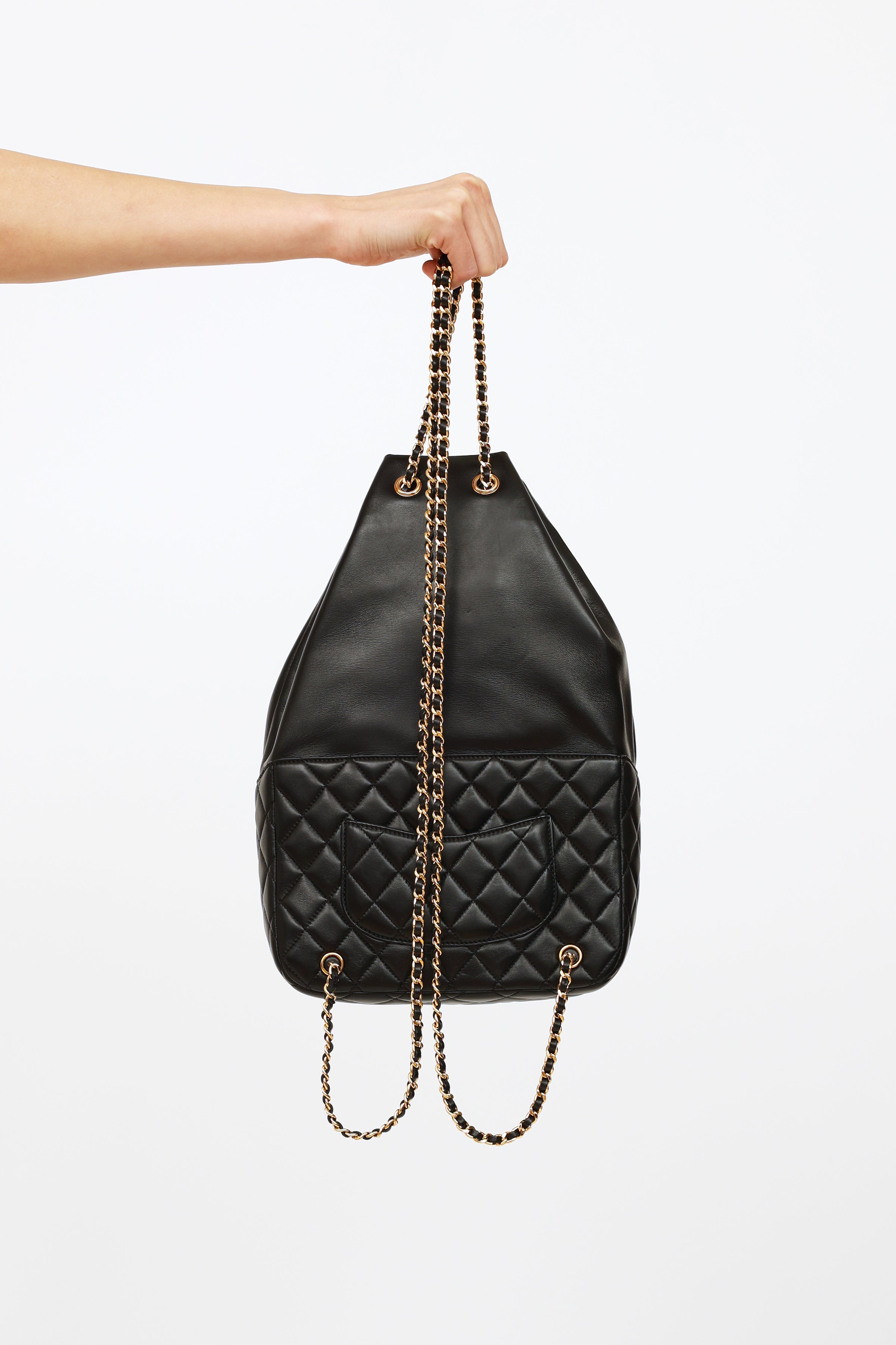Pre-owned Chanel black leather Seoul backpack featuring gold-tone chain-link shoulder straps with woven leather, quilted flap pocket at front with CC twist-lock, quilted flat pocket at back, open-top. Textile lined interior. Series 23, 2016-2017 collection.