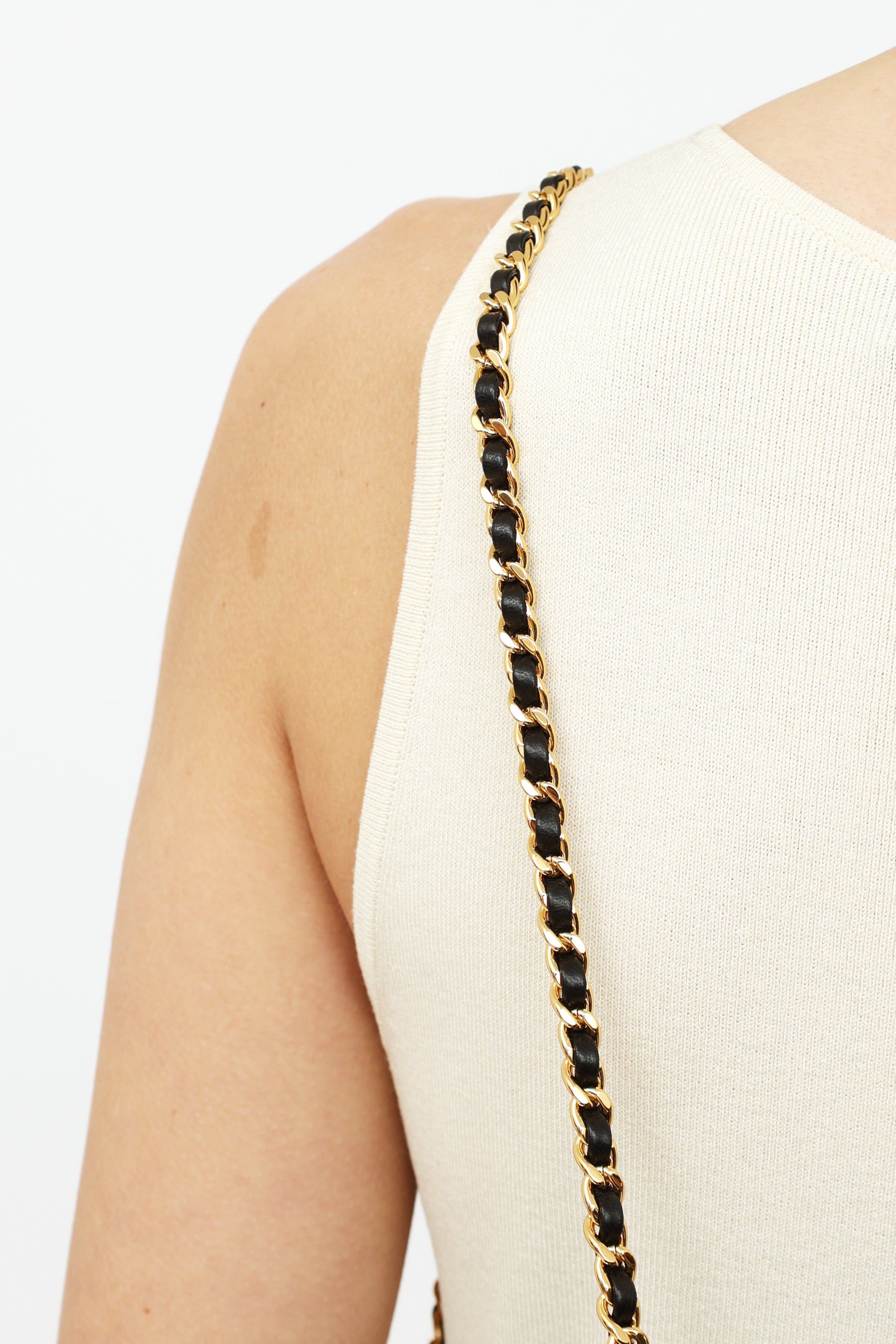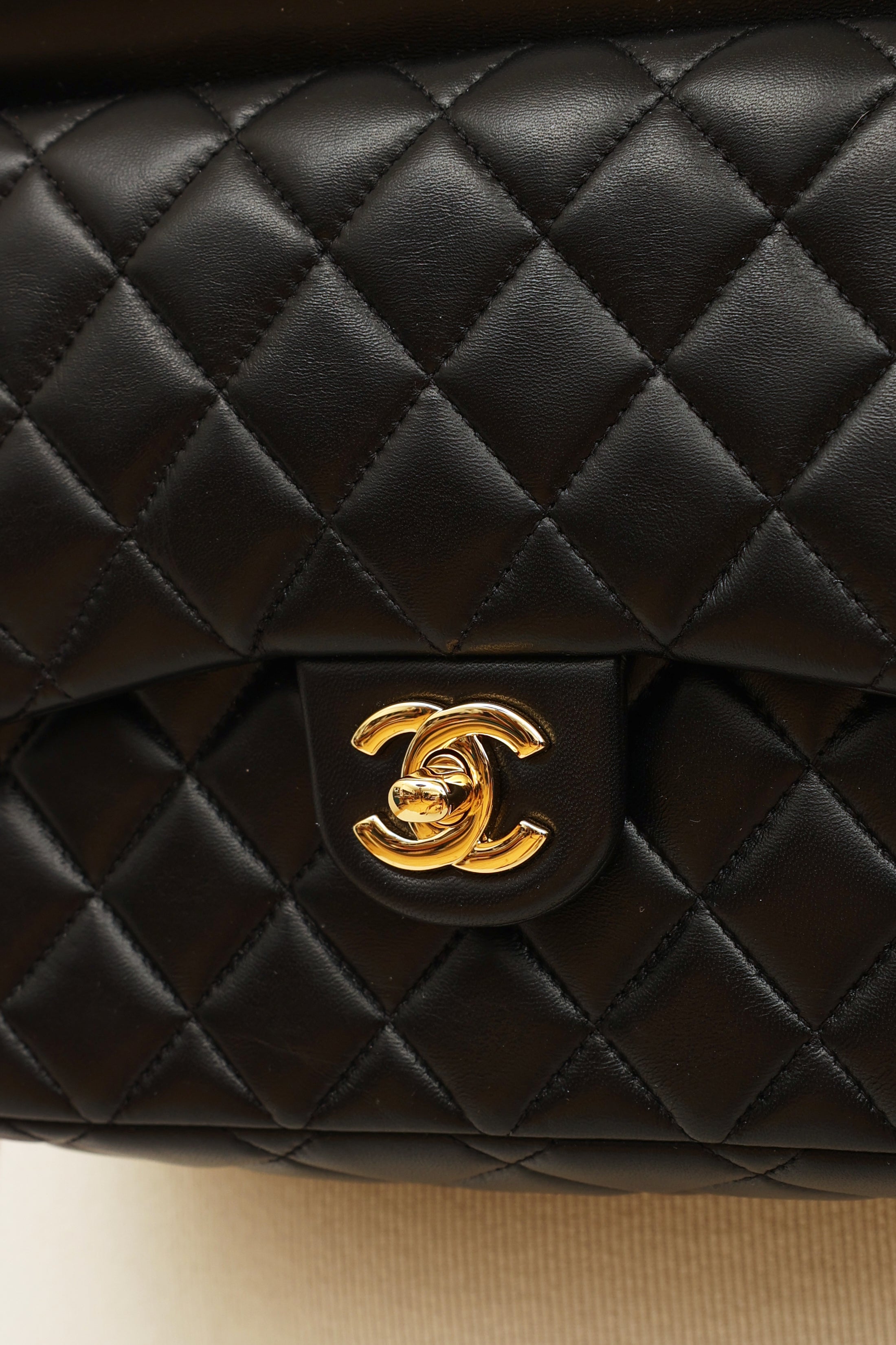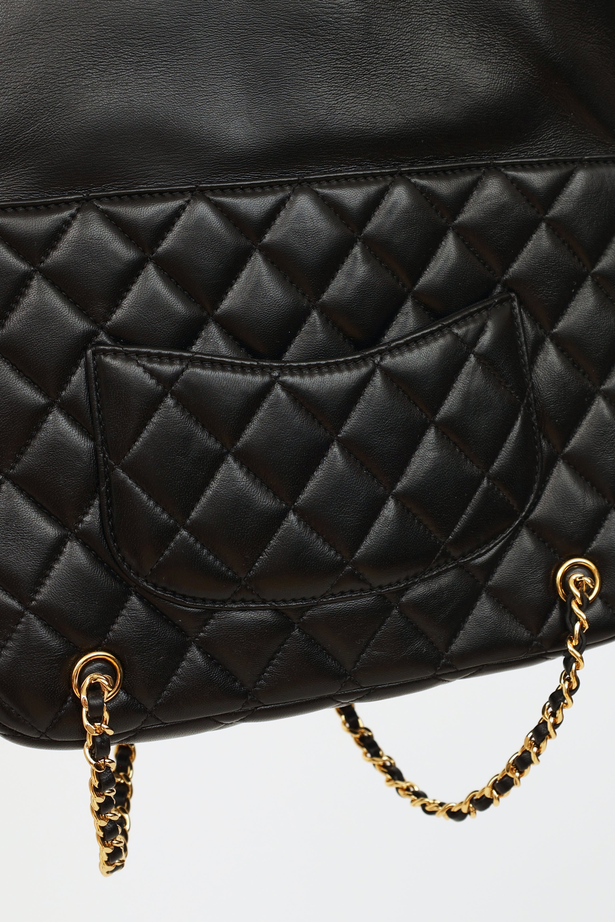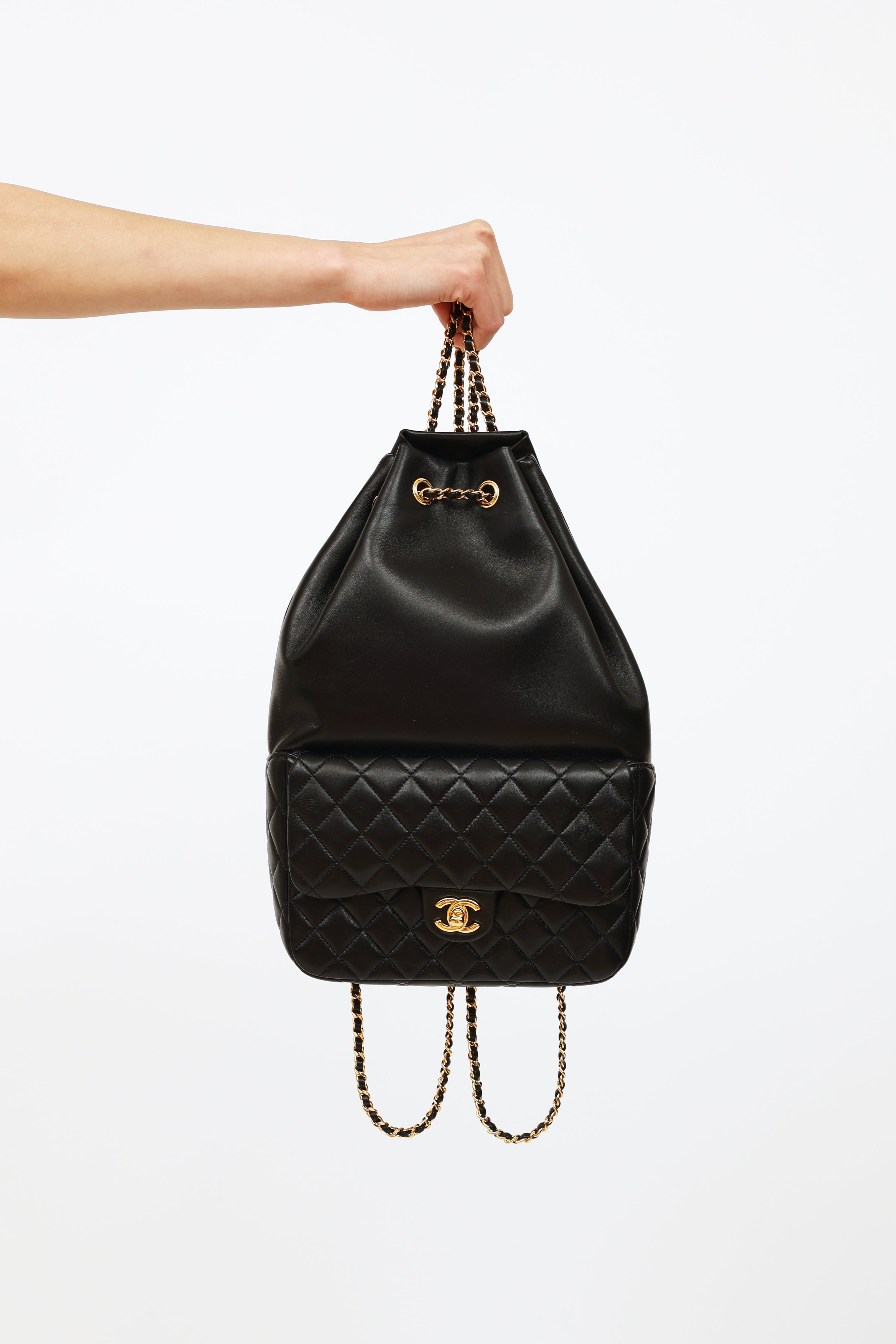 Pre-owned Chanel black leather Seoul backpack featuring gold-tone chain-link shoulder straps with woven leather, quilted flap pocket at front with CC twist-lock, quilted flat pocket at back, open-top. Textile lined interior. Series 23, 2016-2017 collection.