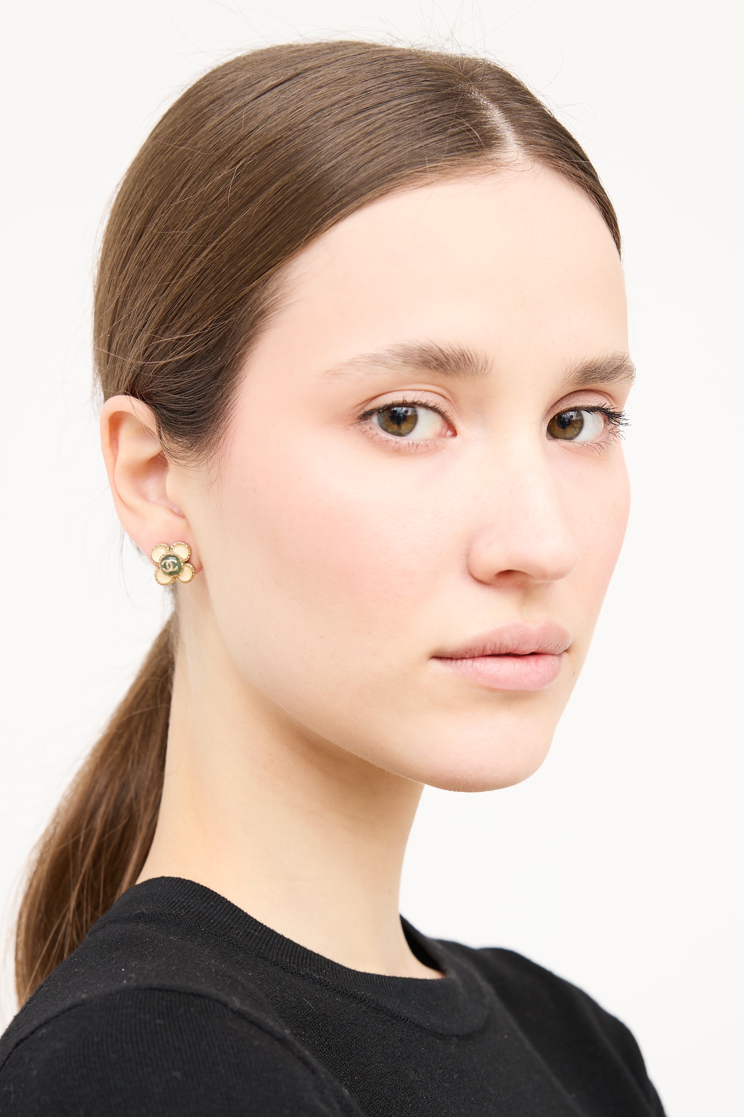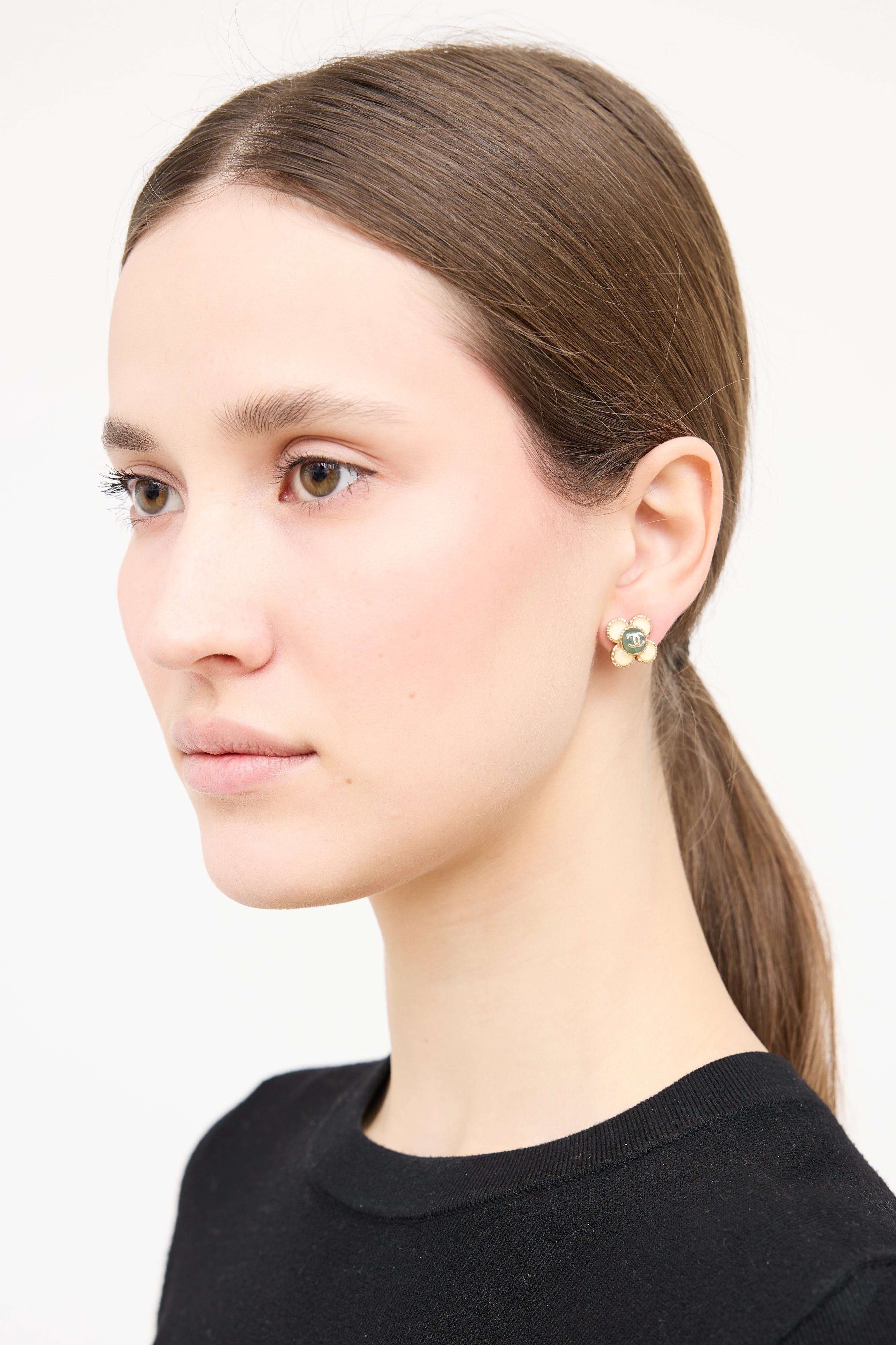 Pre-owned Chanel 2016 Cruise stud earrings featuring flower with green and cream beading, CC detail at centre and push back closure.
