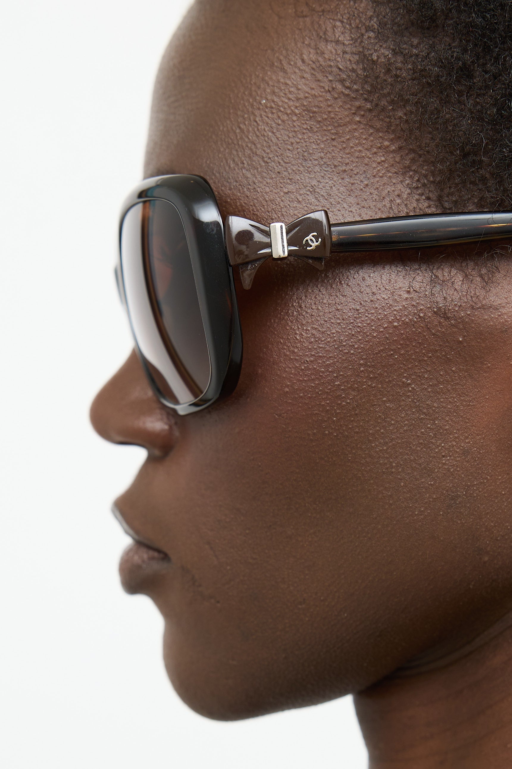 Pre-owned Chanel 5171 sunglasses featuring tortoise round frames, brown gradient lenses, brown bow CC accent at temples.