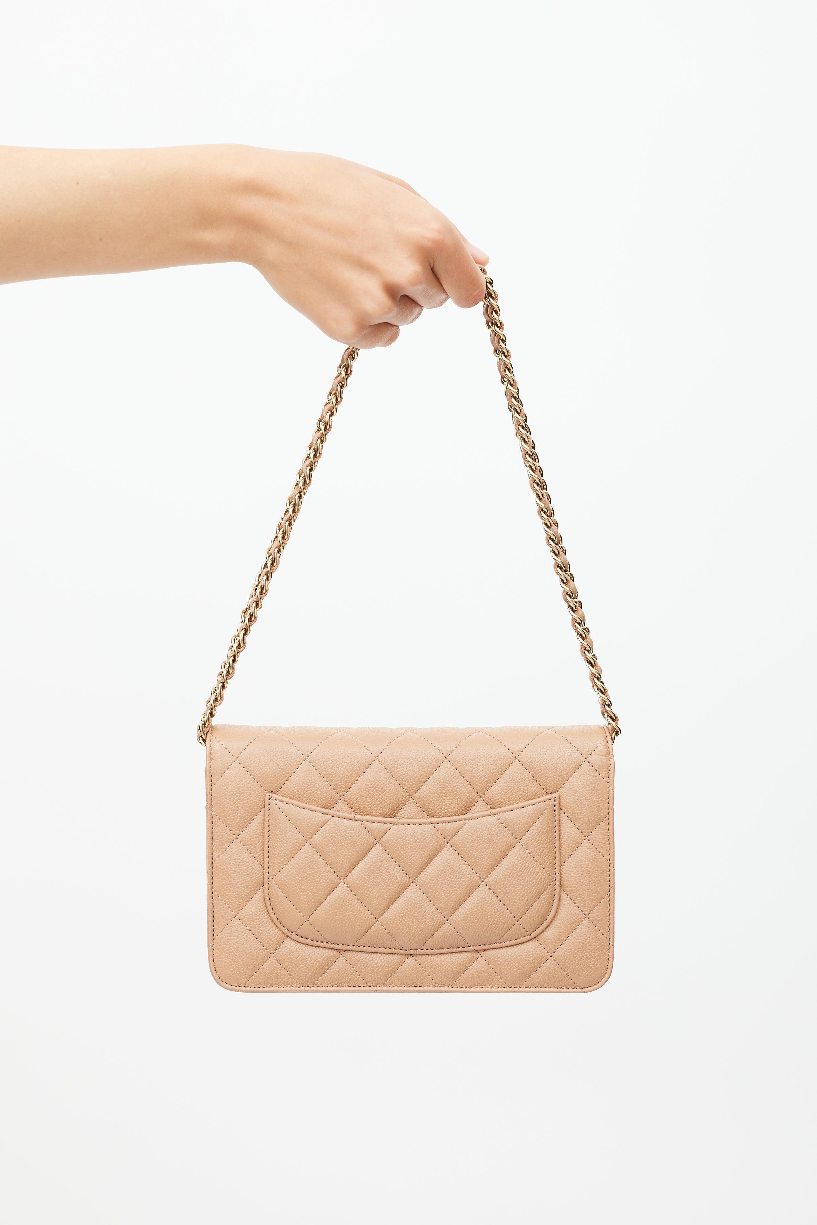 Pre-owned Chanel beige wallet on chain in quilted caviar leather featuring gold tone CC logo hardware at front, top flap with interior zip pocket, one main compartment with zip and slip pockets, six card slots, one slip pocket at back, braided leather and chain shoulder strap, and magnetic snap closure. Comes with brand authentication microchip, original dust bag and box. Original receipt available upon request.