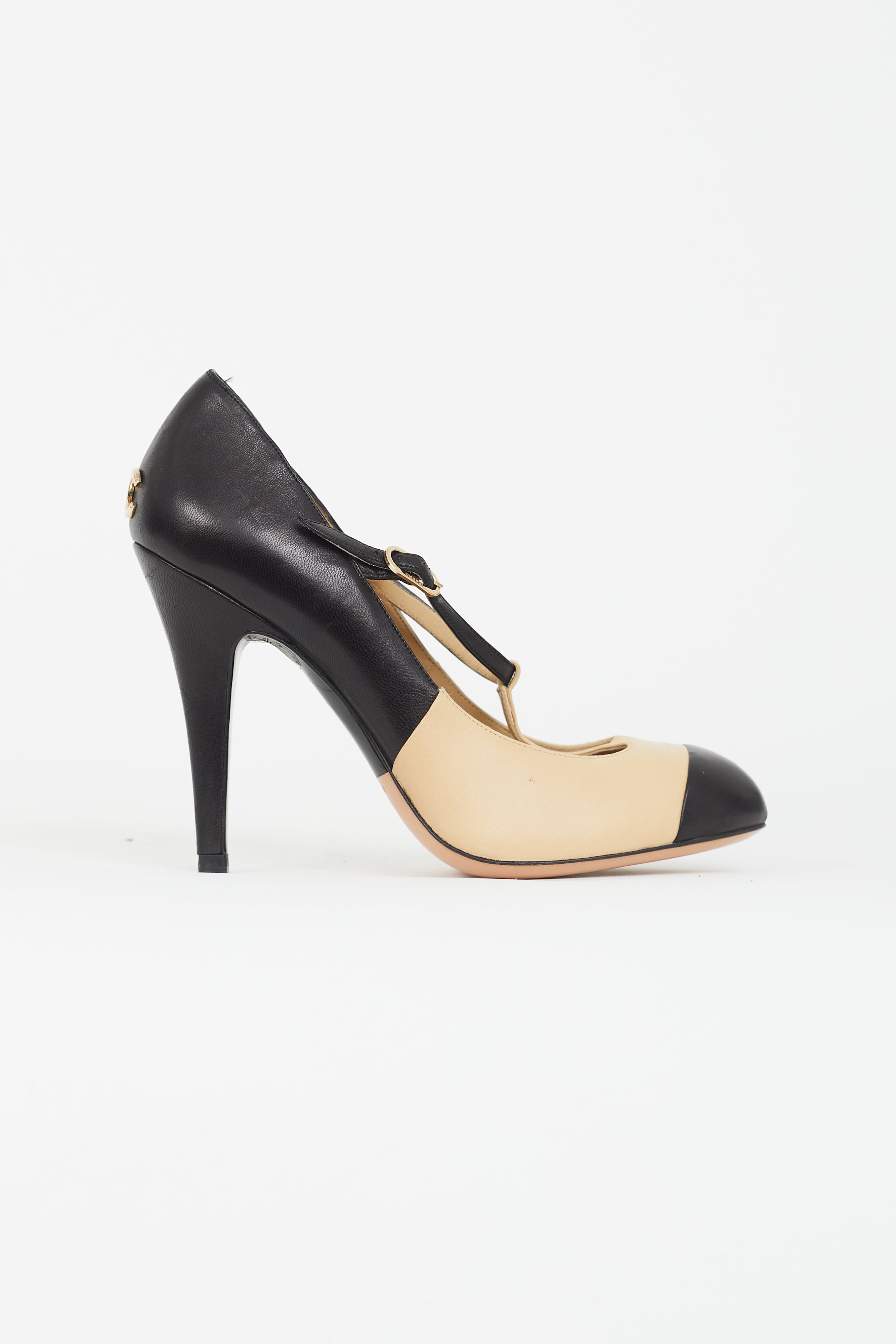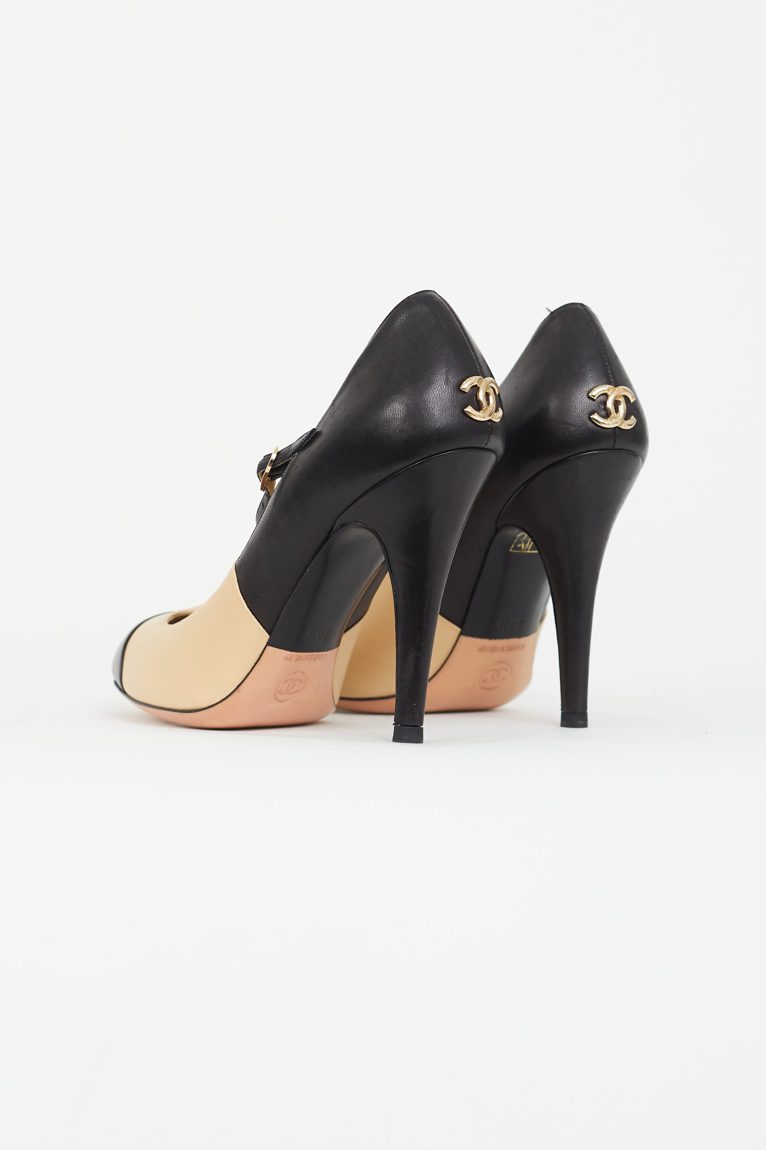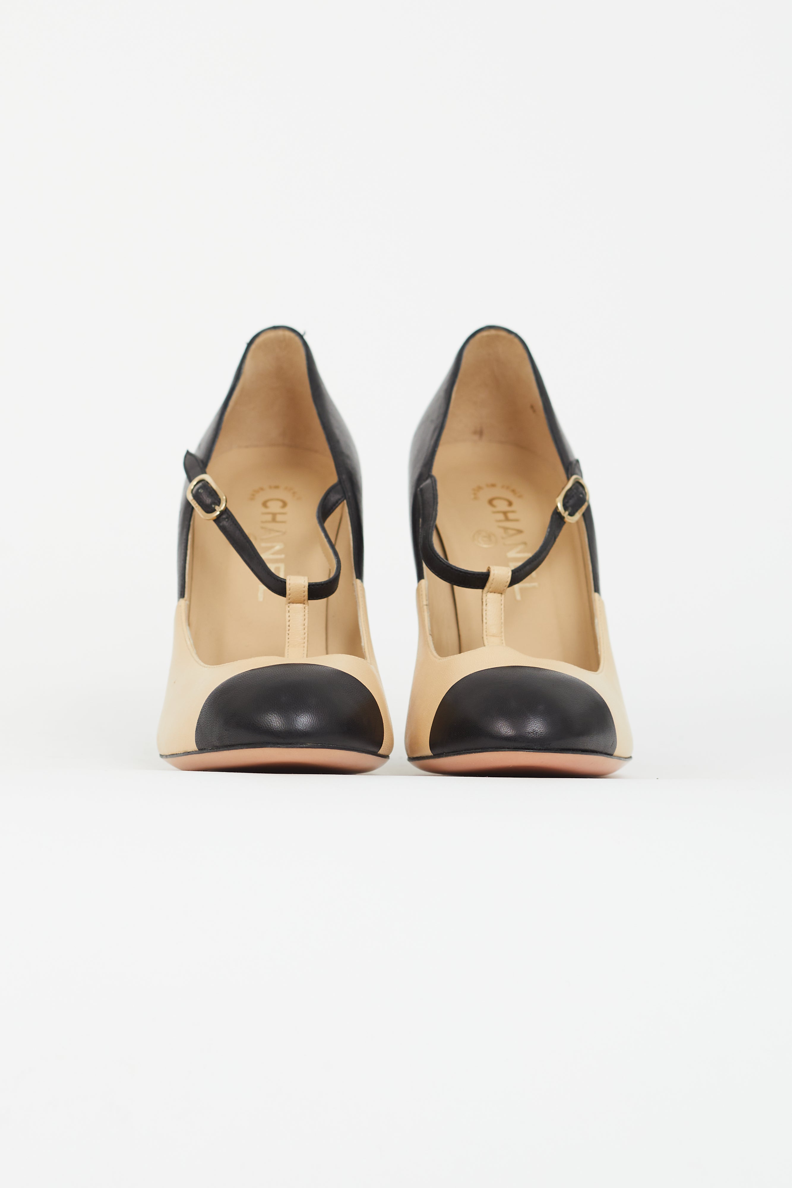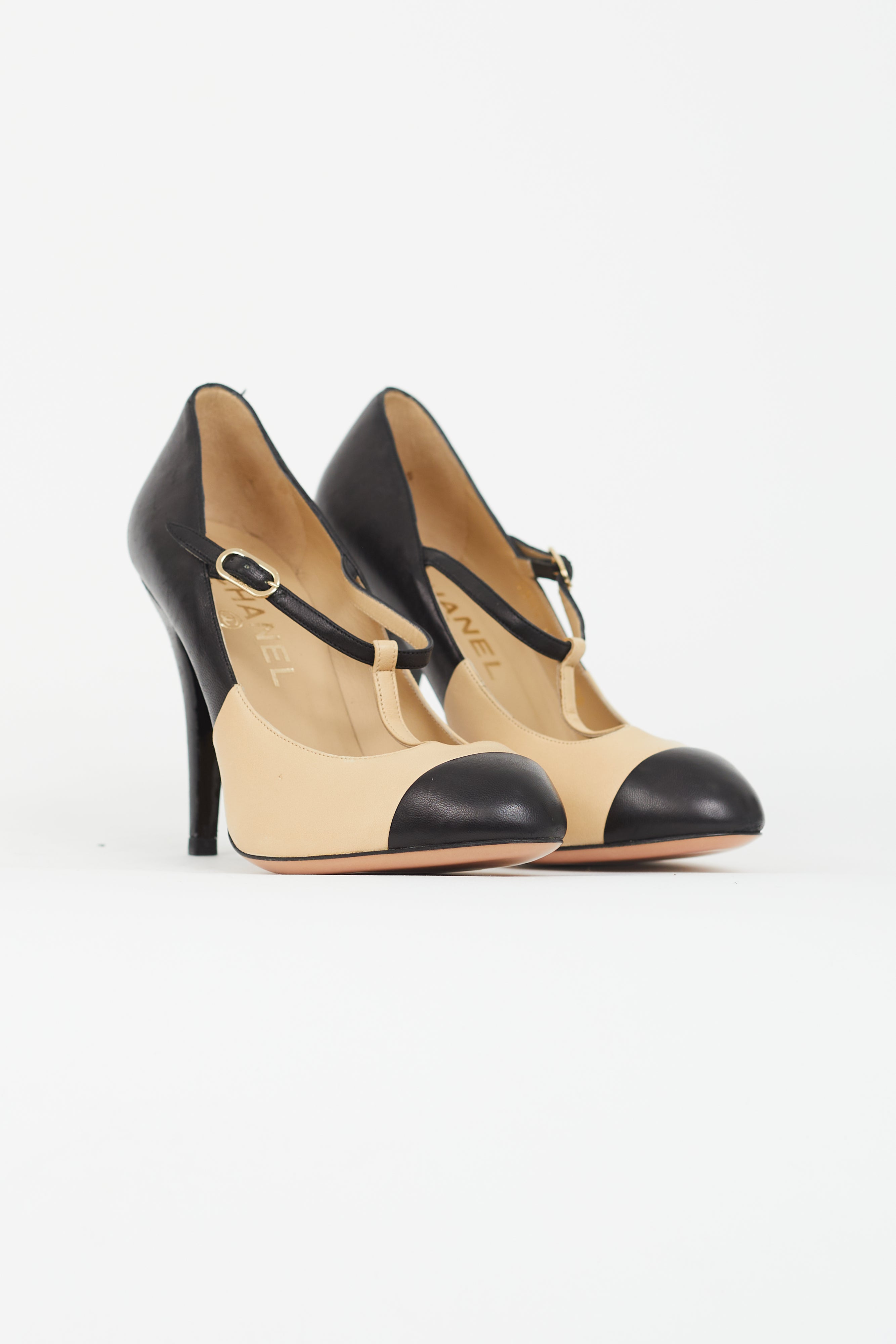 Pre-owned Chanel Mary Jane heel featuring black rounded toe cap, T-strap with buckle fastening, beige leather vamp, black stiletto heel, and gold tone CC logo hardware at back.