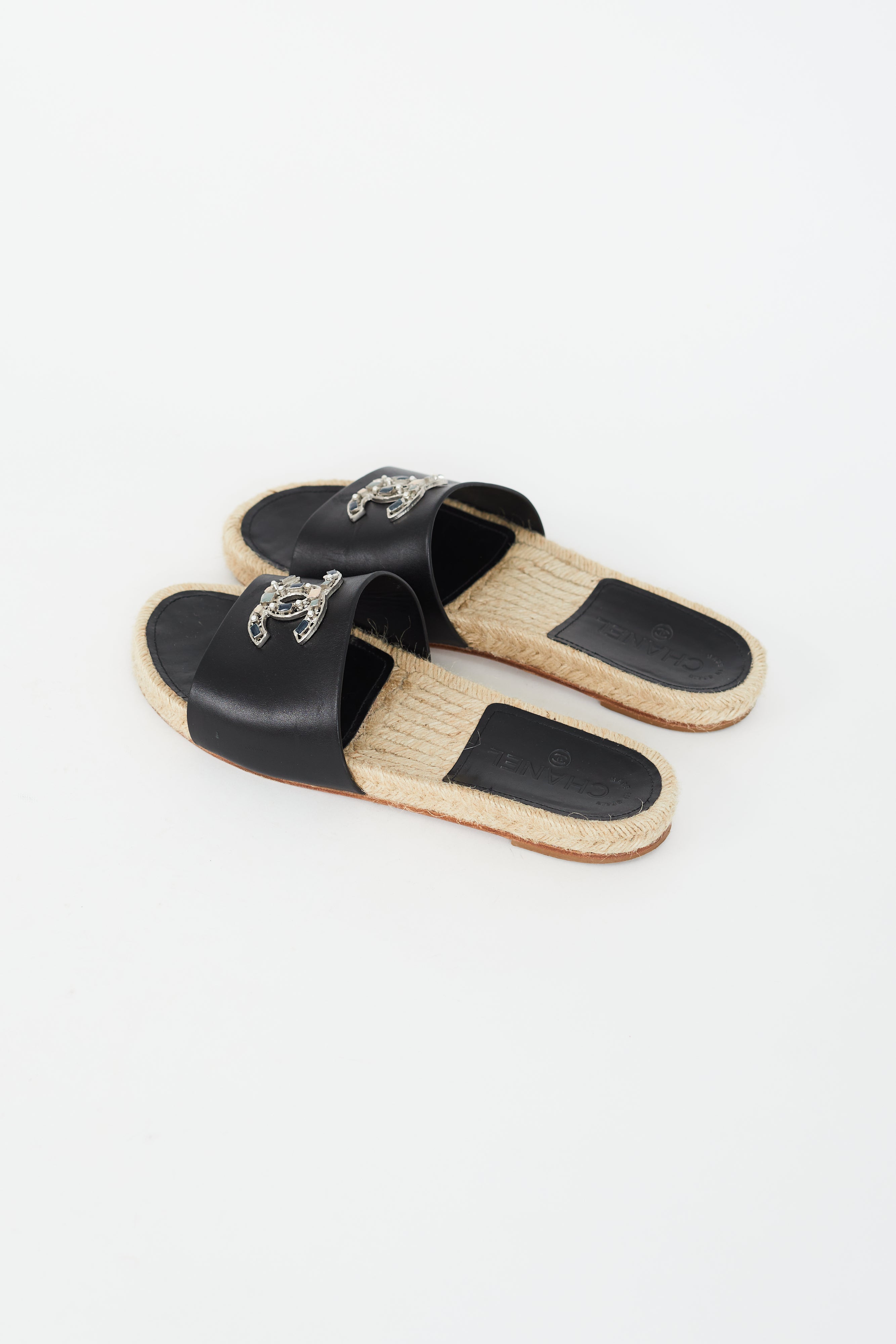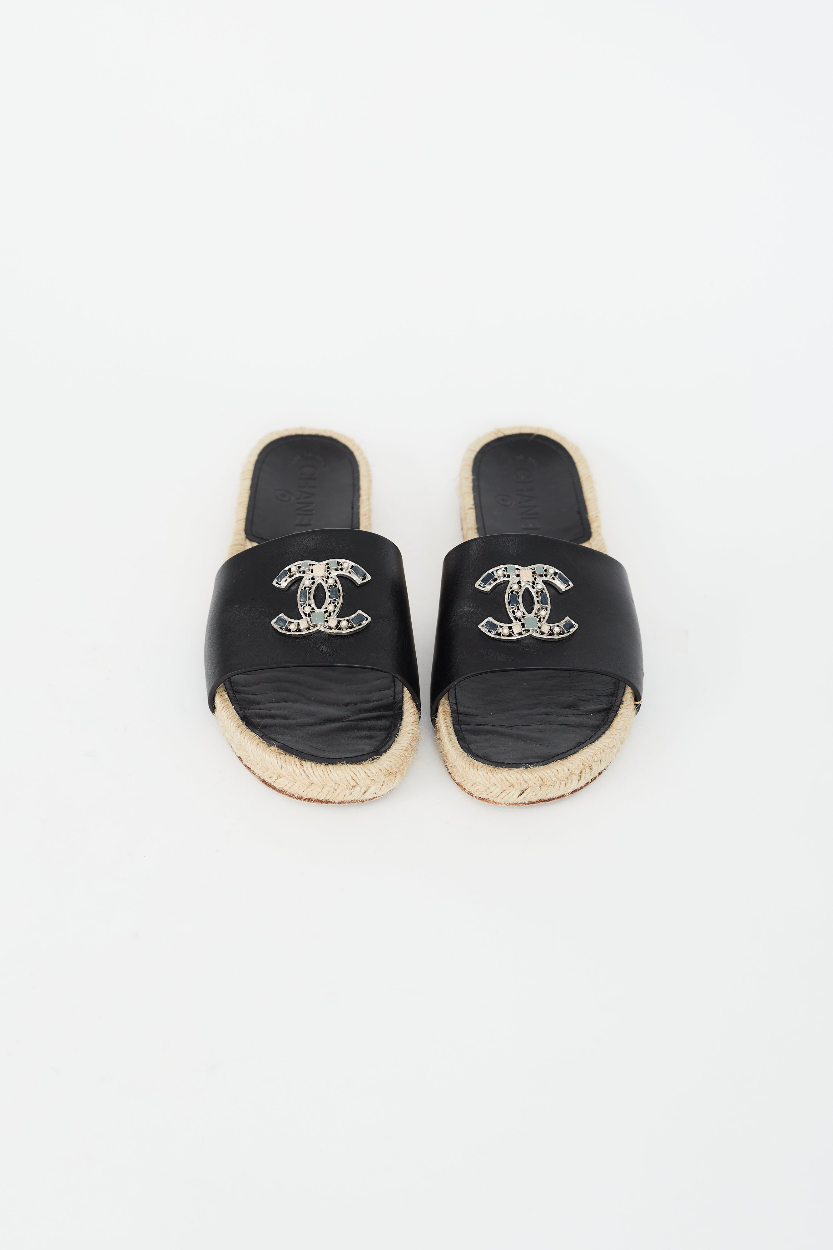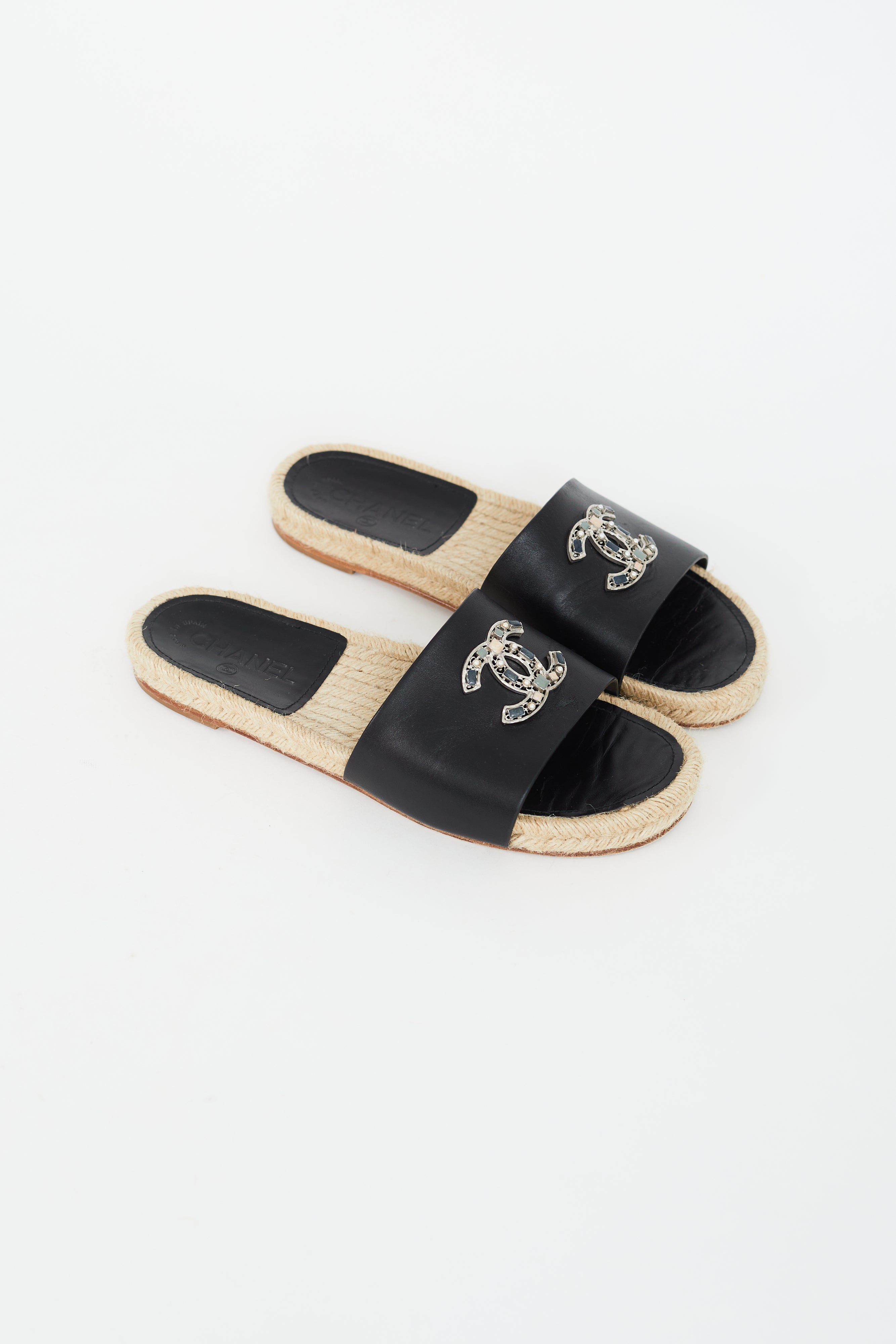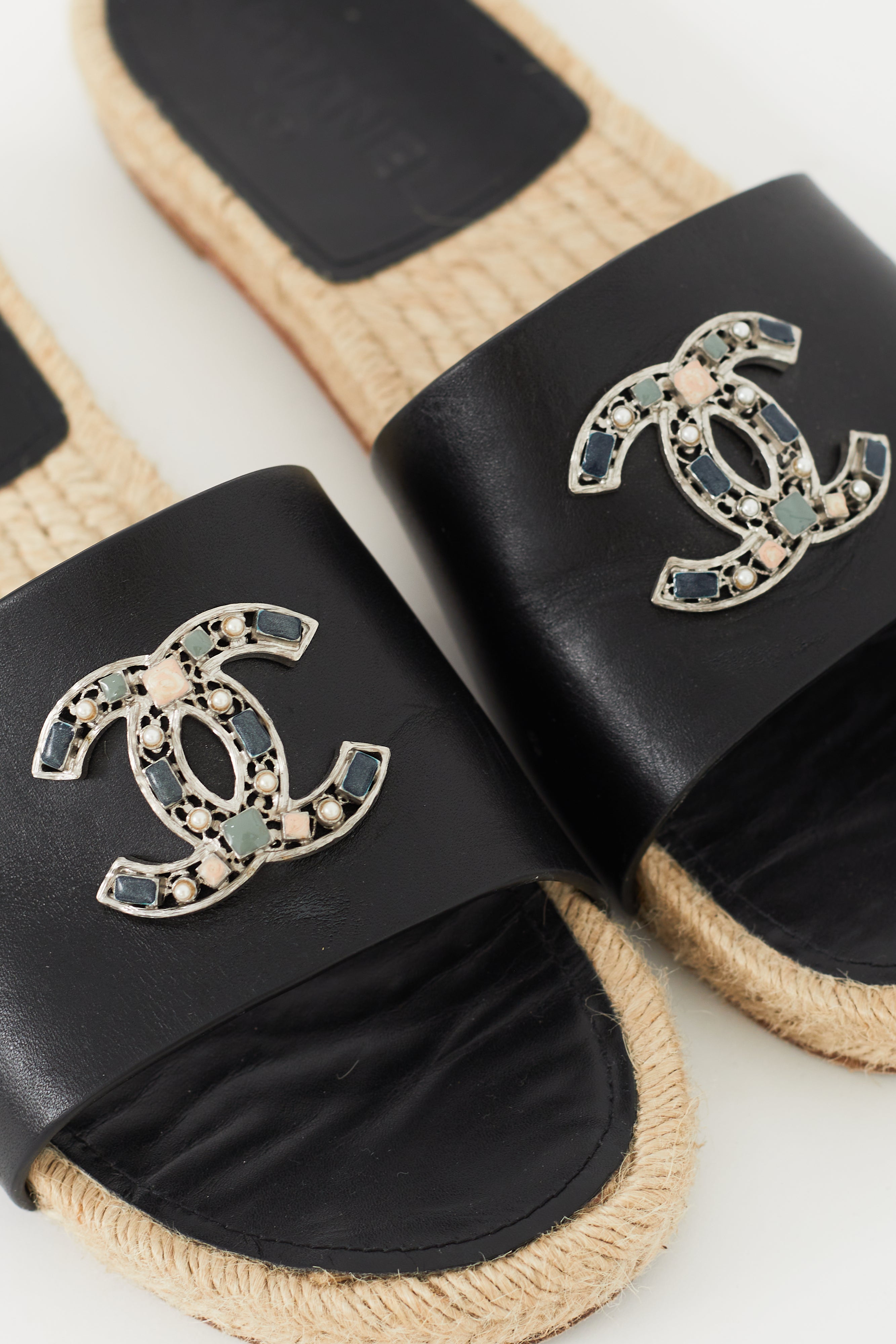 Pre-owned Chanel black espadrilles slides featuring open rounded toe, black leather strap across vamp, multicolor gem embellished CC logo at vamp, and braided trim outsole. Comes with original dust bag.