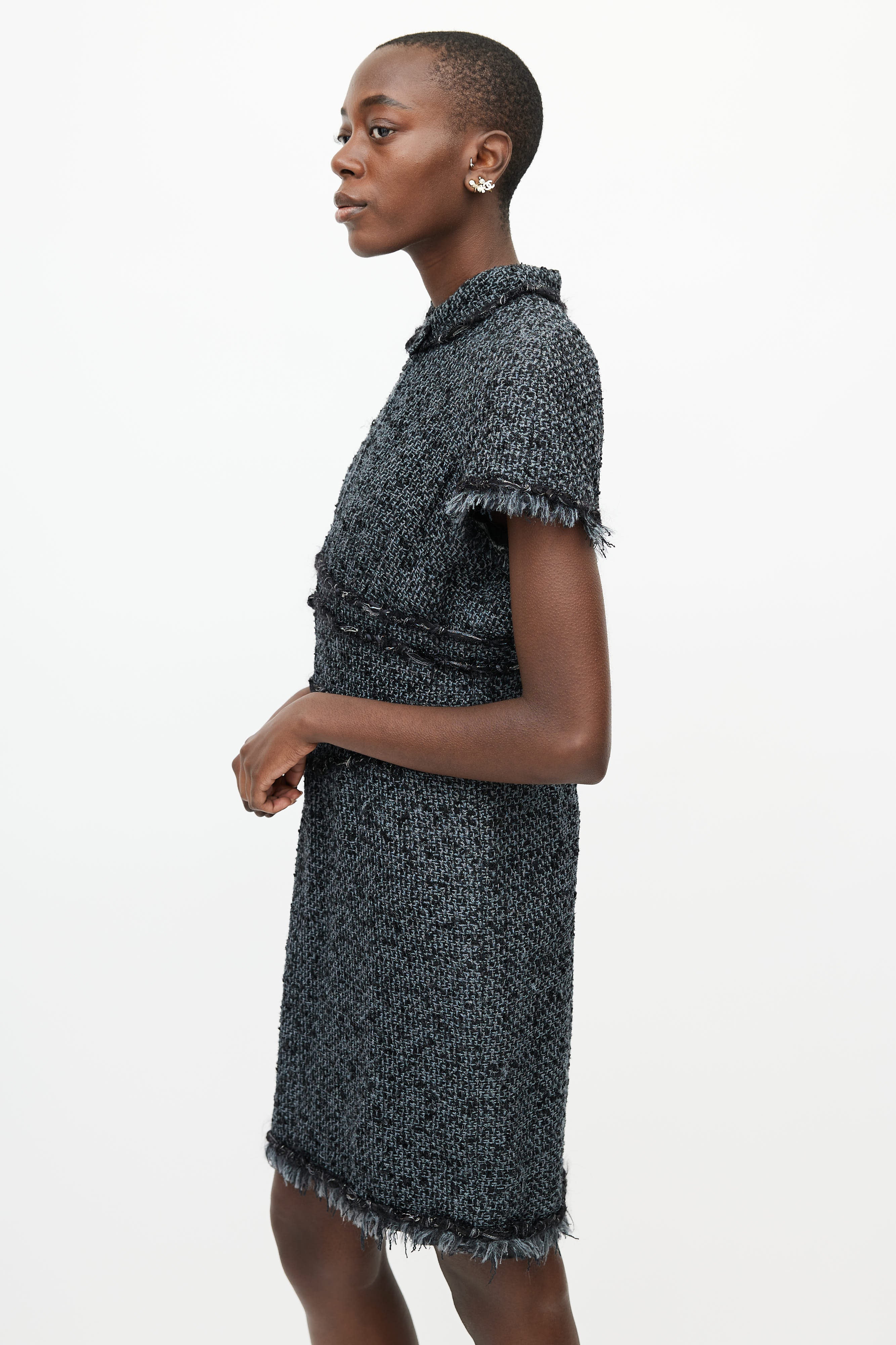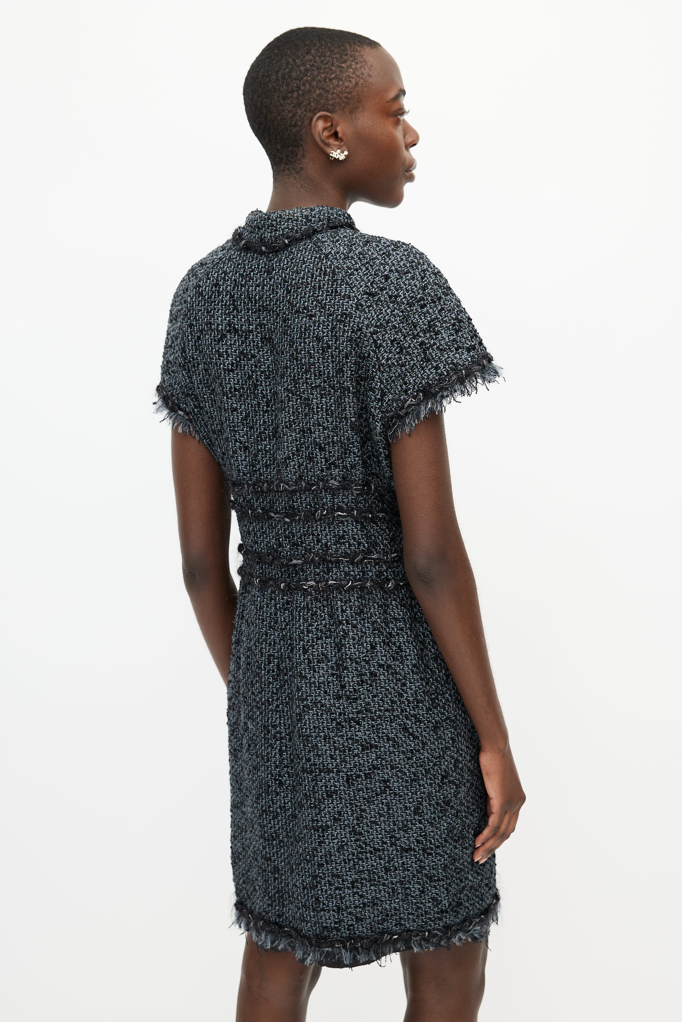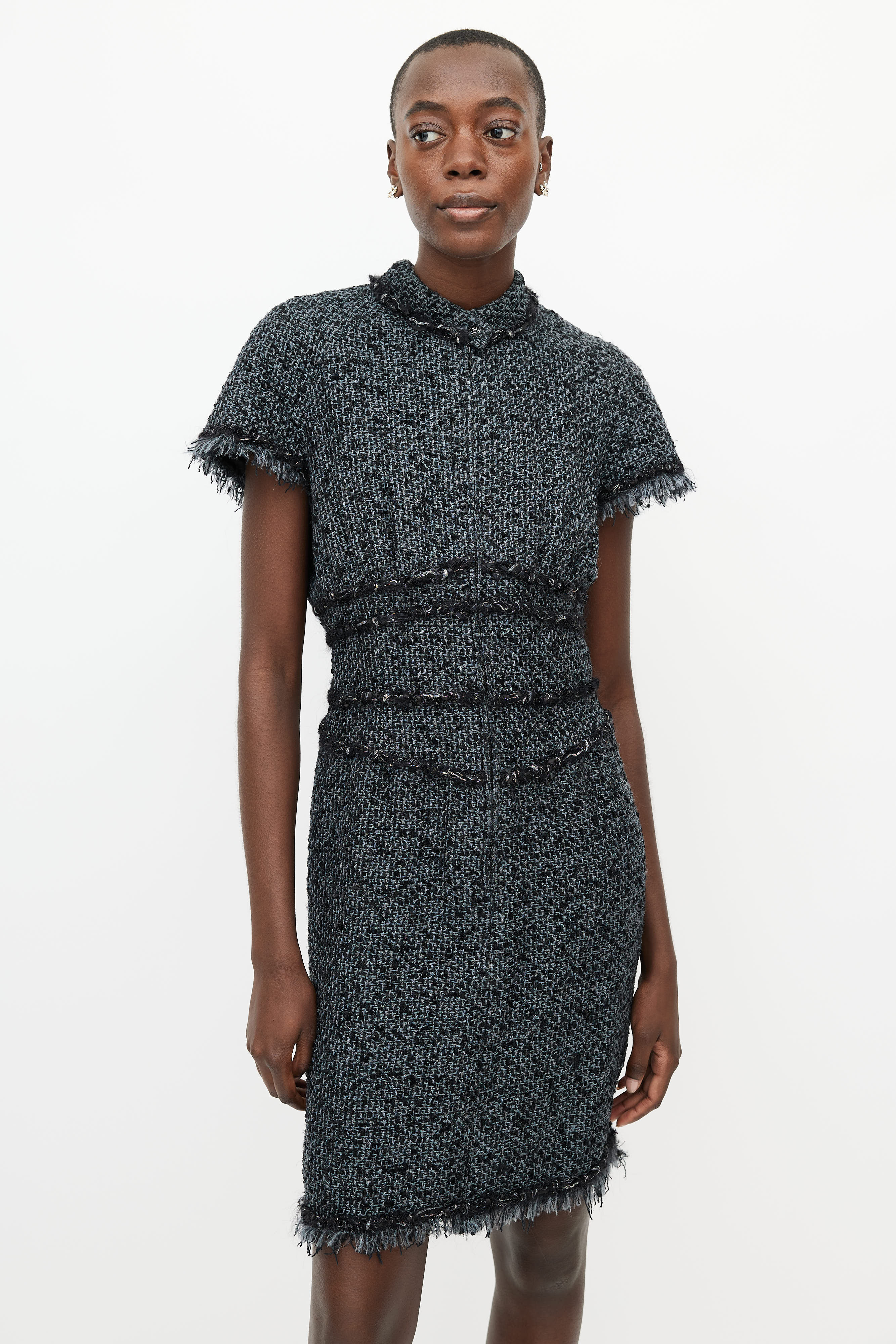 Pre-owned Chanel black and grey tweed dress featuring a mock neck collar, cap sleeves, tonal knotted trim at front and back, and a concealed zip at front with button closure. Lined. Clipped to fit model.