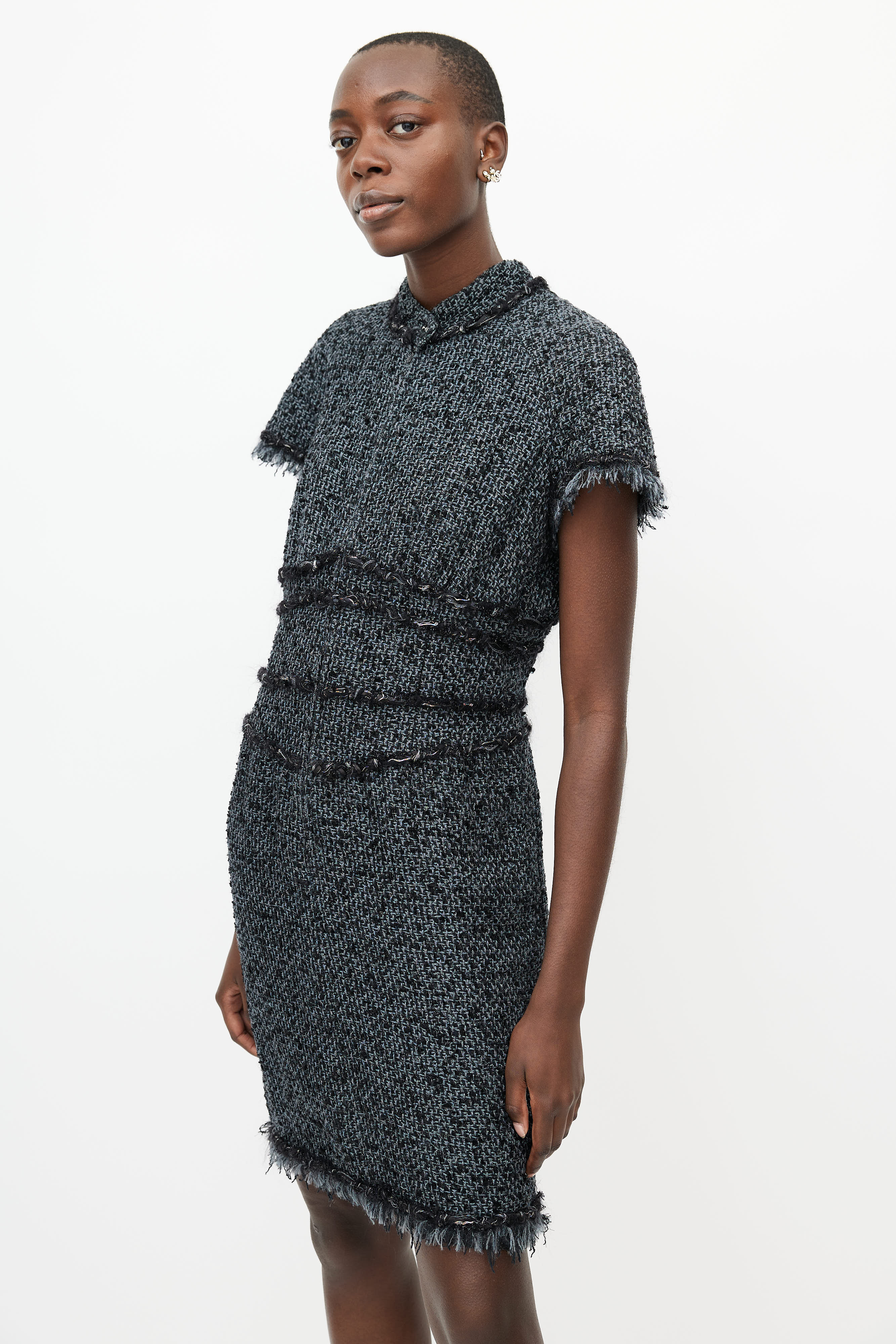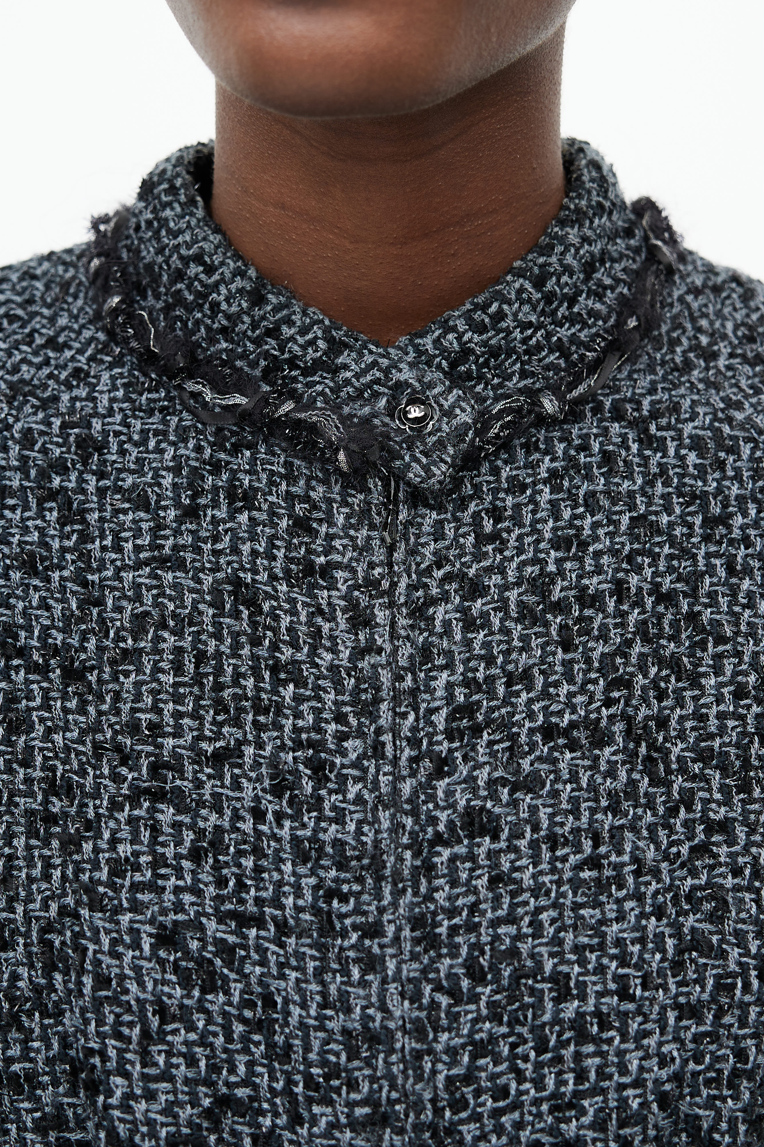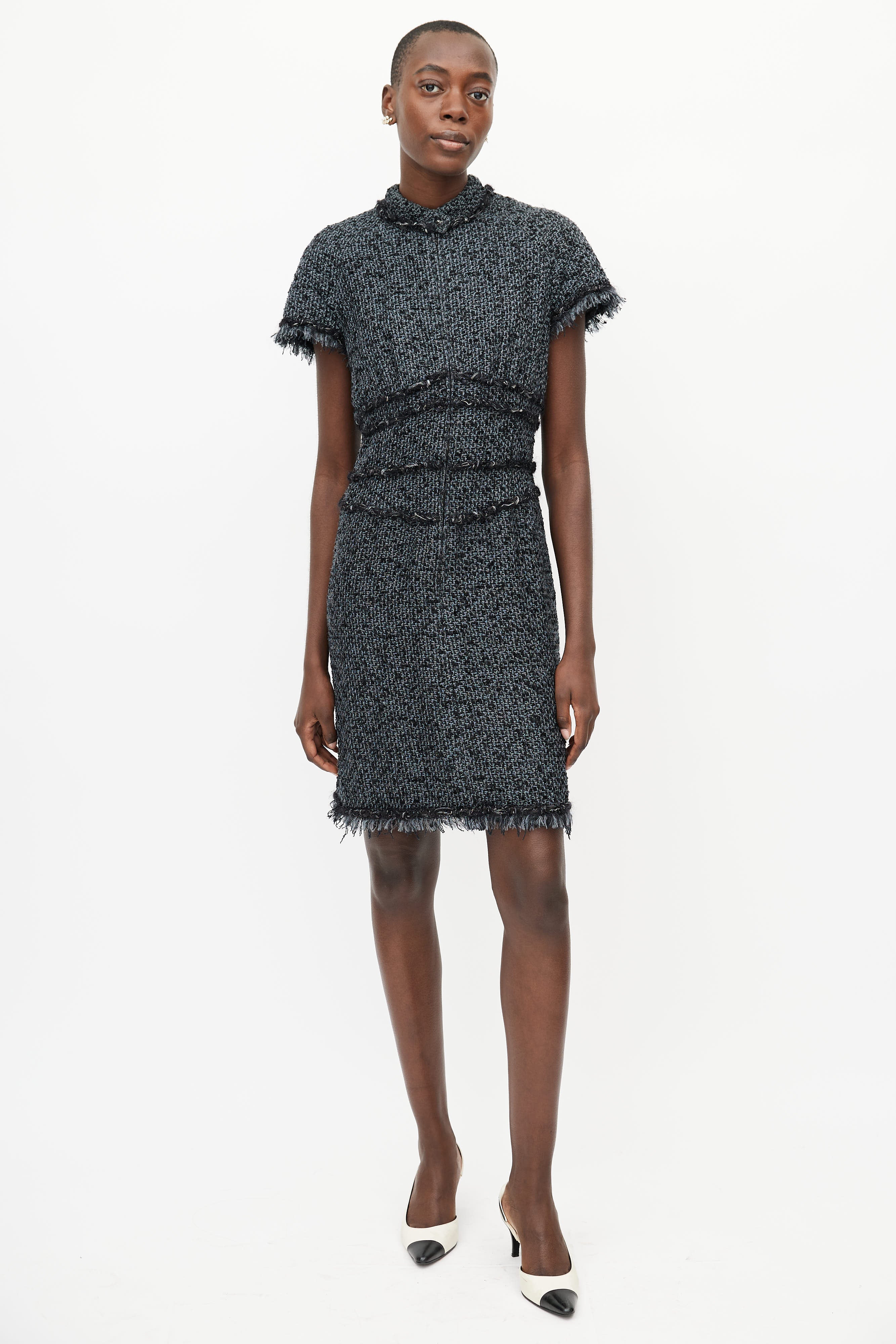 Pre-owned Chanel black and grey tweed dress featuring a mock neck collar, cap sleeves, tonal knotted trim at front and back, and a concealed zip at front with button closure. Lined. Clipped to fit model.