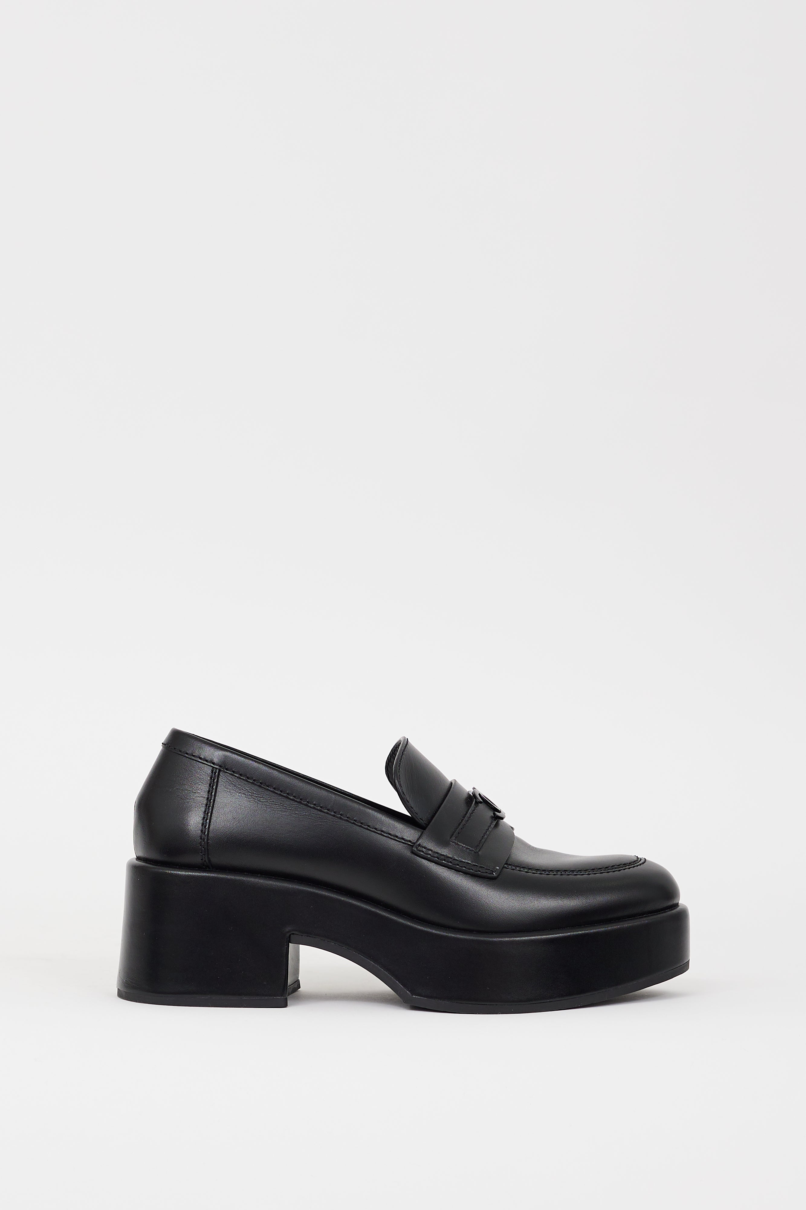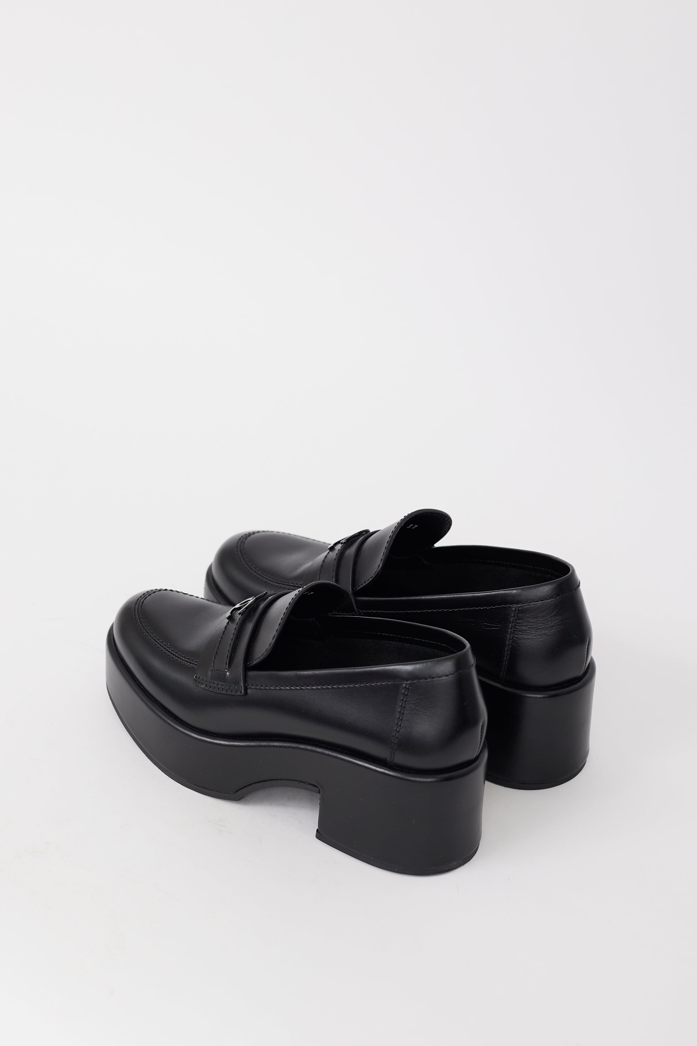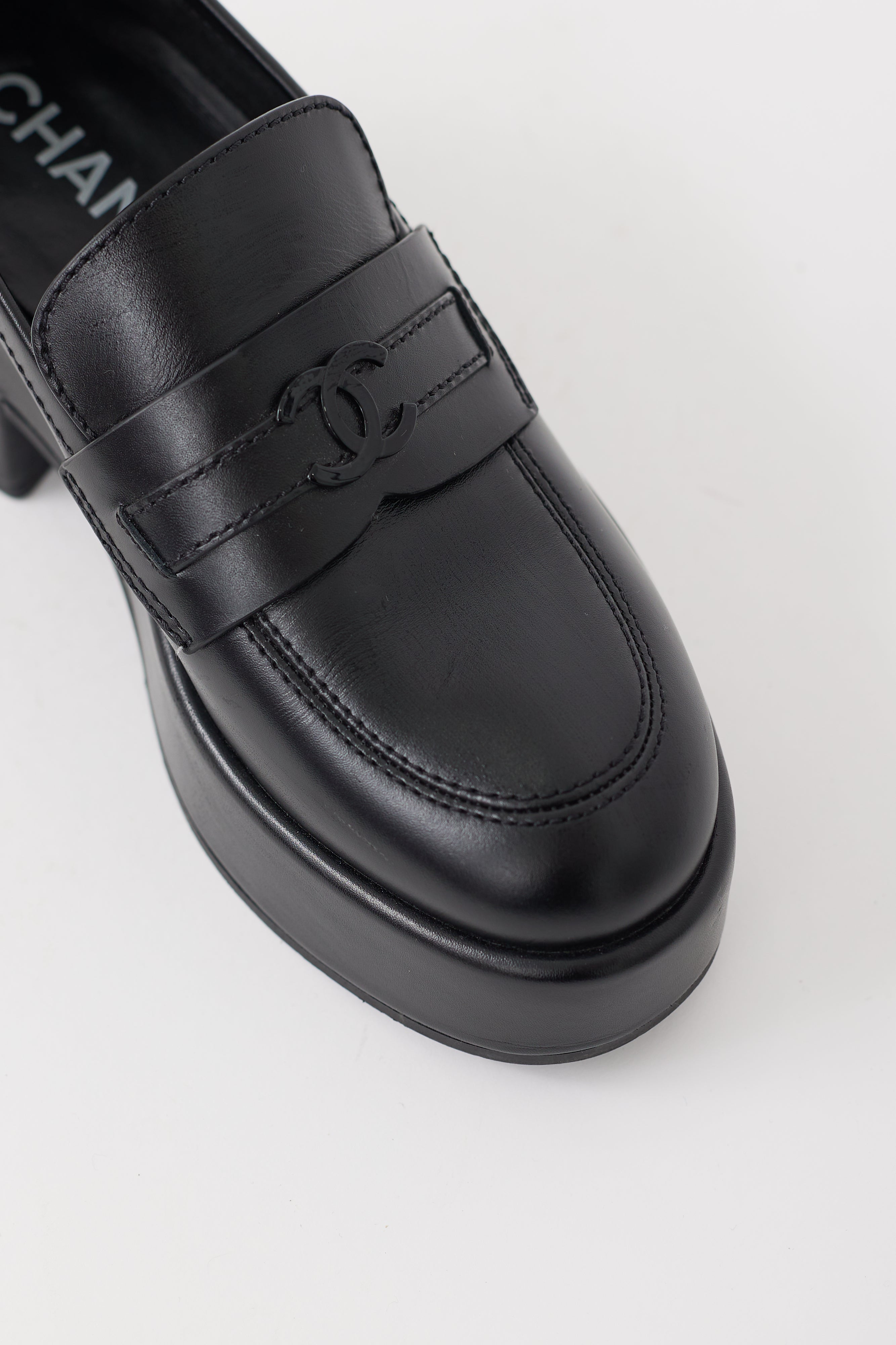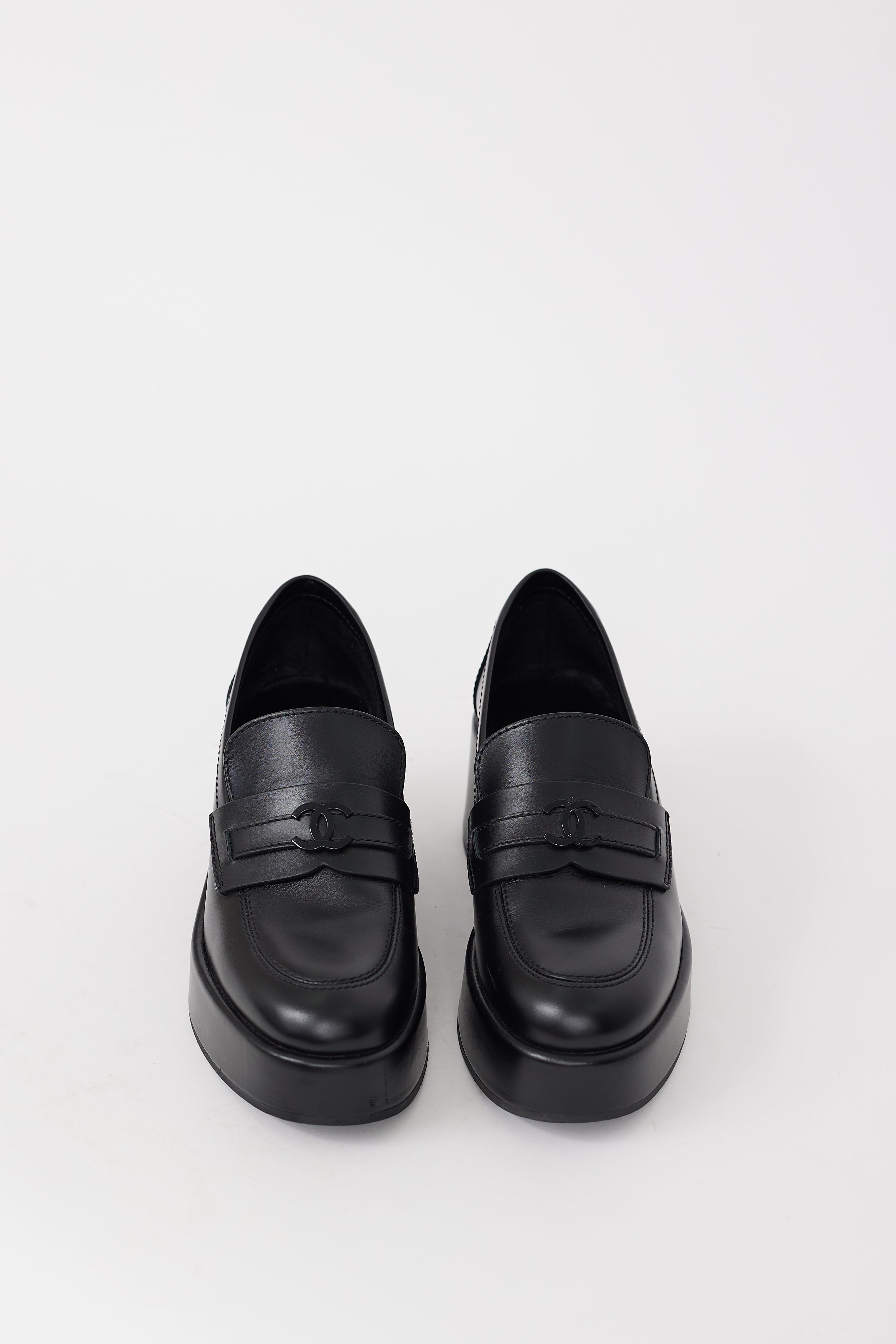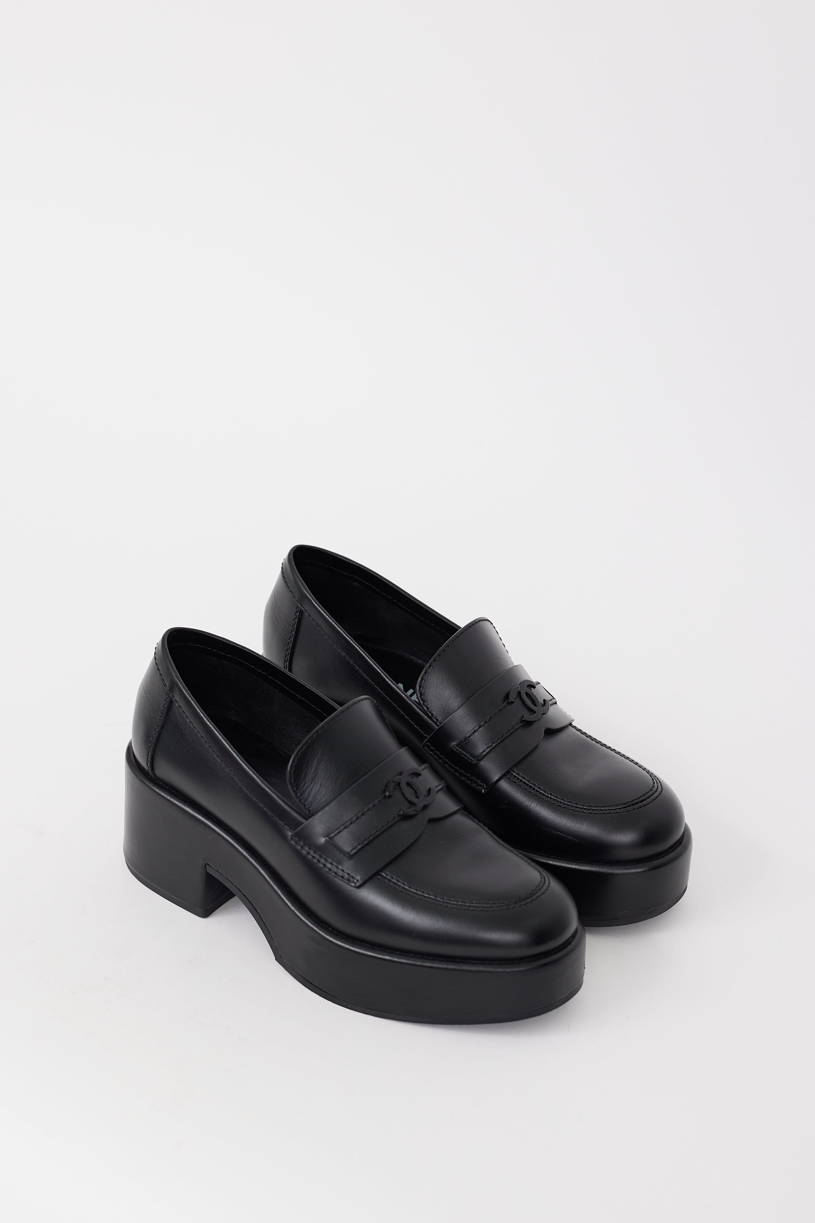Pre-owned Chanel black leather loafers featuring a rounded toe, platform sole, tonal CC logo hardware at vamp, and wrapped block sole. Comes with original dust bag.
