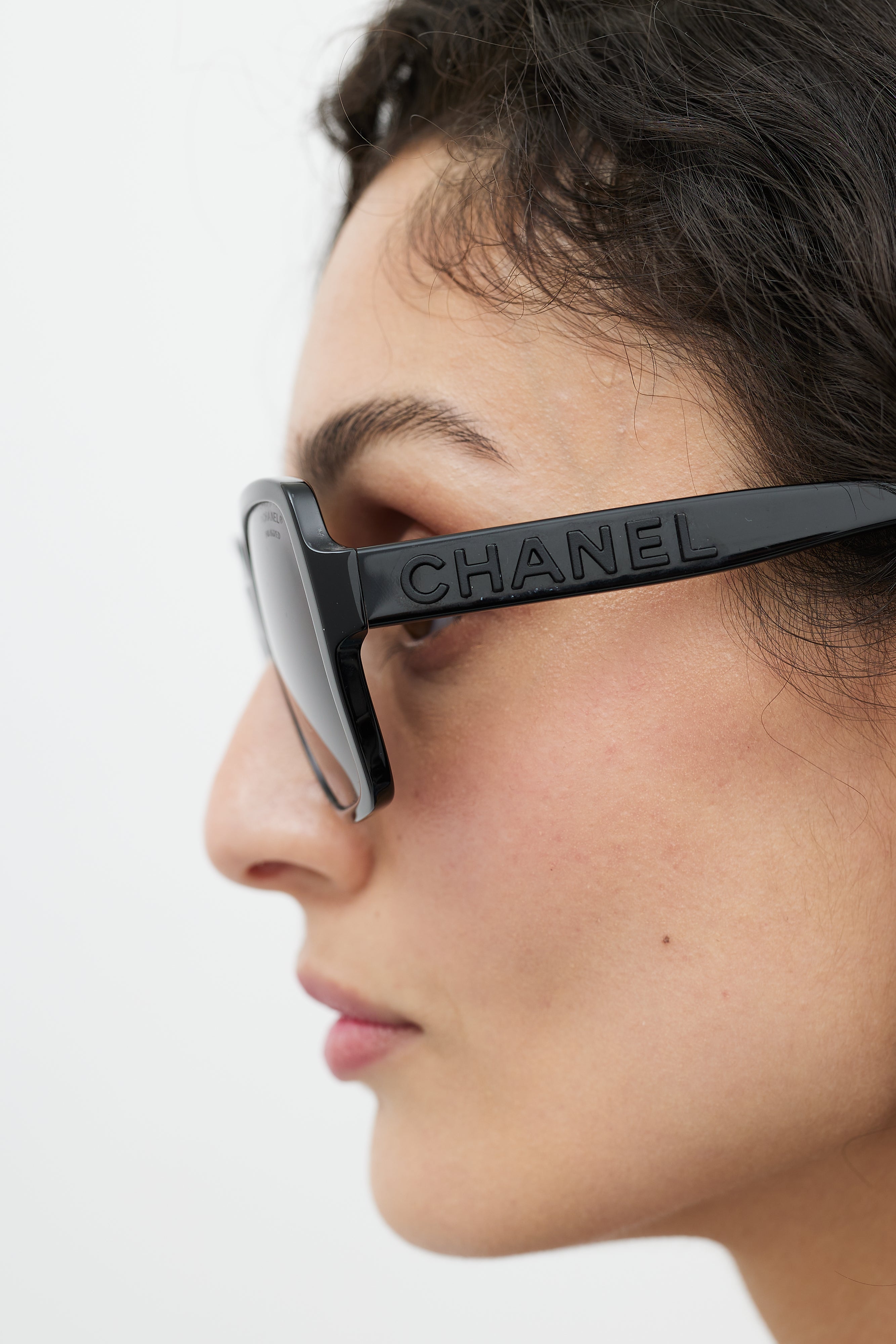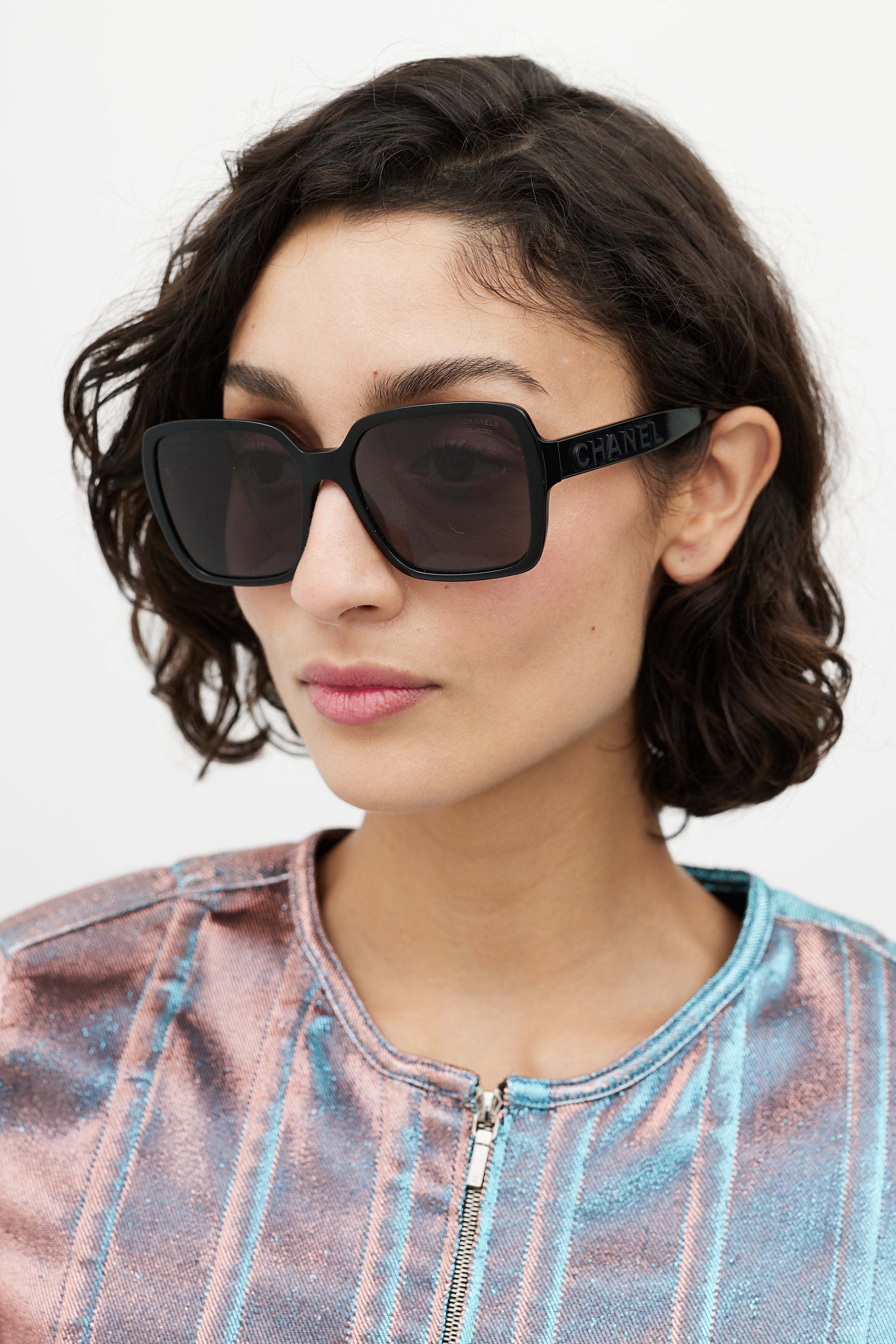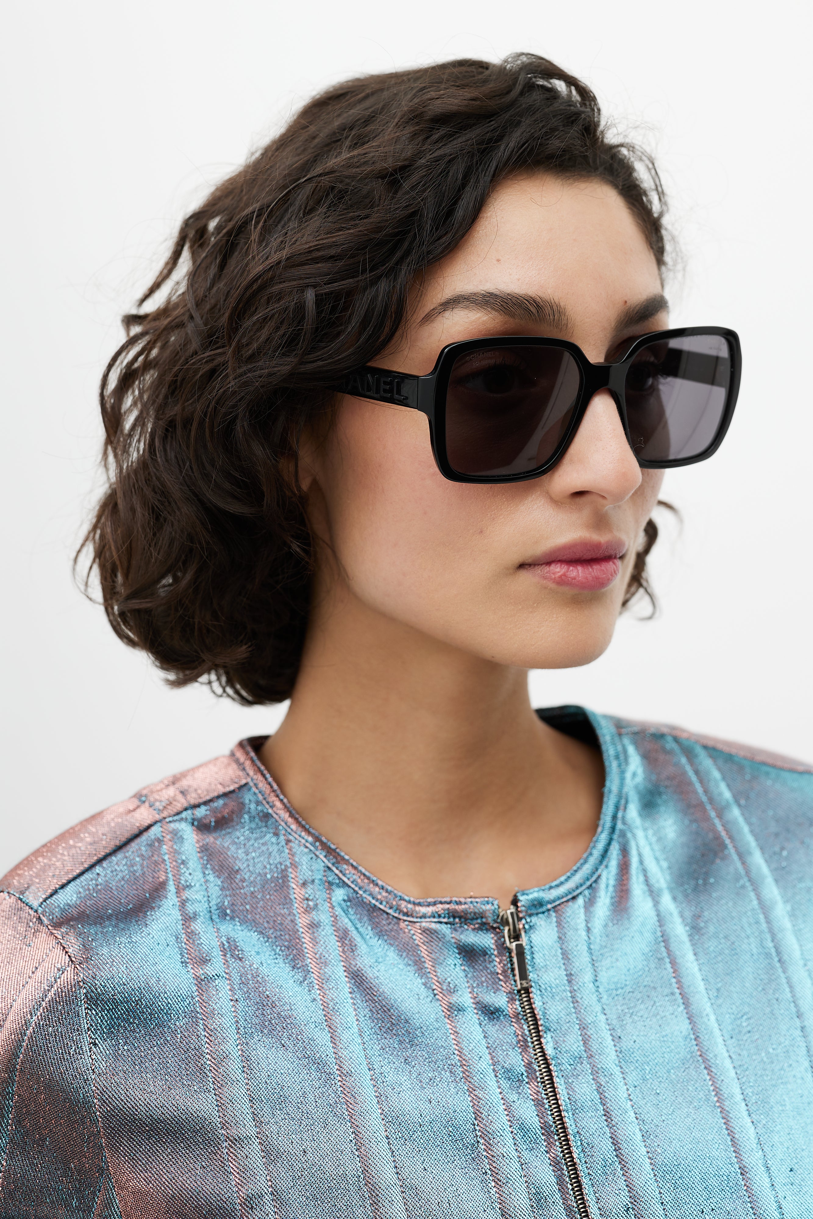 Pre-owned Chanel black 5408 sunglasses featuring oversized square frame, nose saddle bridge, and debossed logo at temple. Comes with original case and box.