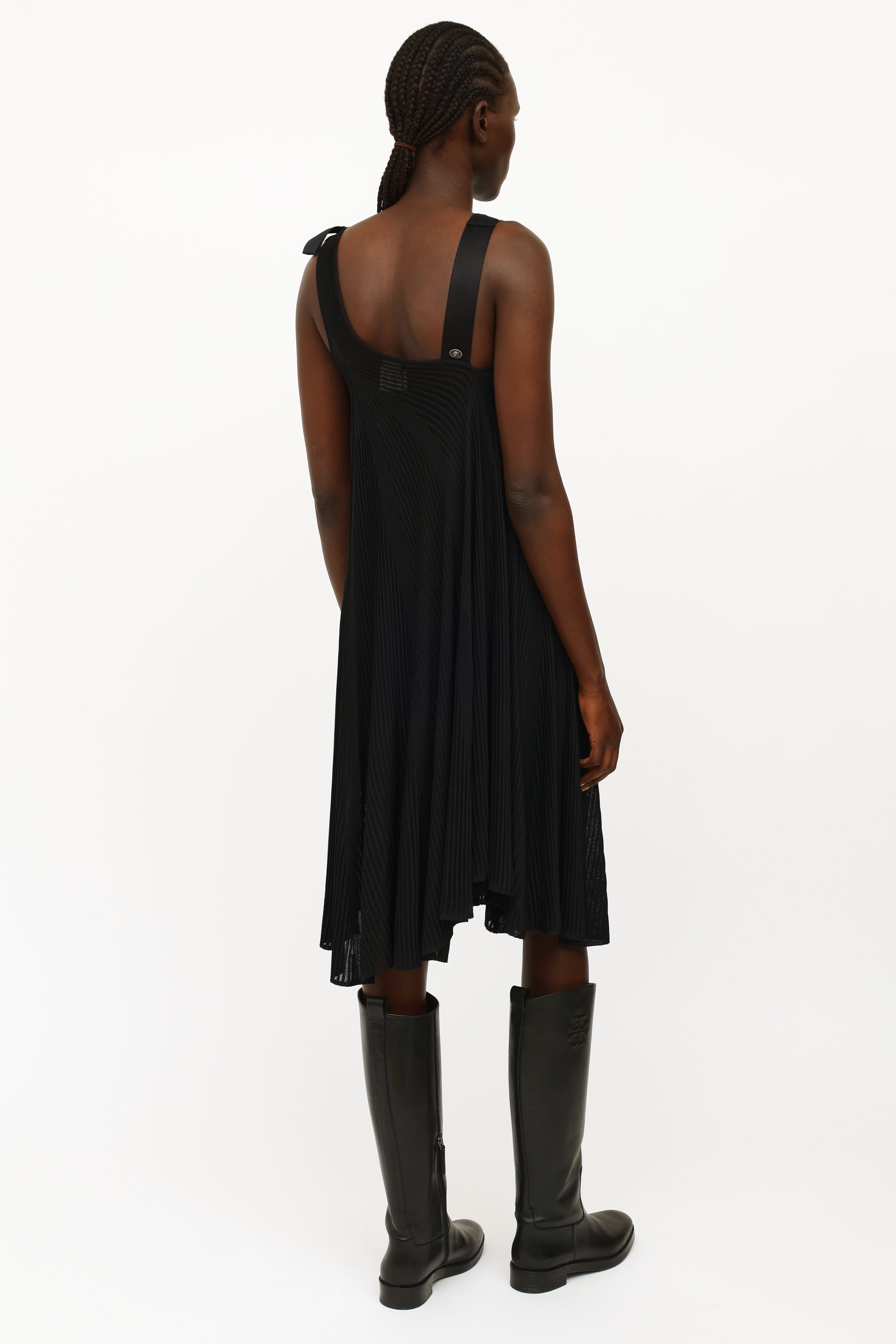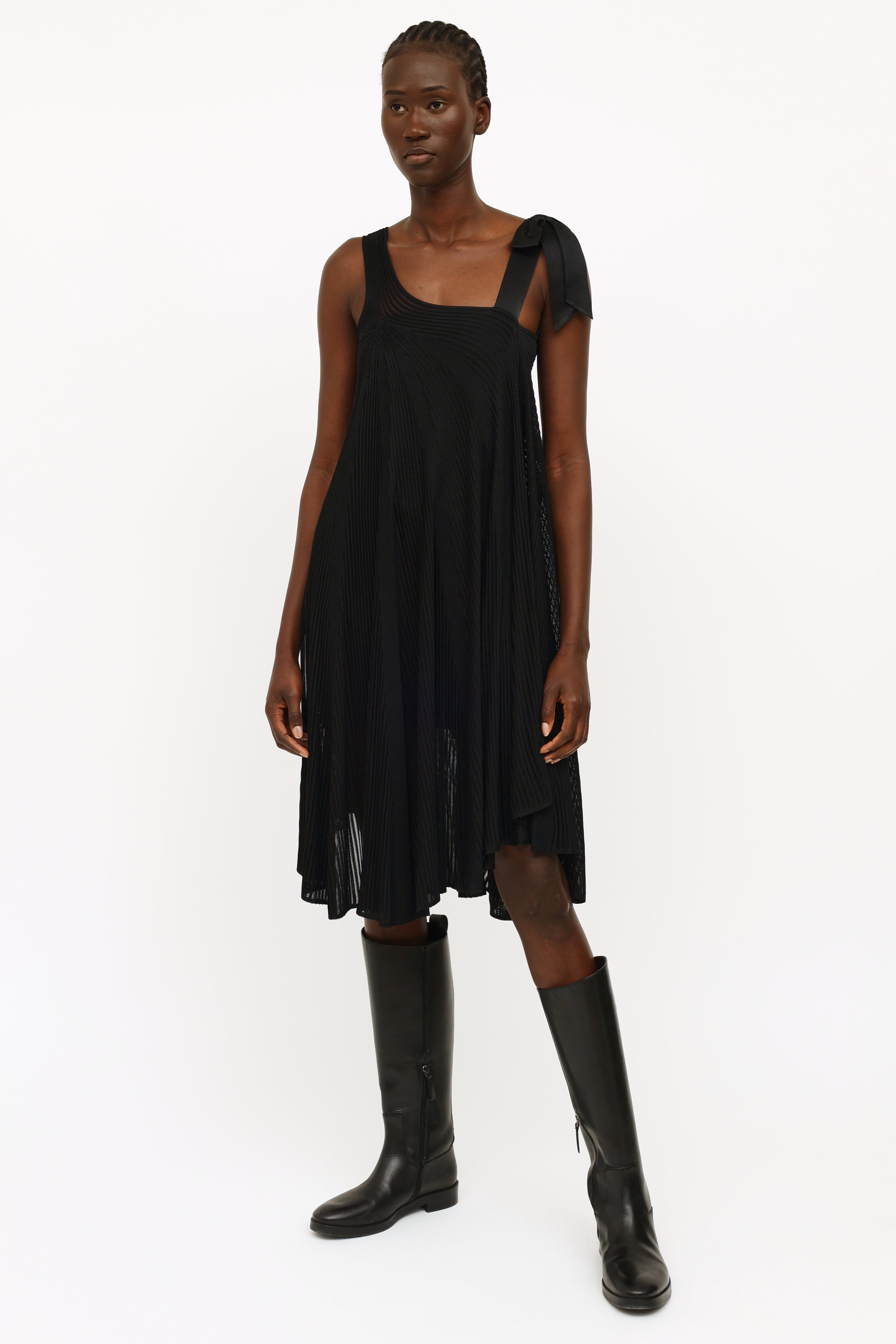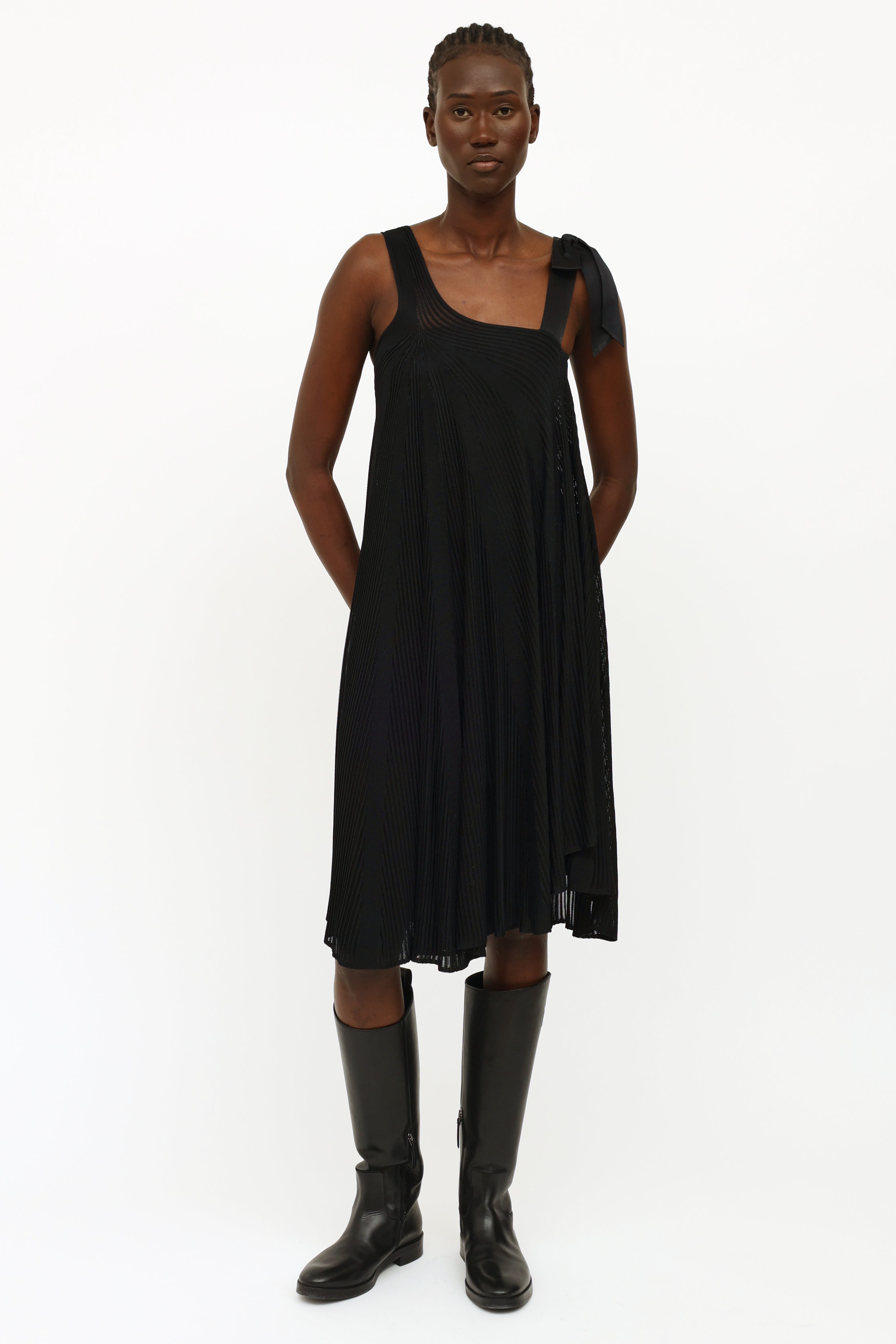 Pre-owned Chanel black silk ribbon bow dress featuring a one shoulder style neckline, dual shoulder straps with silk bow detailing, sheer rib knit stripes throughout, trapeze silhouette and detached sleeveless underdress.