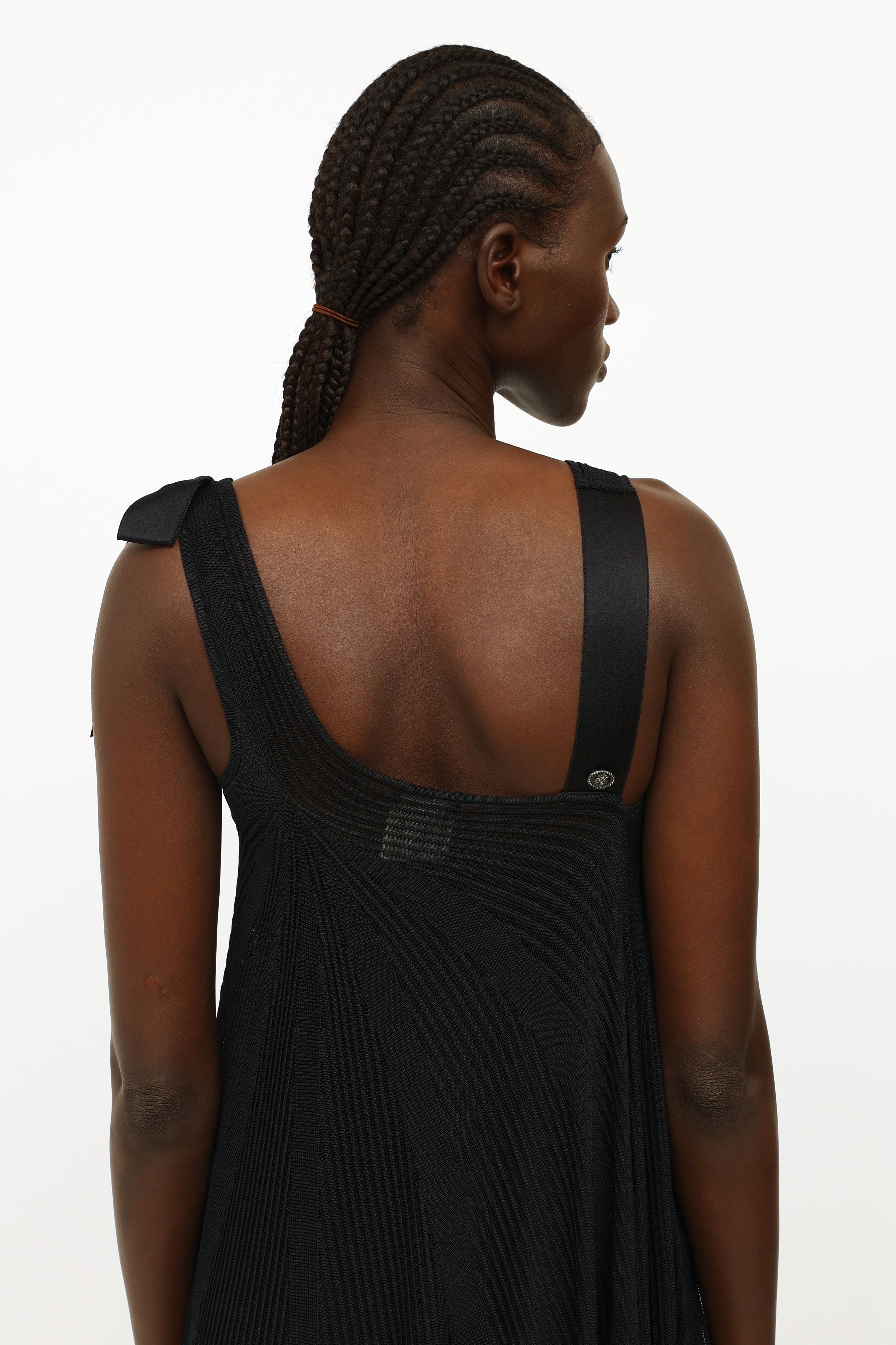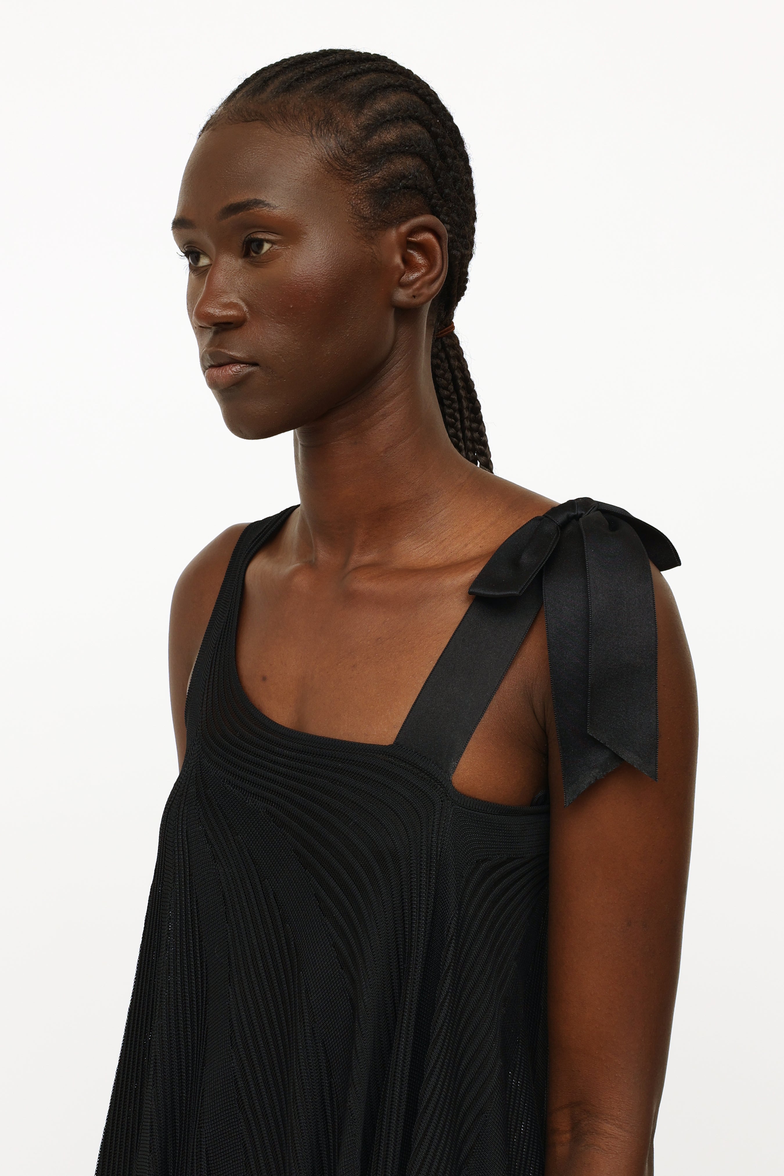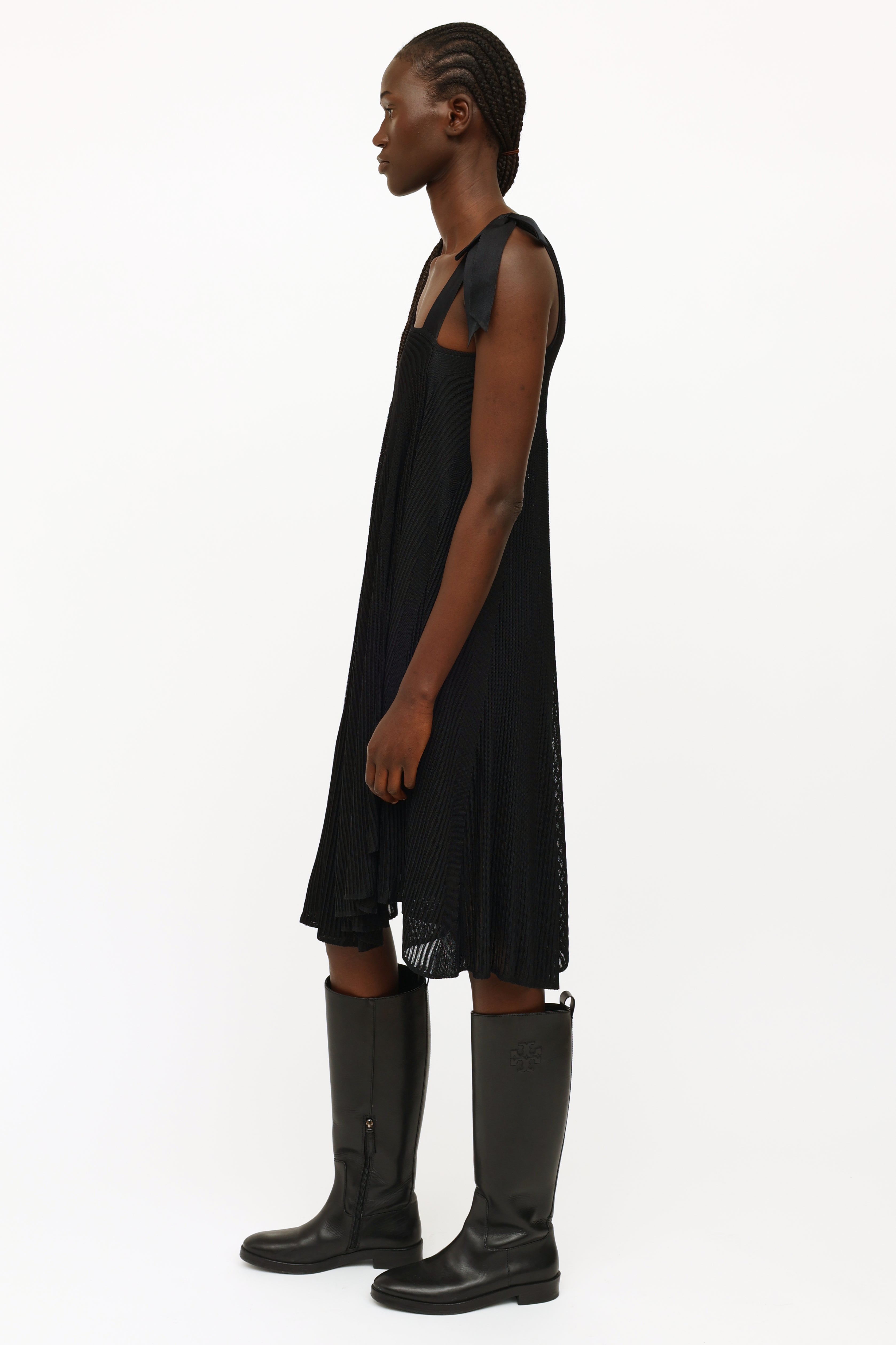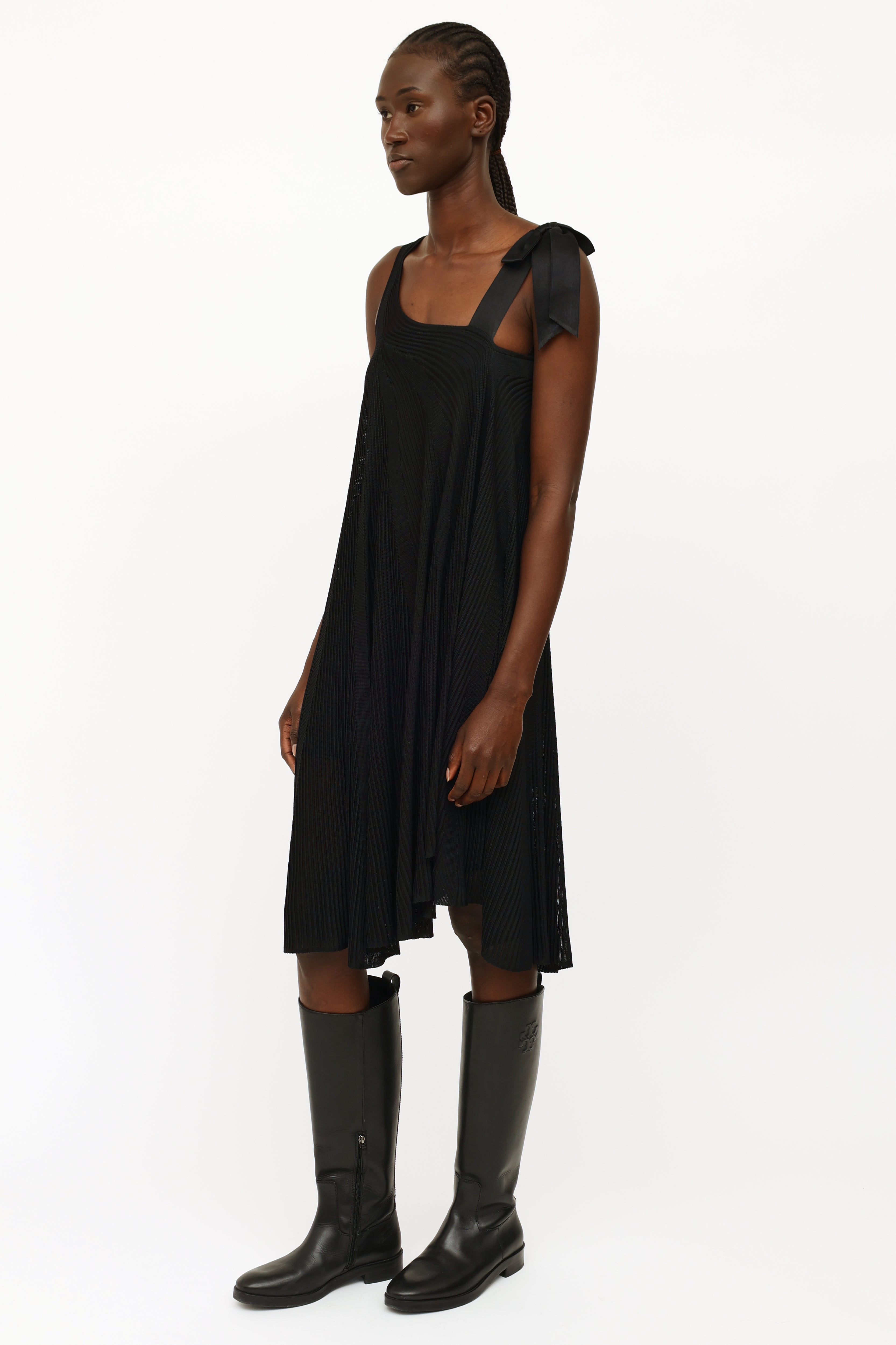 Pre-owned Chanel black silk ribbon bow dress featuring a one shoulder style neckline, dual shoulder straps with silk bow detailing, sheer rib knit stripes throughout, trapeze silhouette and detached sleeveless underdress.