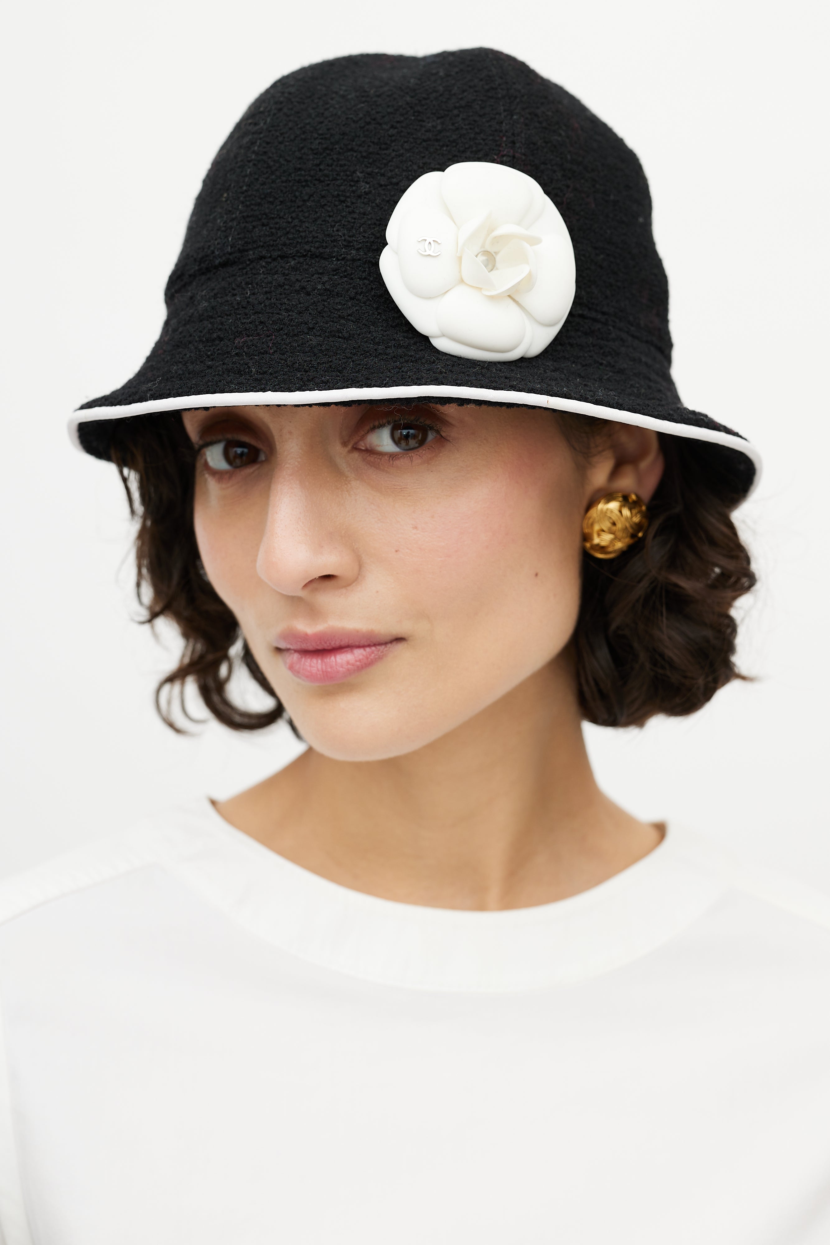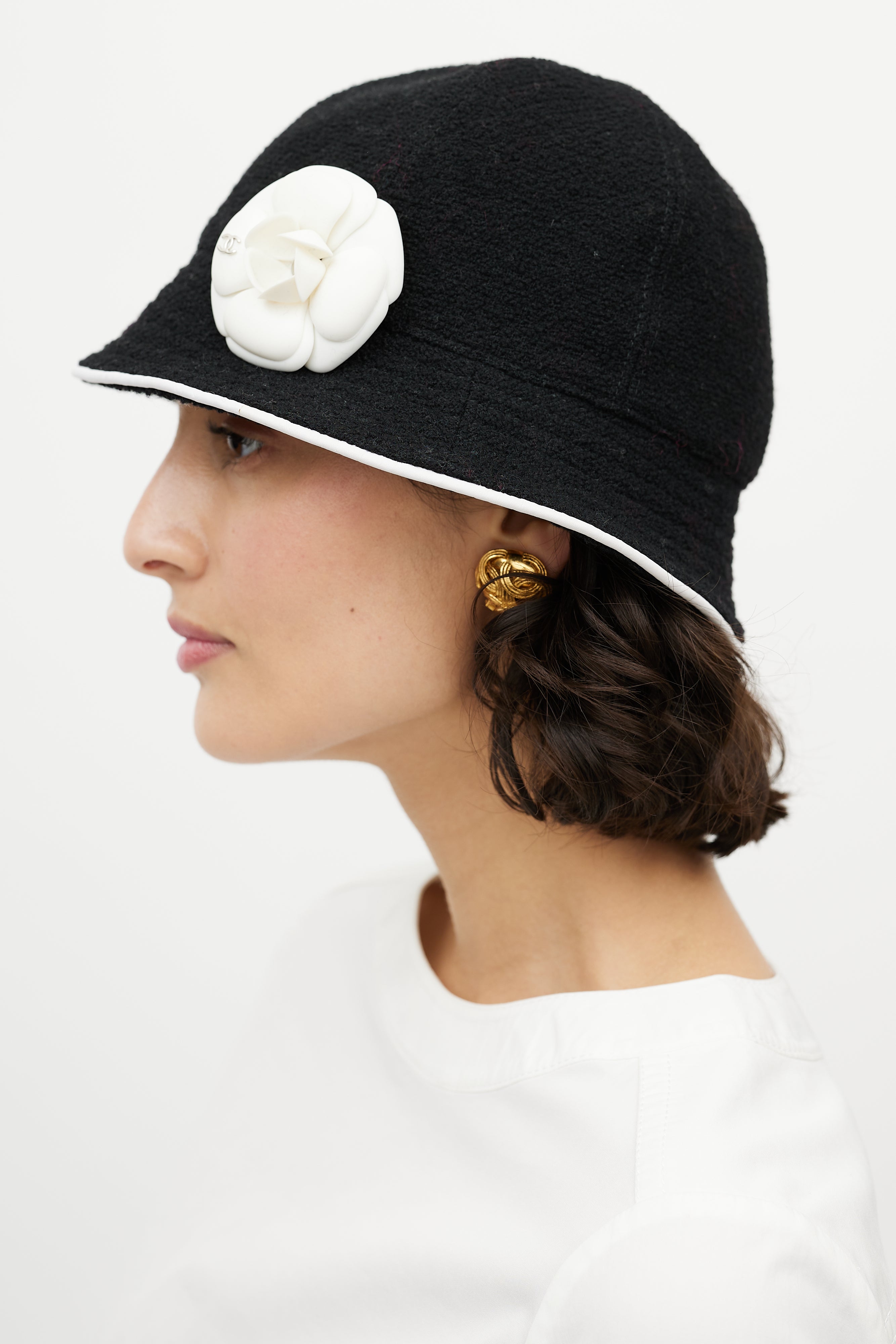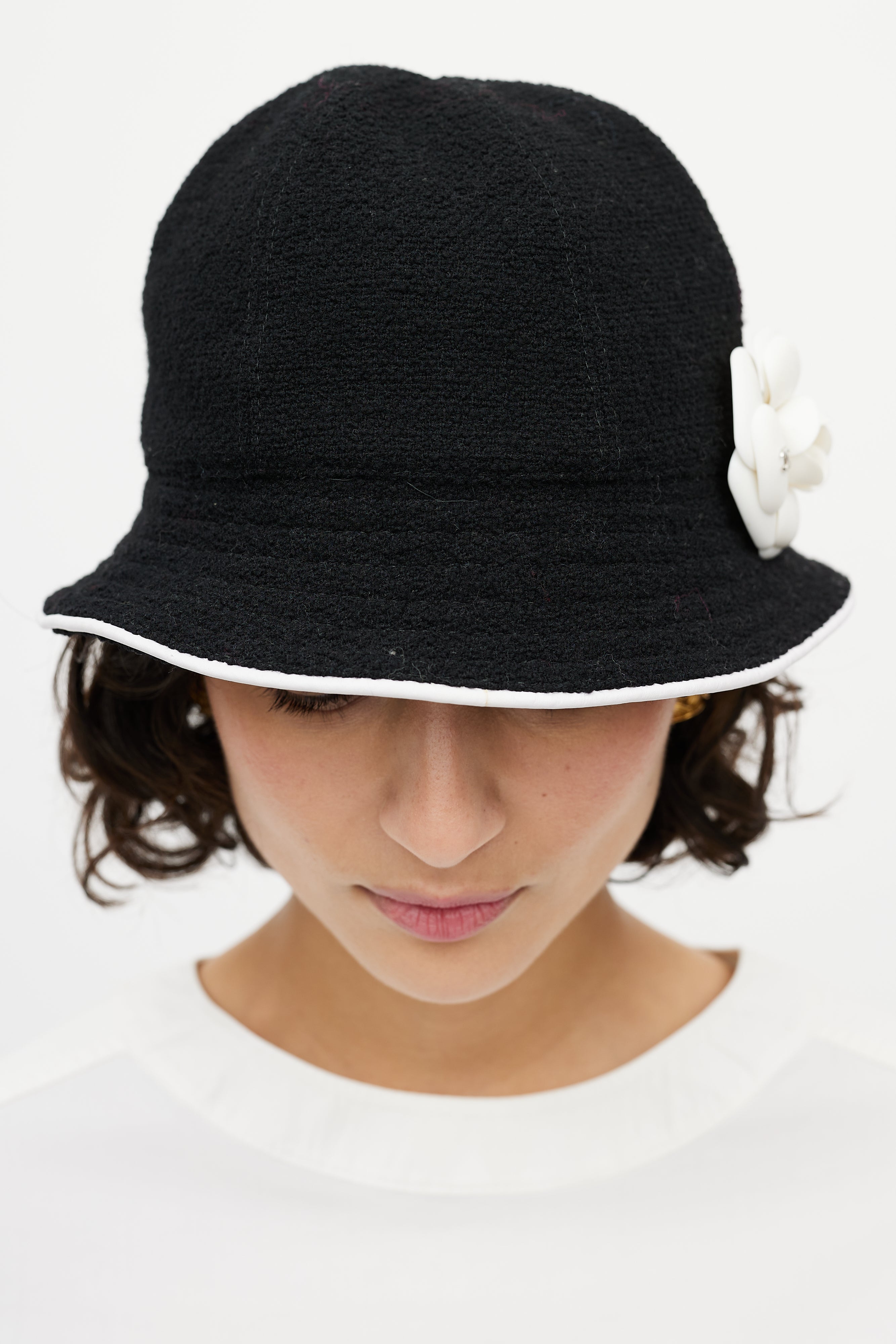 Pre-owned Chanel black boucle bucket hat featuring flat brim, white rubber Camellia flower at side, silver tone CC logo at flower, and white leather trim.