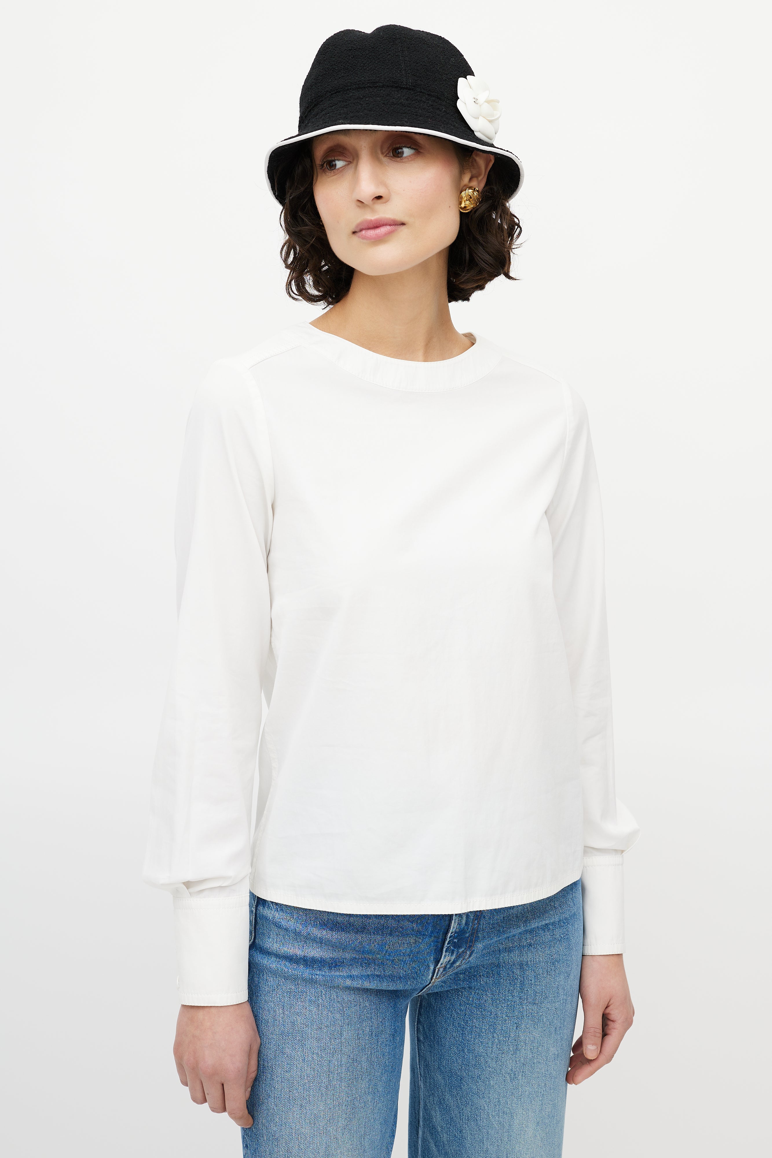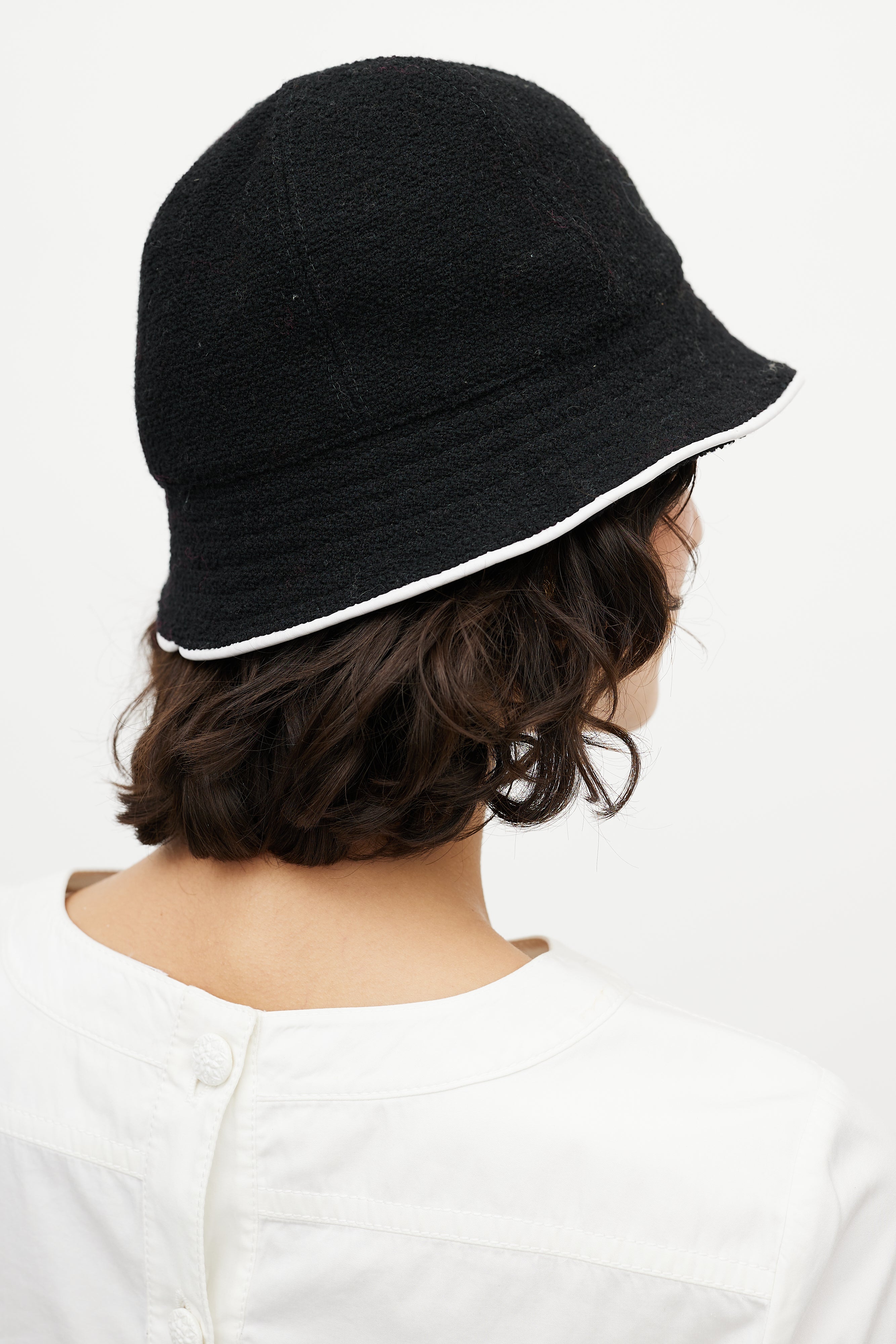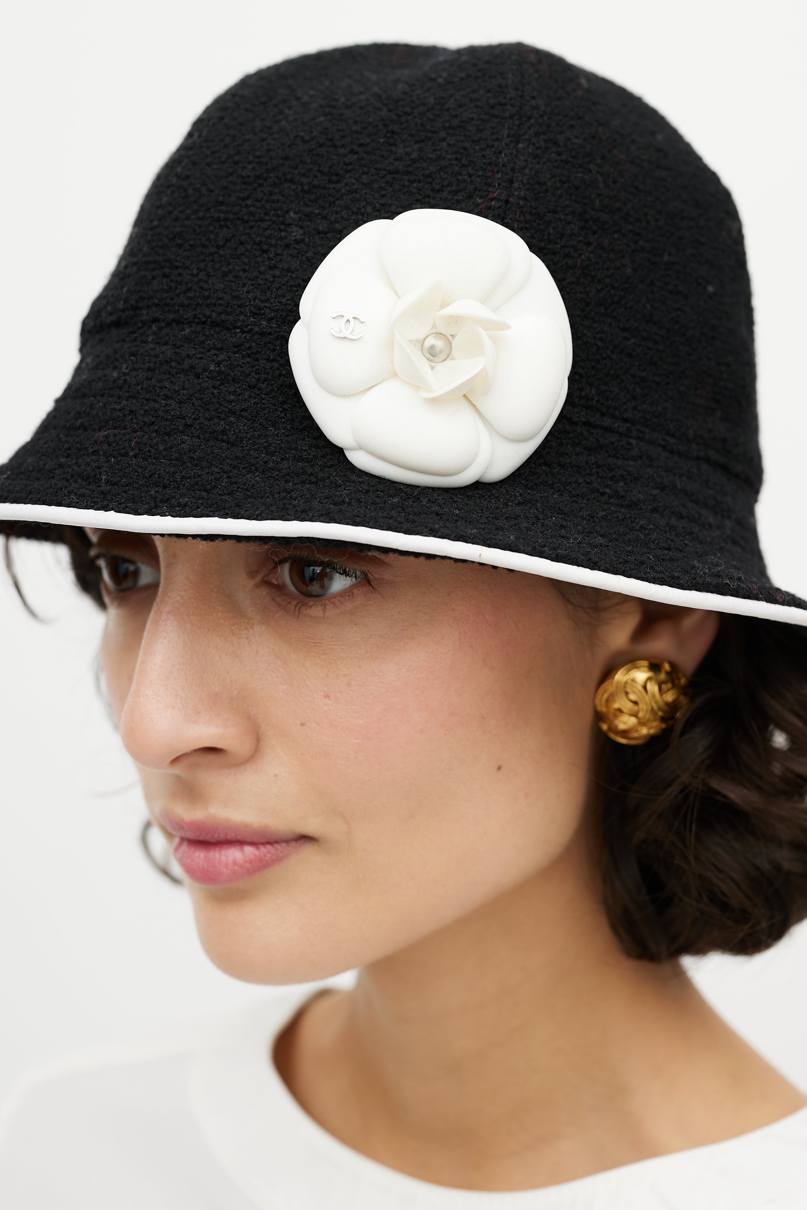 Pre-owned Chanel black boucle bucket hat featuring flat brim, white rubber Camellia flower at side, silver tone CC logo at flower, and white leather trim.
