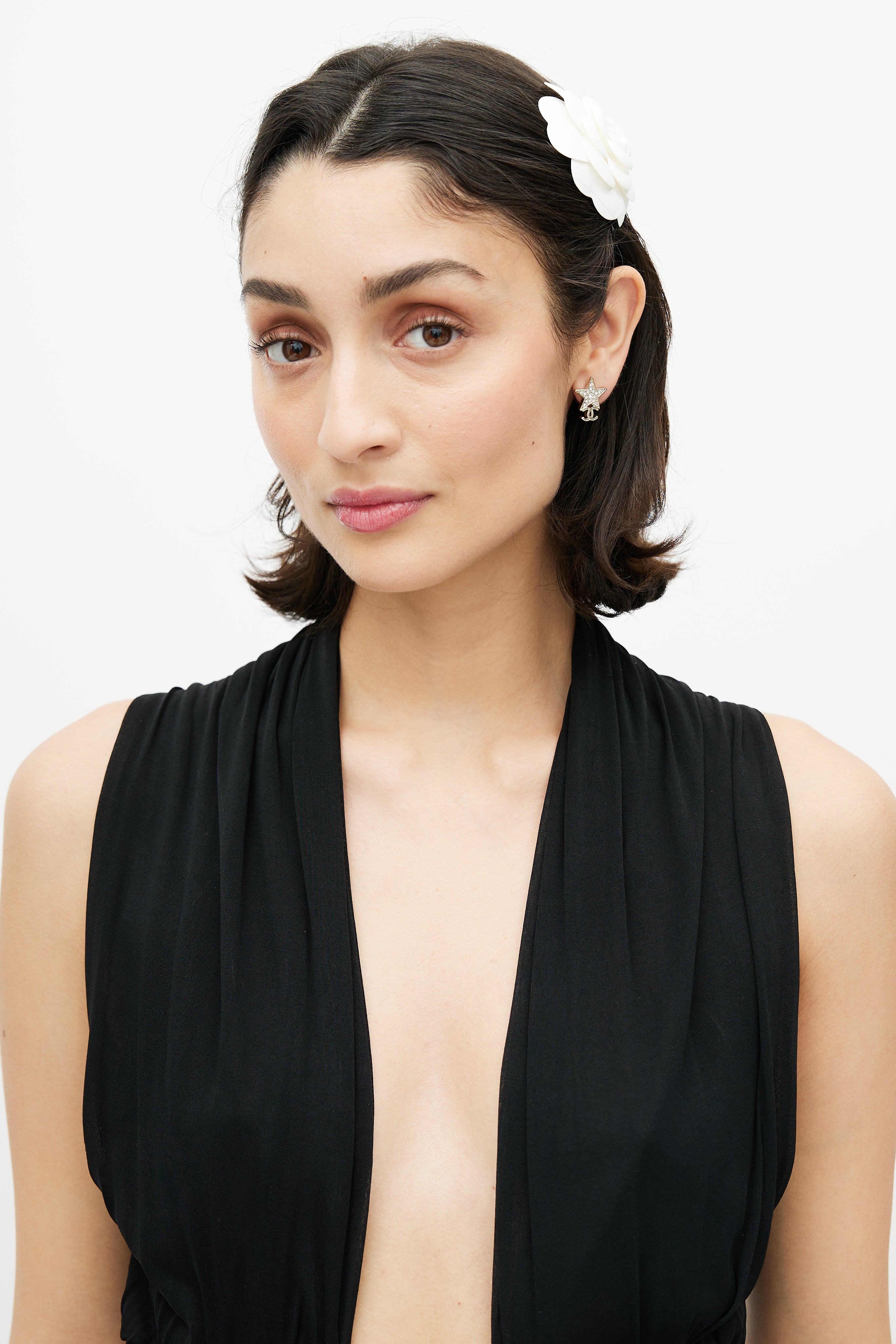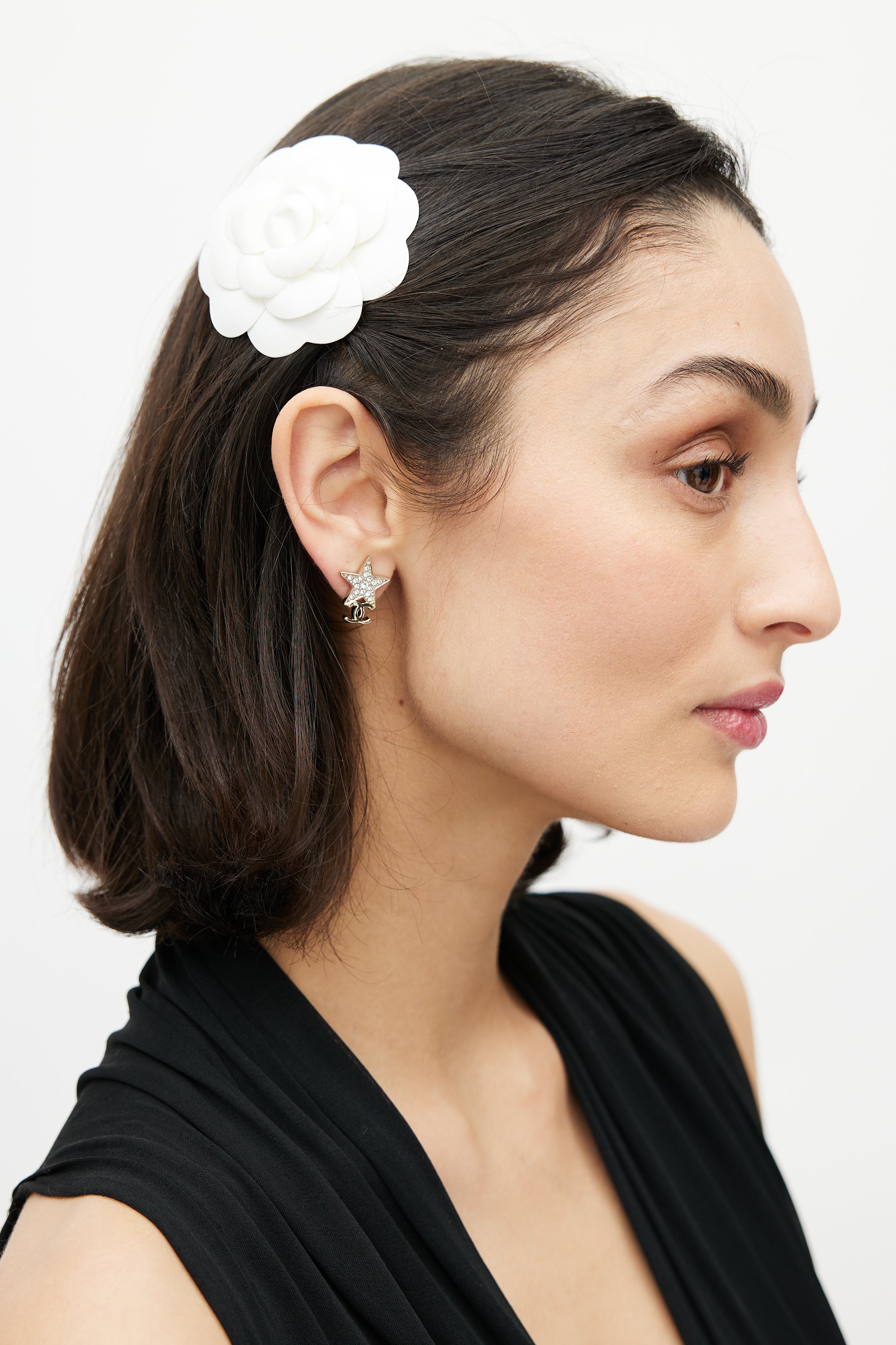 Pre-owned Chanel gold earrings featuring jewel embellished stars with CC logo, and push lock closure. Comes with original box.