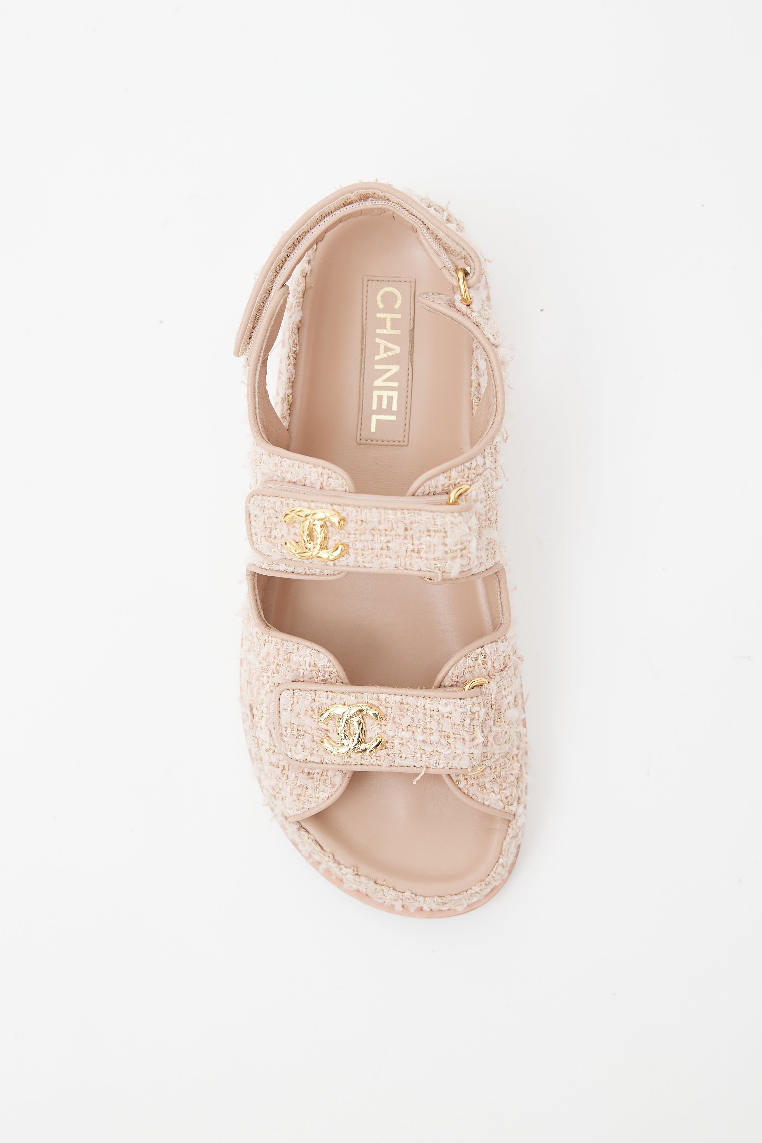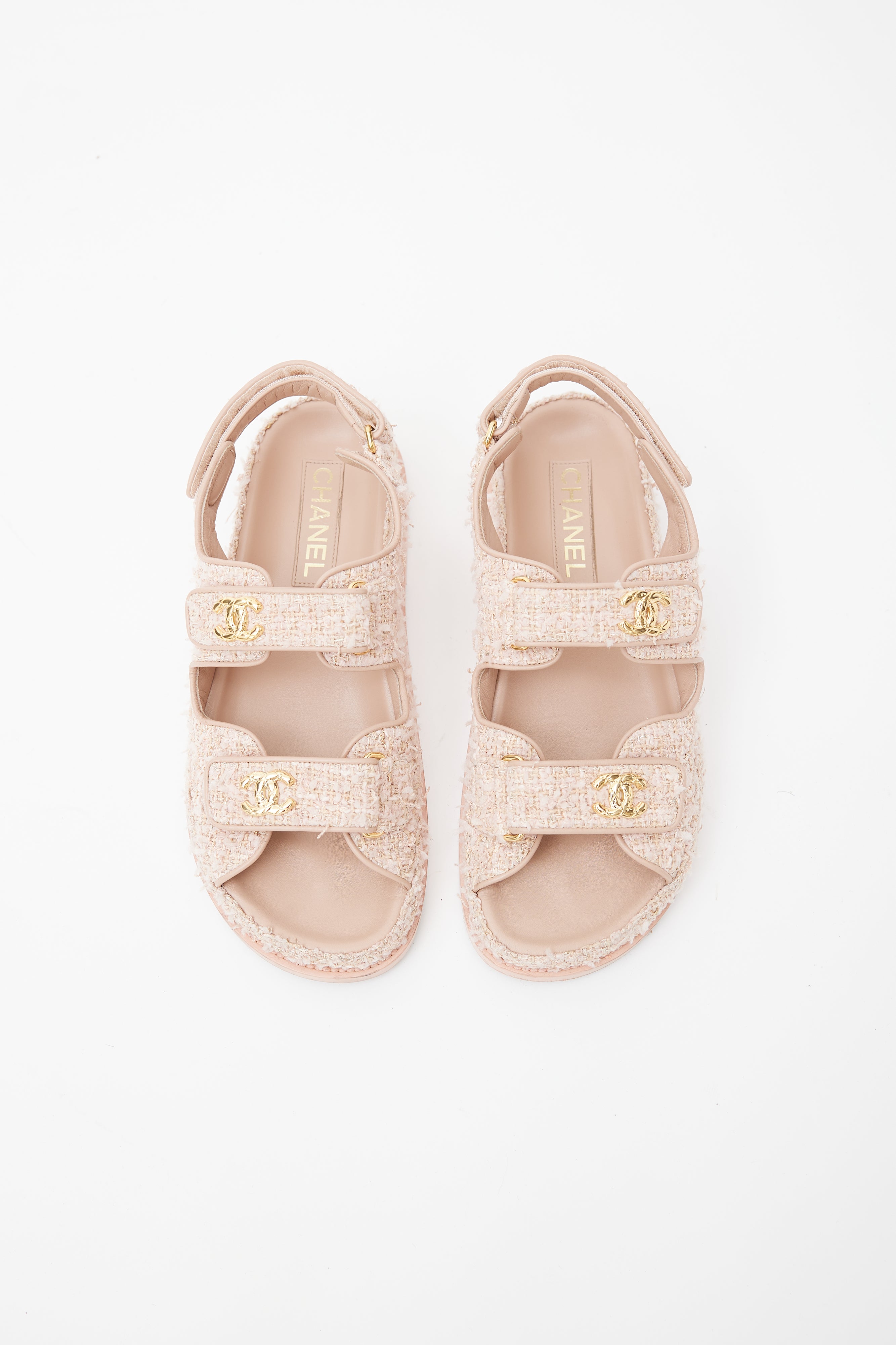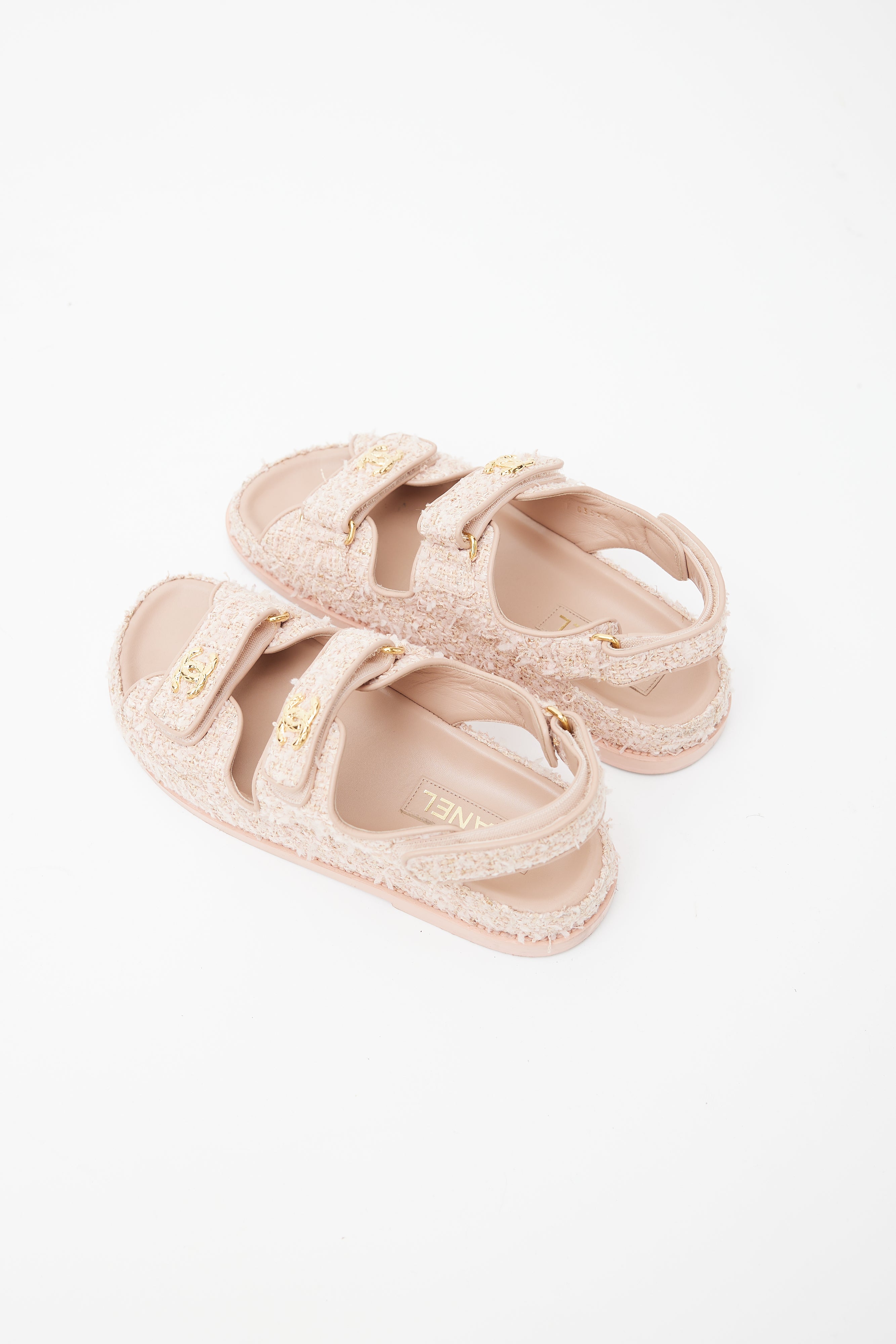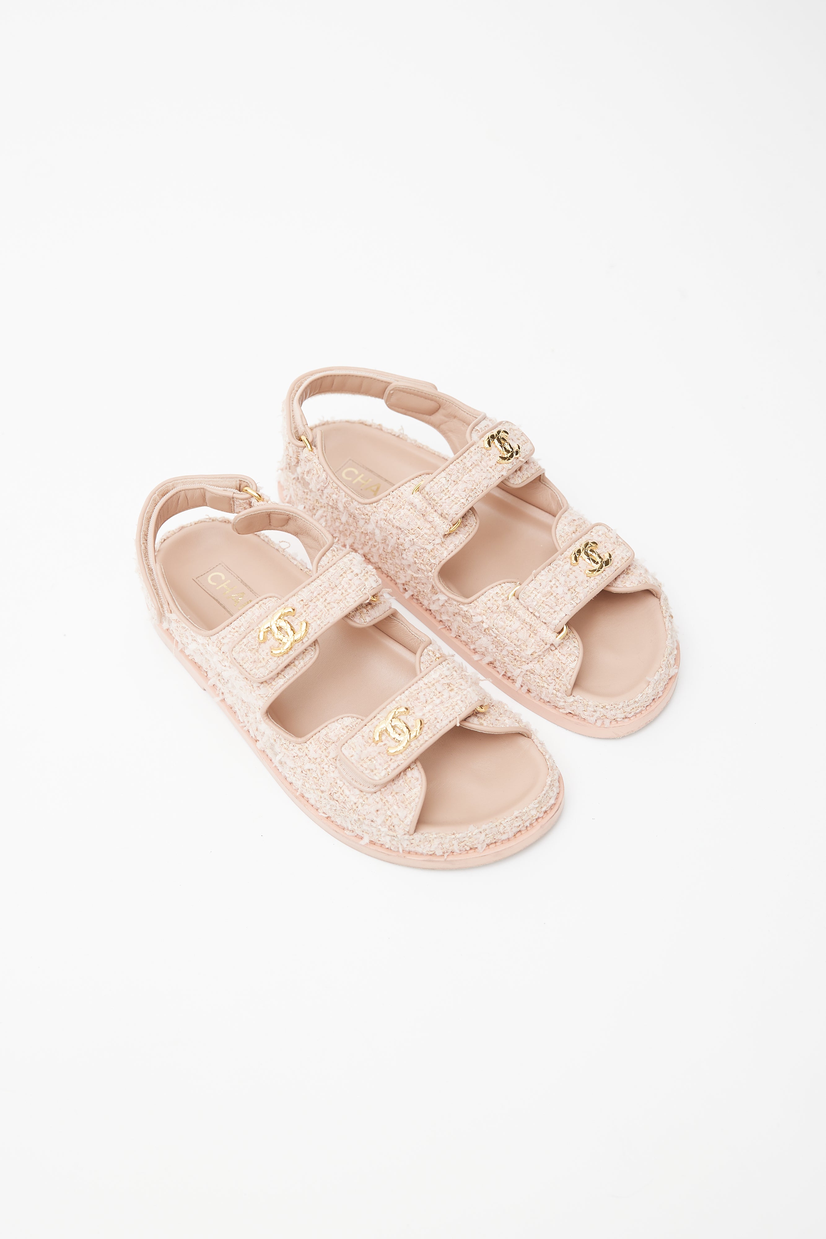 Pre-owned Cruise 2010 Chanel pink tweed sandals featuring rounded toe, tweed upper, Velcro straps at toe and ankle, gold tone CC logo at straps, and stamped logo at insole. Comes with original dust bag and box.