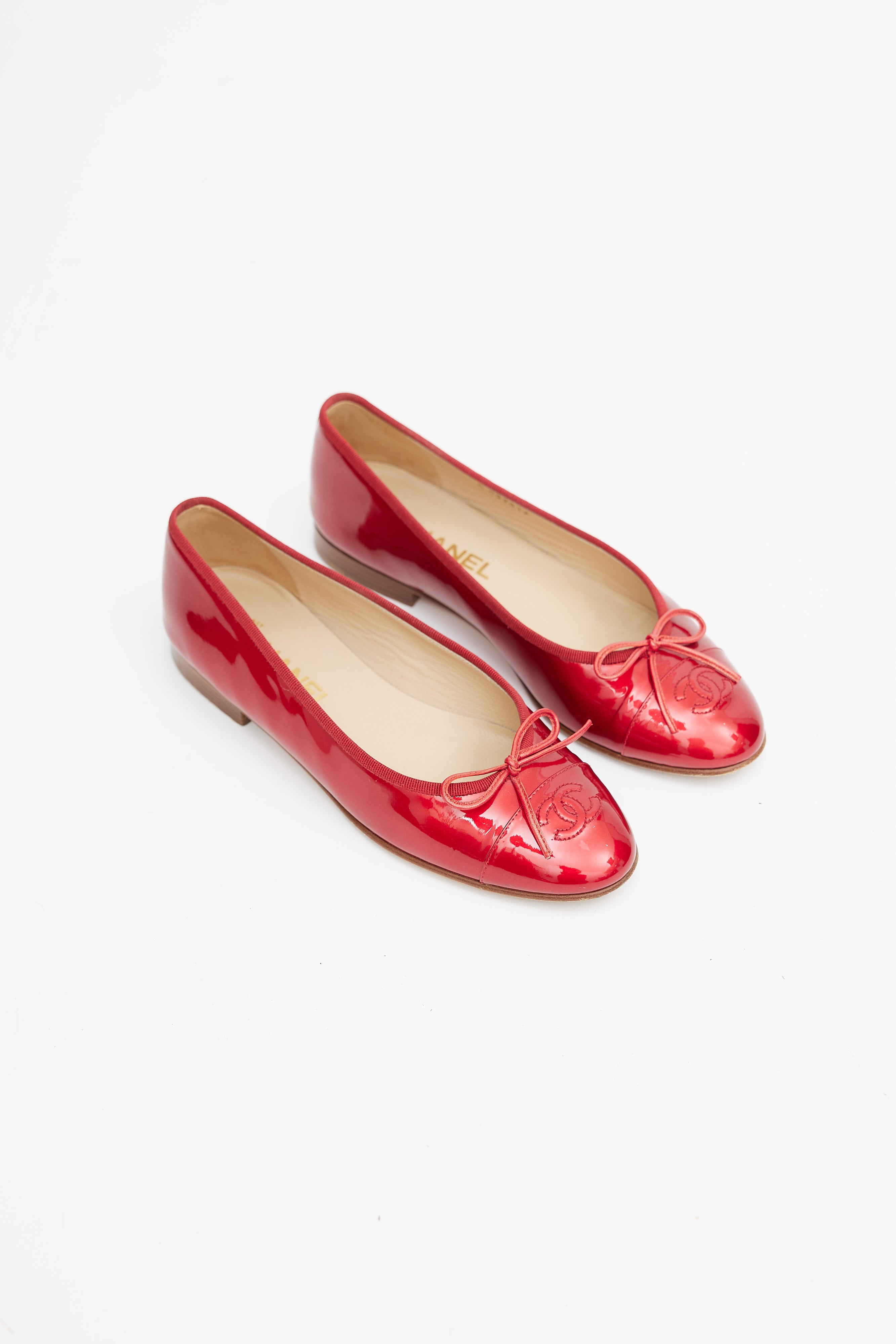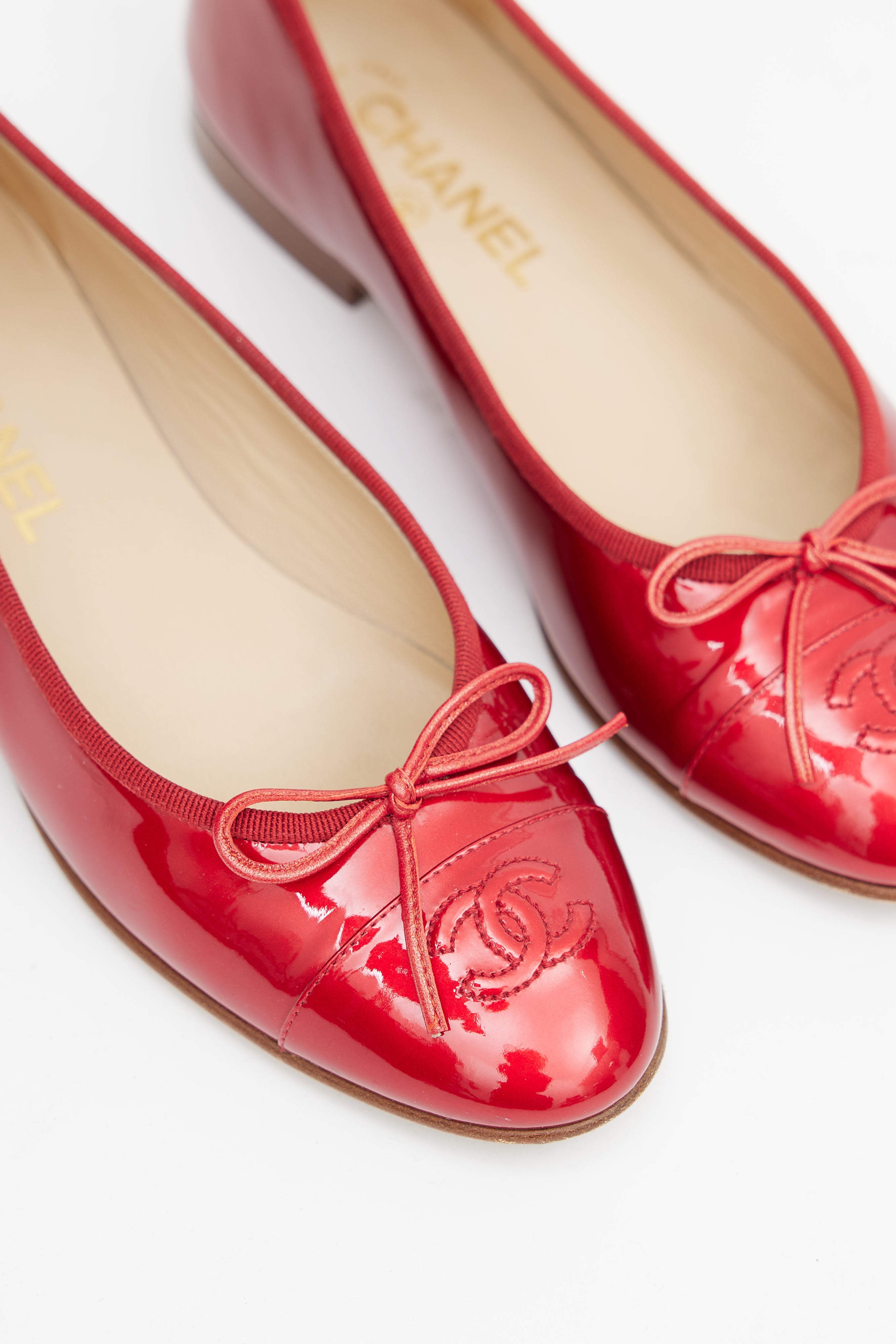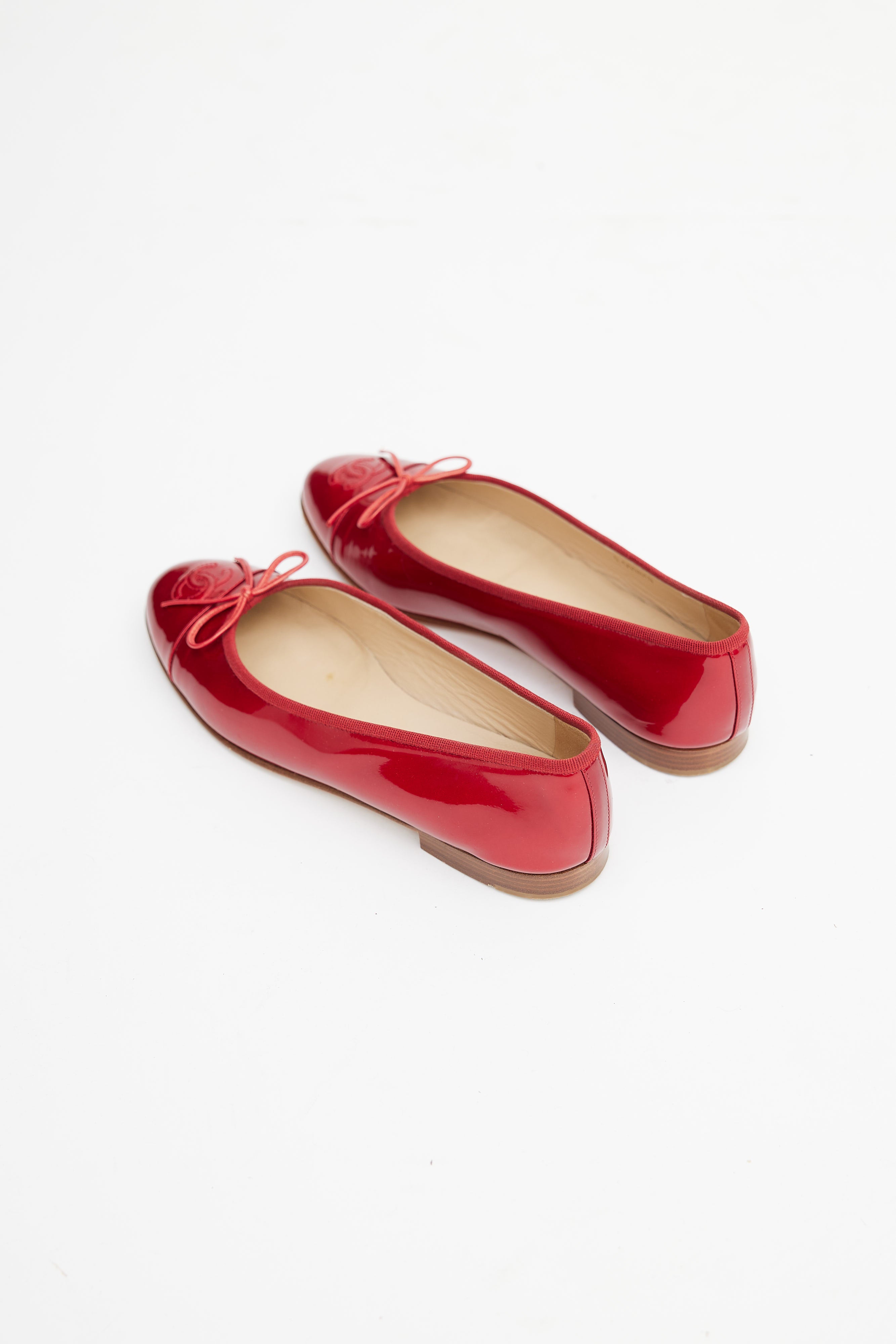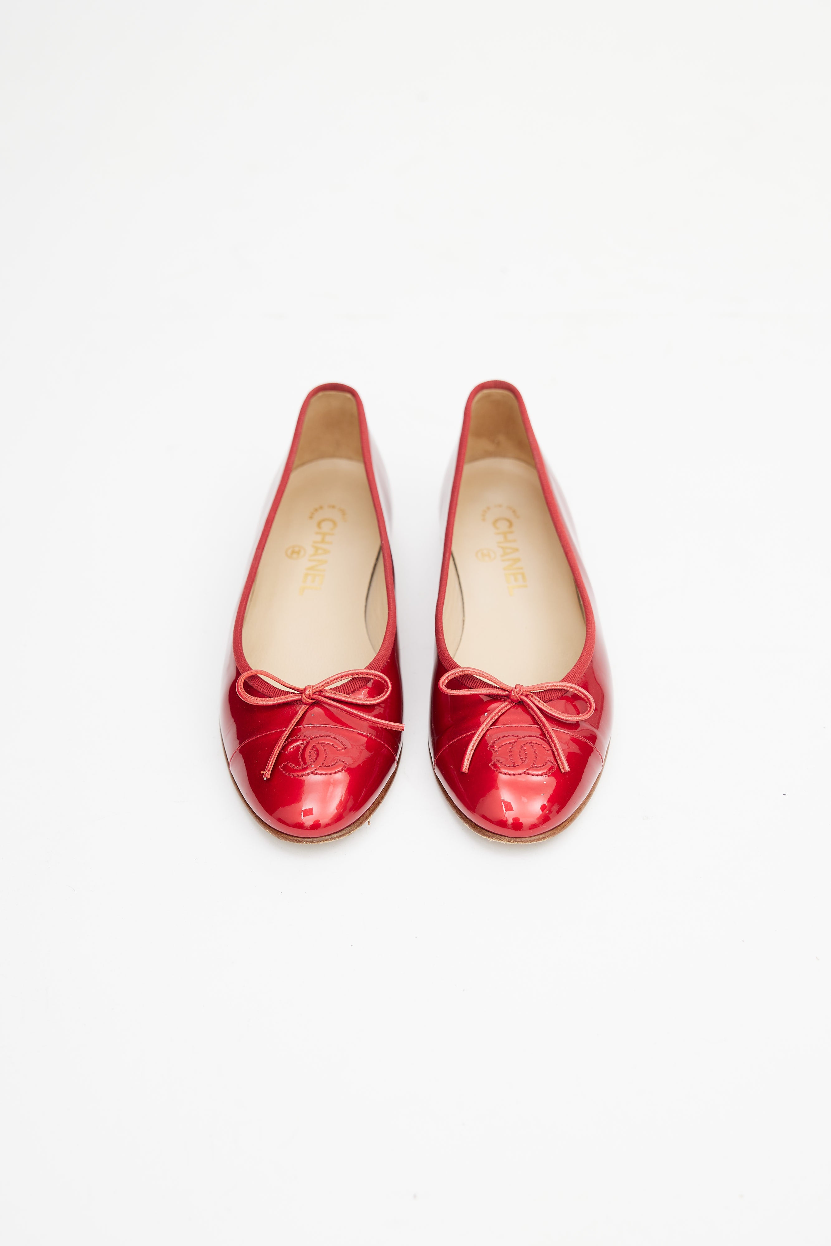 Pre-owned Cruise 2010 Chanel red patent ballet flats featuring a narrow rounded toe, CC embroidery at toe cap, grosgrain trim at opening, attached red bow, and stacked heel. Comes with original box.