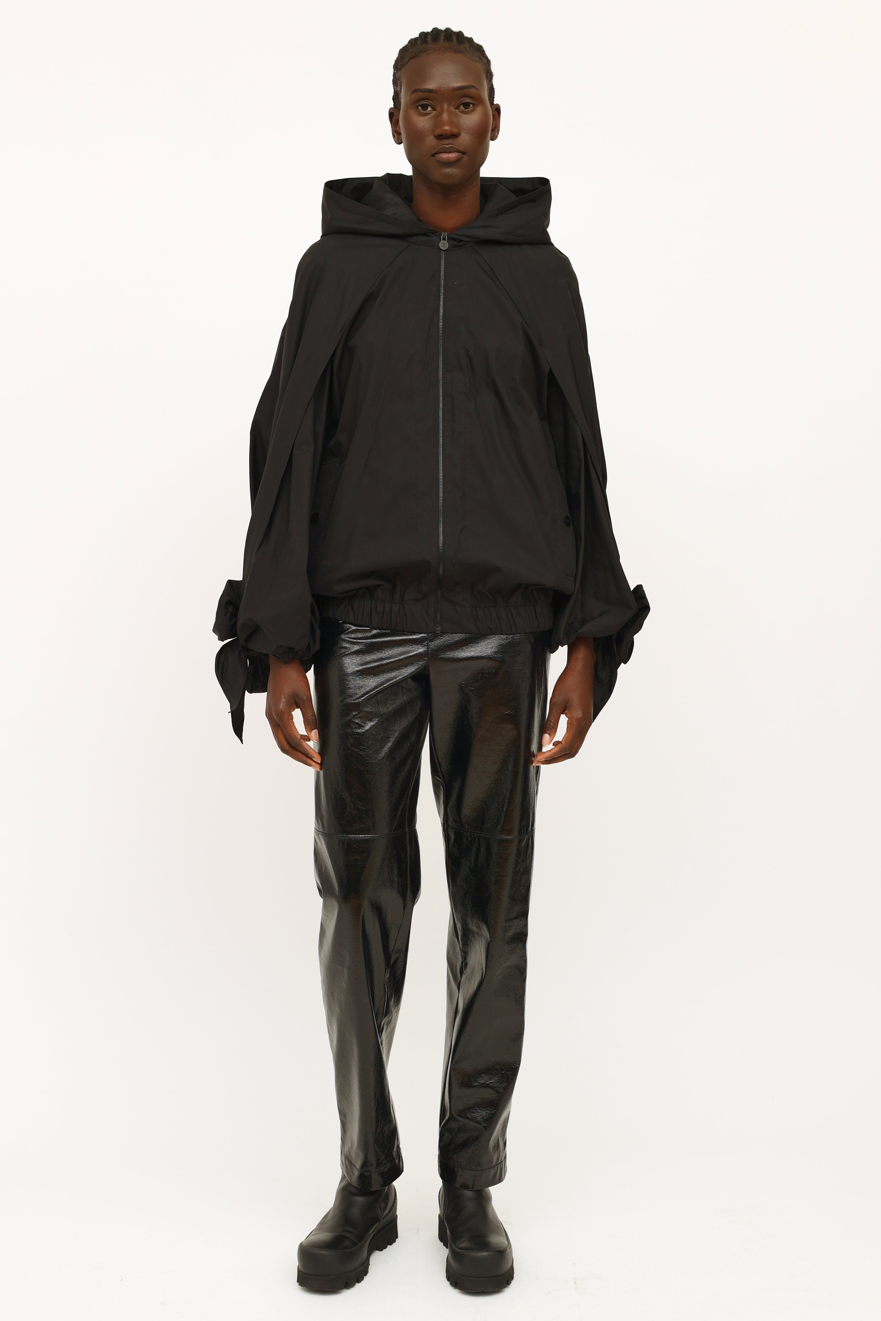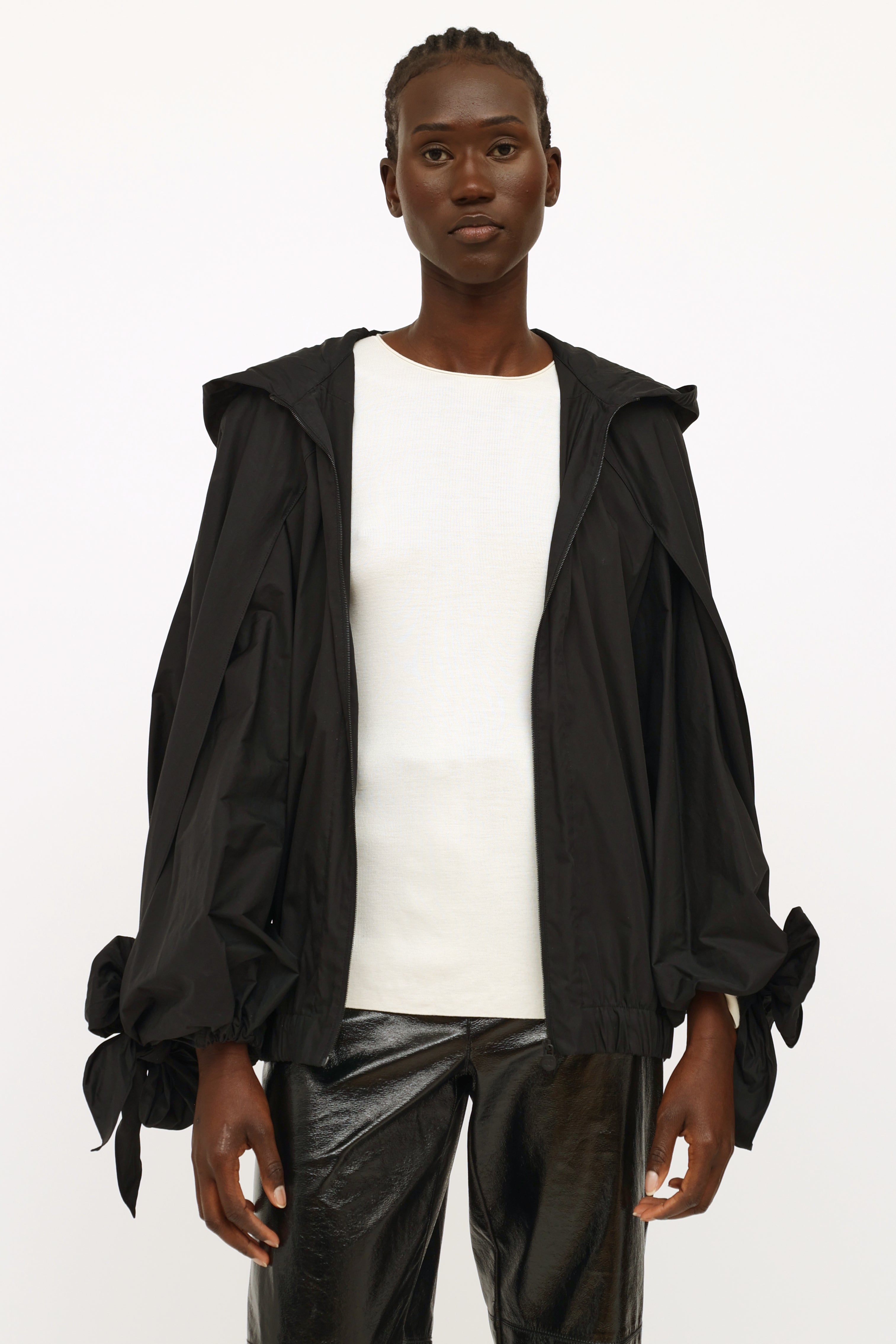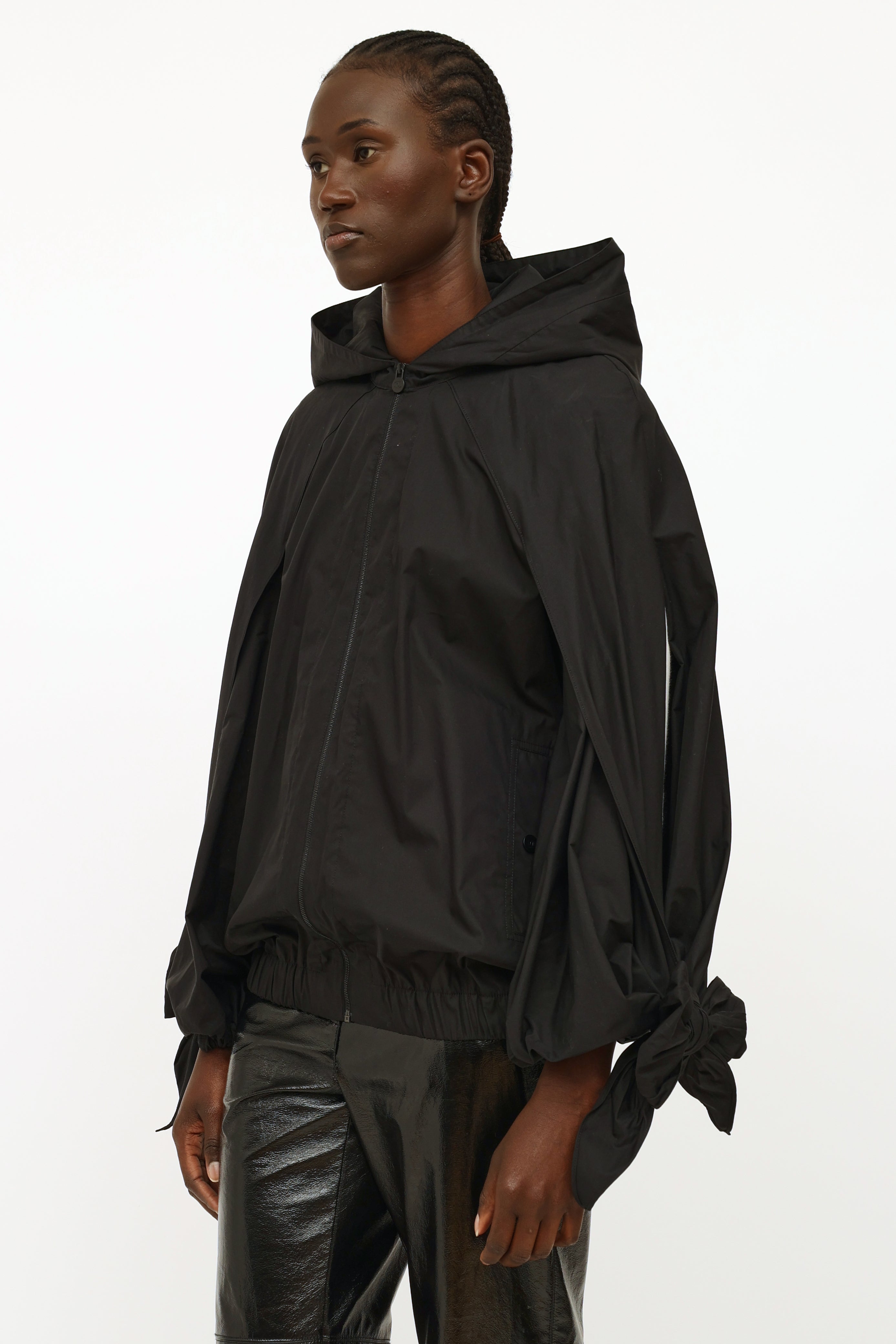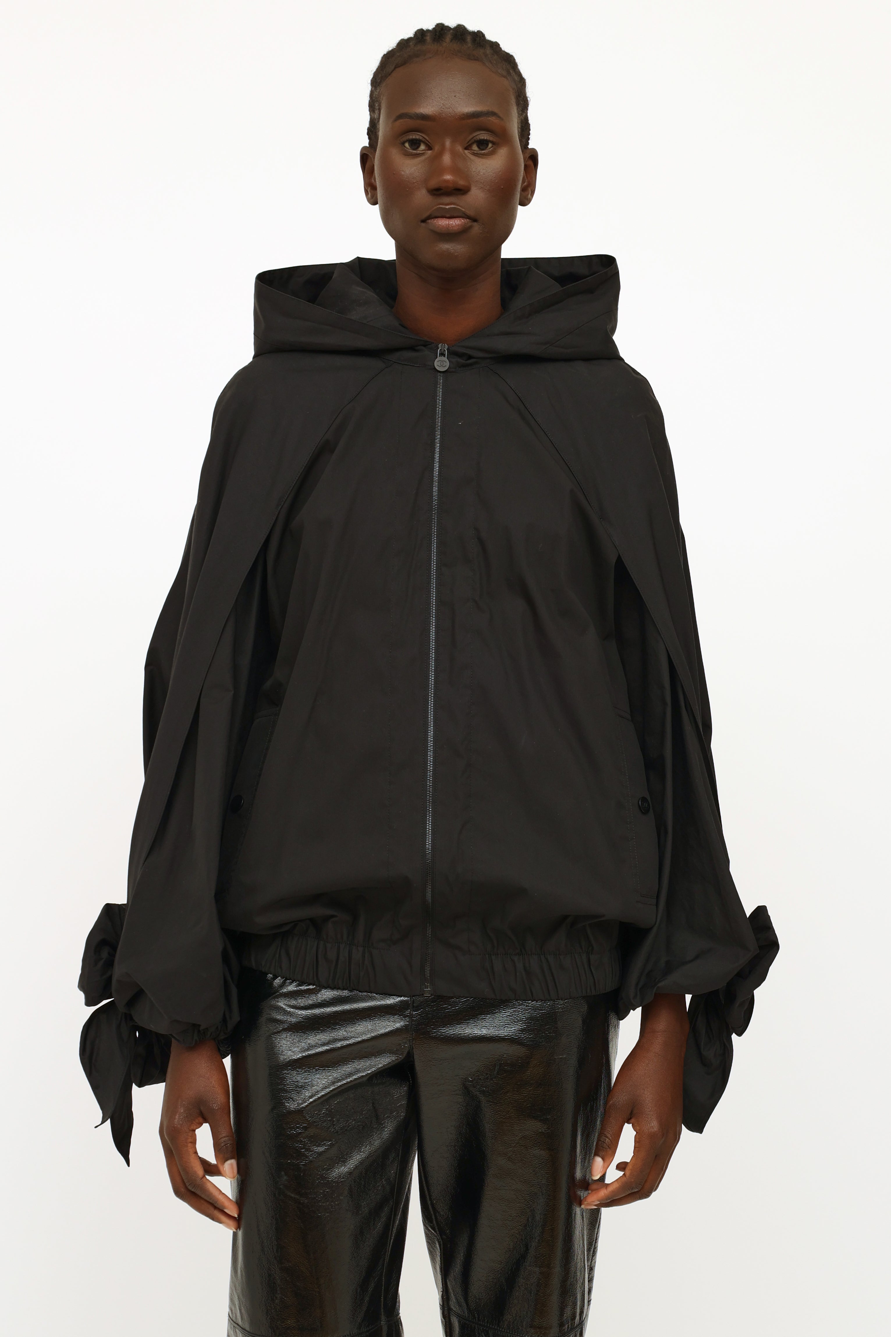 Pre-owned Chanel Cruise 2015 black windbreaker featuring a stand collar with attached hood, full length sleeves with slit detailing and elasticized cuffs with oversized bow detailing, zip closure at centre front, dual buttoned storm pockets and elasticized waistband.