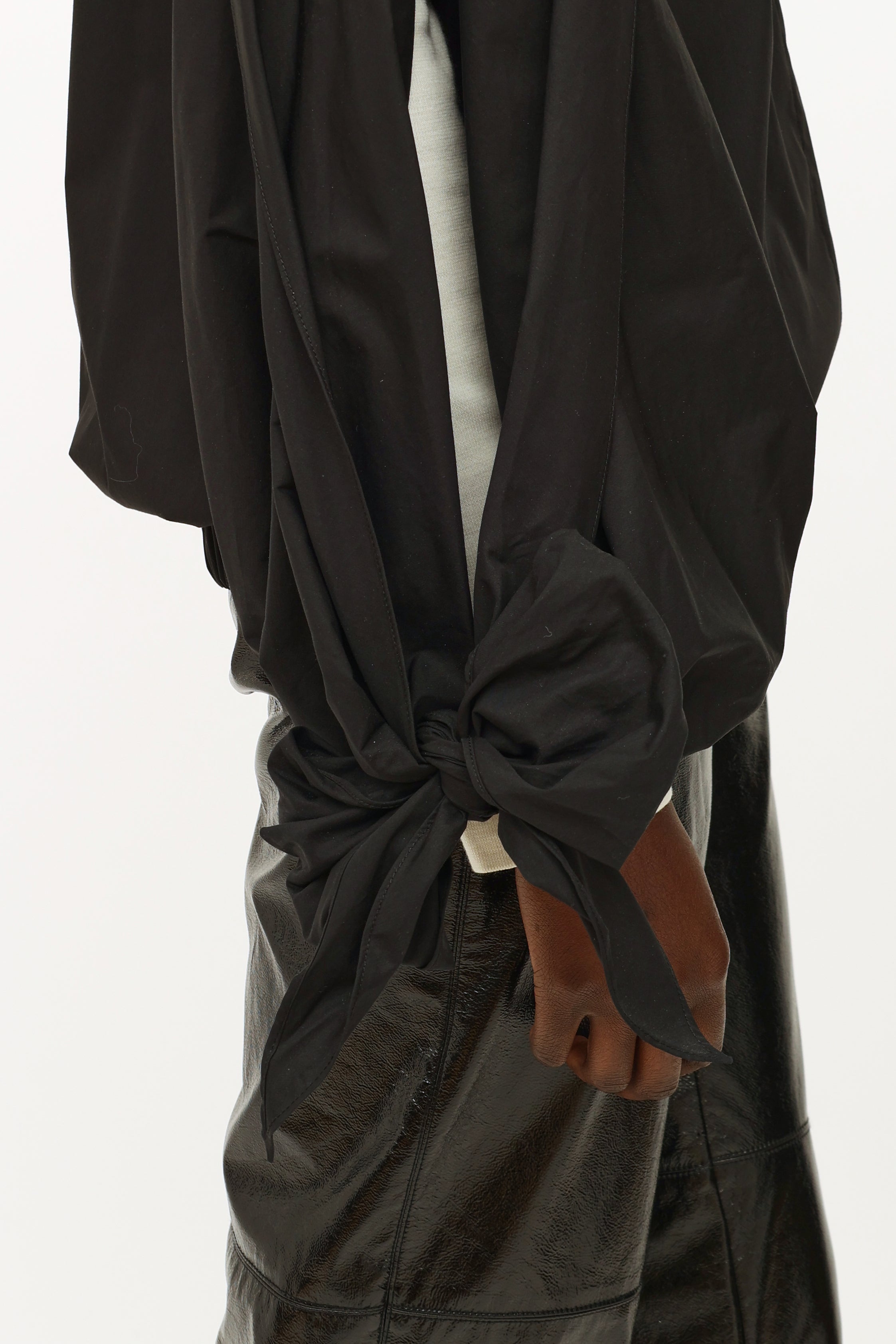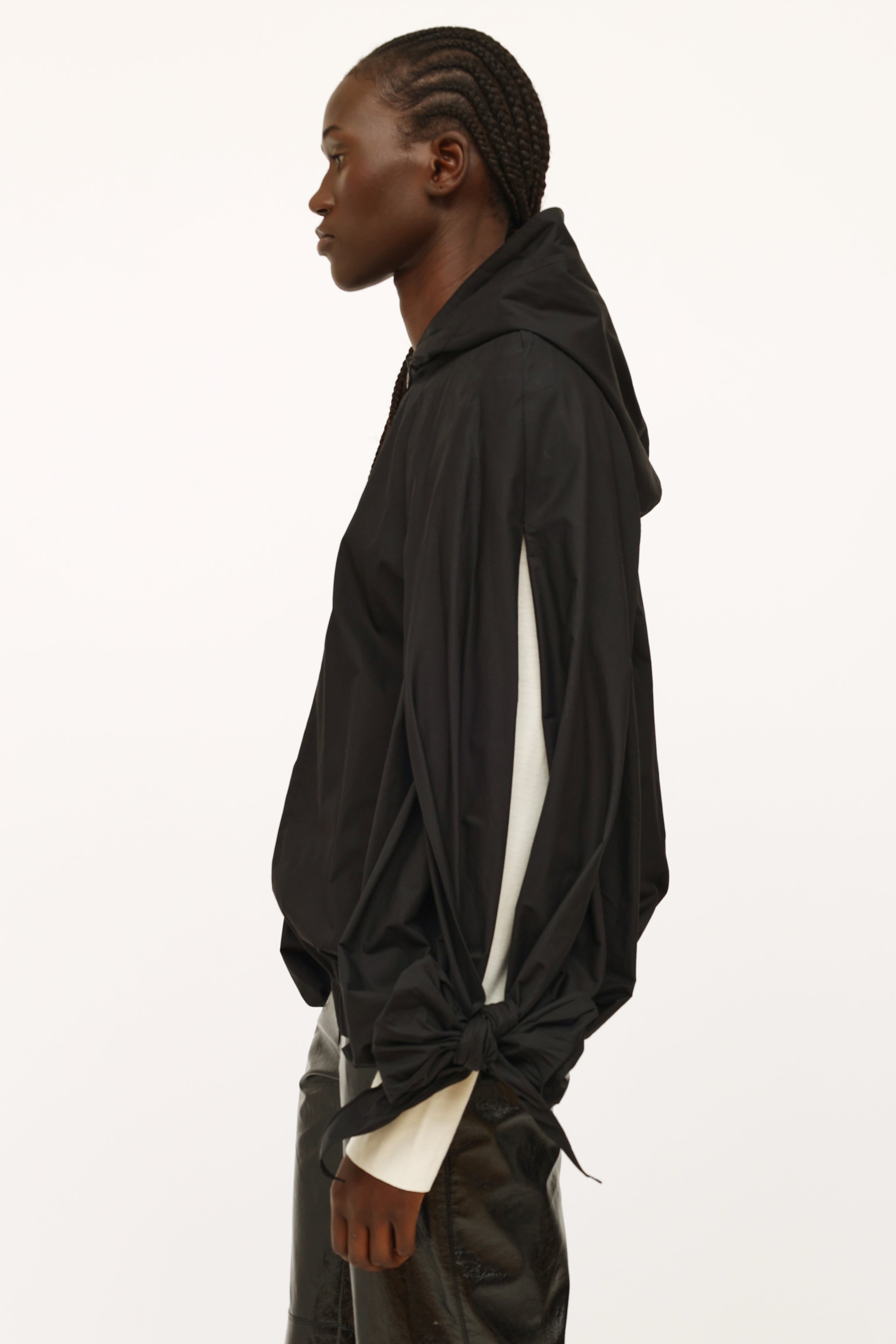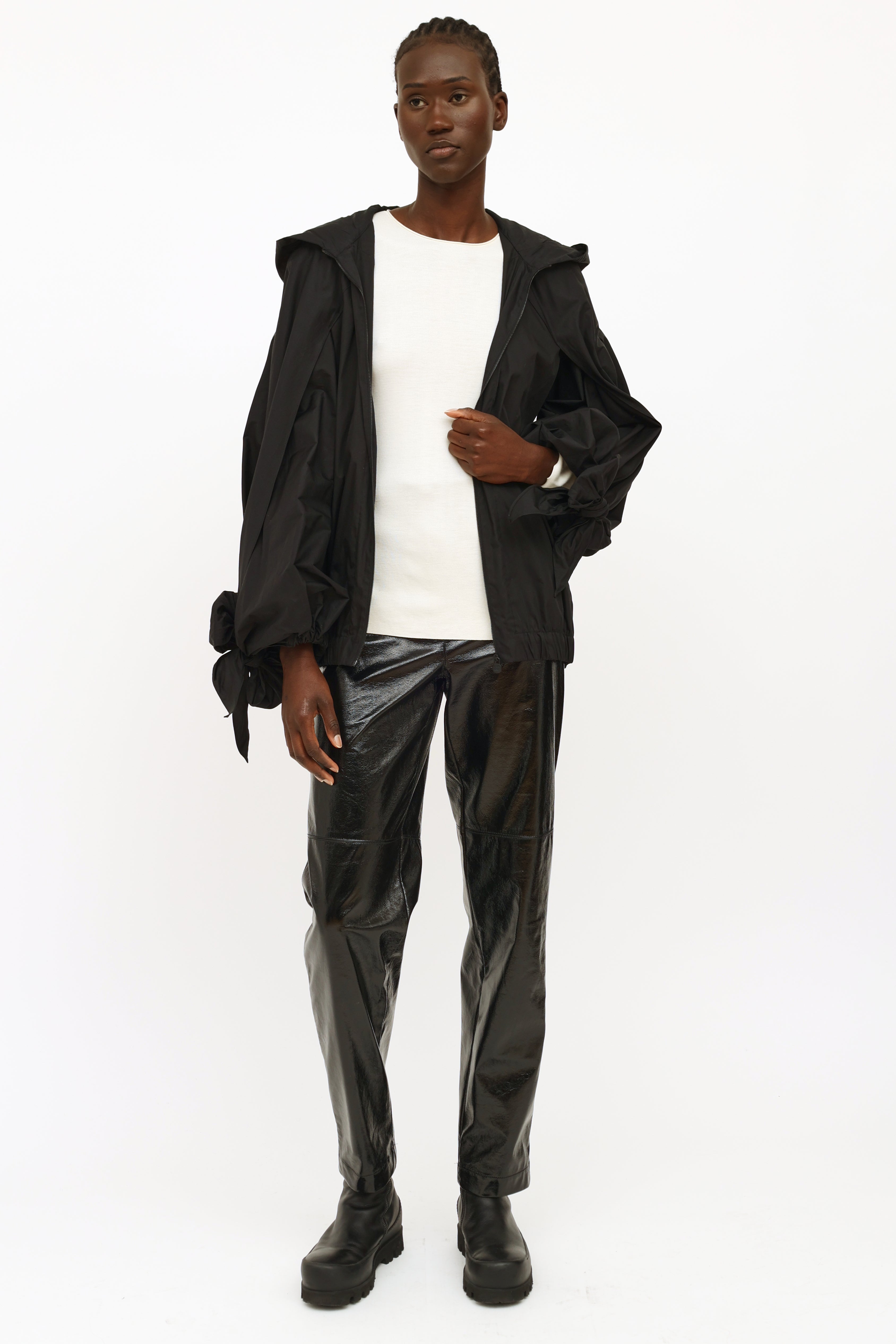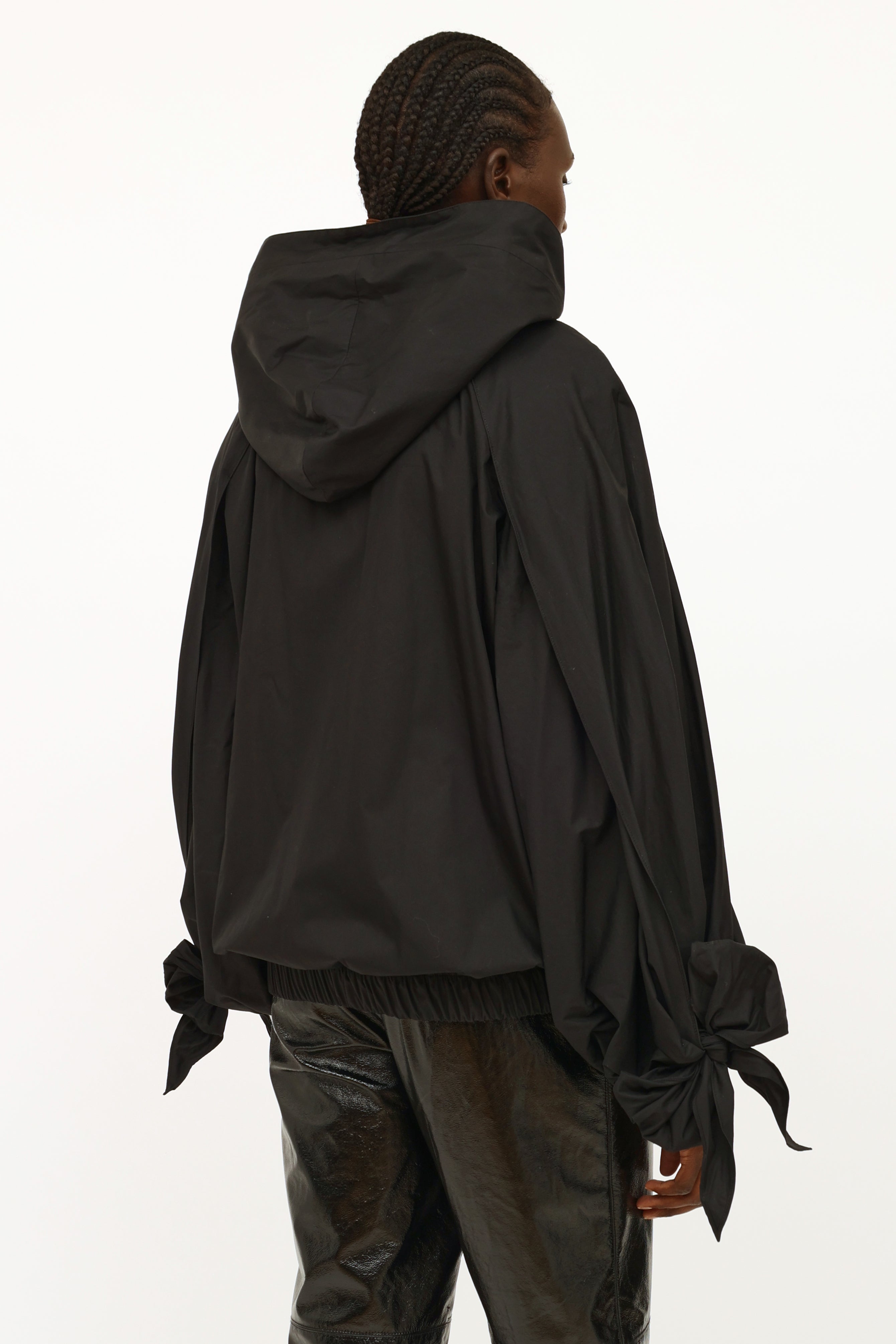 Pre-owned Chanel Cruise 2015 black windbreaker featuring a stand collar with attached hood, full length sleeves with slit detailing and elasticized cuffs with oversized bow detailing, zip closure at centre front, dual buttoned storm pockets and elasticized waistband.