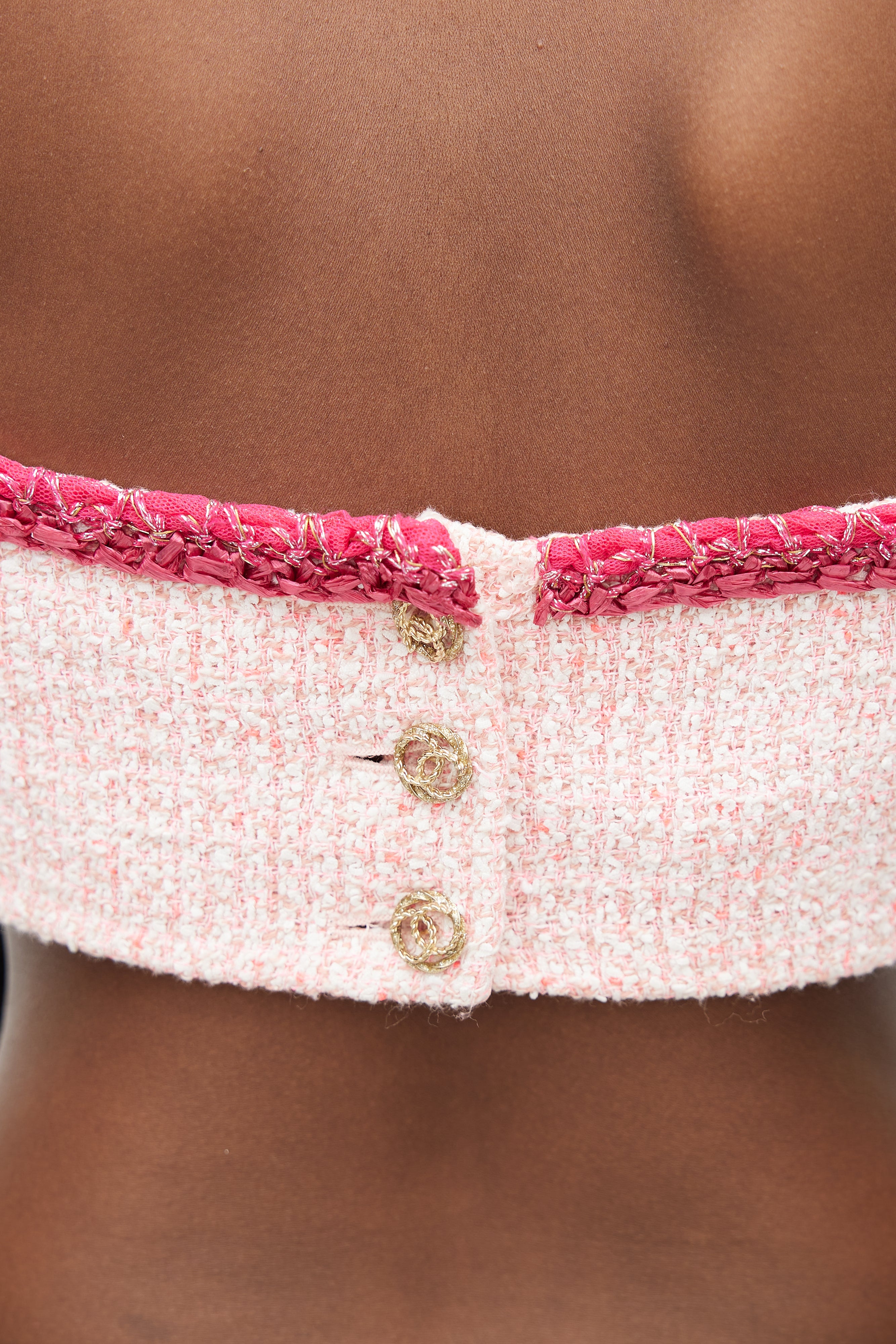 Pre-owned Cruise 2021 Chanel pink top featuring fuchsia braided trim, fixed shoulder straps, and gold tone medallion buttons closure at back.