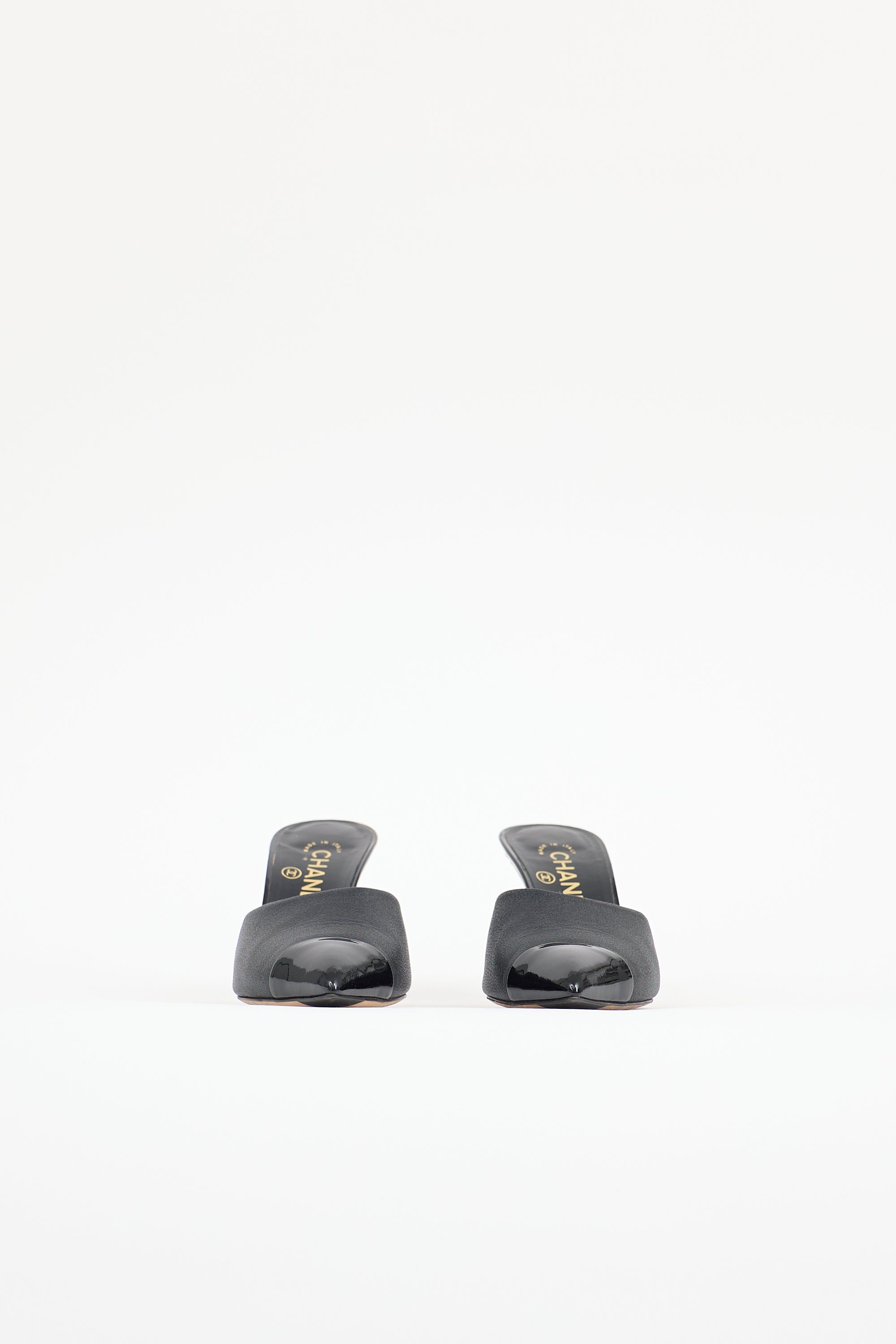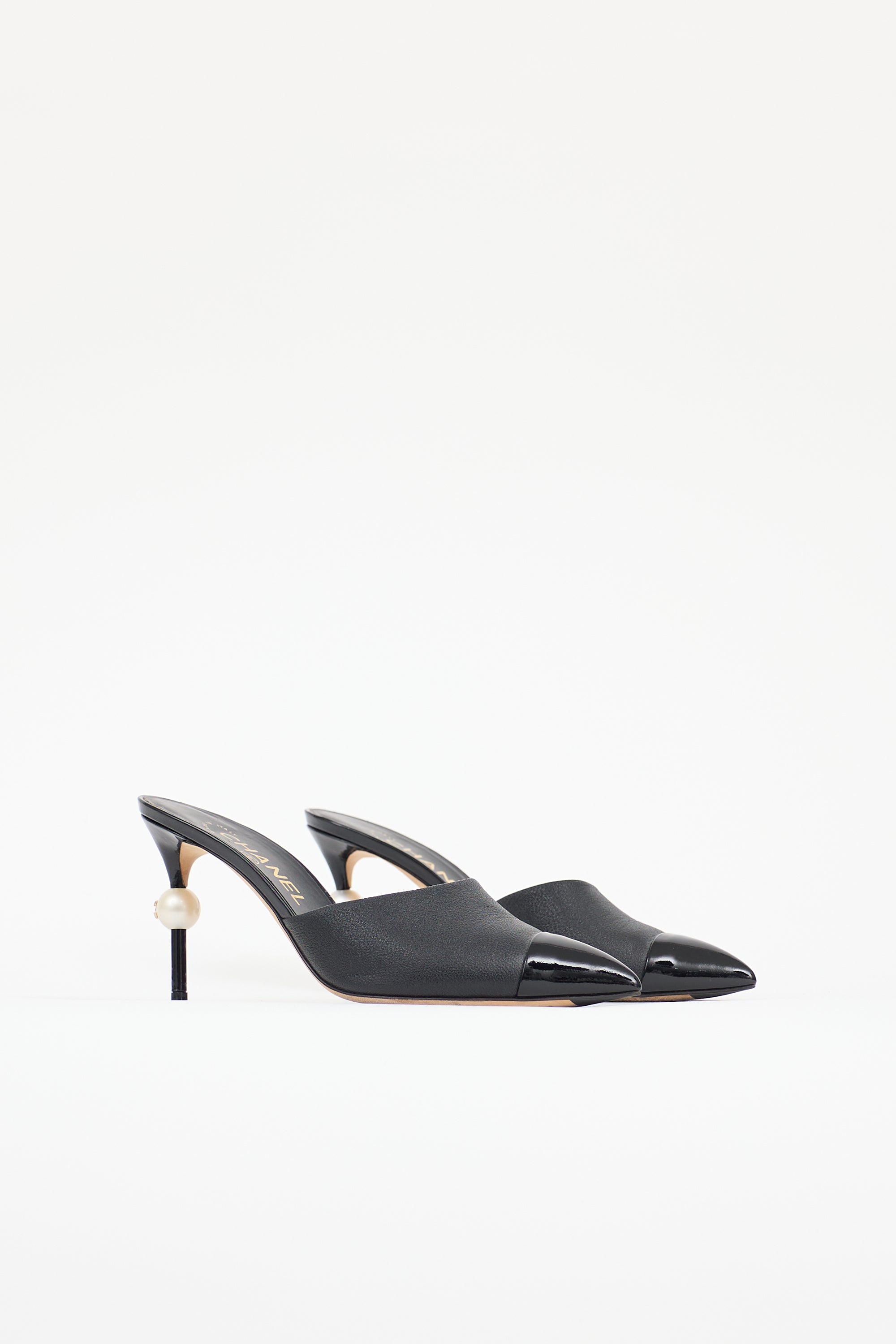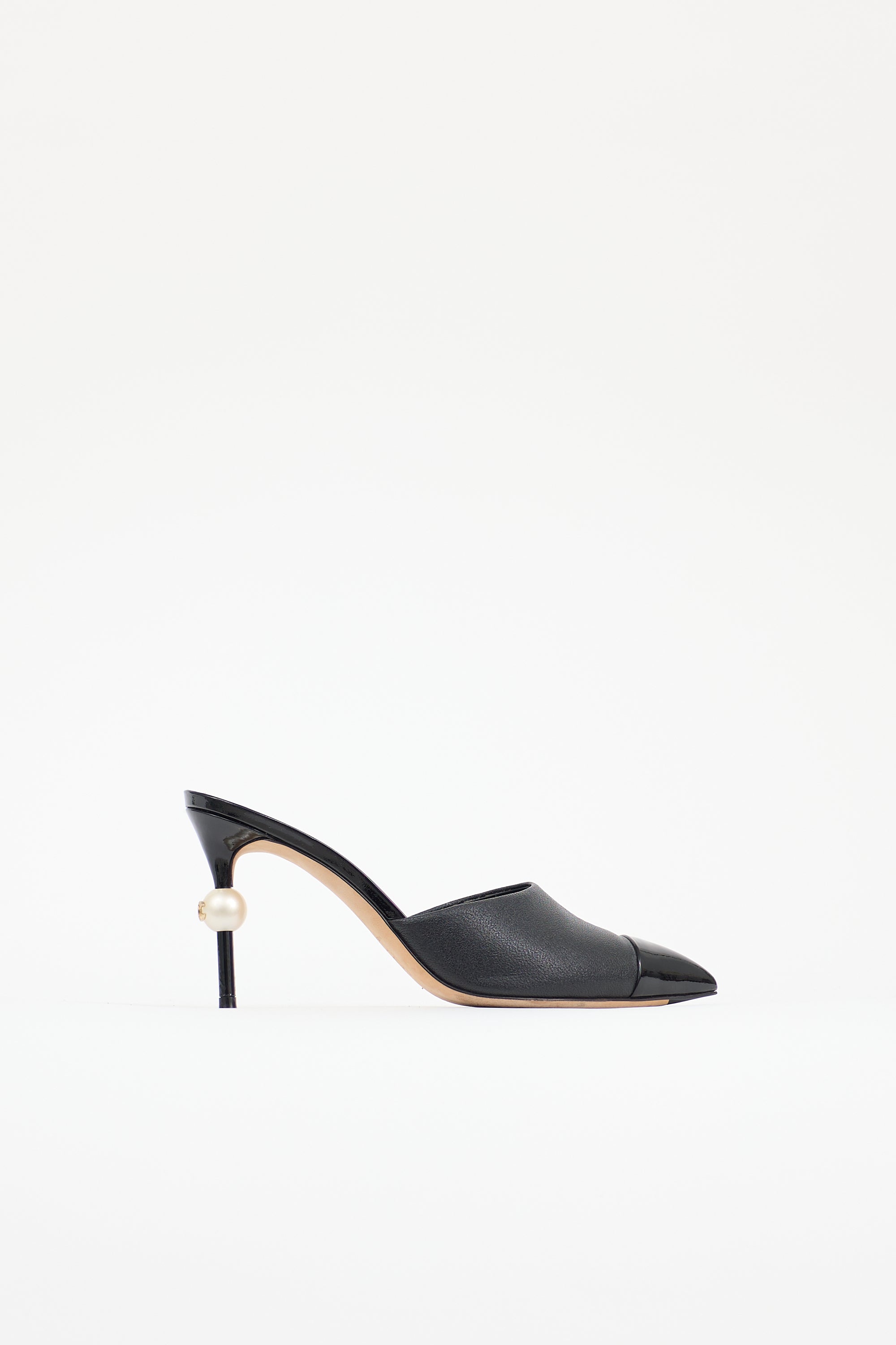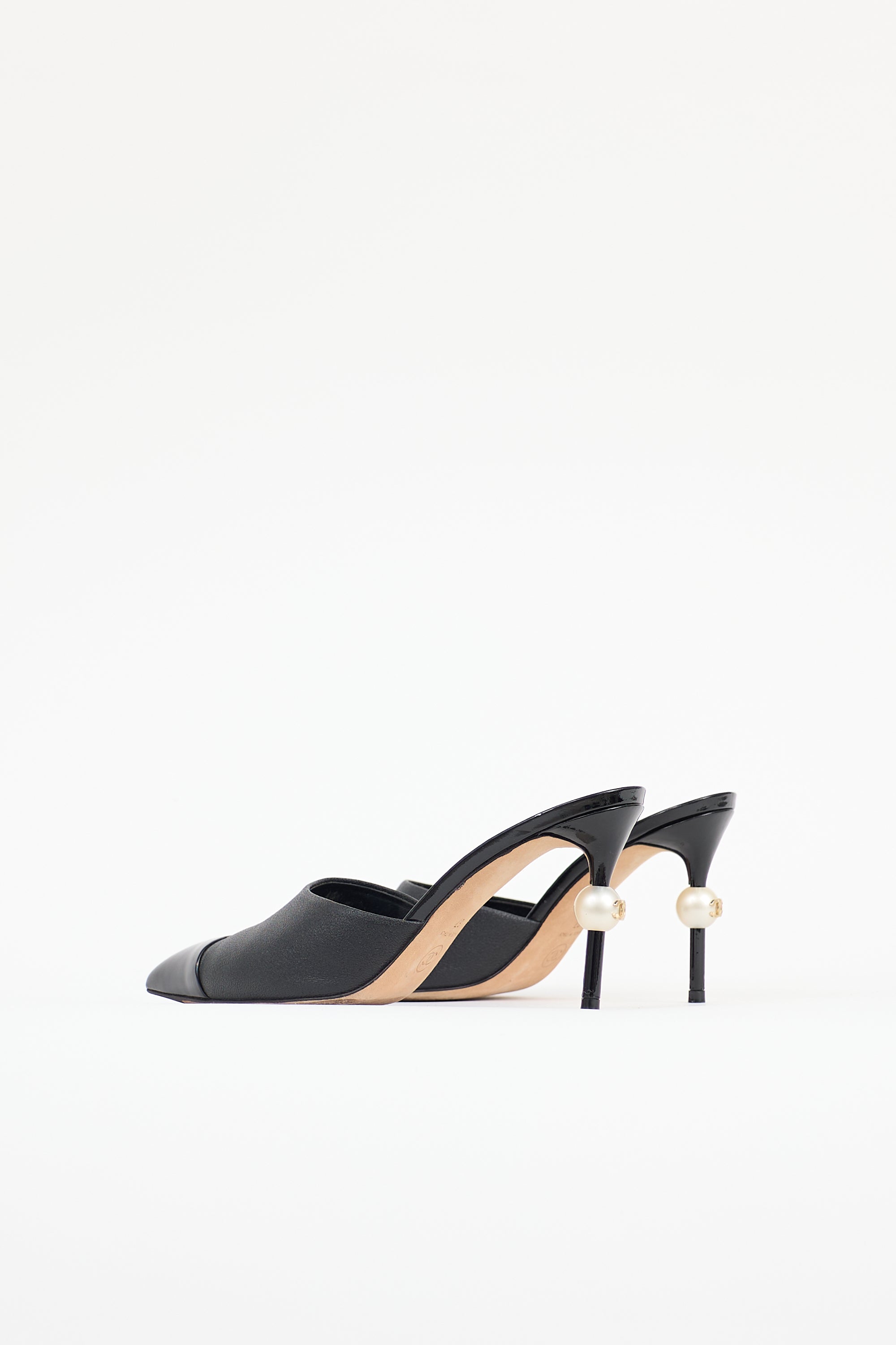 Pre-owned Chanel black leather mule featuring a pointed toe with patent cap, slip on entry, and patent covered stiletto heel with CC embellished faux pearl. Comes with original dust bag.